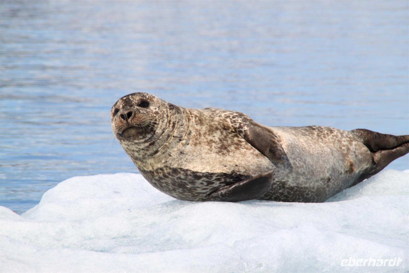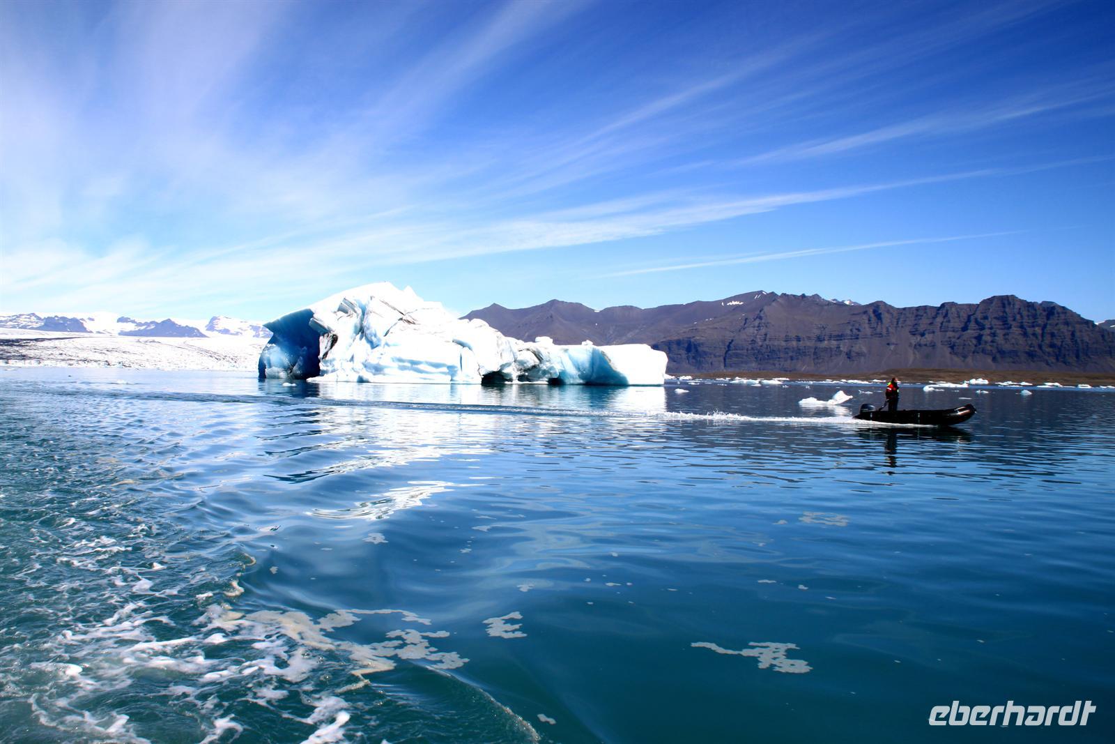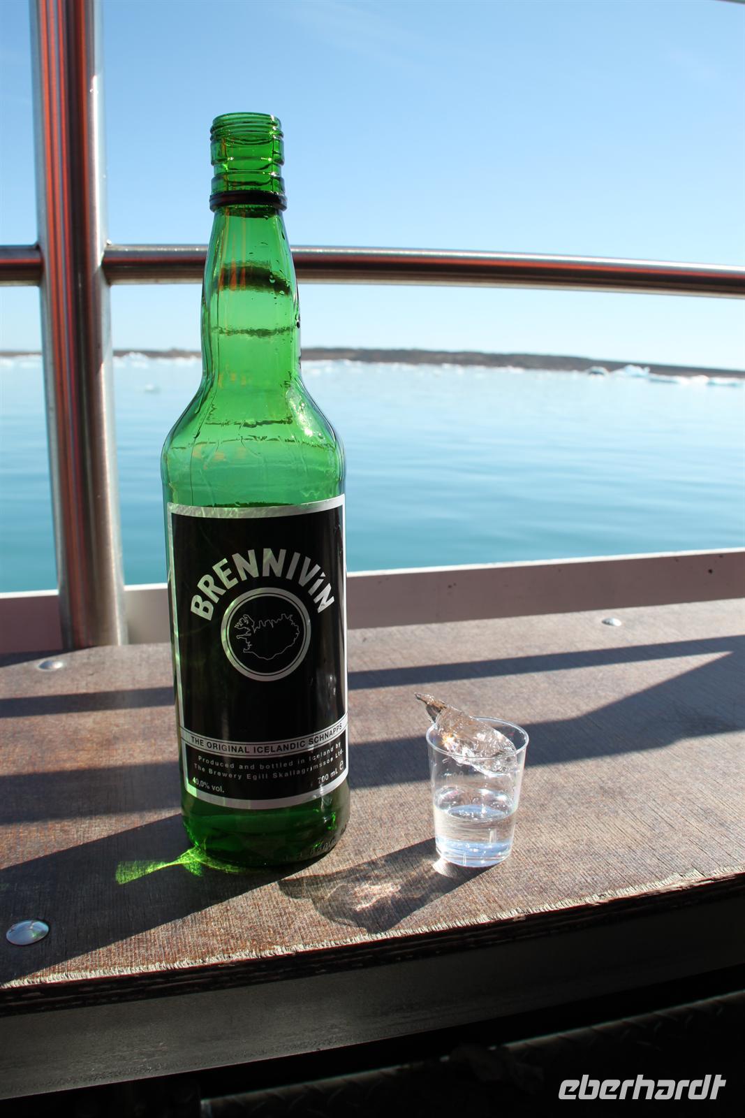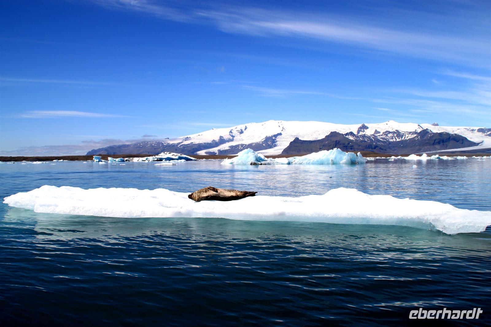 So wie der letzte Tag geendet hat, beginnt der neue Morgen - geprägt vom mächtigen Gletscher Vatnajökull. Unsere Fahrt ging heute entlang der Südausläufer des Gletschers mit seinen zahlreichen Gletscherzungen. Das erste Highlight des Tages war dabei eine Fahrt auf der Gletscherlagune von Jökúlsárlón, auf der wir mit einem Amphibienfahrzeug durch die Eisberge gleiten durften. Dabei hatten wir das seltene Glück, einen Seehund beim Sonnenbad zu beobachten, der sich auch beim direkten Ranfahren an die Eisscholle nicht aus der Ruhe bringen ließ. Während dieser Fahrt war es nun auch an der Zeit, einmal gemeinsam auf die Reise anzustoßen und womit ließe sich das besser bewerkstelligen als mit dem „Schwarzen Tod“, dem Brennevin. Da dieser kalt getrunken werden muss und es doch für isländische Verhältnisse sehr warm war, brachen wir kurzer Hand ein paar Stücken Eis vom Gletscher klein und verteilten diese in den kleinen Schnapsgläschen.