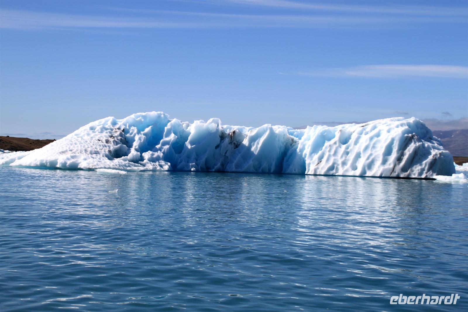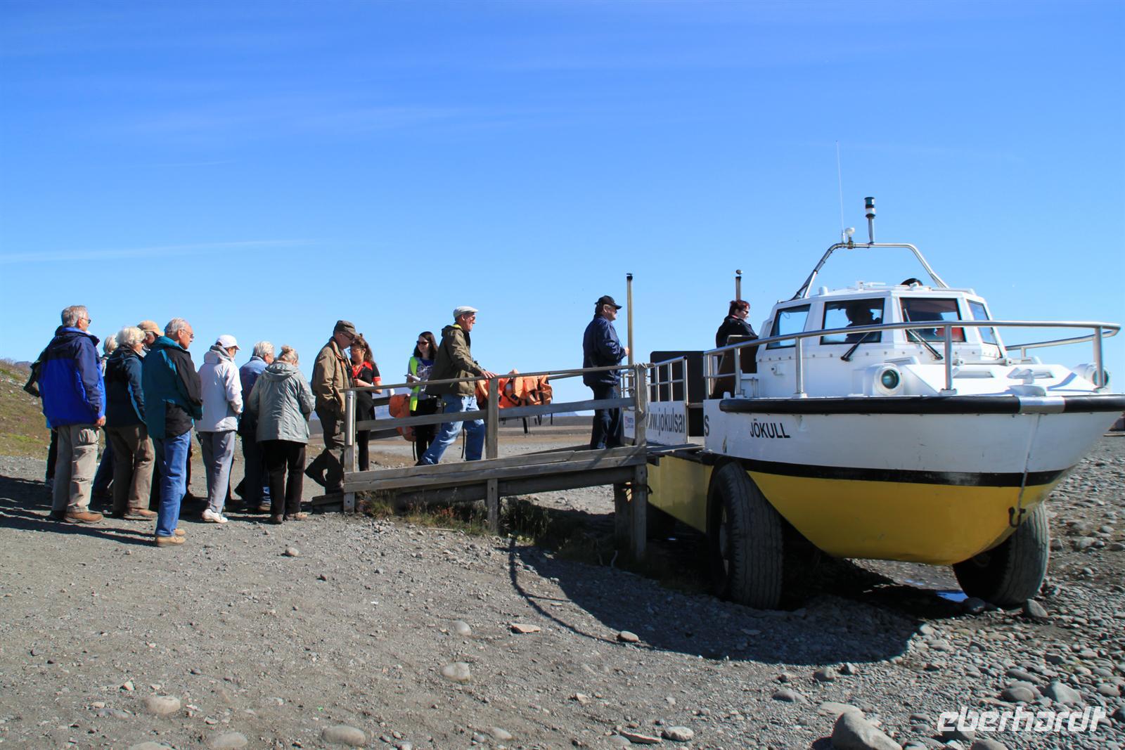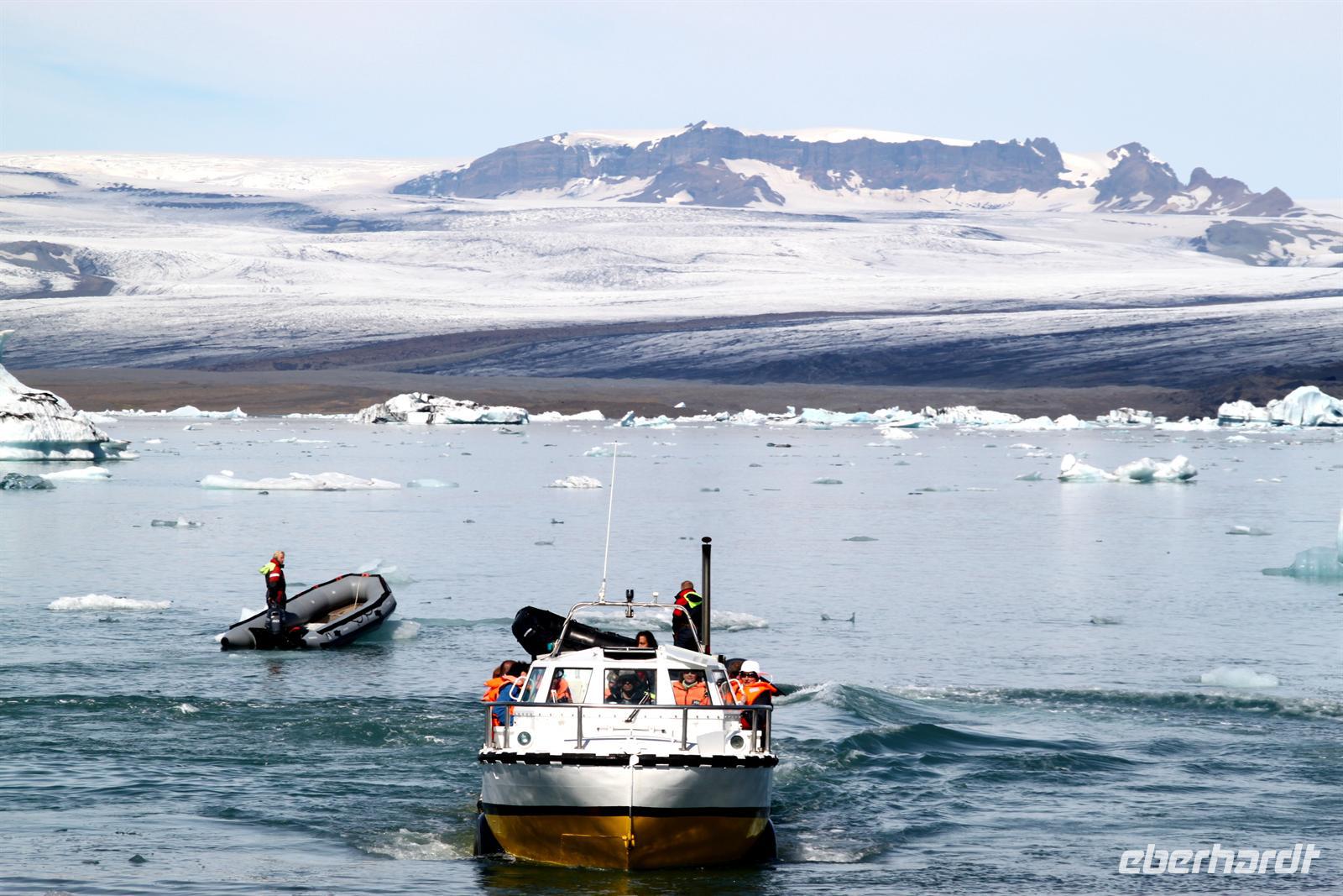 So wie der letzte Tag geendet hat, beginnt der neue Morgen - geprägt vom mächtigen Gletscher Vatnajökull. Unsere Fahrt ging heute entlang der Südausläufer des Gletschers mit seinen zahlreichen Gletscherzungen. Das erste Highlight des Tages war dabei eine Fahrt auf der Gletscherlagune von Jökúlsárlón, auf der wir mit einem Amphibienfahrzeug durch die Eisberge gleiten durften. Dabei hatten wir das seltene Glück, einen Seehund beim Sonnenbad zu beobachten, der sich auch beim direkten Ranfahren an die Eisscholle nicht aus der Ruhe bringen ließ. Während dieser Fahrt war es nun auch an der Zeit, einmal gemeinsam auf die Reise anzustoßen und womit ließe sich das besser bewerkstelligen als mit dem „Schwarzen Tod“, dem Brennevin. Da dieser kalt getrunken werden muss und es doch für isländische Verhältnisse sehr warm war, brachen wir kurzer Hand ein paar Stücken Eis vom Gletscher klein und verteilten diese in den kleinen Schnapsgläschen.