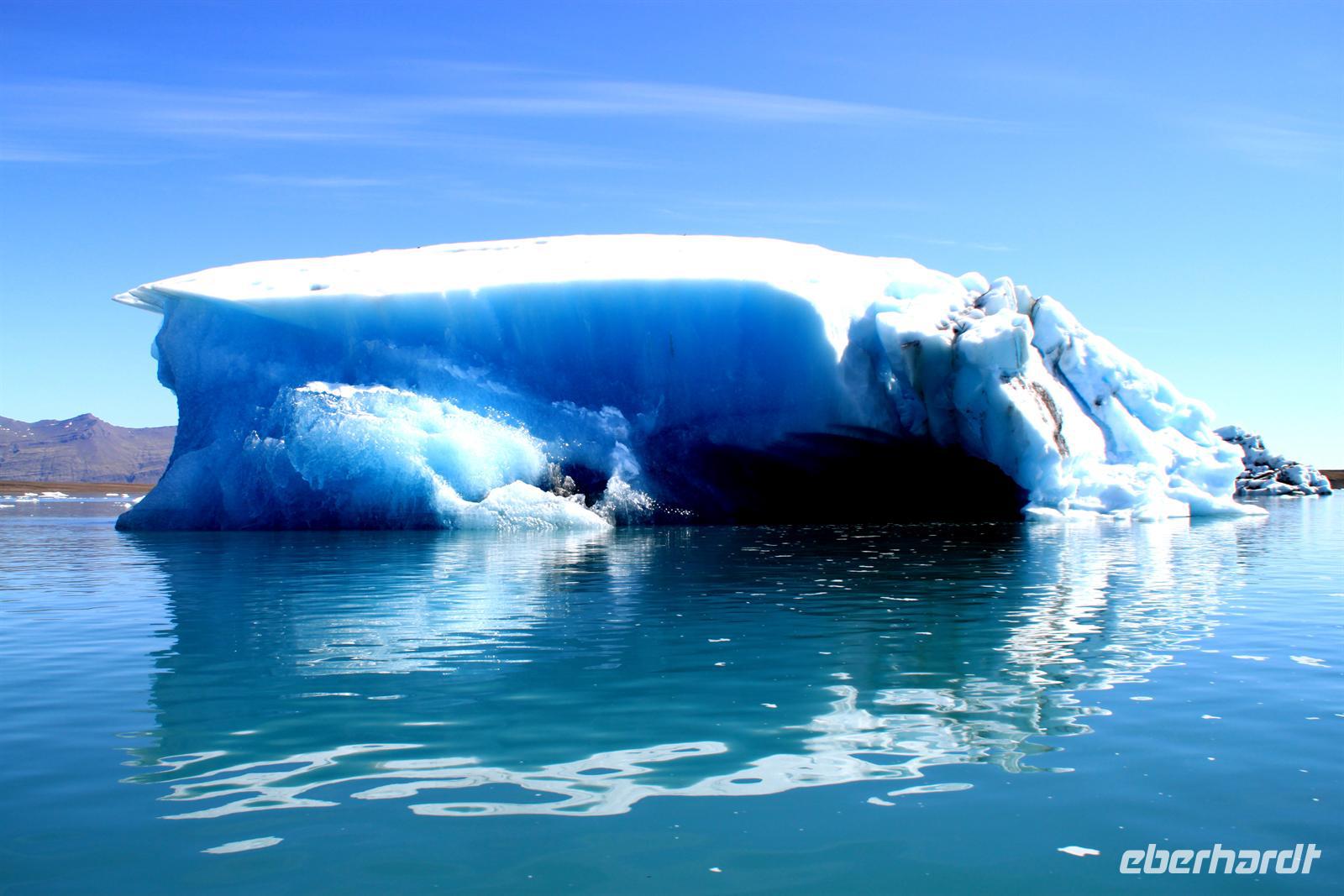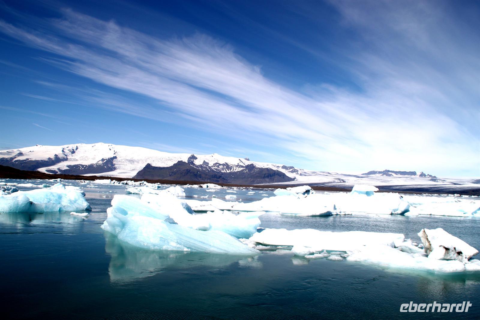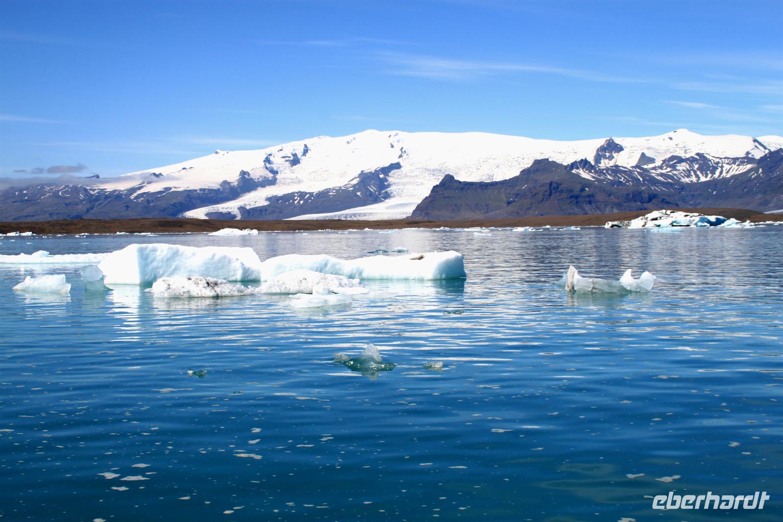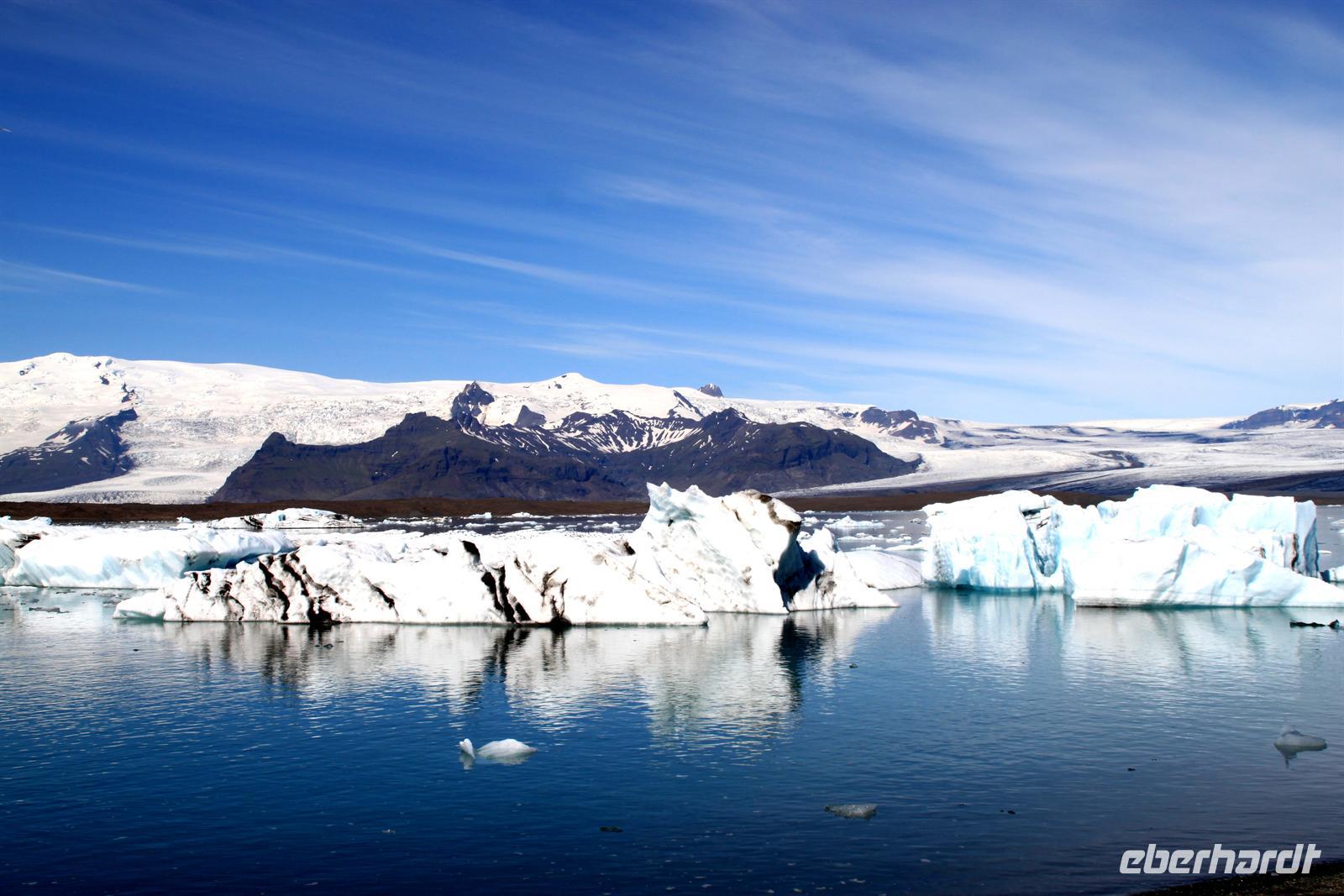 So wie der letzte Tag geendet hat, beginnt der neue Morgen - geprägt vom mächtigen Gletscher Vatnajökull. Unsere Fahrt ging heute entlang der Südausläufer des Gletschers mit seinen zahlreichen Gletscherzungen. Das erste Highlight des Tages war dabei eine Fahrt auf der Gletscherlagune von Jökúlsárlón, auf der wir mit einem Amphibienfahrzeug durch die Eisberge gleiten durften. Dabei hatten wir das seltene Glück, einen Seehund beim Sonnenbad zu beobachten, der sich auch beim direkten Ranfahren an die Eisscholle nicht aus der Ruhe bringen ließ. Während dieser Fahrt war es nun auch an der Zeit, einmal gemeinsam auf die Reise anzustoßen und womit ließe sich das besser bewerkstelligen als mit dem „Schwarzen Tod“, dem Brennevin. Da dieser kalt getrunken werden muss und es doch für isländische Verhältnisse sehr warm war, brachen wir kurzer Hand ein paar Stücken Eis vom Gletscher klein und verteilten diese in den kleinen Schnapsgläschen.