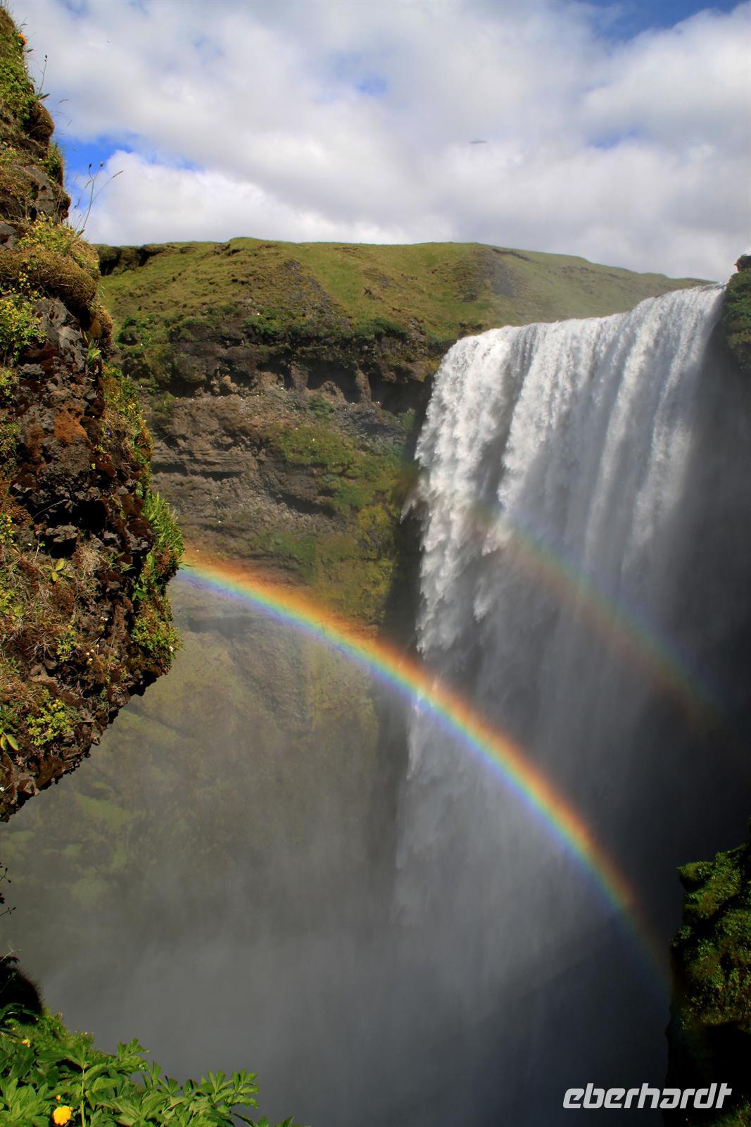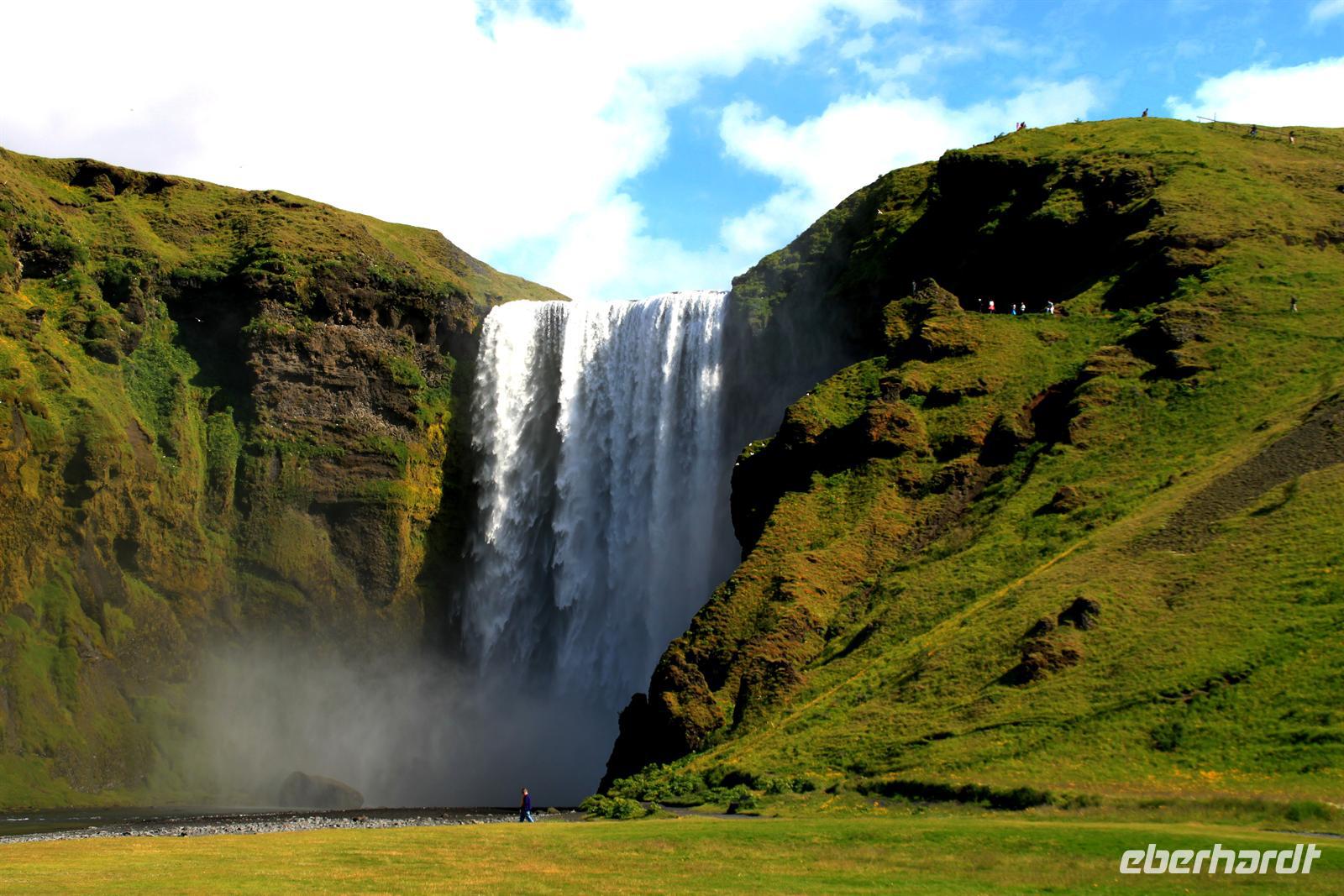Heute machten wir uns also auf, um unseren Islandumrundung zu beenden und nach Reykjavik zurück zu kehren. Doch bis dahin gab es noch jede Menge zu entdecken. Unseren ersten Stopp legten wir an der Landspitze von Dyrhólaey ein, wo sich der schwarze Sandstrand beeindruckend wie ein Teppich vor die felsige Steilküste legt und die Papageientaucher gefühlte Ewigkeiten untertauchen, um nach Nahrung zu suchen. Wir beobachteten also dieses Naturschauspiel, bevor es weiter ging zum Skógafoss Wasserfall, der sich mit einem wunderschönen Regenbogen schmückte. In unmittelbarer Nähe befindet sich das Heimatmuseum von Skóga, durch das uns der Inhaber selbst führte. Nach einem kleinen Mittagssnack setzten wir anschließend unseren Weg zum Eyjafjallajökull Informationszentrum fort, wo uns ein Video über den Ausbruch des Vulkans 2010 gezeigt wurde. Beeindruckt von diesen Bildern fuhren wir weiter zum nächsten Wasserfall, dem Seljalandsfoss, hinter dem man sogar hindurch laufen kann. Dies sollte auch unser letzter Stopp auf dem Weg nach Reykjavik sein und so schloss sich zum späten Nachmittag zurück in der Hauptstadt der Kreis.