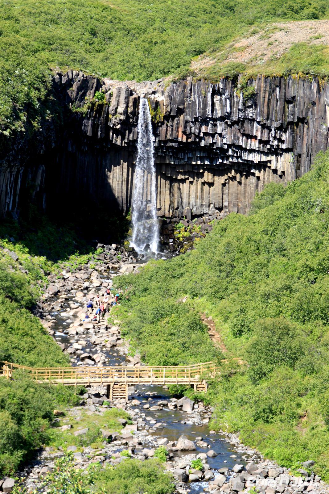 Weiter ging unsere Fahrt direkt an eine der Gletscherzungen vom Vatnajökull, die sich beeindruckend bis ins Tal vorgeschoben hat. Dabei ließen sich ein paar Gletscherkletterer beobachten. Mit der Weitefahrt ließen wir den Gletscher nach und nach hinter uns und kamen dem Nationalpark Skaftafell näher. Hier erwartete uns der Svartifoss Wasserfall sowie das Vatnajökull Informationszentrum. An dieser Stelle konnte jeder für sich entscheiden, ob er den Weg zum Wasserfall antritt oder sich eingehender im Informationszentrum umsah und so zogen ein paar von uns mit zügigem Schritt los in Richtung Wasserfall. Der Aufstieg wurde mit einem Panoramablick über das Gletschergebirge sowie auf den Wasserfall mit seinen markanten Basaltsäulen belohnt.