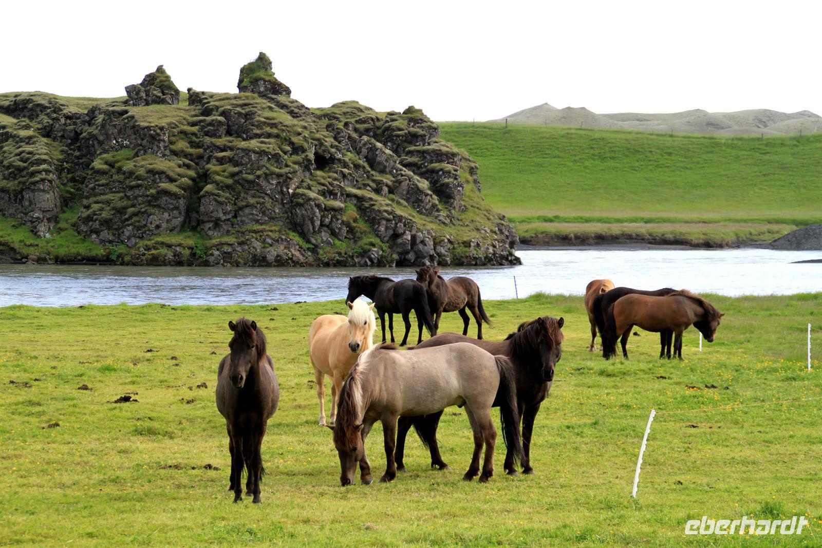 Nach einem stärkenden Mittagsstopp durften wir auf einer Pferdefarm die verschiedenen Gangarten der Islandpferde bewundern und den so typischen Tieren auch einmal näher kommen. Eine deutsche Bäuerin erzählte uns dabei Einiges über die Lebensweise und Aufzucht der Pferde, der wir bei Kaffee und Gebäck interessiert lauschten.