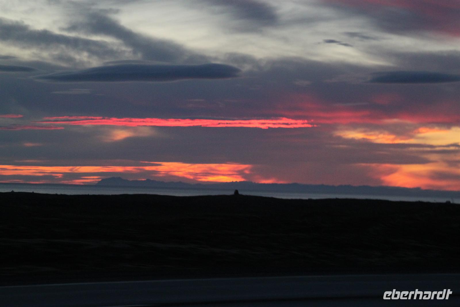 Da der Check-In im Terminal C aus Kapazitätsgründen leider nicht möglich war, nahmen wir unser Gepäck kurzer Hand mit zum Essen in die Bar Red Baron in der Haupthalle. Während des Essens lief bereits das EM-Halbfinal-Spiel der deutschen Fußballnationalmannschaft. Leider gerat diese schnell in Rückstand, der in der ersten Halbzeit auch nicht mehr einzuholen war. Doch die Niederlage tat unserer Stimmung keinen Abbruch und wir machten uns daher gut gestärkt auf zum Check-In nach Keflavik. Ein weiterer Stein im Weg erwartete uns. Die Gepäckbänder im Terminal A standen still, sodass sich erst einmal gar nichts tat. Doch geduldig harrten wir aus, bis wir gegen 23 Uhr alle eingecheckt hatten und auf schnellstem Wege durch die Sicherheitskontrolle ins Flugzeug gingen, was mit ein paar Minuten Verspätung gen Keflavik startete. In Keflavik angekommen, holten wir in aller Ruhe unsere Koffer und machten uns auf den Weg nach draußen. Schon aus dem Flugzeug hatten wir die isländische Mitternachtssonne gesehen, die rot hinter den Bergketten hing. So begleitete uns diese auf dem nächtlichen Weg von Keflavik nach Reykjavik ins Hotel. Nach schnellem und reibungslosem Check-In fielen alle trotz Helligkeit müde und geschafft ins Bett.