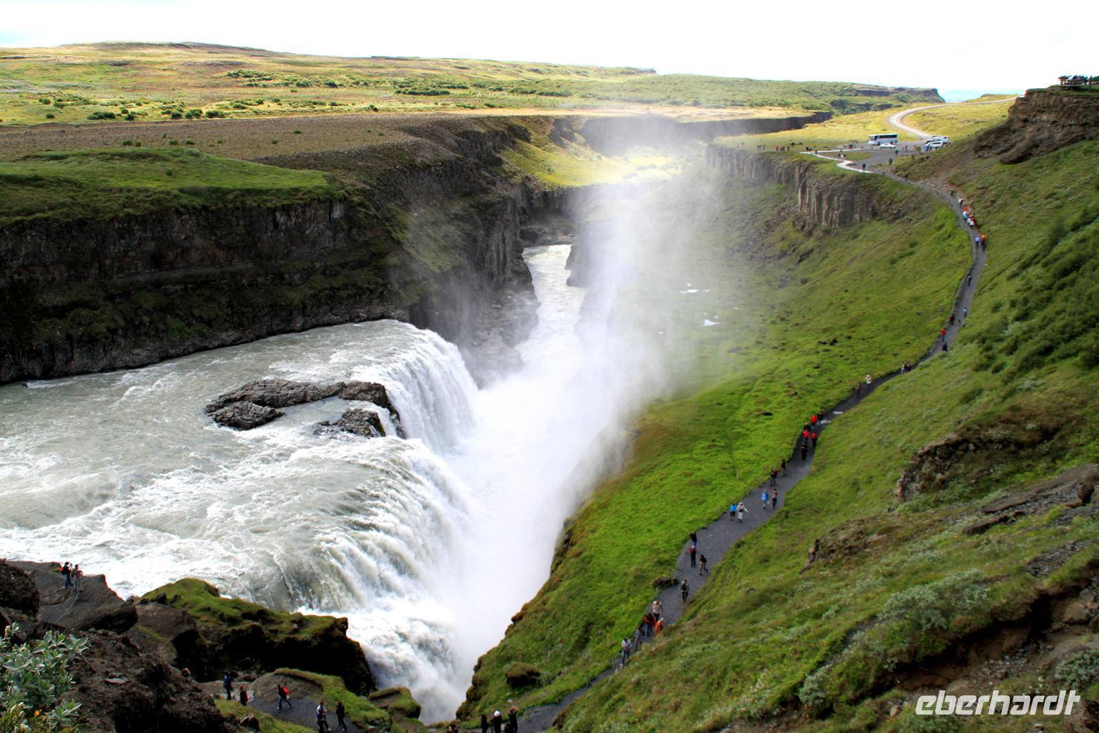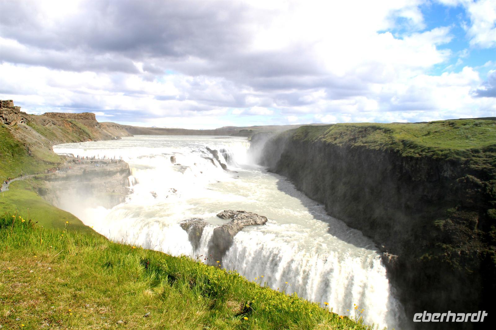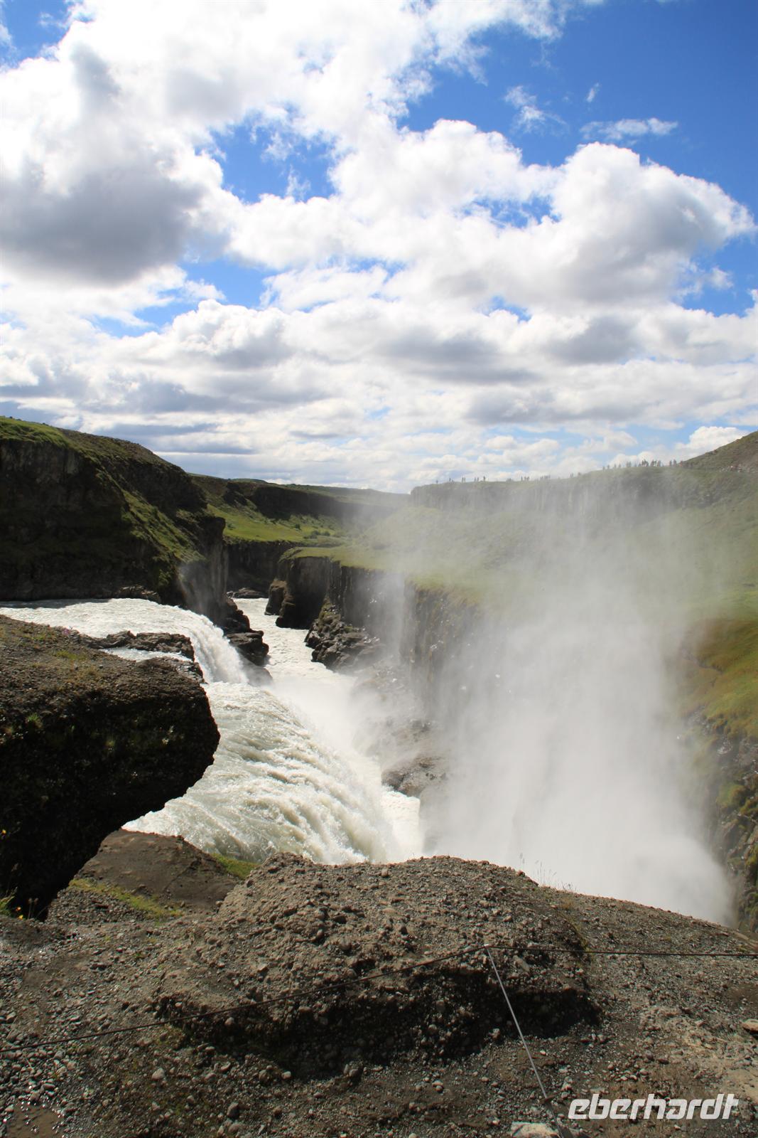 Gegen Mittag erreichten wir den Gullfoss, wo genügend Zeit für Mittagessen, Fotos und vor allem die Besichtigung des gigantischen Wasserfalls blieb. Das Wetter meinte es, wie auch den restlichen Tag, außerordentlich gut mit uns, sodass der Wasserfall, von der Sonne angestrahlt, in die Tiefe stürzte.