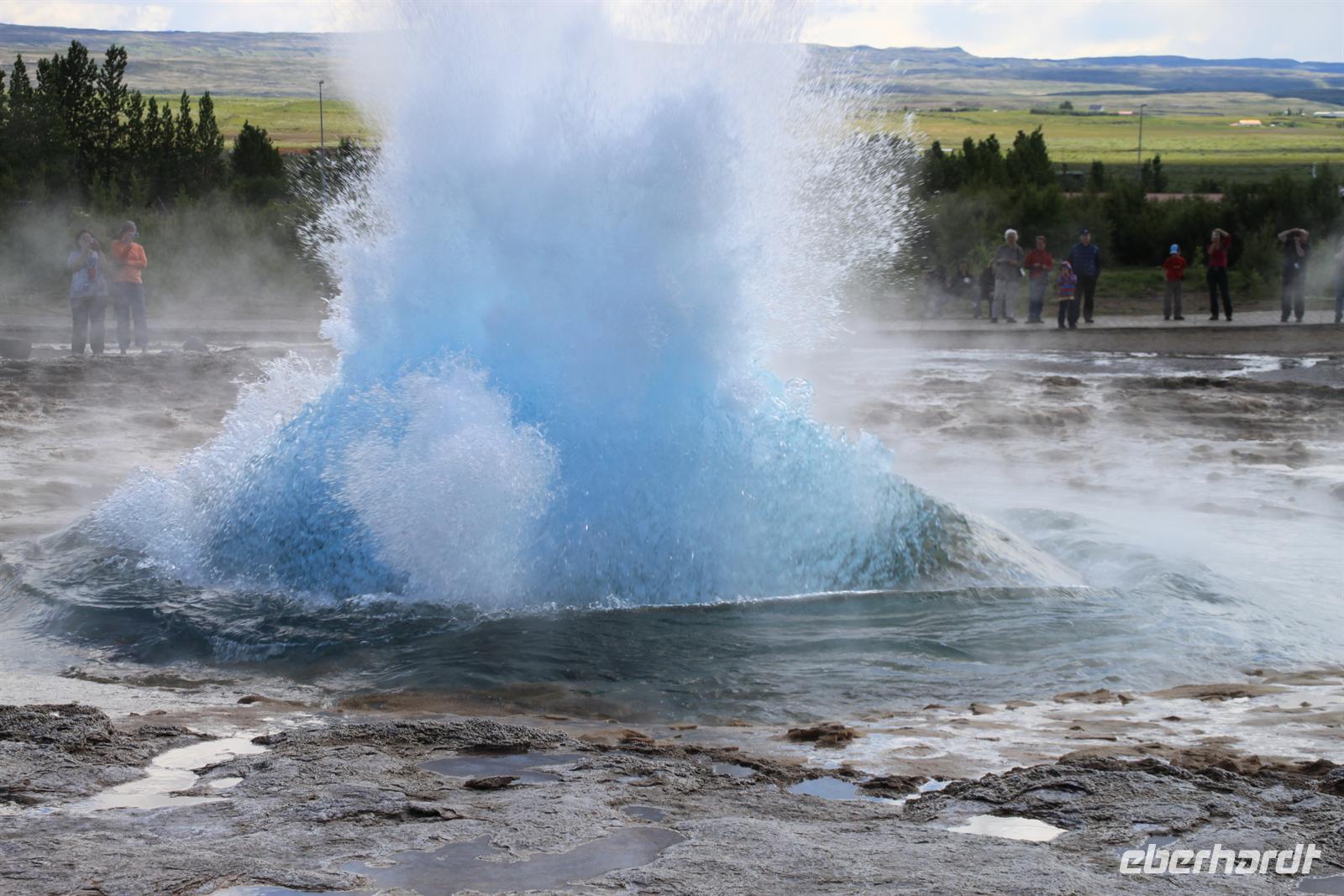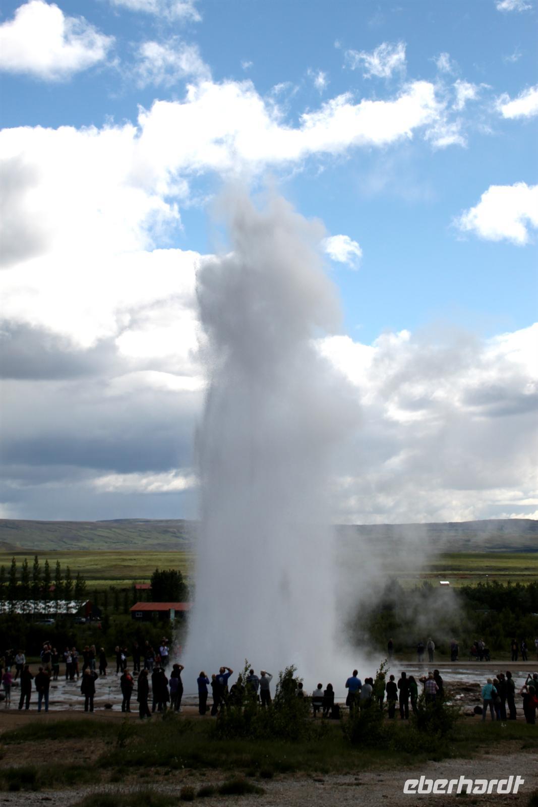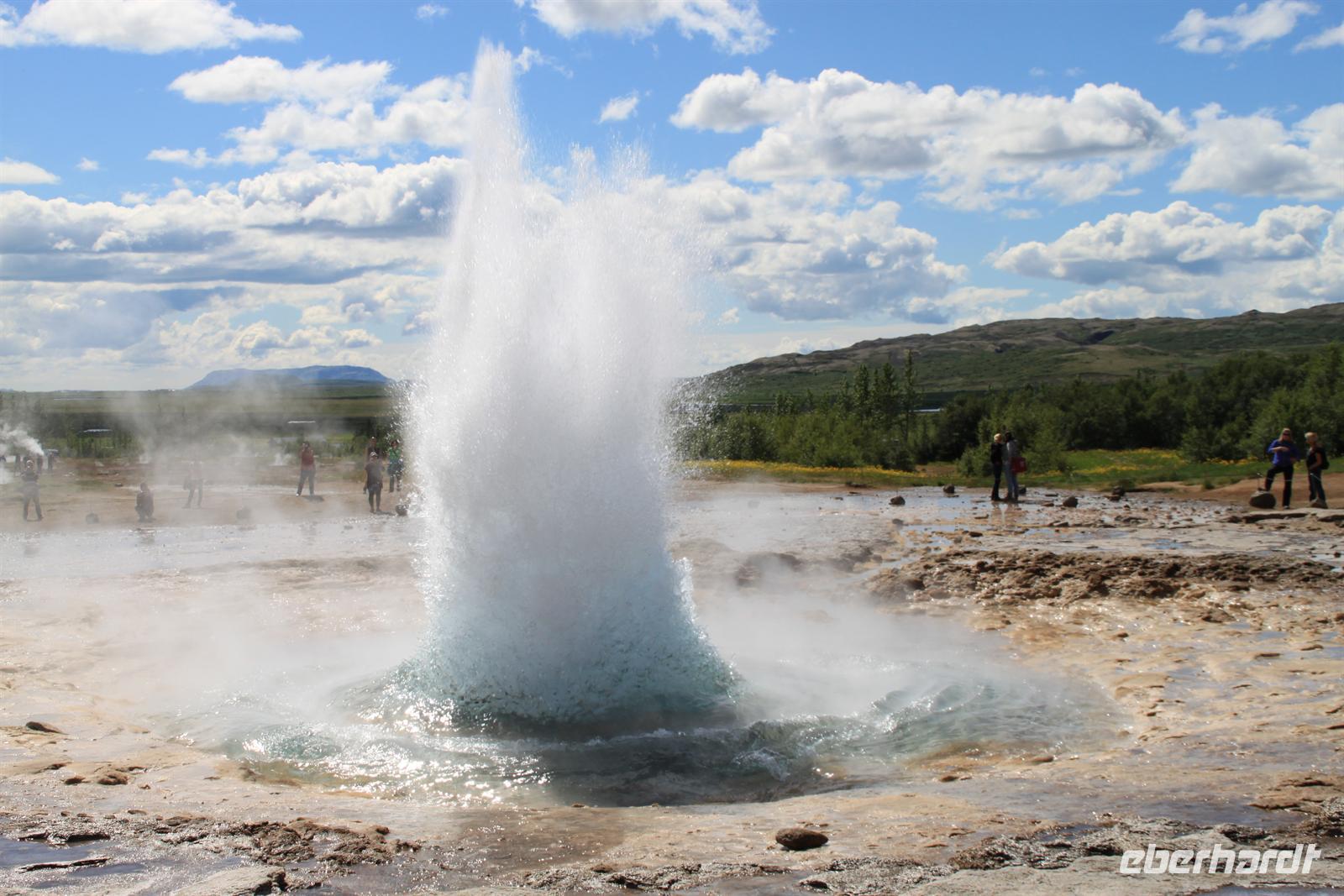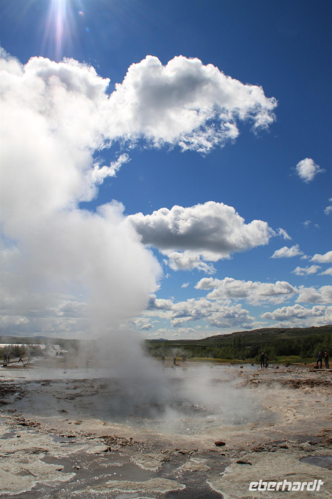 Unweit vom Gullfoss machten wir unseren zweiten Stopp und bestaunten im Hochtemperaturgebiet Haukadalur den Geysir Strokkur, der in regelmäßigen Abständen explosionsartig in die Höhe schießt.