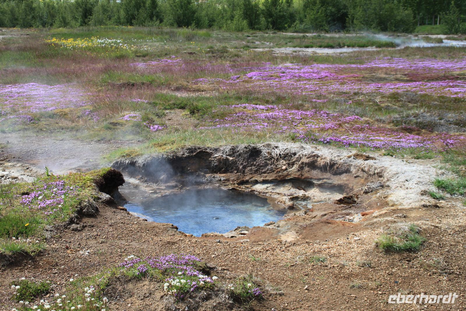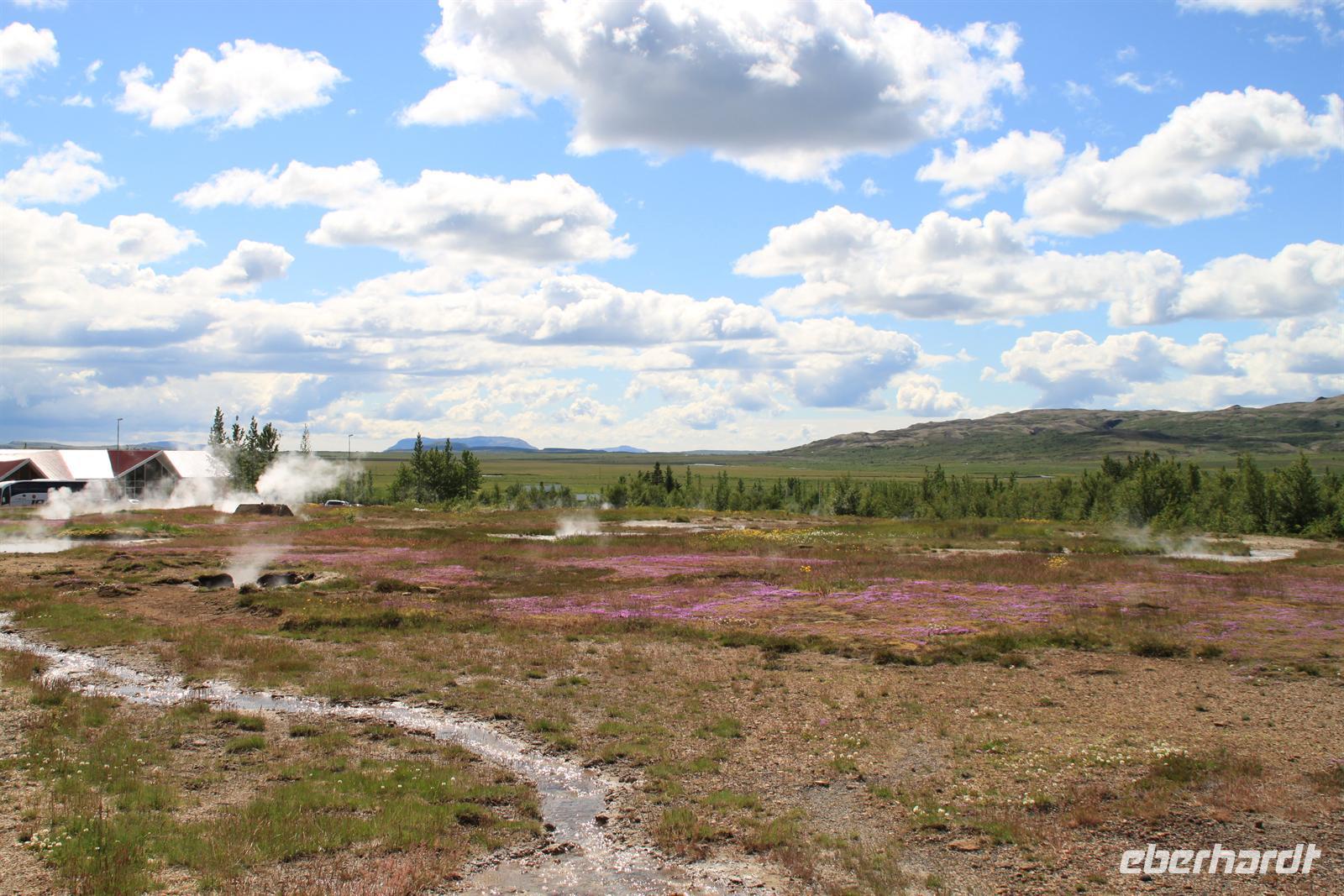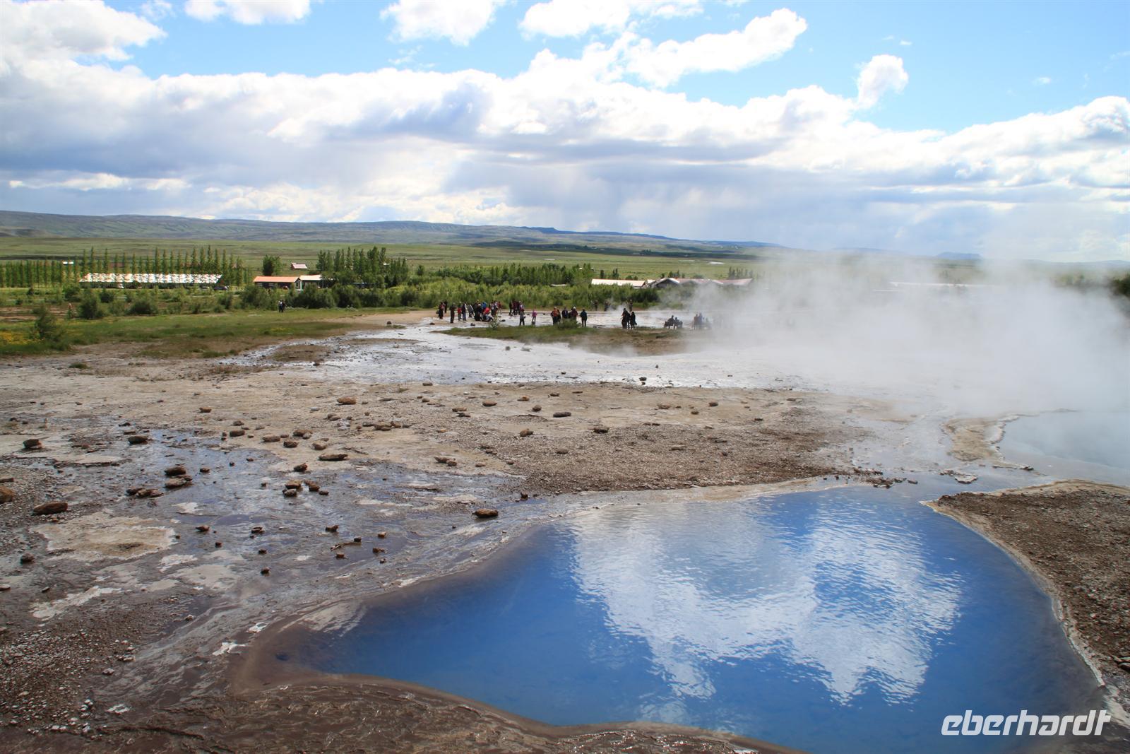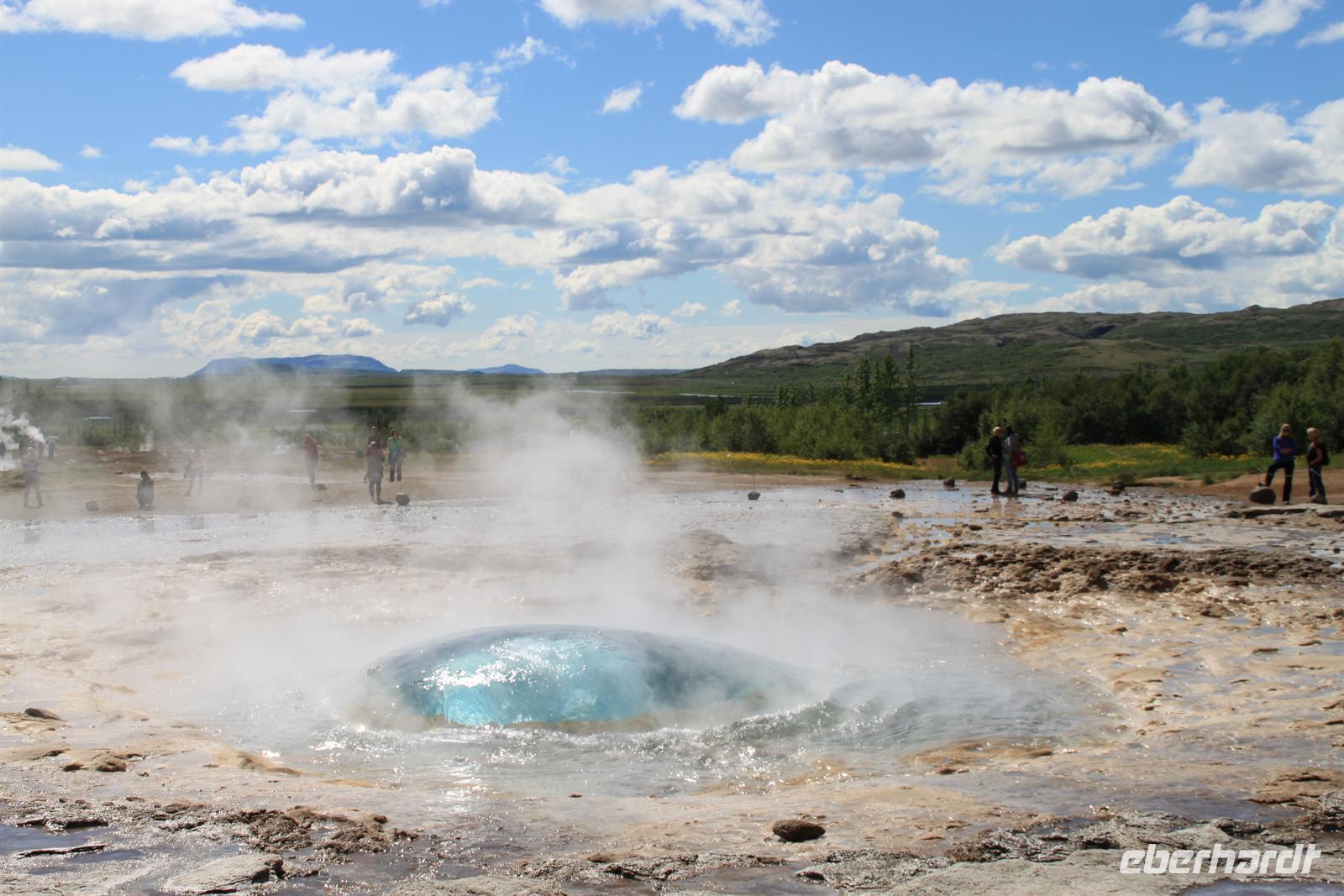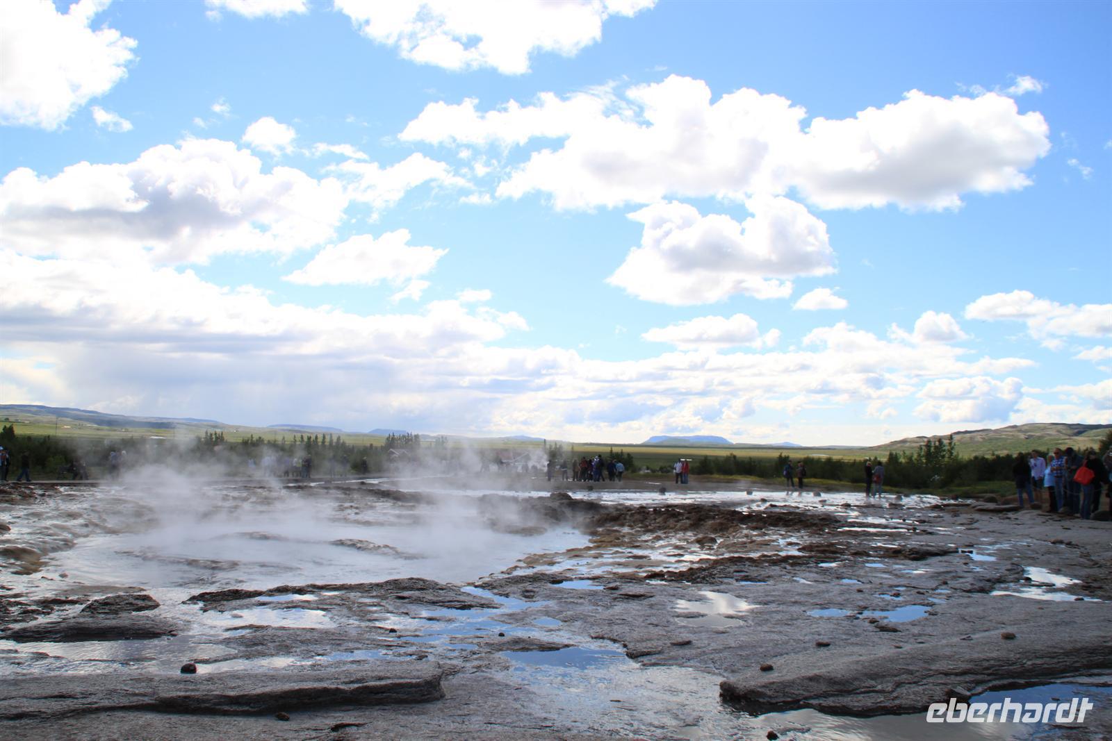 Unweit vom Gullfoss machten wir unseren zweiten Stopp und bestaunten im Hochtemperaturgebiet Haukadalur den Geysir Strokkur, der in regelmäßigen Abständen explosionsartig in die Höhe schießt.
