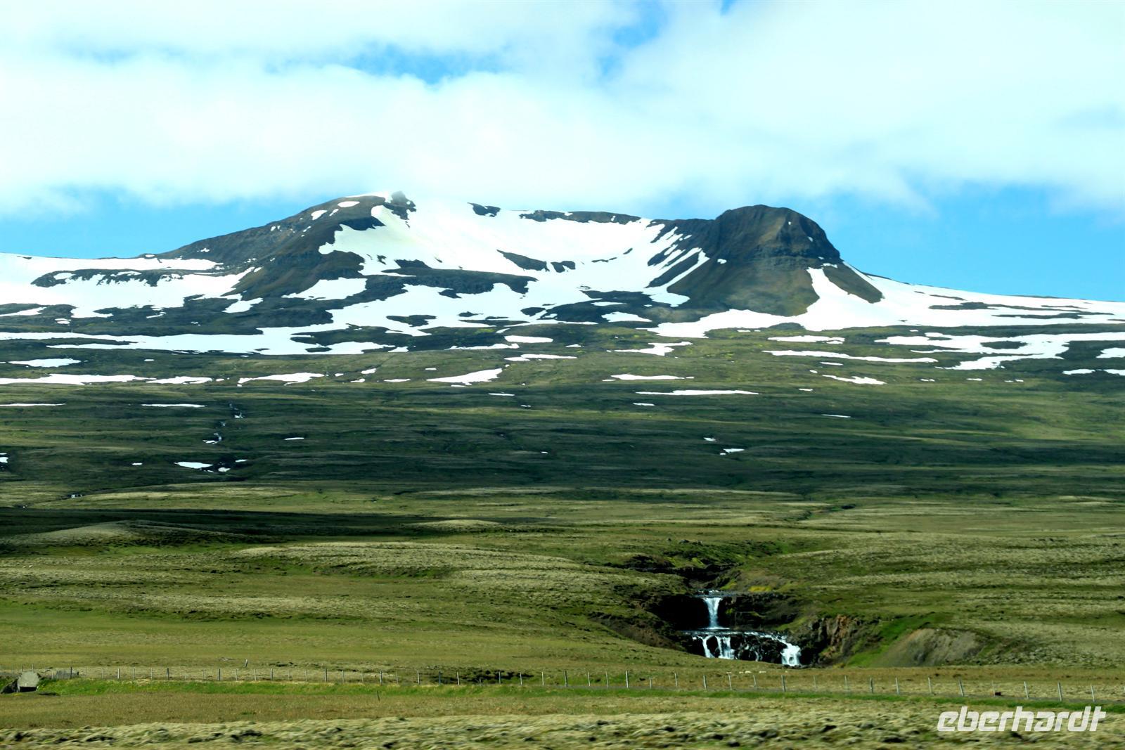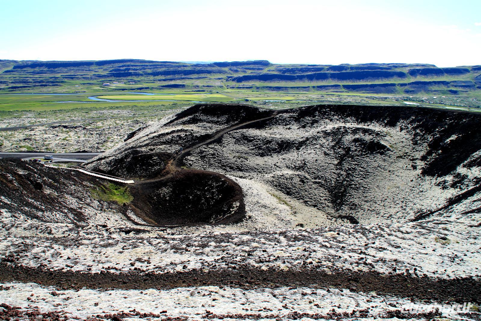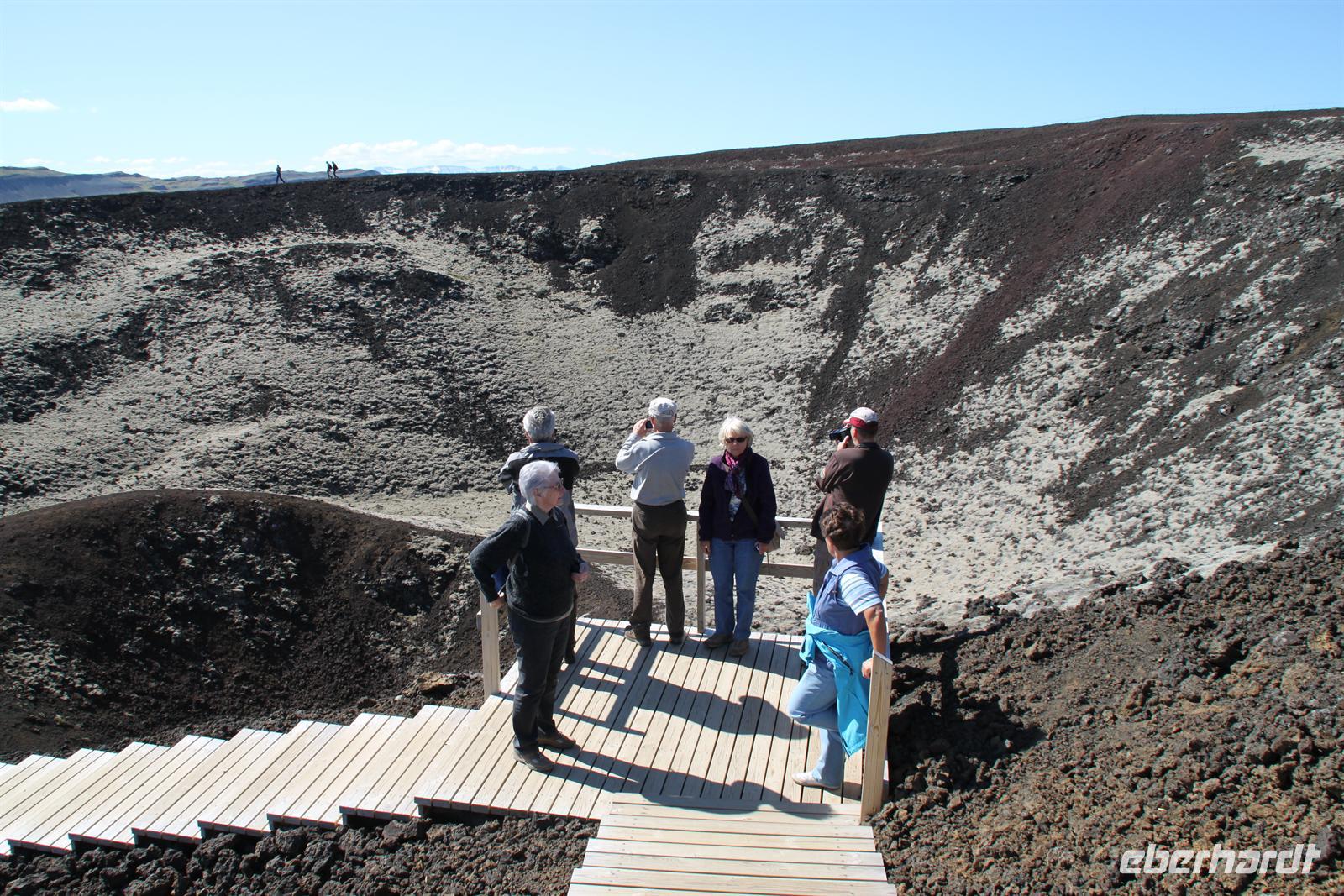 Heute ließen wir Reykjavik hinter uns und machten uns auf den Weg Richtung Norden. Akyreyri hieß das Ziel - die zweitgrößte Stadt der Insel. Doch heute stand eindeutig unter dem Motto „Der Weg ist das Ziel“, denn dieser führte uns durch beeindruckende und abwechslungsreiche Landschaften. Unter dem Walfjord hindurch mit kurzem Stopp am Städtchen Borganes ging es in das Tal Nordurádalur, wo uns der erloschene Krater Grábrók inmitten einer einzigartigen von Moos bedeckten Lavalandschaft begrüßte. Diesen bestiegen, hatte man einen umwerfenden Blick in die Weiten den Tales und die Kette der erloschenen Vulkane rund um den Grábrók.