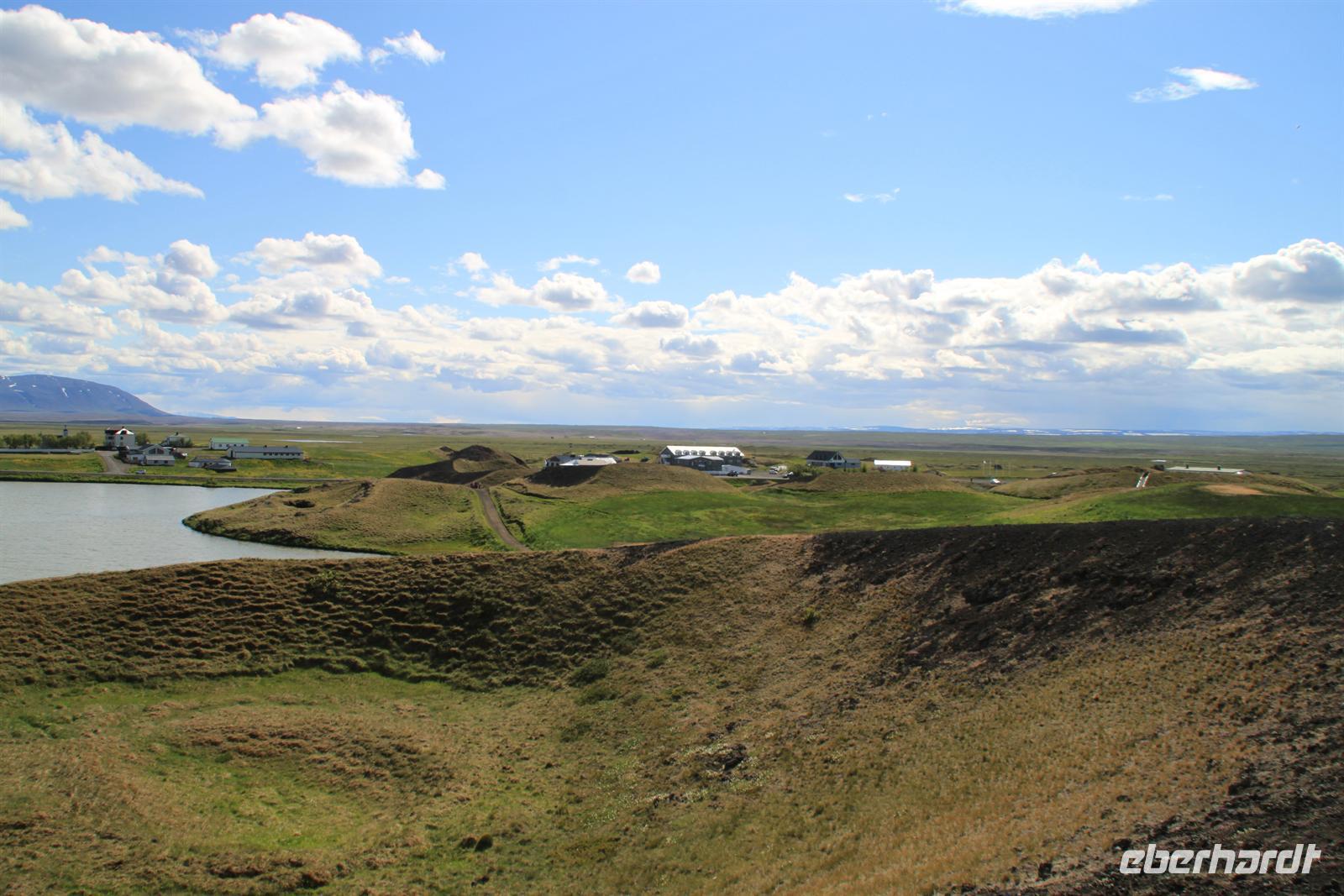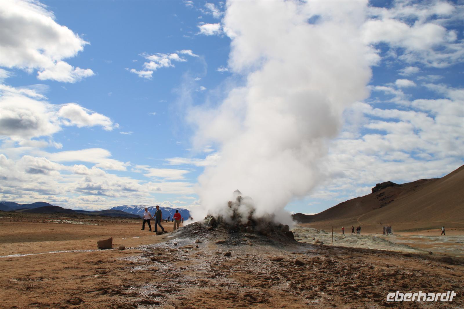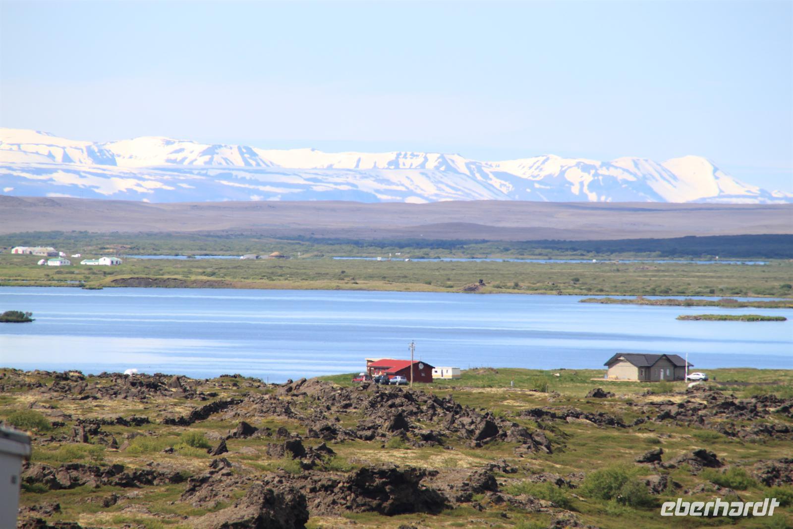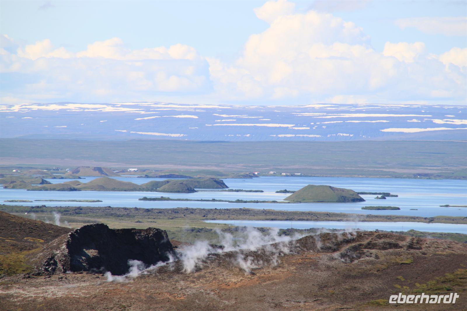 Wieder stand ein Tag mit vielen beeindruckenden Naturschauspielen auf dem Programm. Daher machten wir uns um 9 Uhr auf zum Myvatn Gebiet - auf Deutsch dem Mückensee. Unterwegs galt unser erster Stopp dem Godafoss Wasserfall, der in zwei Stufen aus 12 bzw. 6 Metern Höhe in die Tiefe stürzt. Auf der Weiterfahrt ließen wir den Myvatn See vorerst rechts liegen und fuhren zum Námaskard Hochtemperaturgebiet mit seinem Geothermalkraftwerk sowie den heißen Schwefelquellen, die geruchvoll zu Tage treten und den Dampf aus kochendem Schlamm in die Höhe sprühen. Einmal anders und ganz aus der Nähe nutzten wir eine heiße Schwefelquelle der Jardbödin Lagune, um baden zu gehen und uns im weichen fast cremigen Wasser ein wenig treiben zu lassen. Auf dem Weg zurück zum Myvatn lag nun das Lava-Labyrinth von Dimmuborgir, welches auch als die „Dunklen Burgen“ bezeichnet wird. Dort angekommen konnte auf einem Spaziergang durch diese einzigartige Landschaft ein Jeder diesen Namen nachvollziehen. Anschließend wollten wir nun auch dem Ufer des Myvatn einen Besuch abstatten und so spazierten wir an jenem entlang durch die Pseudokrater, von denen aus man einen wunderschönen Blick über die Seenlandschaft und das Naturgebiet ringsherum erhaschen kann.