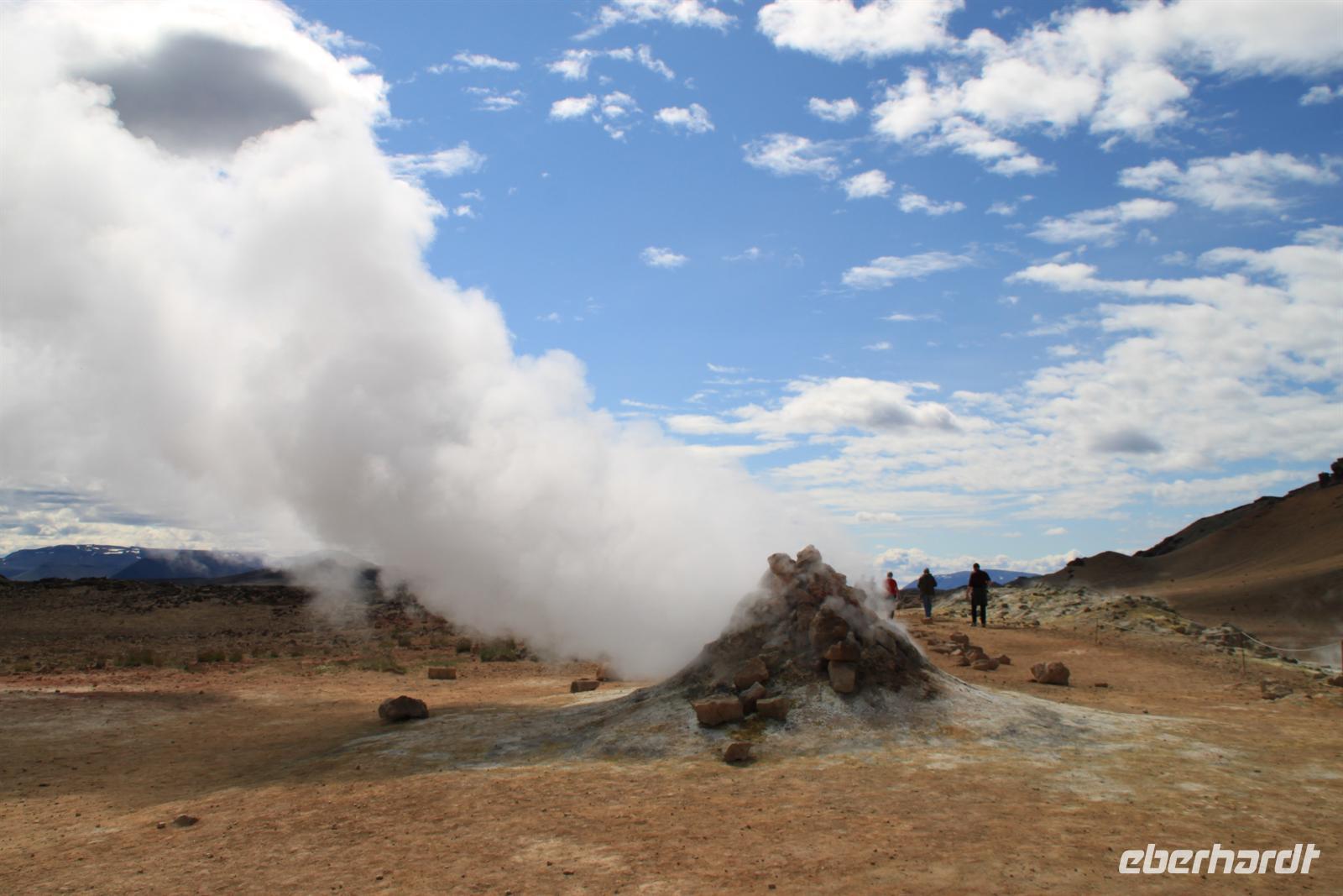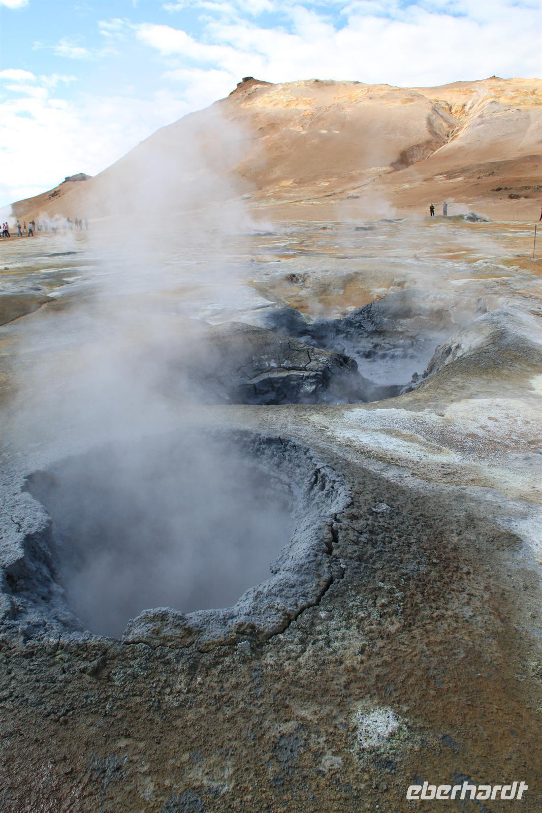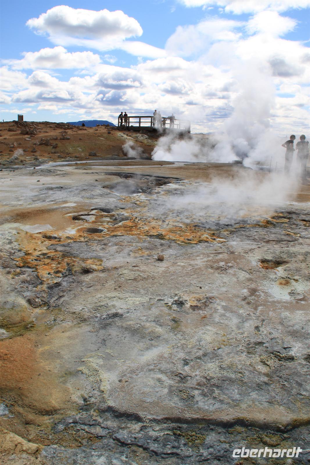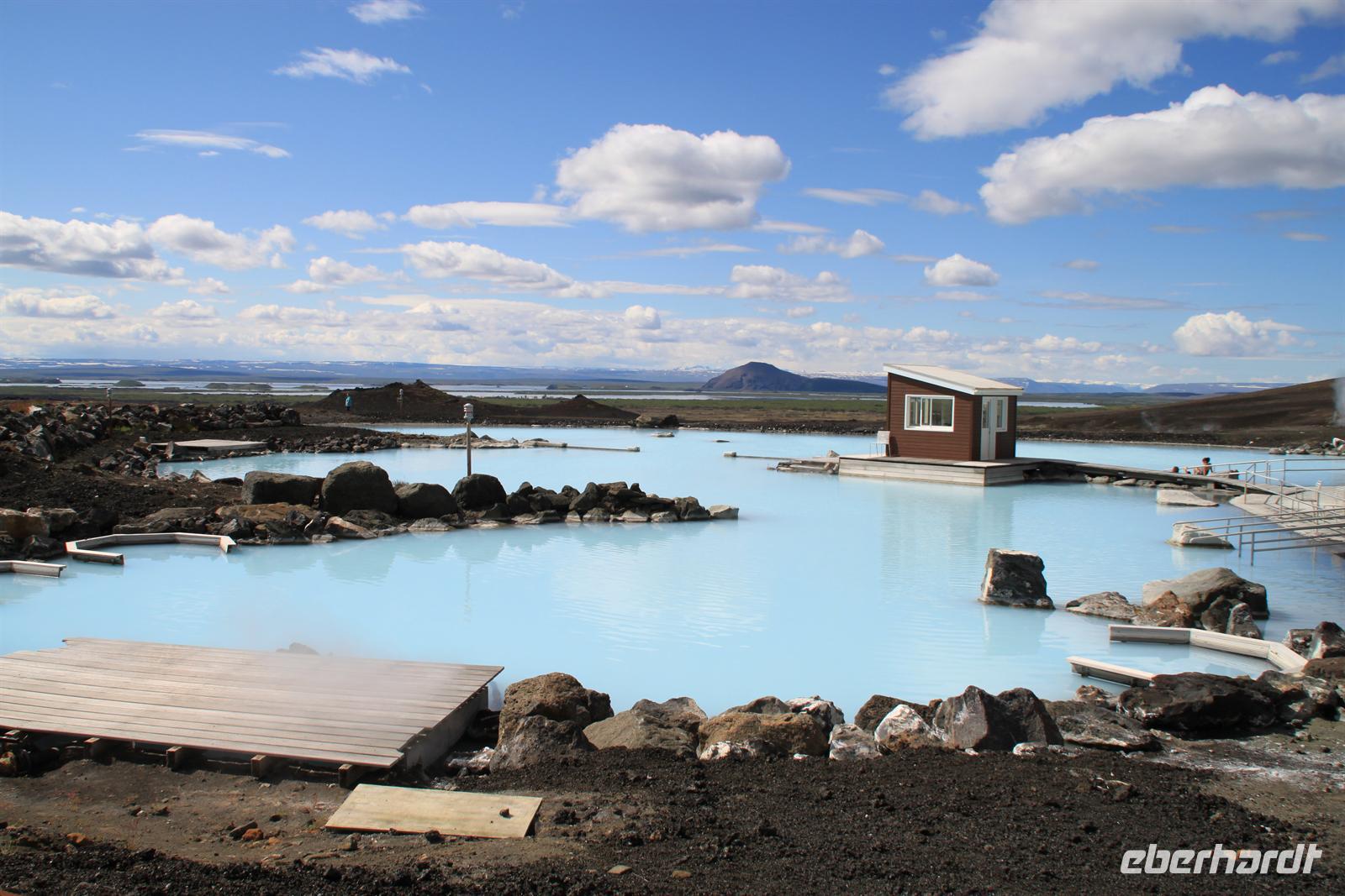 Wieder stand ein Tag mit vielen beeindruckenden Naturschauspielen auf dem Programm. Daher machten wir uns um 9 Uhr auf zum Myvatn Gebiet - auf Deutsch dem Mückensee. Unterwegs galt unser erster Stopp dem Godafoss Wasserfall, der in zwei Stufen aus 12 bzw. 6 Metern Höhe in die Tiefe stürzt. Auf der Weiterfahrt ließen wir den Myvatn See vorerst rechts liegen und fuhren zum Námaskard Hochtemperaturgebiet mit seinem Geothermalkraftwerk sowie den heißen Schwefelquellen, die geruchvoll zu Tage treten und den Dampf aus kochendem Schlamm in die Höhe sprühen. Einmal anders und ganz aus der Nähe nutzten wir eine heiße Schwefelquelle der Jardbödin Lagune, um baden zu gehen und uns im weichen fast cremigen Wasser ein wenig treiben zu lassen. Auf dem Weg zurück zum Myvatn lag nun das Lava-Labyrinth von Dimmuborgir, welches auch als die „Dunklen Burgen“ bezeichnet wird. Dort angekommen konnte auf einem Spaziergang durch diese einzigartige Landschaft ein Jeder diesen Namen nachvollziehen. Anschließend wollten wir nun auch dem Ufer des Myvatn einen Besuch abstatten und so spazierten wir an jenem entlang durch die Pseudokrater, von denen aus man einen wunderschönen Blick über die Seenlandschaft und das Naturgebiet ringsherum erhaschen kann.