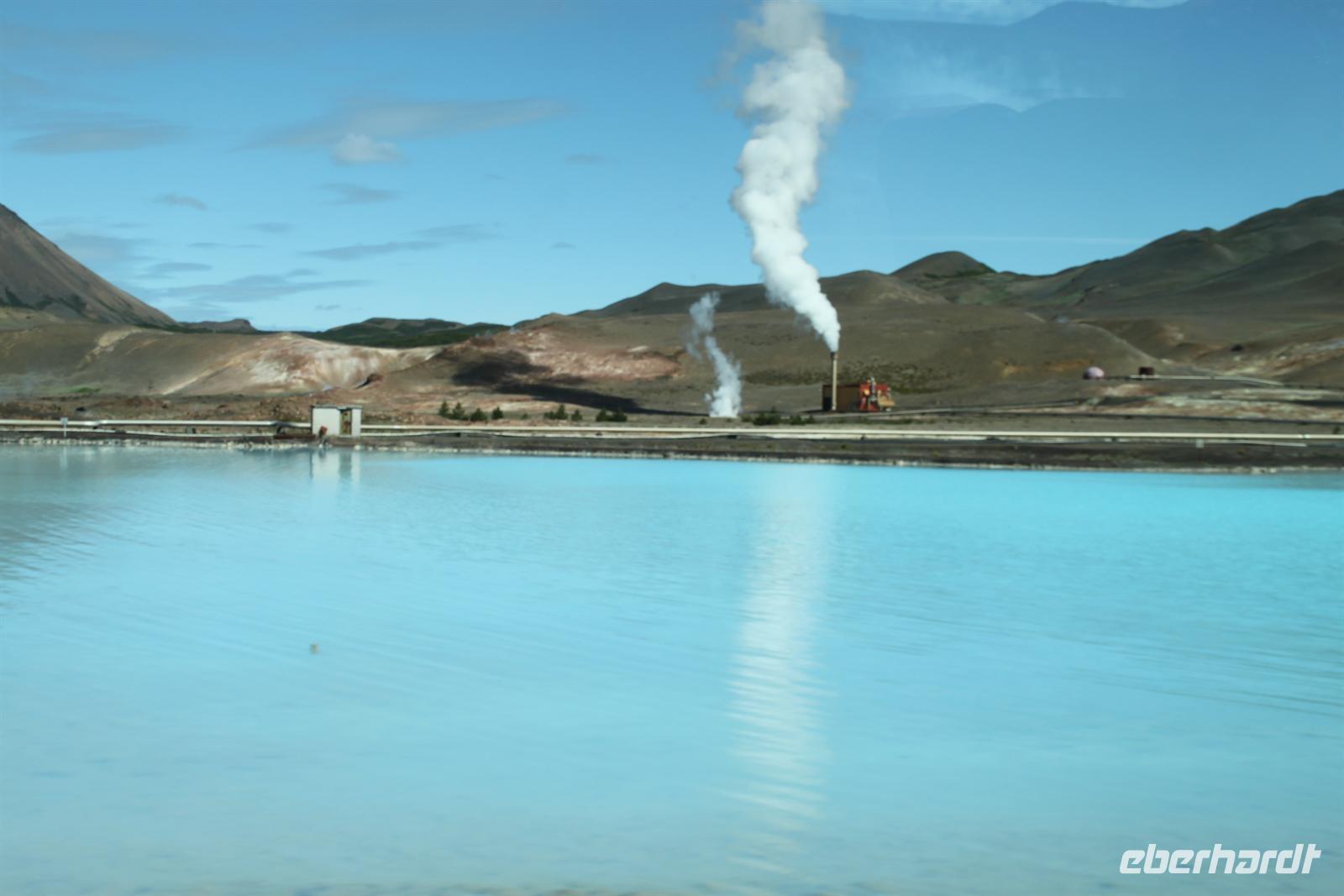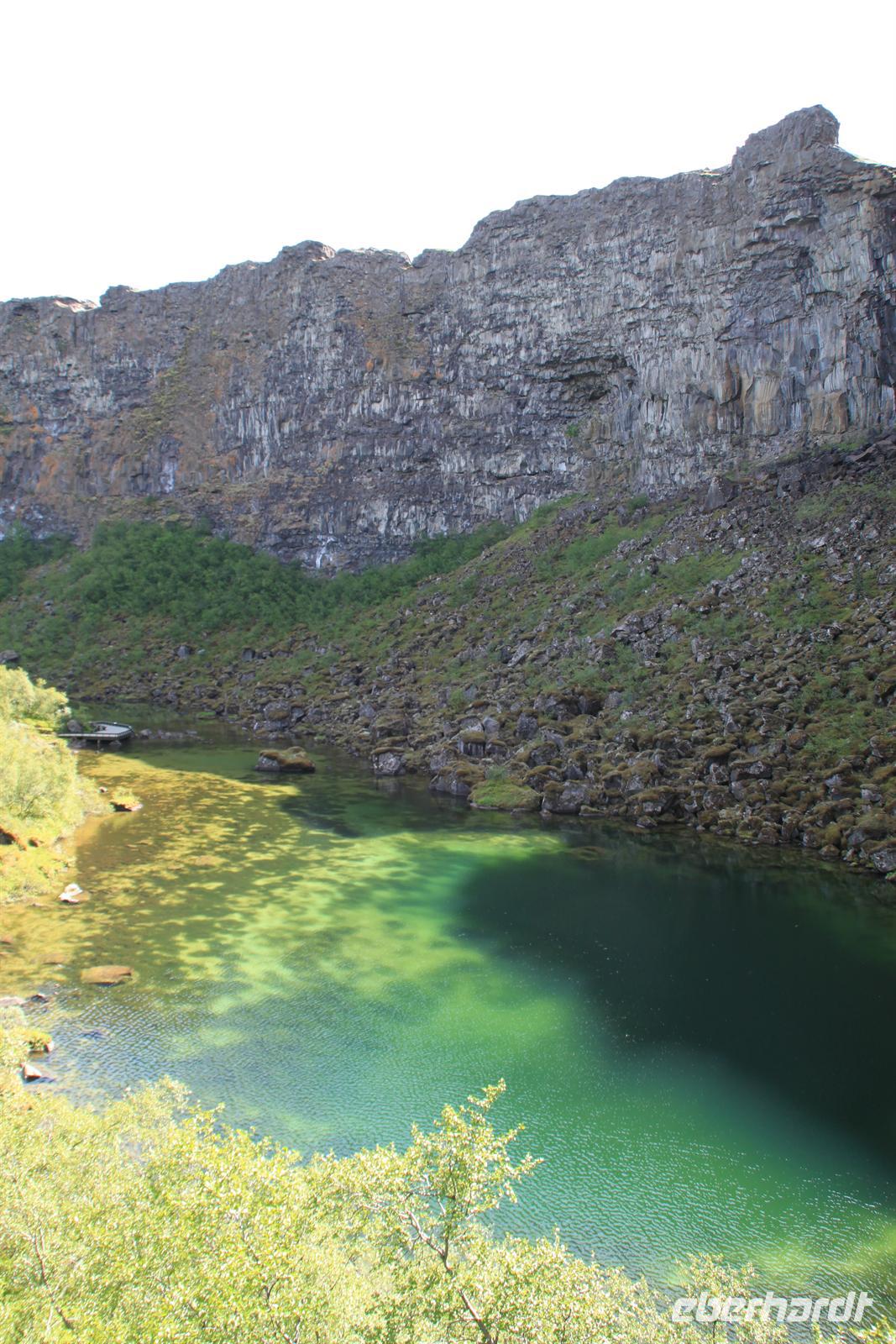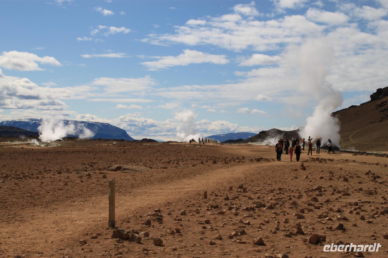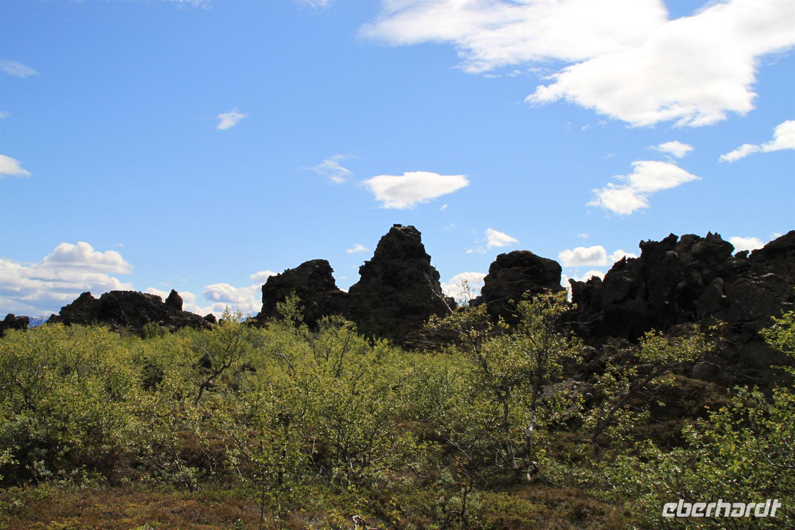 Wieder stand ein Tag mit vielen beeindruckenden Naturschauspielen auf dem Programm. Daher machten wir uns um 9 Uhr auf zum Myvatn Gebiet - auf Deutsch dem Mückensee. Unterwegs galt unser erster Stopp dem Godafoss Wasserfall, der in zwei Stufen aus 12 bzw. 6 Metern Höhe in die Tiefe stürzt. Auf der Weiterfahrt ließen wir den Myvatn See vorerst rechts liegen und fuhren zum Námaskard Hochtemperaturgebiet mit seinem Geothermalkraftwerk sowie den heißen Schwefelquellen, die geruchvoll zu Tage treten und den Dampf aus kochendem Schlamm in die Höhe sprühen. Einmal anders und ganz aus der Nähe nutzten wir eine heiße Schwefelquelle der Jardbödin Lagune, um baden zu gehen und uns im weichen fast cremigen Wasser ein wenig treiben zu lassen. Auf dem Weg zurück zum Myvatn lag nun das Lava-Labyrinth von Dimmuborgir, welches auch als die „Dunklen Burgen“ bezeichnet wird. Dort angekommen konnte auf einem Spaziergang durch diese einzigartige Landschaft ein Jeder diesen Namen nachvollziehen. Anschließend wollten wir nun auch dem Ufer des Myvatn einen Besuch abstatten und so spazierten wir an jenem entlang durch die Pseudokrater, von denen aus man einen wunderschönen Blick über die Seenlandschaft und das Naturgebiet ringsherum erhaschen kann.