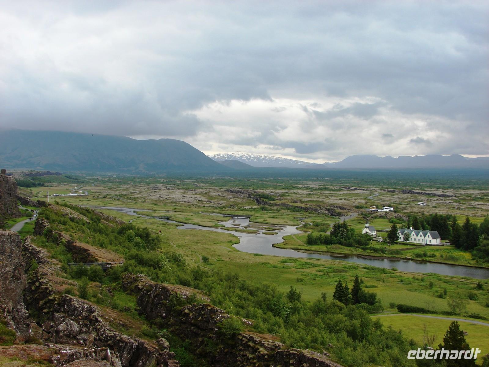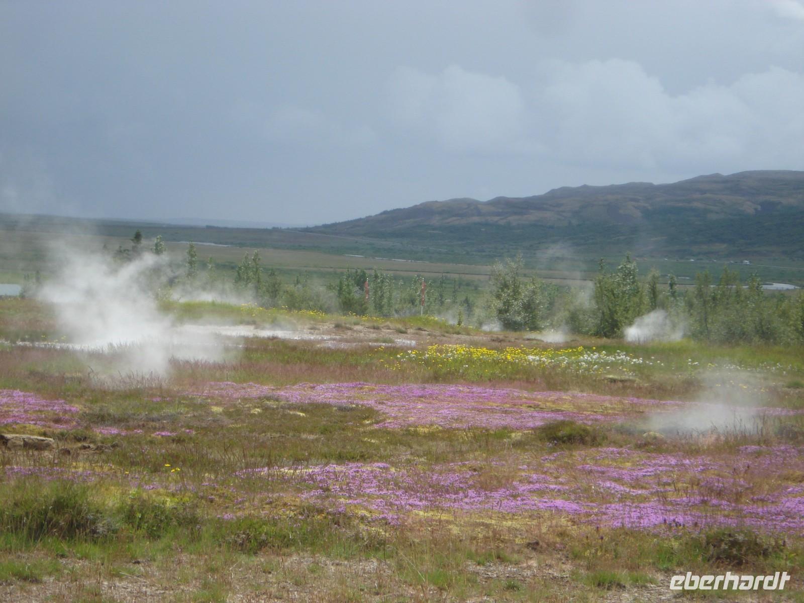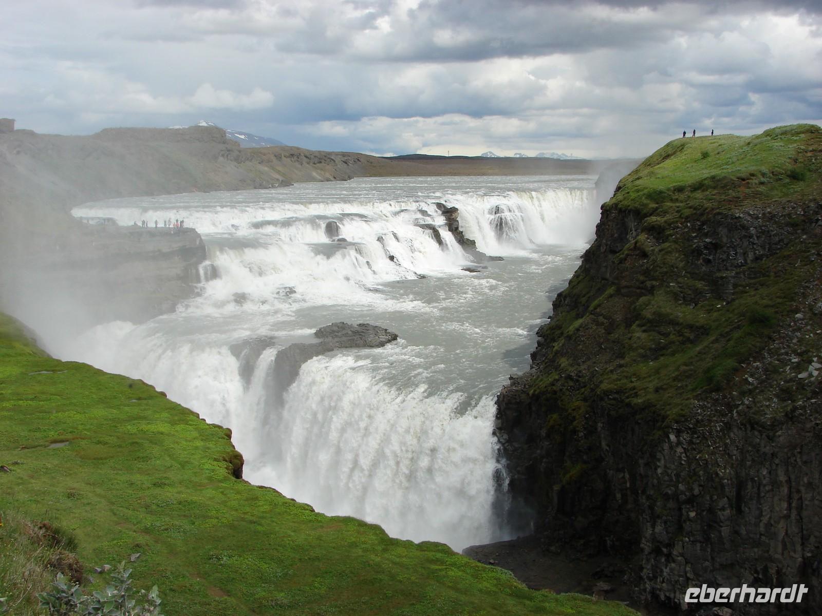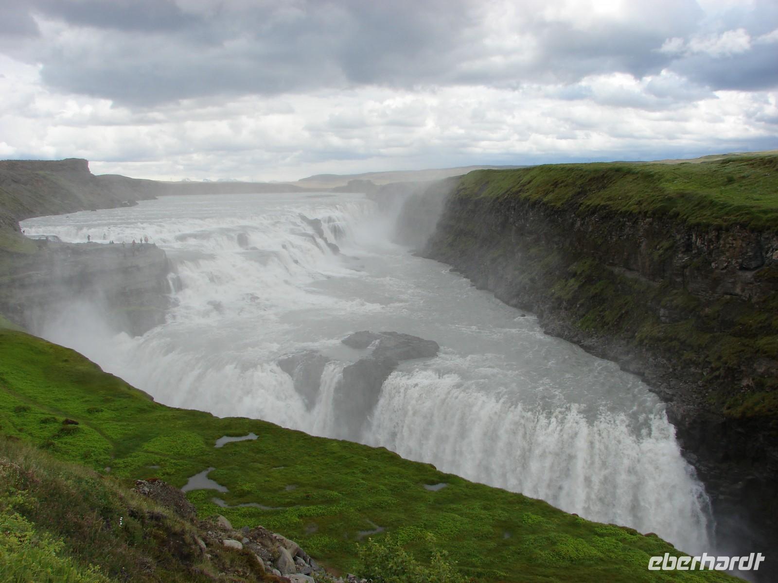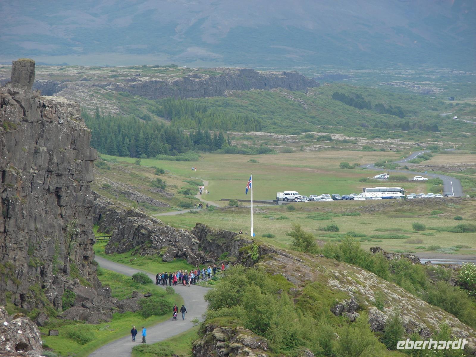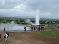 Mehr oder weniger gut ausgeschlafen nach einer relativ kurzen Nacht begrüßte uns am Morgen die Sonne und es versprach ein schöner Tag zu werden. Heute erwartete uns gleich bereits einer der Höhepunkte unserer Reise, die Fahrt auf dem „Goldenen Kreis“. 10.00 Uhr holte uns unser Reiseleiter für einen Tag, Ulrik, vom Hotel ab. Unsere eigentliche Reiseleiterin Rosa war krank, so dass Ulrik für Sie einsprang - und er machte seine Sache hervorragend. Bereits vorher hatten die meisten von uns die Umgebung des Hotels etwas näher erkundet und die Zeit genutzt, um Geld zu tauschen. Und dann ging es los… Zunächst fuhren wir nach Thingvellir, dem Platz, an dem bereits im 10. Jahrhundert das erste demokratische Parlament stattfand und sich die Kontinente Amerika und Europa bzw. Asien treffen. Wir blickten voller Ehrfurcht von der amerikanischen Platte auf die euroasiatische Platte und erfuhren viel Wissenswertes über die Geotektonik. Leider war der Weg durch die Schlucht bis zum Felsen, auf dem die tatsächliche Rechtssprechung erfolgt, wegen Stabilisierungsmaßnahmen, die die Verschiebung der Kontinentalplatten mit sich bringt, gesperrt. Weiter fuhren wir zum „Gulfoss“, dem wohl bekanntesten aller Wasserfälle auf Island. Voller Kraft stürzte das Wasser in die Tiefe und so mancher von uns wagte sich mitten in die Gischt ganz nah an den Fall heran. Ein tolles Erlebnis!