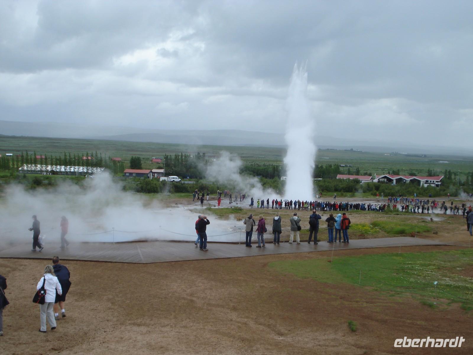 Und dann war es endlich soweit, die gewaltige Fontäne des Geysirs Strokkur begrüßte uns schon weitem. Erwartungsvoll standen wir rund um den Geysir und zückten die Kameras um den eindrucksvollen Moment, in dem die Fontäne nach oben schießt, als Erinnerung festzuhalten. Einmalig war der gleich dreimalige „Ausbruch“ bevor wir dann wiederum eine kleine Ewigkeit auf die nächste Fontäne warten mußten. Auf dem Rückweg ins Hotel unternahmen wir noch eine kleine Rundfahrt durch Reykjavik und stoppten am Perlan. Wir staunten nicht schlecht, als uns Ulrik von der Aussichtsplattform die „Copacabana“ von Reykjavik zeigte. Am Abend erwartete uns ein hervorragendes 3-Gänge-Menü im Restaurant Höfnin direkt am Hafen. Alle stellten fest, dass frischer Fisch ganz besonders lecker schmeckt. Und für die „Nichtfischesser“ unter uns gab es auch eine schmackhafte Alternative. Da es noch hell war nutzten einige von uns die Zeit und schauten sich den interessanten Konzertneubau, die sogenannte „Harfe“, von innen an. Andere Gäste wiederum spazierten am Wasser entlang oder durch die Altstadt von Reykjavik und die Fussballfans konnten zumindest die Verlängerung und das Elfmeterschiessen des EM-Halbfinales zwischen Spanien und Portugal auf der großen Leinwand direkt am Hotel sehen. Übrigens hat Spanien gewonnen. Die Spannung stieg natürlich, ob es Deutschland am nächsten Tag auch schaffen würde.