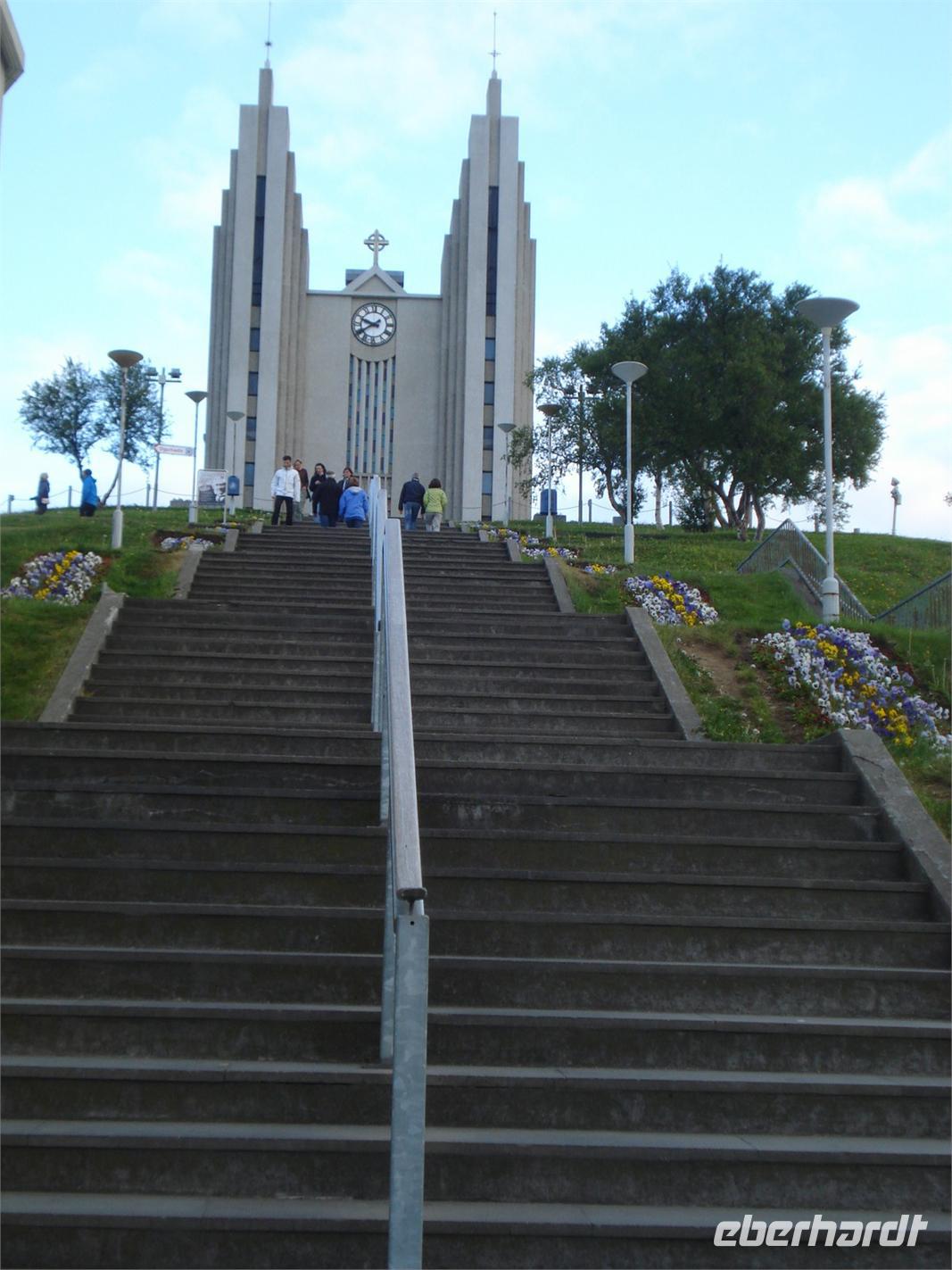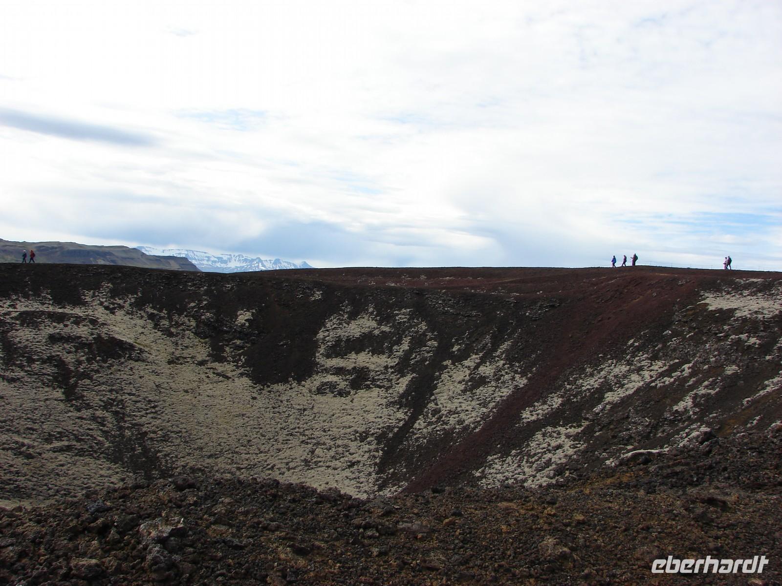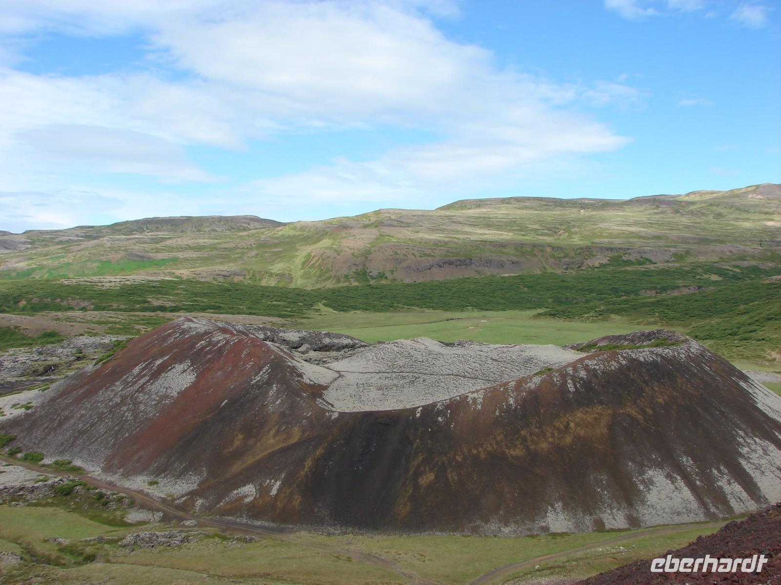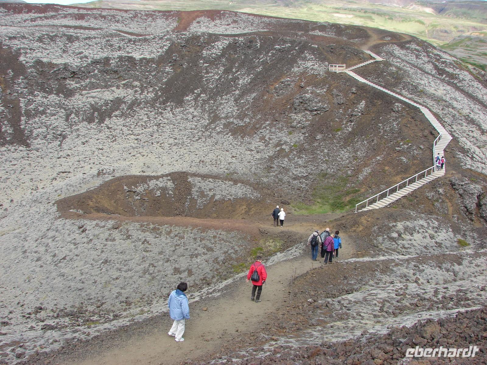 Heute lernten wir unsere Reiseleiterin Rosa kennen. Sie erwartete uns früh am Hotel und bei schönem Wetter starteten wir in den Tag. Nach dem Frühstück sollte es auf einem der längsten Teilstücke unserer Reise in den Norden nach Akureyri gehen. Durch den Walfjordtunnel verkürzte sich die Fahrzeit im Vergleich zu früher um mehrere Stunden. Einen ersten kurzen Stop zum Beinevertreten legten wir in Borgarnes ein. Und dann ging es schon zum Aufstieg auf den Krater Grabrok. Ein wenig anstrengend war der Aufstieg schon, aber der tolle Blick direkt in den Krater und die herrliche Sicht in die Umgebung entschädigten für die Mühen. Wer wollte, konnte den Krater sogar umrunden. Zur Mittagspause hielten wir in Stadaskarl. Die meisten von uns gönnten sich ein typisches Lachsbrot und genossen bei einem Kaffee die strahlende Sonne auf einer der Bänke im Freien. Ganz gespannt waren wir bereits auf den Nachmittag, denn wir fuhren auf den Reiterhof in Flugumyri. Eine herzliche Begrüßung mit Crêpes, Kaffee und Tee ließ das Eis schnell tauen. Sehr anschaulich, sogar mit darstellerischen Fähigkeiten, zeigte uns deshalb ein Nachbar der Besitzer, die selber zu einer Veranstaltung unterwegs waren, die verschiedenen Gangarten der Islandpferde - die Nachahmung des "Tölt" war dabei ein besonderer Höhepunkt. Anschließend hatte jeder die Möglichkeit die Pferde aus nächster Nähe zu betrachten. Ganz besonders interessiert waren wir an den Erzählungen der beiden aus Deutschland stammenden Frauen, die uns später ihre Reitkünste zeigten. Und dann ging es schon auf direktem Weg nach Akureyri, wo wir für 2 Nächte im Hotel "Edda", einem der besten Islands, wohnten. Ein leckeres Büffet am Abend mit allerlei Spezialitäten und einem extra Desserttisch begeisterte uns alle. Der eine oder andere spazierte noch durch den Botanischen Garten gleich neben dem Hotel und staunte, welche Pflanzen und Blumen sogar so hoch im Norden gedeihen. Leider trübte die Niederlage der Fussballnationalmannschaft gegen Italien den Abend für einige... Am nächsten Morgen sah die Welt schon wieder viel besser aus!