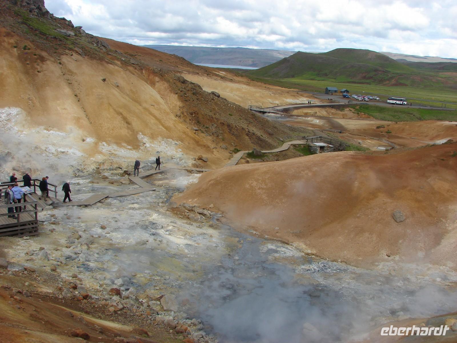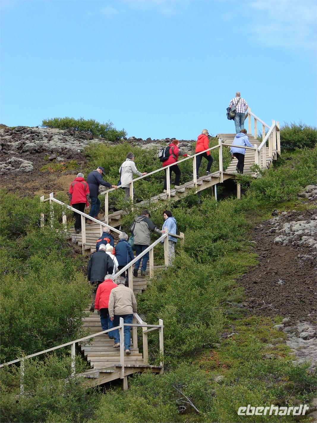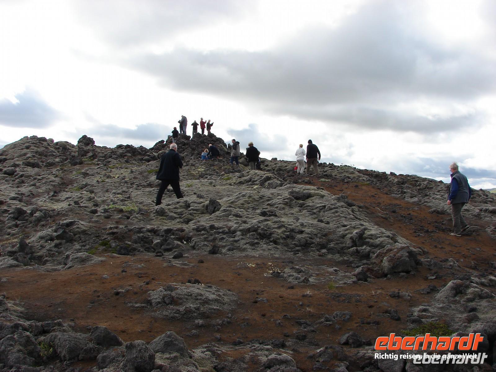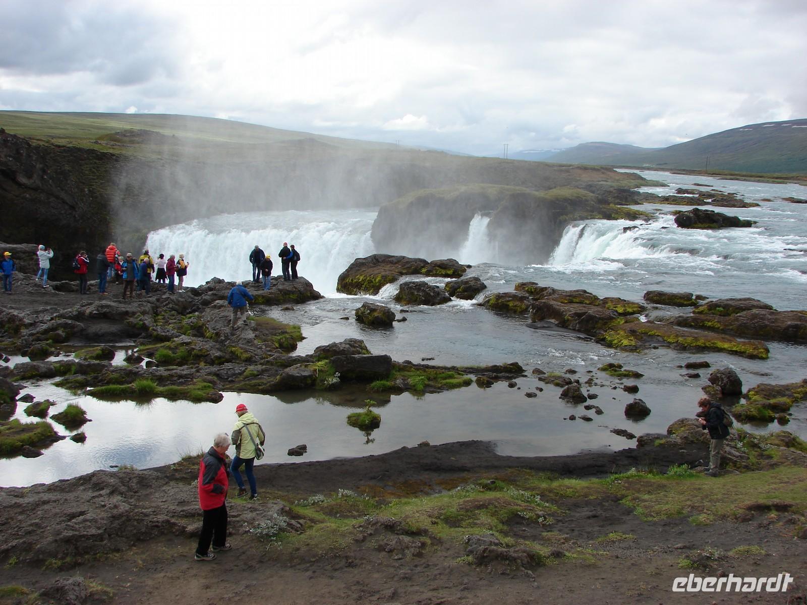 Der heutige Tag stand ganz im Zeichen der Region um den Myvatn, den "Mückensee", und seiner unglaublich vielfältigen Landschaftsformen. Unser erstes Ziel war der Götterwasserfall "Godafoss". Neugierig lauschten wir den Erzählungen Rosas zur Legende um die Namensgebung bevor wir den Godafoss hautnah erlebten. Ganz anders sah es wenige Kilometer weiter im kargen Hochtemperatur Namasgard aus. Unterschiedlichste Farbkombinationen der Erde, strenge Schwefelgerüche und -dämpfe sowie blubbernde Schlammquellen begeisterten uns. So mancher stellte sich genauso die Hölle vor. Ebenso vegetationslos und doch ganz anders sah es bei unserem Aufstieg zum Krater in Kraflagebiet aus. Kilometerweite Lavafelder, wohin man auch schaute. Und trotzdem faszinierte diese eigenartige Landschaft. Ein kurzer Fotostopp führte uns abschließend zum Krater Vit mit seiner türkisblauen Färbung - einfach unbeschreiblich. Nach den vielen Aktivitäten gönnten wir uns eine Pause im warmen Wasser der Badelandschaft "Jardbodin". Besonders gefallen hat uns dabei, dass wir fast das ganze Bad für uns hatten und einfach mal die Seele baumeln lassen konnten. Doch der Tag war noch nicht zu Ende. Bereits auf dem Weg vom Vulkansystem der Krafla hatten wir einen weiten Blick über den ausgebreiteten, relativ flachen Mückensee mit seinen Inseln, die verschiedenen Grüntönen leuchteten. Unweit des Sees liegt das Gebiet Dimmuborgir, dass mit unzähligen Tuffsteinformationen aufwartet. Bei einer kleinen Wanderung durch die "dunklen Berge" lernten wir auch die Geschichte der 13 isländischen Weihnachtsgesellen kennen, die hier wohnen sollen. Zurück am See stoppten wir an den Pseudokratern, die sich direkt im Myvatn befinden und so mancher war erstaunt, dass diese nicht direkt durch aktiven Vulkanismus entstanden sind. Der Abend hielt für einige Gäste unserer Gruppe noch einen ganz besondern Ausflug parat. Selbst nach 22.00 Uhr war es noch taghell und hoch zu Islandpferd erkundeten wir auf einem Ausritt die schöne Umgebung von Akureyri.