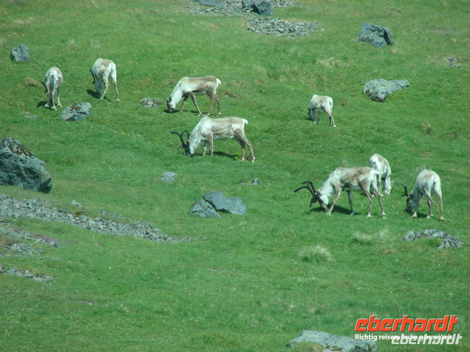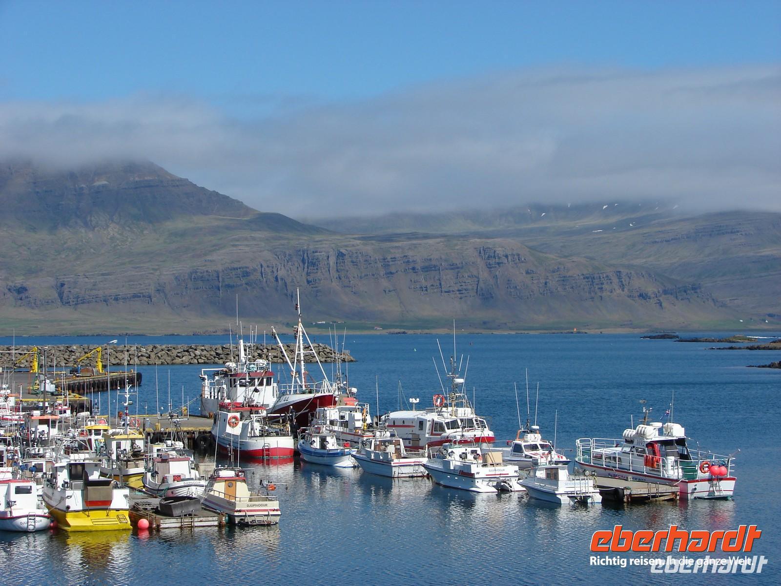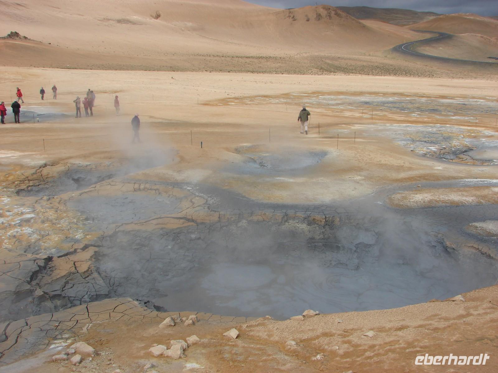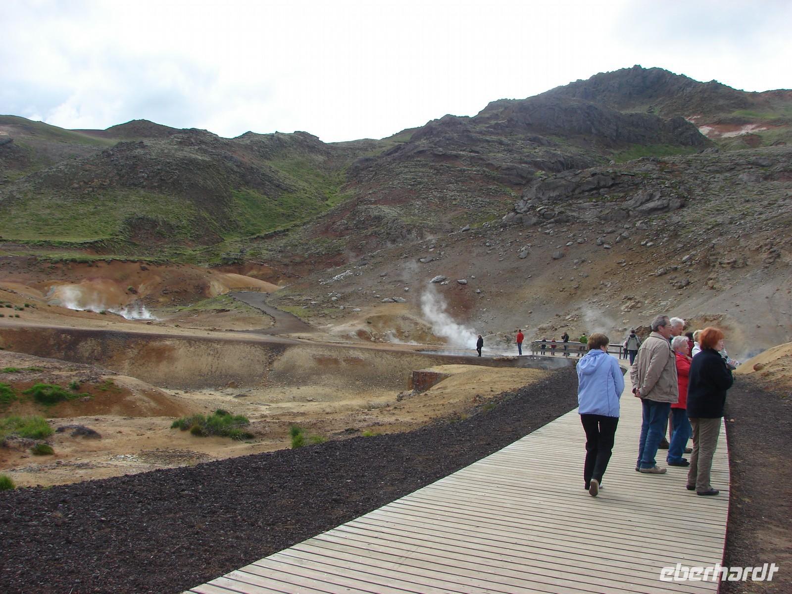 Der heutige Tag stand ganz im Zeichen der Region um den Myvatn, den "Mückensee", und seiner unglaublich vielfältigen Landschaftsformen. Unser erstes Ziel war der Götterwasserfall "Godafoss". Neugierig lauschten wir den Erzählungen Rosas zur Legende um die Namensgebung bevor wir den Godafoss hautnah erlebten. Ganz anders sah es wenige Kilometer weiter im kargen Hochtemperatur Namasgard aus. Unterschiedlichste Farbkombinationen der Erde, strenge Schwefelgerüche und -dämpfe sowie blubbernde Schlammquellen begeisterten uns. So mancher stellte sich genauso die Hölle vor. Ebenso vegetationslos und doch ganz anders sah es bei unserem Aufstieg zum Krater in Kraflagebiet aus. Kilometerweite Lavafelder, wohin man auch schaute. Und trotzdem faszinierte diese eigenartige Landschaft. Ein kurzer Fotostopp führte uns abschließend zum Krater Vit mit seiner türkisblauen Färbung - einfach unbeschreiblich. Nach den vielen Aktivitäten gönnten wir uns eine Pause im warmen Wasser der Badelandschaft "Jardbodin". Besonders gefallen hat uns dabei, dass wir fast das ganze Bad für uns hatten und einfach mal die Seele baumeln lassen konnten. Doch der Tag war noch nicht zu Ende. Bereits auf dem Weg vom Vulkansystem der Krafla hatten wir einen weiten Blick über den ausgebreiteten, relativ flachen Mückensee mit seinen Inseln, die verschiedenen Grüntönen leuchteten. Unweit des Sees liegt das Gebiet Dimmuborgir, dass mit unzähligen Tuffsteinformationen aufwartet. Bei einer kleinen Wanderung durch die "dunklen Berge" lernten wir auch die Geschichte der 13 isländischen Weihnachtsgesellen kennen, die hier wohnen sollen. Zurück am See stoppten wir an den Pseudokratern, die sich direkt im Myvatn befinden und so mancher war erstaunt, dass diese nicht direkt durch aktiven Vulkanismus entstanden sind. Der Abend hielt für einige Gäste unserer Gruppe noch einen ganz besondern Ausflug parat. Selbst nach 22.00 Uhr war es noch taghell und hoch zu Islandpferd erkundeten wir auf einem Ausritt die schöne Umgebung von Akureyri.