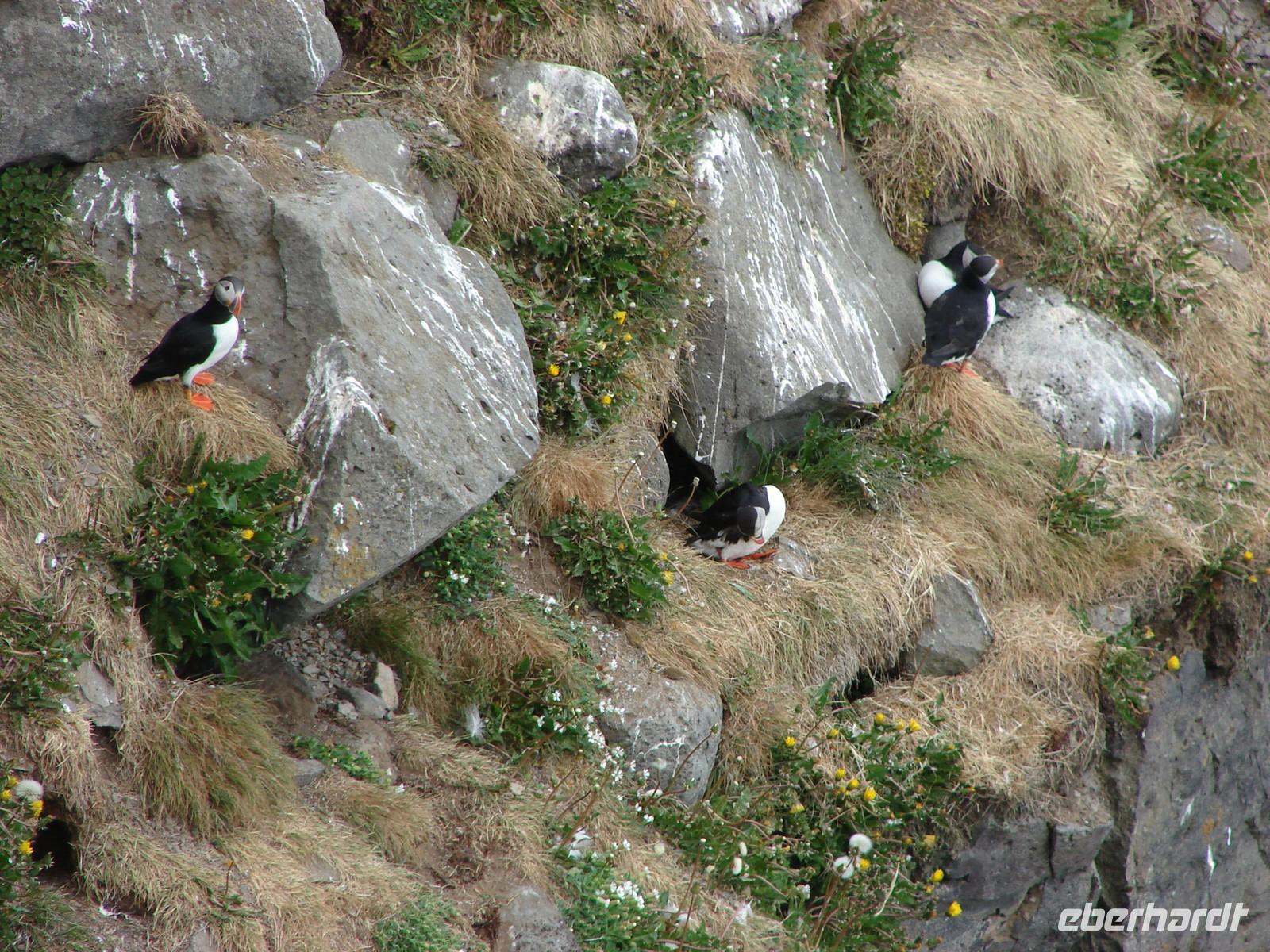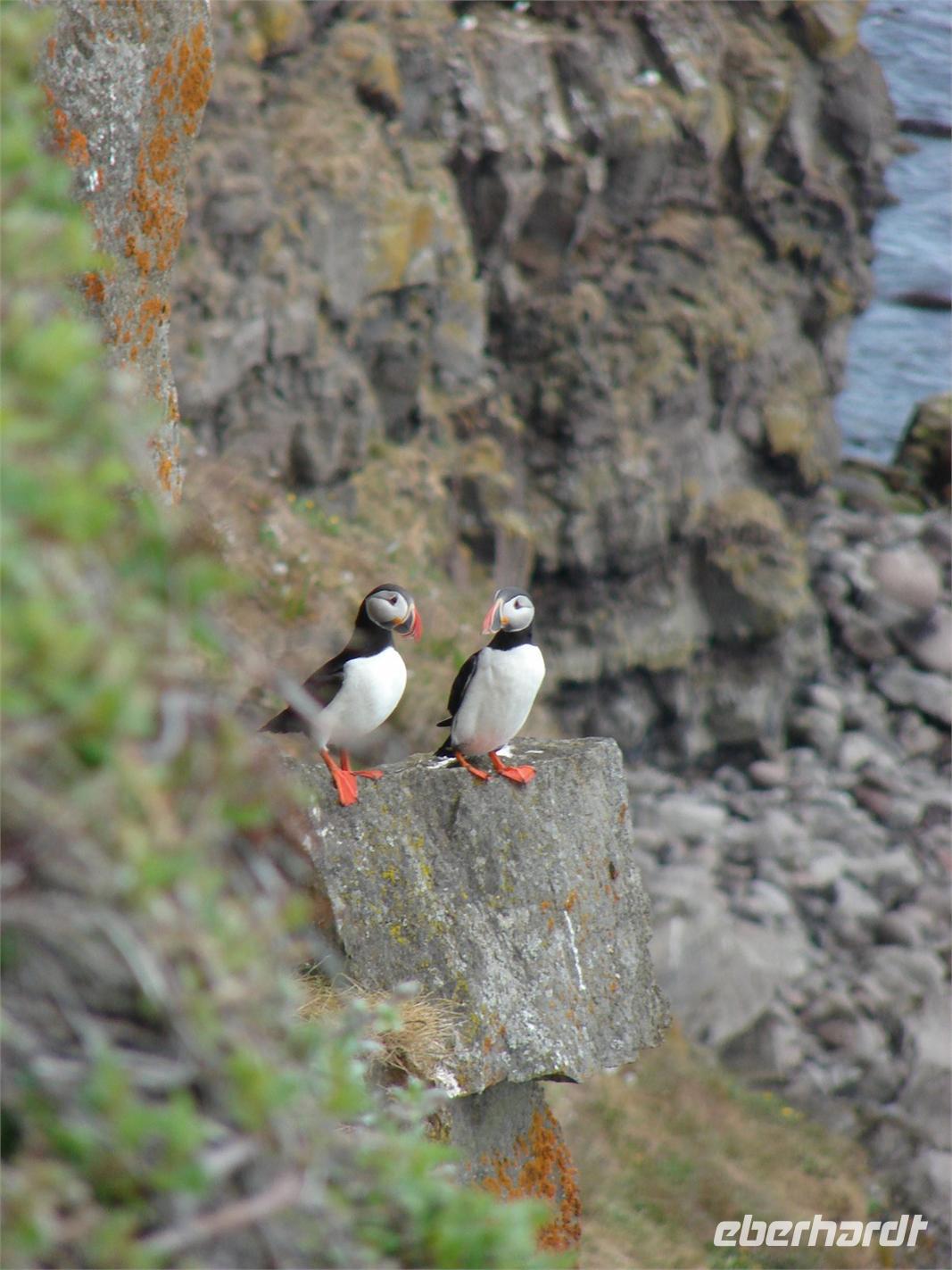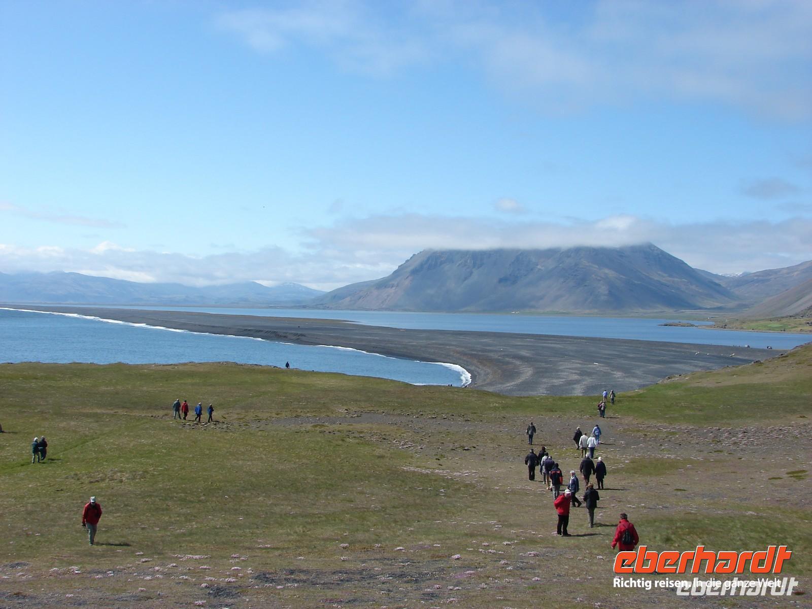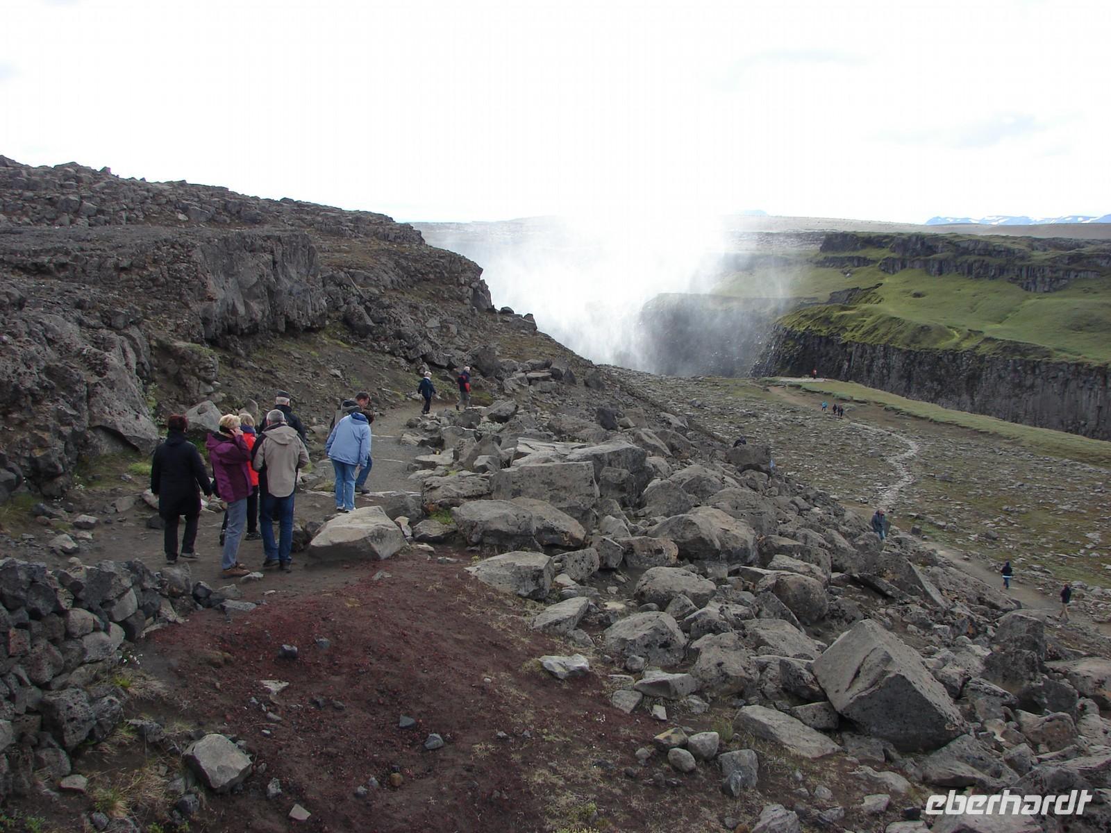 Heute lag nochmal eine lange Etappe vor uns - das Ziel hieß Egilsstadir an den Ostfjorden Islands. Bevor es so richtig auf Reisen ging, deckte sich jeder von uns für das geplante Mittagspicknick im Supermarkt ein. Bei einer kurzen Rundfahrt durch den älteren Teil von Akureyri sahen wir die schönen Häuser in der typischen Wellblecharchitektur und das sogenannte "Nonnahaus", das ehemalige Wohnhaus des bekannten Schriftstellers "Nonni". Mit seinen Erzählungen verbinden nicht nur in Island viele Leute wunderschöne Kindheitserinnerungen. In Husavik machten wir unseren ersten Stopp. Wir besuchten die kleine Kirche oder das interessante Walmuseum, das vom Europäischen Walzentrum betrieben wird.Nördlich von Husavik entfernt zeigte uns Rosa eine Insider-Stelle, an der man Papageientaucher beobachten kann und wir hatten riesiges Glück... An den Klippen kamen wir den possierlichen Tieren relativ nah. Wer eine gute Kamera hatte, konnte sie richtig gut fotografieren. Ein Höhepunkt an diesem Tag sollte die durch Gletscherläufe geformte hufeisenförmige Felsschlucht von Asbyrgi werden. Laut der nordischen Mythologie soll Ásbyrgi jedoch durch einen Hufabdruck von Odins Pferd entstanden sein. Mystisch und faszinierend lauschten wir Rosas Gedicht. Lustig ging es dagegen beim anschließenden Picknick zu, jeder packte aus, was er sich am Morgen gekauft hatte. Mit einem gewaltigen Tosen erwartete uns als nächstes der bis zu 100 Meter hohe Detifoss. Faszinierend standen wir nach einem beschwerlichen Abstieg an der Abbruchkante inmitten der Gischt. Im Anschluss daran fuhren wir zum höchstgelegensten Bauernhof Islands zur Kaffeepause. Von der Terrasse hatten wir eine tolle Sicht auf den Berg der Götter, der sonst oft nebelumschlungen ist. Auch einen Blick in die typischen Torfhäuschen und die kleine Kirche ließen wir uns nicht nehmen. Damit die Reise auch weiterhin so glücklich verläuft, steuerte unsere Fahrer Ole den Bus entlang einer Schotterpiste zu einem Steinhaufen mitten im "Nirvana". Wie viele andere Reisende, warfen auch wir einen Stein auf die Ansammlung. Auf der Busfahrt nach Egilsstadir las Rosa aus dem Roman "Die Eisumschlungene" vor, die von der Suche Ina von Grumbkows nach dem verschollenen Geologen Walther von Knebel berichtet.