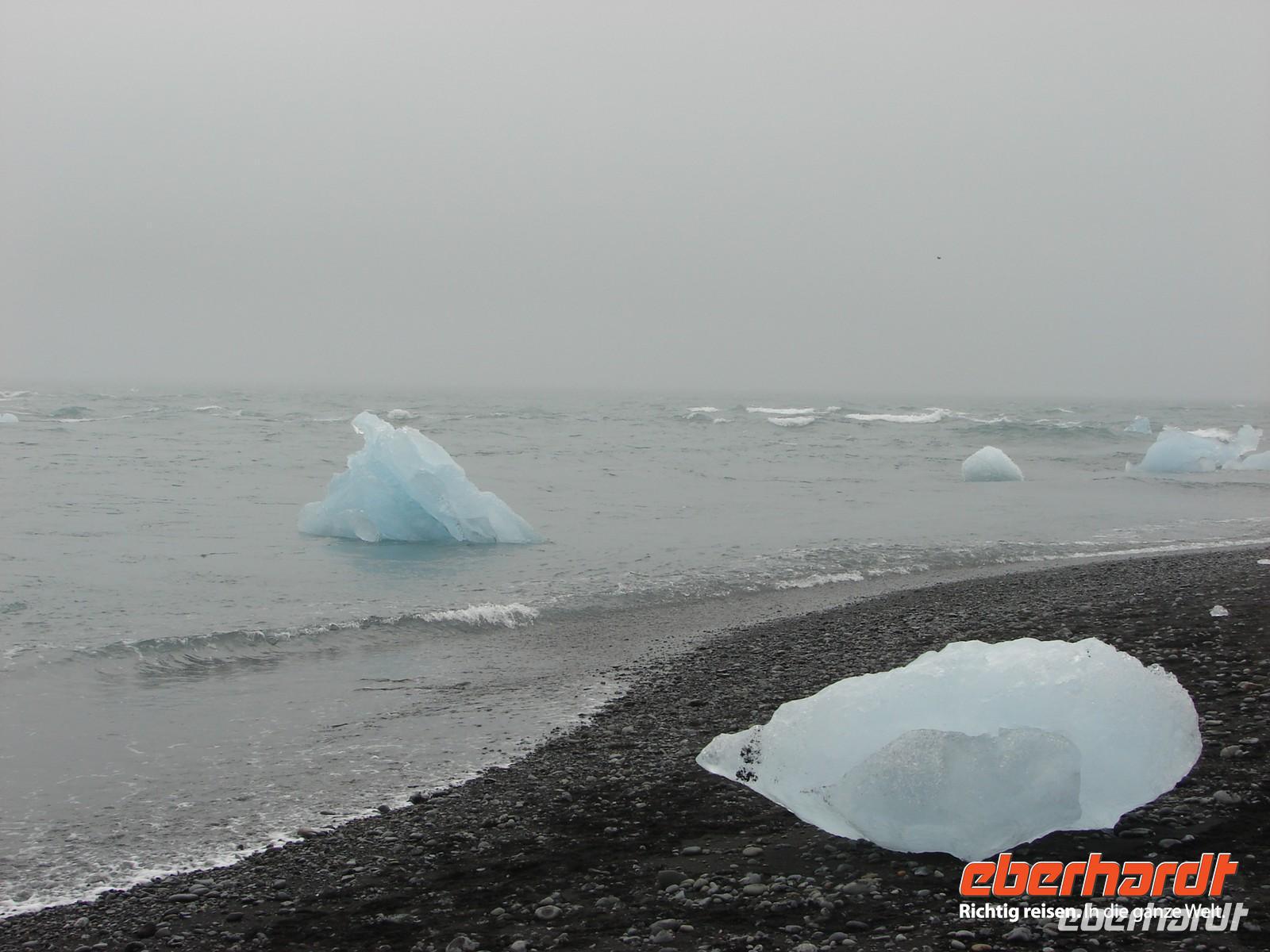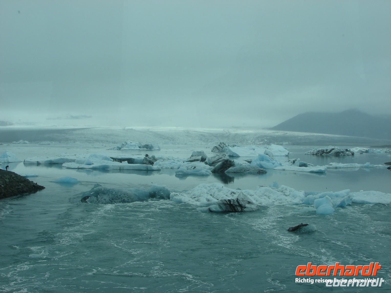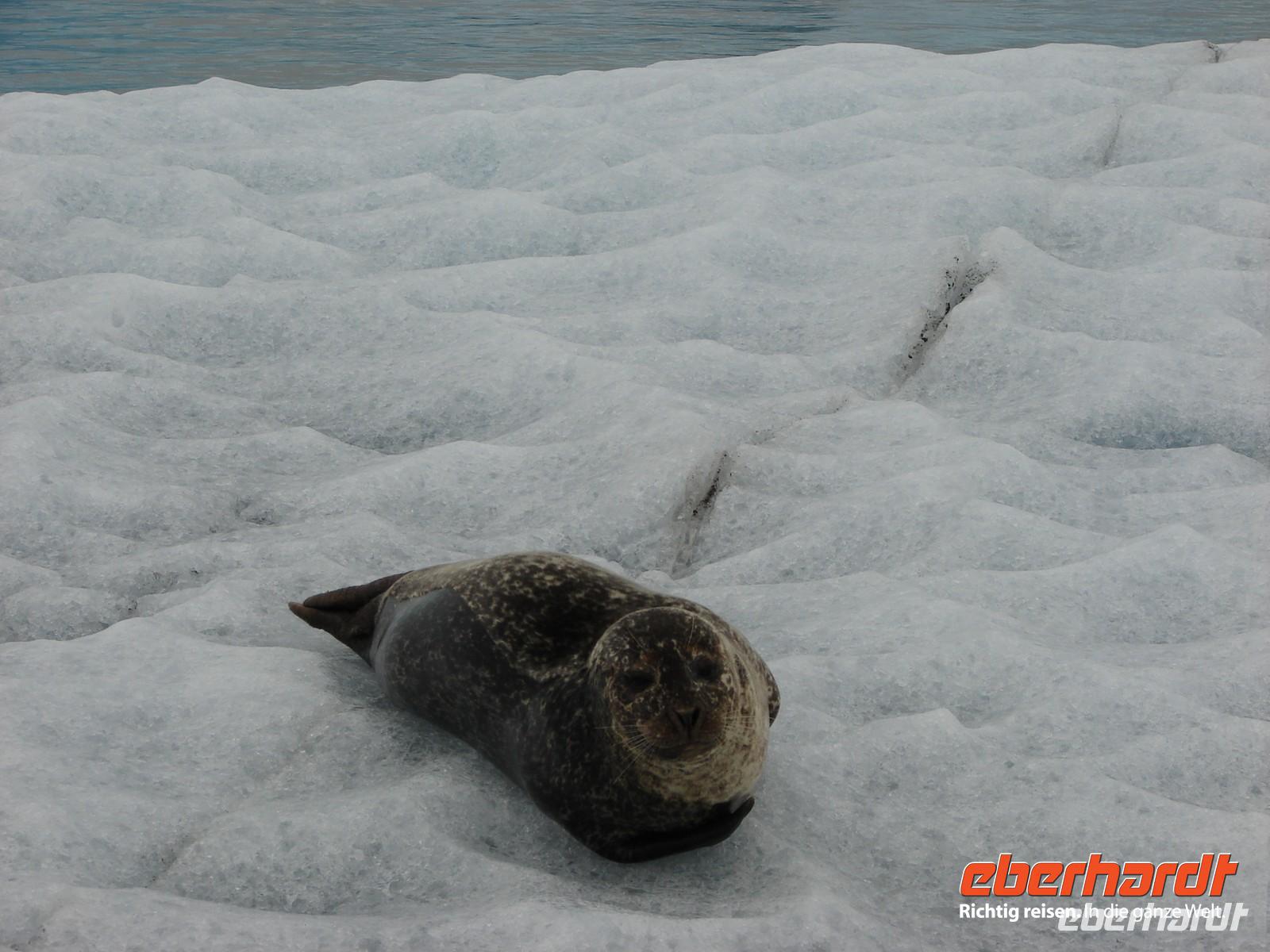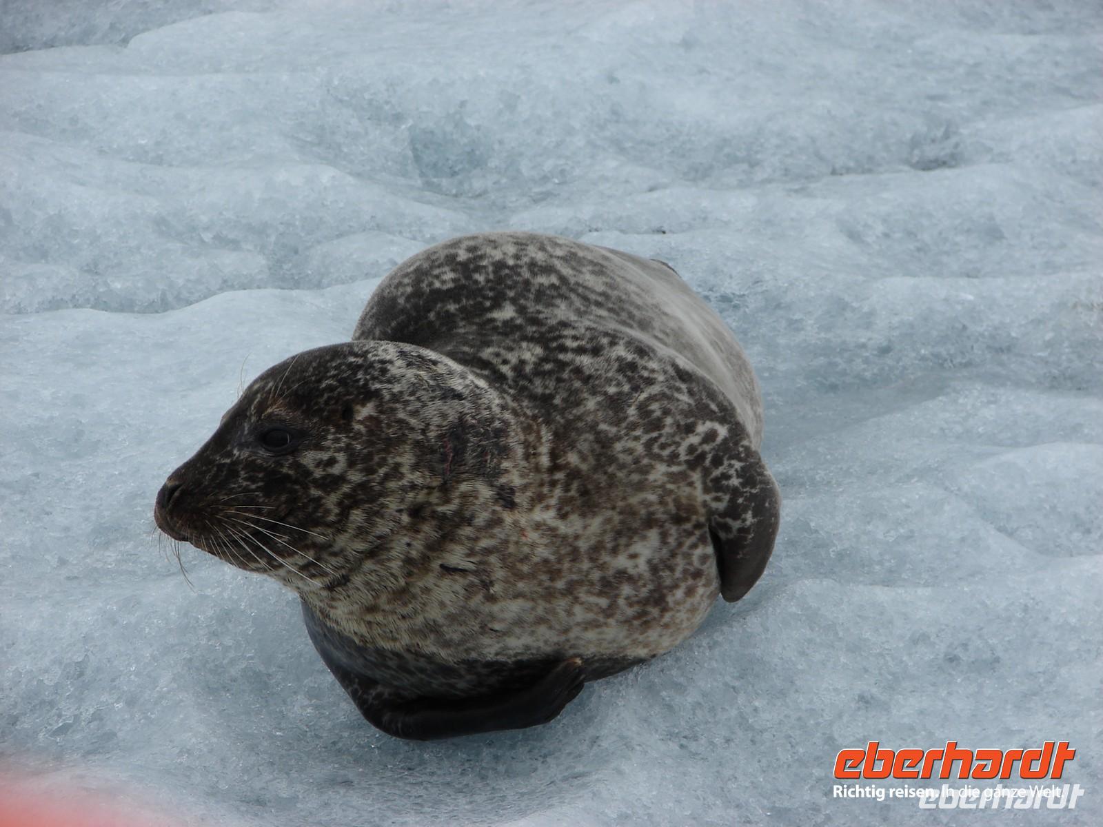 Der heutige Tag stand ganz im Zeichen der Gletscherlagune Jökulsárlón. Für viele Gäste unserer Gruppe war es einer der Höhepunkte unserer Reise, weil keiner so richtig auf das Naturschauspiel vorbereitet war. Mit Amphibienfahrzeugen ging es zunächst ganz nah an die Gletscherzunge und wir konnten uns ein wenig wie James Bond fühlen. Sogar frisches Gletschereis konnten wir probieren und ein auf einer Eisscholle ruhender Seehund schaute uns in Ruhe bei unserer Fahrt zu. Eine Besonderheit liegt neben der Größe in der Vielzahl an gekalbten Eisbrocken und der Verbindung zum offenen Meer. Die durch den kurzen Fluss ins offene Meer herausgetriebenen Eisstücke werden durch die Gezeiten an den schwarzen Basalt- und Lavastrand gespült. Das strahlende Blau des Eises im Kontrast zum schwarzen Strand ergeben eine einzigartige Kulisse. In Svanifelljökull hatten wir dann auch die Möglichkeit zu Fuss ganz dicht an eine der Gletscherzungen zu gehen. Danach stärkten wir uns bei einem rustikalen Picknick und probierten verschiedenen isländische Spezialitäten, unter anderem Trockenfisch, Lachs, einen zünftigen Brennevin und Kremkekse. Voller Elan machten wir uns dann zur nächsten Wanderung im Skaftafell NP auf. Da es ausgerechnet in diesem Moment anfing zu regnen. Die Gäste, die tapfer mit durch den Regen wanderten, testen zum einzigsten Mal auf unserer Reise ihre Regenbekleidung. Bei der Fahrt durch die Region des großen Gletscherlaufes aus dem Jahr 1996, der einen Teil der Ringstraße zerstörte, konnte man die Kraft der Natur regelrecht spüren. Unser Hotel in Vik lag nicht weit vom Strand entfernt, so dass so mancher am Abend einen Spaziergang dorthin unternahm. Auch die Wollfabrik fand ihre Fans und das eine oder andere Andenken aus Wolle wurde gekauft. Nach dem Abendessen zeigte uns Rosa unter anderem auf Video einen tollen Film über den großen Vulkanausbruch mit dem verhängnisvollen Gletscherlauf.