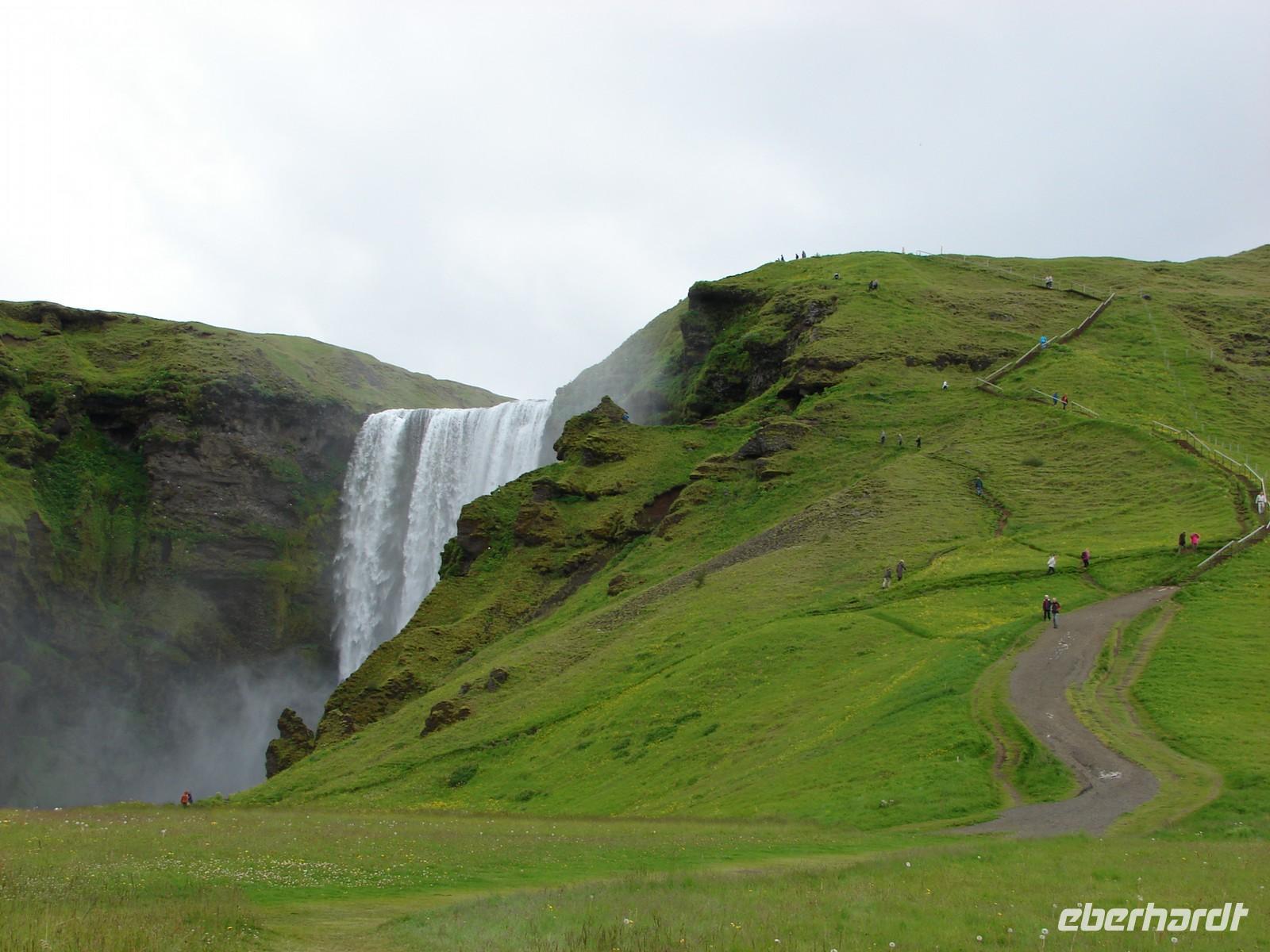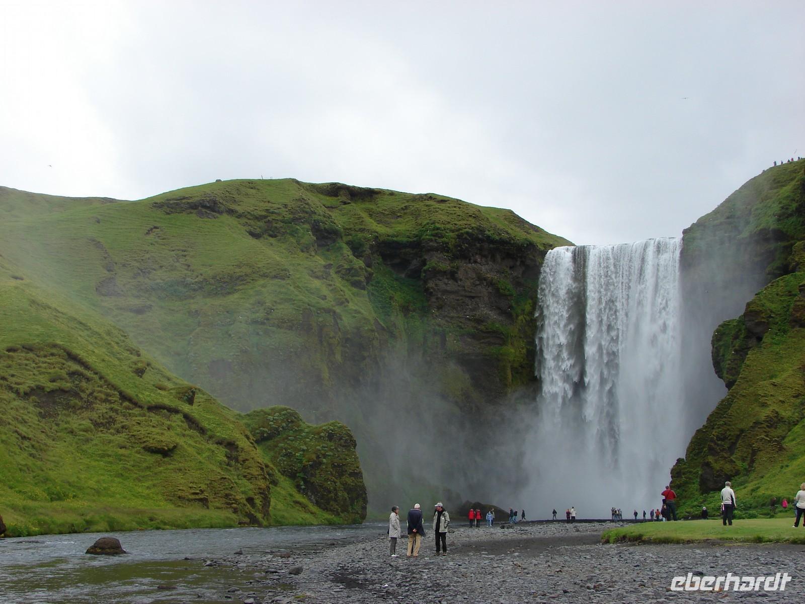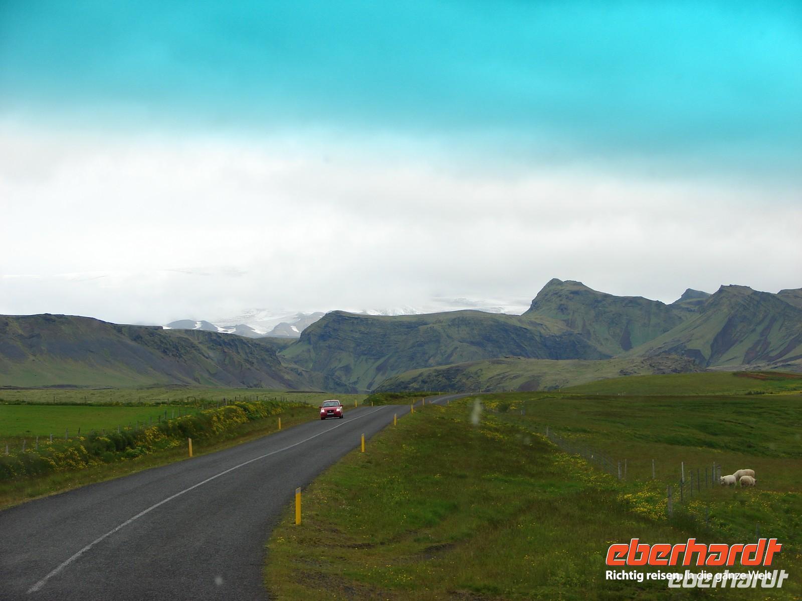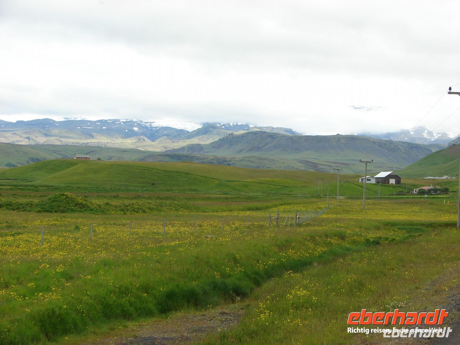 Der heutige Tag stand ganz im Zeichen der Gletscherlagune Jökulsárlón. Für viele Gäste unserer Gruppe war es einer der Höhepunkte unserer Reise, weil keiner so richtig auf das Naturschauspiel vorbereitet war. Mit Amphibienfahrzeugen ging es zunächst ganz nah an die Gletscherzunge und wir konnten uns ein wenig wie James Bond fühlen. Sogar frisches Gletschereis konnten wir probieren und ein auf einer Eisscholle ruhender Seehund schaute uns in Ruhe bei unserer Fahrt zu. Eine Besonderheit liegt neben der Größe in der Vielzahl an gekalbten Eisbrocken und der Verbindung zum offenen Meer. Die durch den kurzen Fluss ins offene Meer herausgetriebenen Eisstücke werden durch die Gezeiten an den schwarzen Basalt- und Lavastrand gespült. Das strahlende Blau des Eises im Kontrast zum schwarzen Strand ergeben eine einzigartige Kulisse. In Svanifelljökull hatten wir dann auch die Möglichkeit zu Fuss ganz dicht an eine der Gletscherzungen zu gehen. Danach stärkten wir uns bei einem rustikalen Picknick und probierten verschiedenen isländische Spezialitäten, unter anderem Trockenfisch, Lachs, einen zünftigen Brennevin und Kremkekse. Voller Elan machten wir uns dann zur nächsten Wanderung im Skaftafell NP auf. Da es ausgerechnet in diesem Moment anfing zu regnen. Die Gäste, die tapfer mit durch den Regen wanderten, testen zum einzigsten Mal auf unserer Reise ihre Regenbekleidung. Bei der Fahrt durch die Region des großen Gletscherlaufes aus dem Jahr 1996, der einen Teil der Ringstraße zerstörte, konnte man die Kraft der Natur regelrecht spüren. Unser Hotel in Vik lag nicht weit vom Strand entfernt, so dass so mancher am Abend einen Spaziergang dorthin unternahm. Auch die Wollfabrik fand ihre Fans und das eine oder andere Andenken aus Wolle wurde gekauft. Nach dem Abendessen zeigte uns Rosa unter anderem auf Video einen tollen Film über den großen Vulkanausbruch mit dem verhängnisvollen Gletscherlauf.