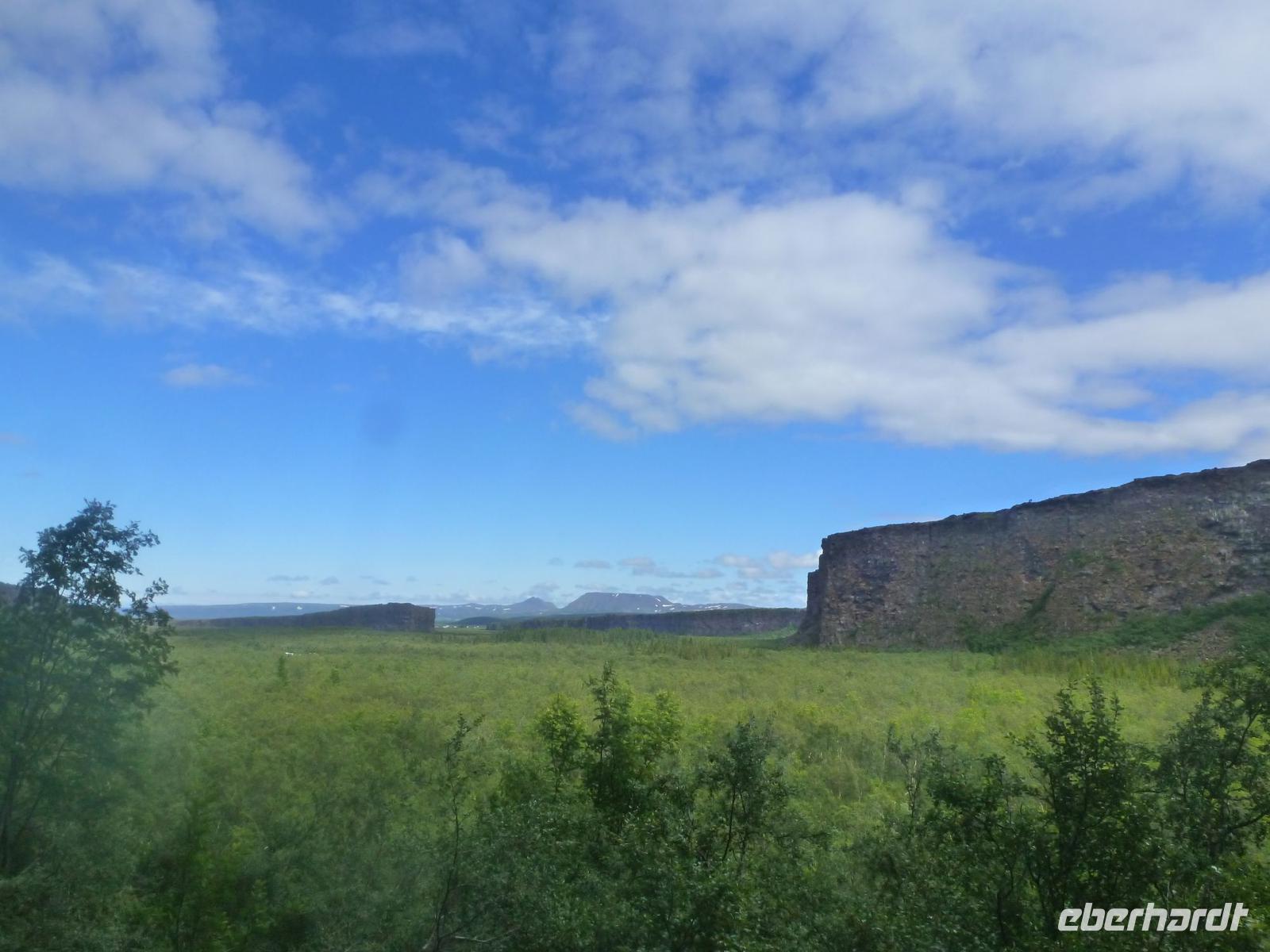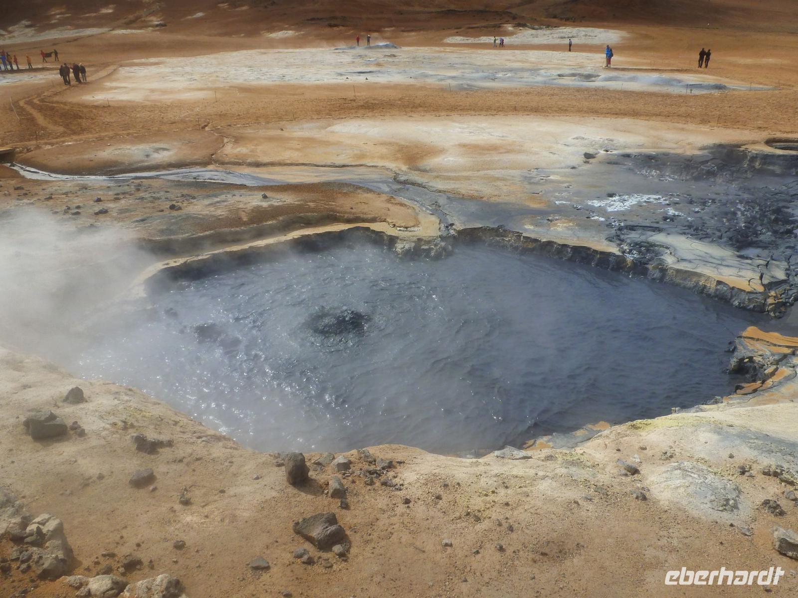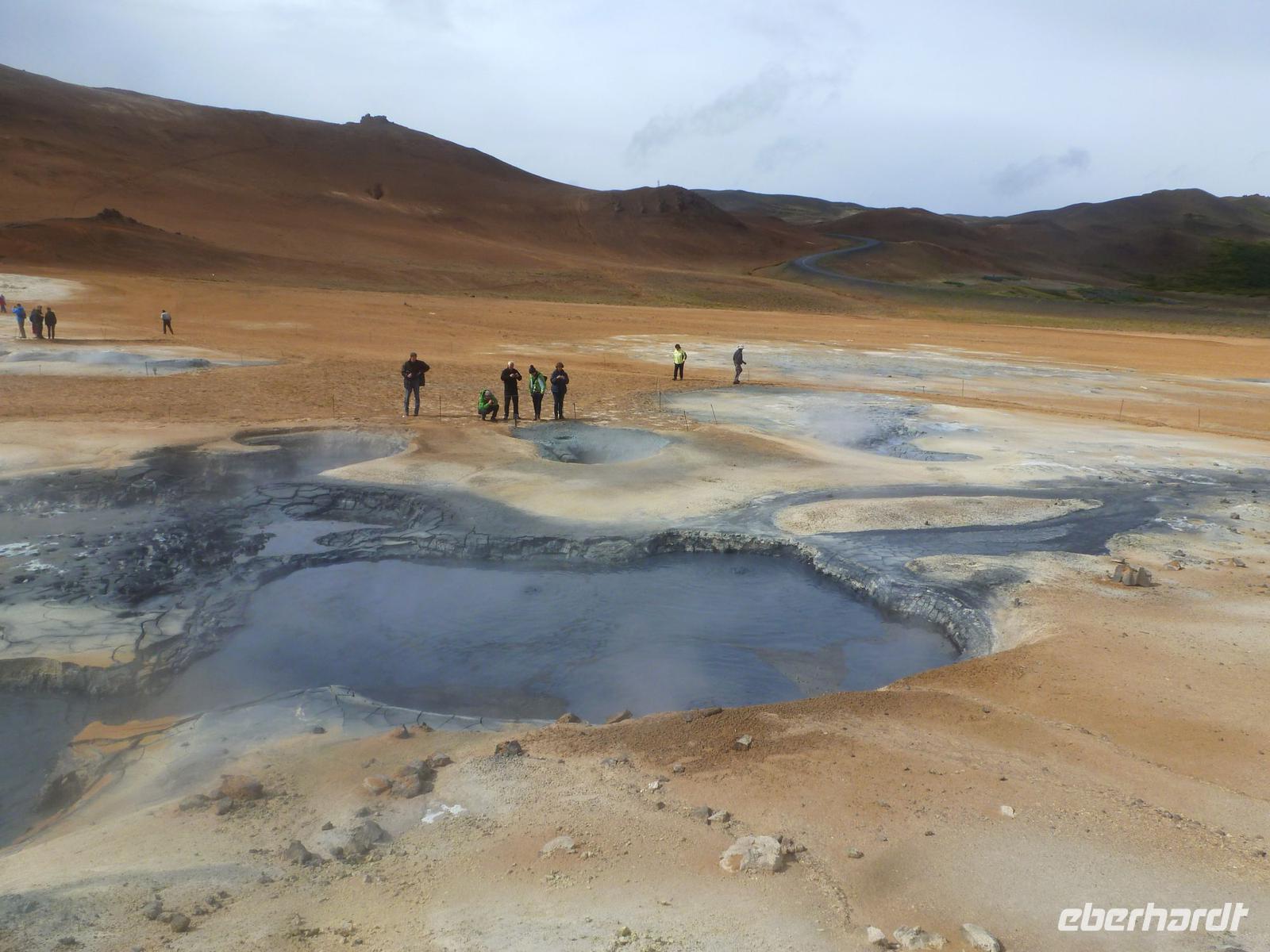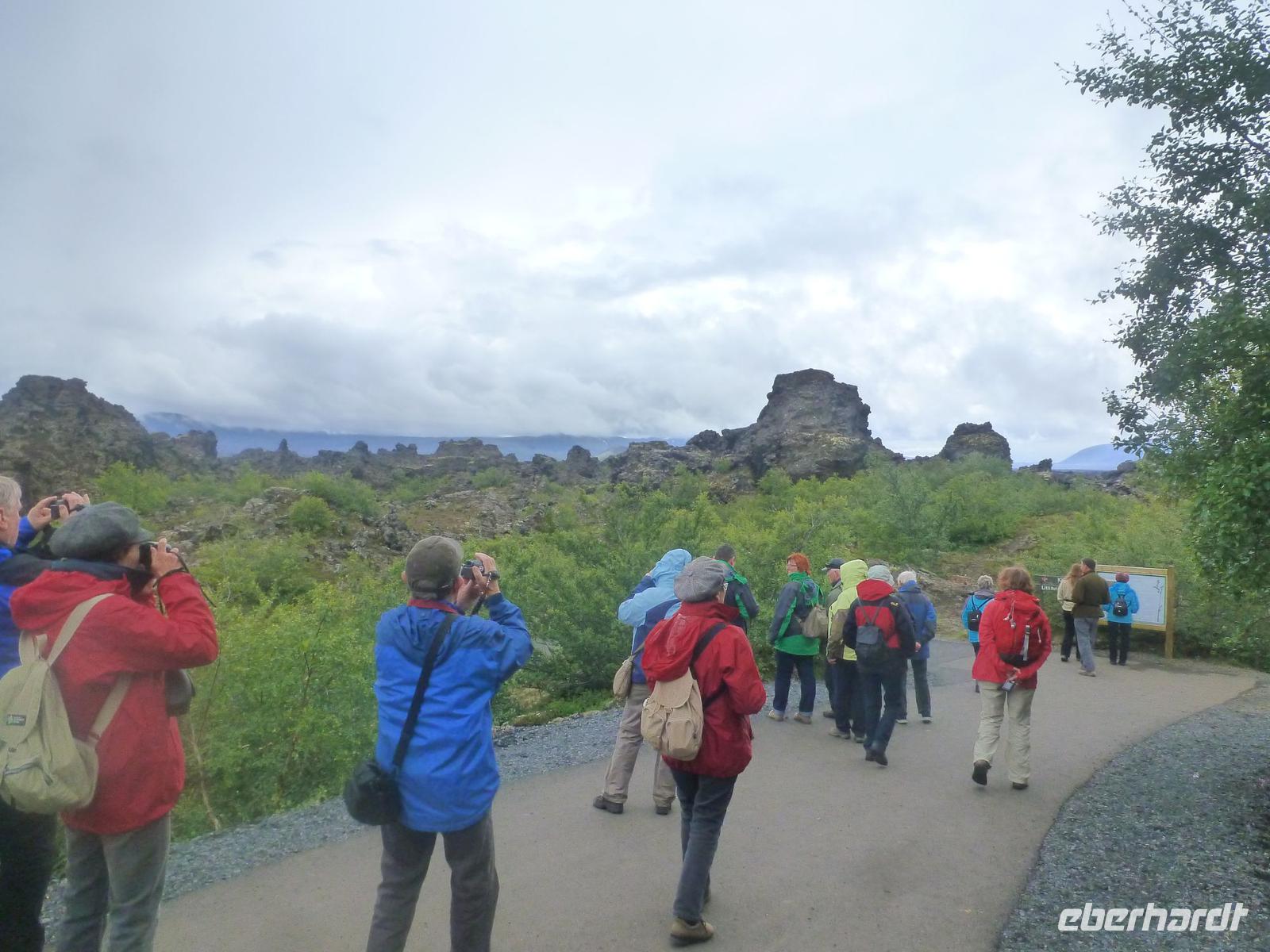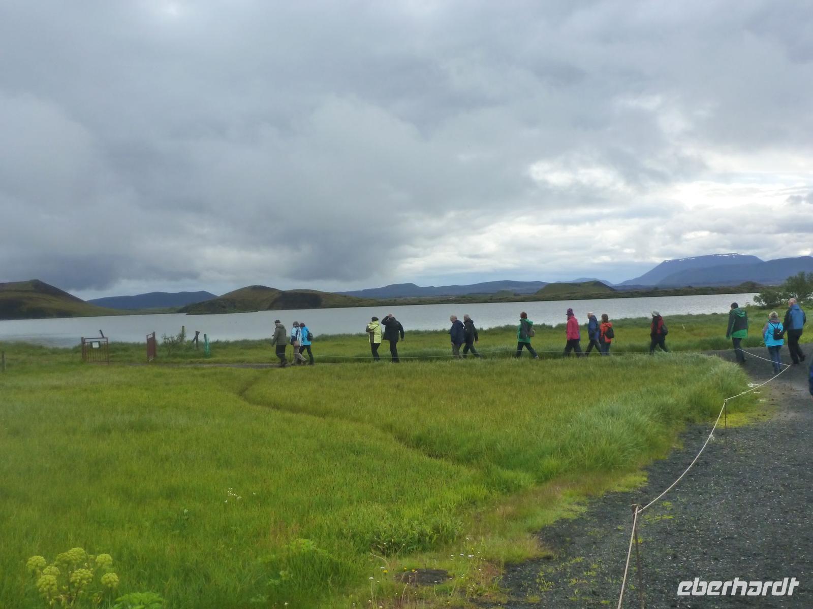 Im hohen Norden fanden wir ein ähnliches Phänomen wie den goldenen Kreis. Auf einer Ringstrecke rund um den Myvatn-See gab es mehrere ungewöhnliche Naturschauspiele zu sehen. Myvatn-See heißt übersetzte Mückensee, aber Mücken belästigten uns an diesem Tag glücklicherweise keine. Doch das Naturparadies Seenlandschaft überzeugte uns mit seiner malerischen Idylle. Im Lavalabyrinth Dimmubogir unternahmen wir eine kleine Wanderung, bei der uns die ungewöhnlichsten Formen begegneten. Mit etwas Phantasie konnte man Hexen, Trolle und verschiedene Tiere in den Lavaformationen erkennen. Zur Stärkung gab es im kleinen Cafe ein isländisches Forellenbrot zu genießen. Wer wollte, wagte anschließend den Aufstieg auf den angrenzenden Krater, um den herrlichen Ausblick auf das Seengebiet zu erlangen. Danach war etwas Entspannung notwendig, wofür wir einen Stopp in der Badelagune Jadbördin einlegten. Ähnlich wie in der berühmten Blauen Lagune gönnt man sich hier ein Bad im 38 Grad heißen, schwefelhaltigen Wasser, um Knochen und Kopf zu entspannen. Noch mit leichtem Schwefelgeruch in der Nase begaben wir uns in das Hochtemperaturgebiet Namaskard, wo uns blubbernde und nach faulen Eiern riechende Schlammtöpfe erwarteten. Am Abend unternahm ein Teil der Gruppe noch einen Reitausflug auf den Islandpferden. Eine Stunde lang ging es hoch zu Ross durch die herrliche Natur des Eyjafjödur.