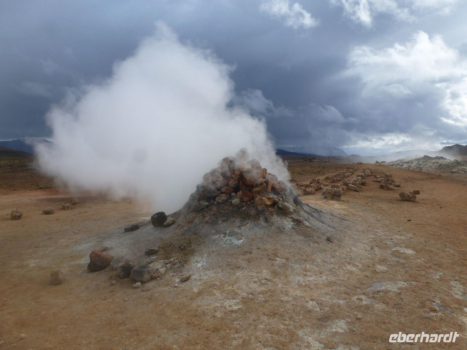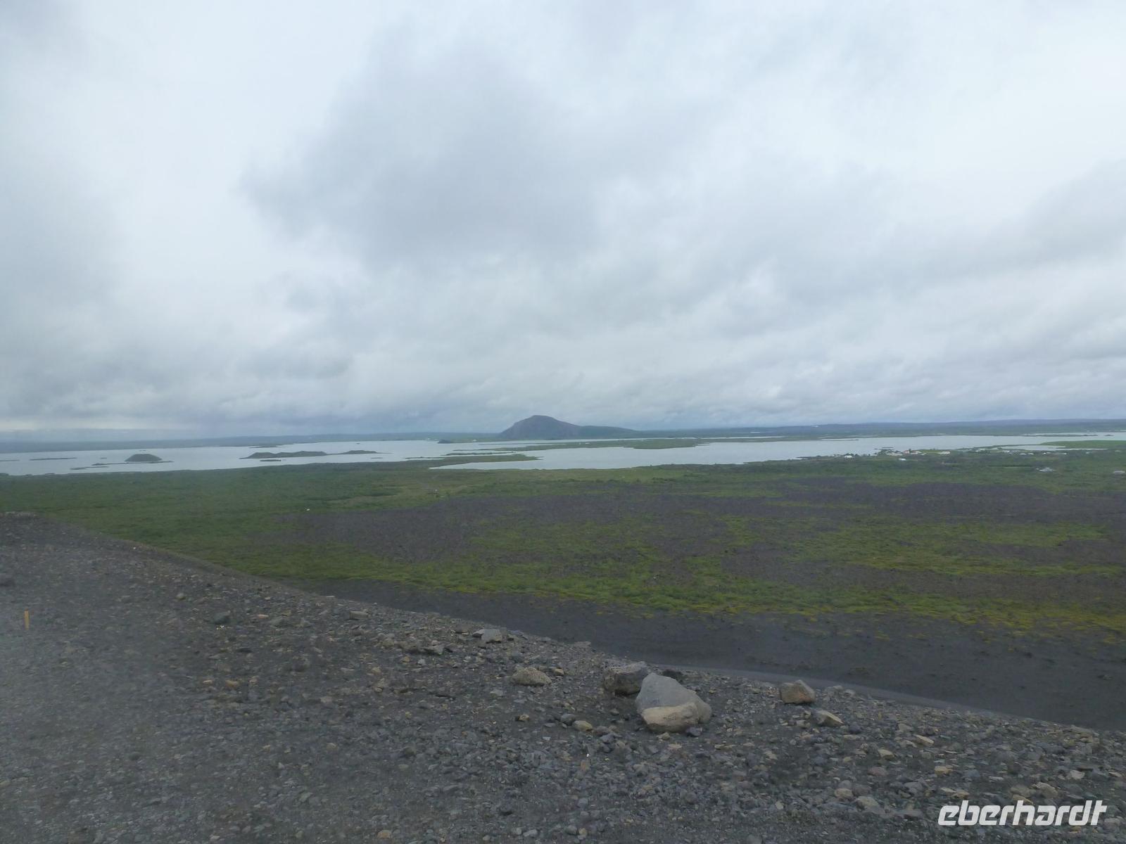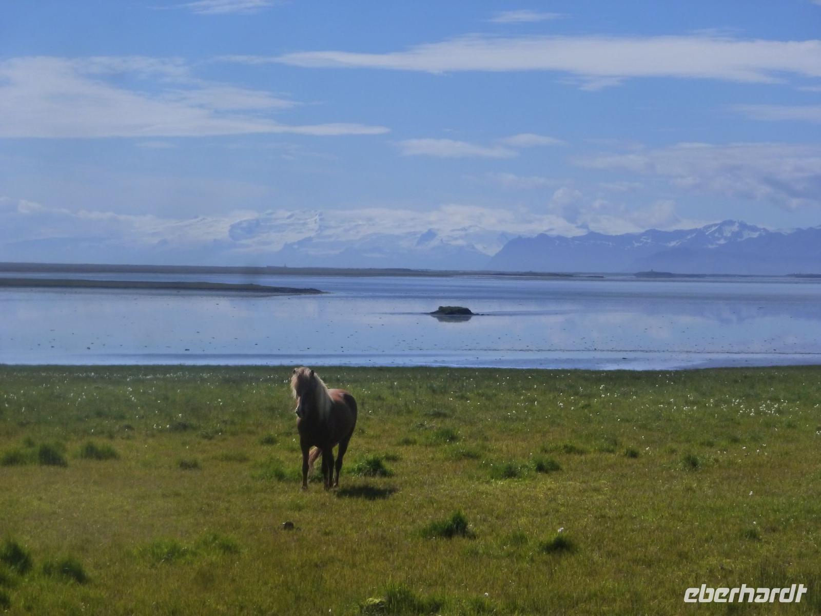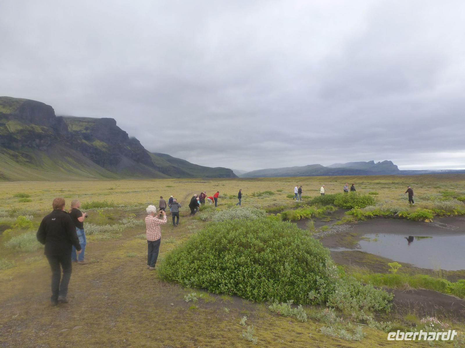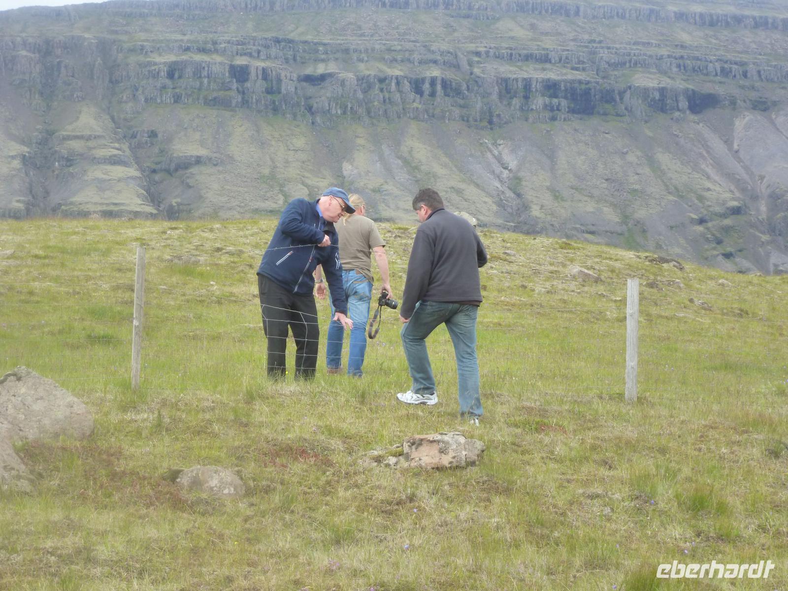 Im hohen Norden fanden wir ein ähnliches Phänomen wie den goldenen Kreis. Auf einer Ringstrecke rund um den Myvatn-See gab es mehrere ungewöhnliche Naturschauspiele zu sehen. Myvatn-See heißt übersetzte Mückensee, aber Mücken belästigten uns an diesem Tag glücklicherweise keine. Doch das Naturparadies Seenlandschaft überzeugte uns mit seiner malerischen Idylle. Im Lavalabyrinth Dimmubogir unternahmen wir eine kleine Wanderung, bei der uns die ungewöhnlichsten Formen begegneten. Mit etwas Phantasie konnte man Hexen, Trolle und verschiedene Tiere in den Lavaformationen erkennen. Zur Stärkung gab es im kleinen Cafe ein isländisches Forellenbrot zu genießen. Wer wollte, wagte anschließend den Aufstieg auf den angrenzenden Krater, um den herrlichen Ausblick auf das Seengebiet zu erlangen. Danach war etwas Entspannung notwendig, wofür wir einen Stopp in der Badelagune Jadbördin einlegten. Ähnlich wie in der berühmten Blauen Lagune gönnt man sich hier ein Bad im 38 Grad heißen, schwefelhaltigen Wasser, um Knochen und Kopf zu entspannen. Noch mit leichtem Schwefelgeruch in der Nase begaben wir uns in das Hochtemperaturgebiet Namaskard, wo uns blubbernde und nach faulen Eiern riechende Schlammtöpfe erwarteten. Am Abend unternahm ein Teil der Gruppe noch einen Reitausflug auf den Islandpferden. Eine Stunde lang ging es hoch zu Ross durch die herrliche Natur des Eyjafjödur.