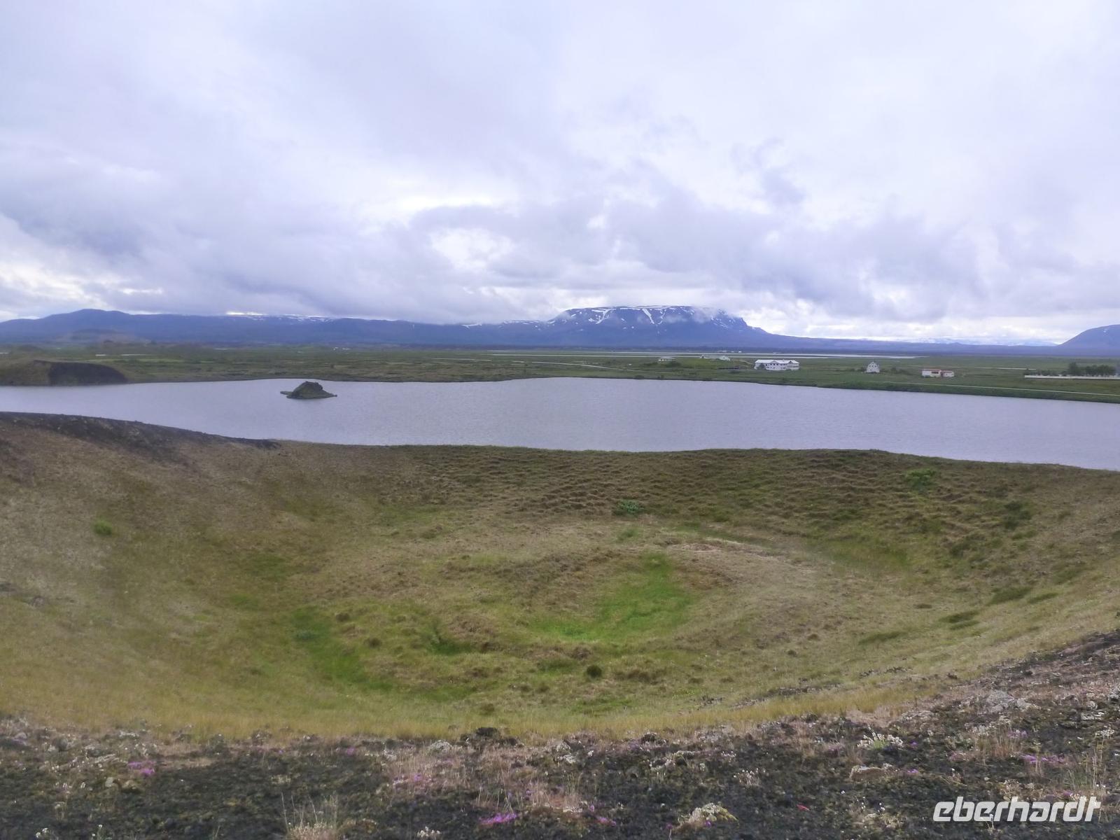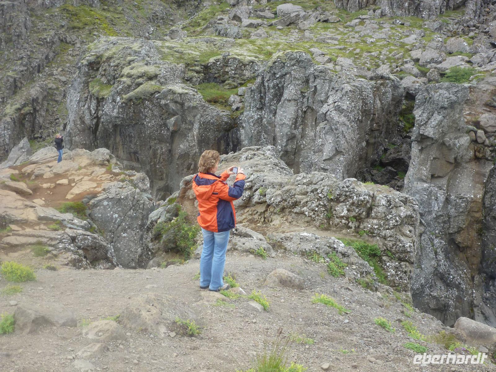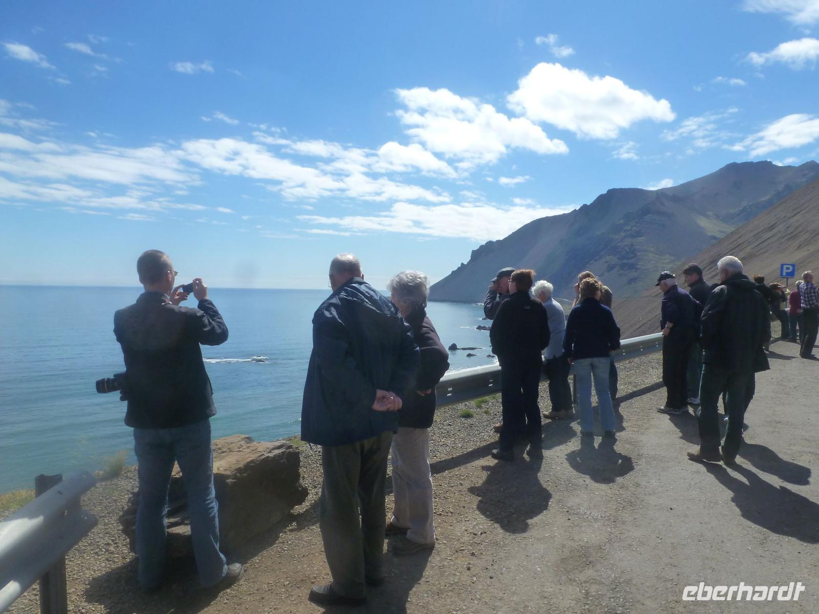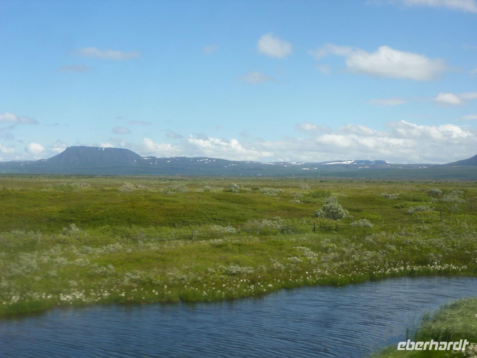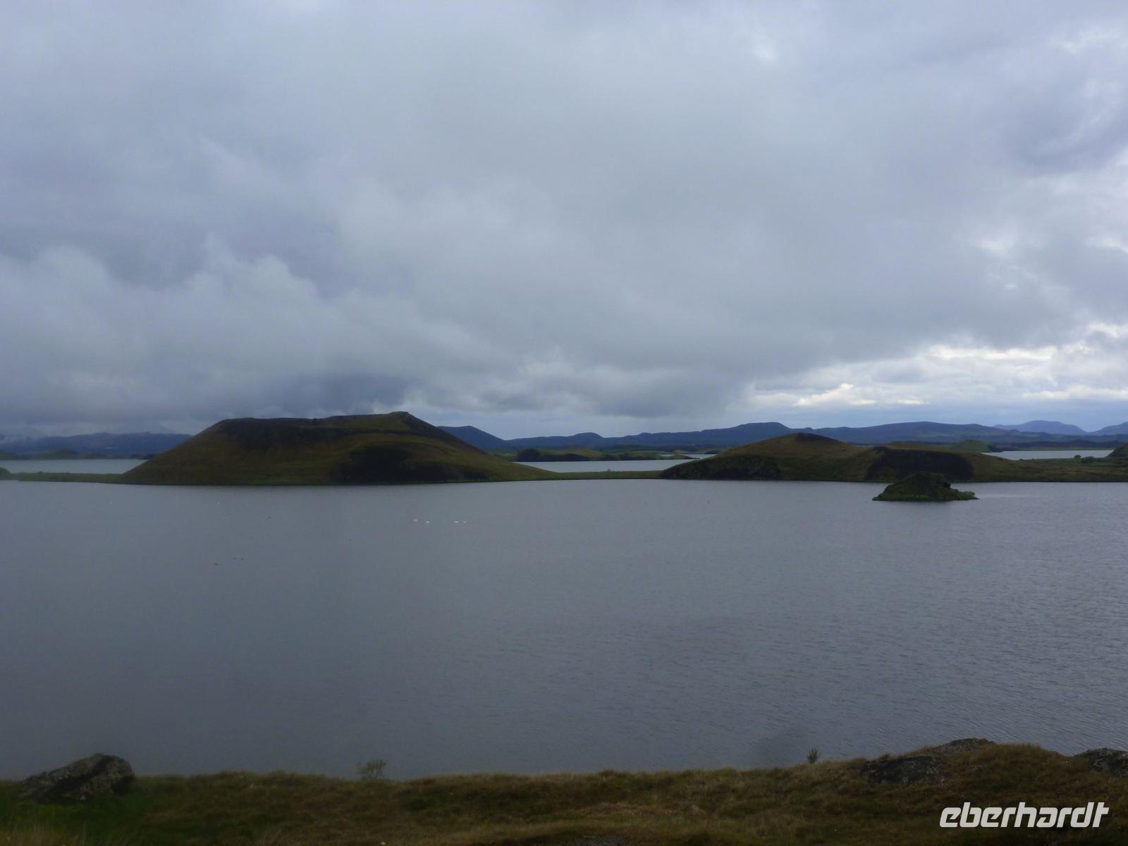 Im hohen Norden fanden wir ein ähnliches Phänomen wie den goldenen Kreis. Auf einer Ringstrecke rund um den Myvatn-See gab es mehrere ungewöhnliche Naturschauspiele zu sehen. Myvatn-See heißt übersetzte Mückensee, aber Mücken belästigten uns an diesem Tag glücklicherweise keine. Doch das Naturparadies Seenlandschaft überzeugte uns mit seiner malerischen Idylle. Im Lavalabyrinth Dimmubogir unternahmen wir eine kleine Wanderung, bei der uns die ungewöhnlichsten Formen begegneten. Mit etwas Phantasie konnte man Hexen, Trolle und verschiedene Tiere in den Lavaformationen erkennen. Zur Stärkung gab es im kleinen Cafe ein isländisches Forellenbrot zu genießen. Wer wollte, wagte anschließend den Aufstieg auf den angrenzenden Krater, um den herrlichen Ausblick auf das Seengebiet zu erlangen. Danach war etwas Entspannung notwendig, wofür wir einen Stopp in der Badelagune Jadbördin einlegten. Ähnlich wie in der berühmten Blauen Lagune gönnt man sich hier ein Bad im 38 Grad heißen, schwefelhaltigen Wasser, um Knochen und Kopf zu entspannen. Noch mit leichtem Schwefelgeruch in der Nase begaben wir uns in das Hochtemperaturgebiet Namaskard, wo uns blubbernde und nach faulen Eiern riechende Schlammtöpfe erwarteten. Am Abend unternahm ein Teil der Gruppe noch einen Reitausflug auf den Islandpferden. Eine Stunde lang ging es hoch zu Ross durch die herrliche Natur des Eyjafjödur.