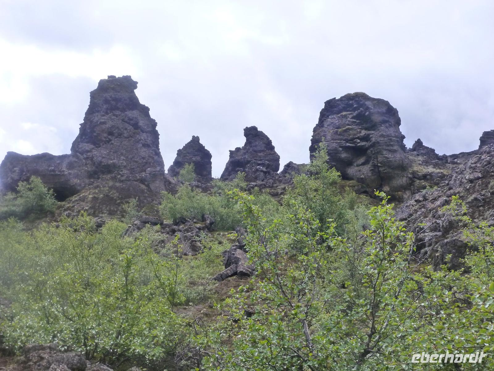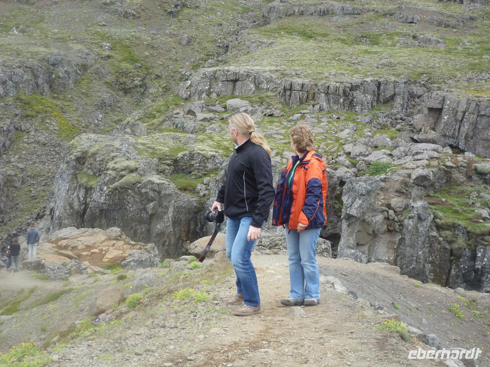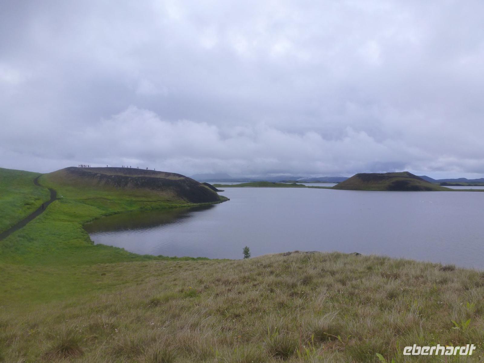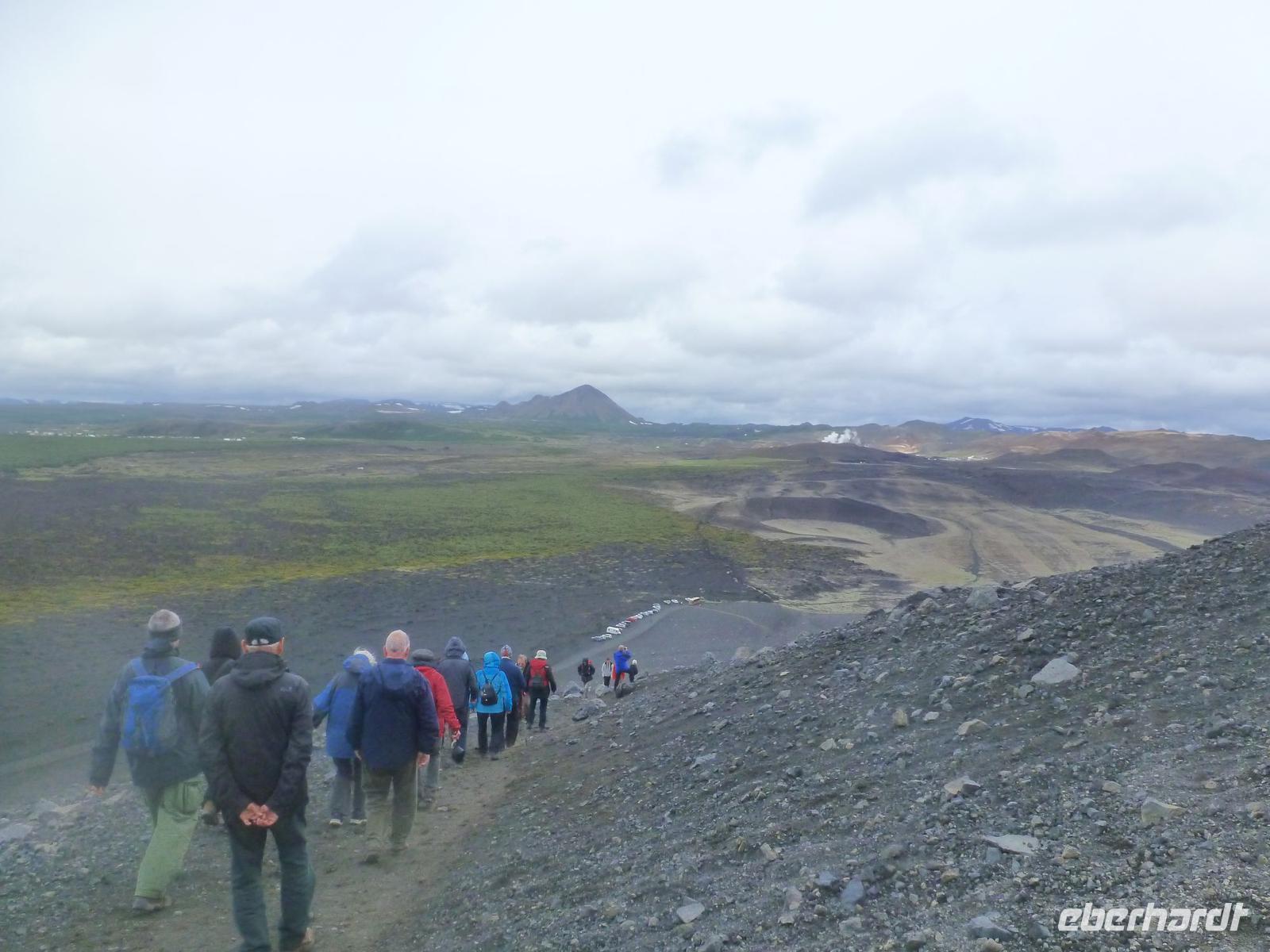 Im hohen Norden fanden wir ein ähnliches Phänomen wie den goldenen Kreis. Auf einer Ringstrecke rund um den Myvatn-See gab es mehrere ungewöhnliche Naturschauspiele zu sehen. Myvatn-See heißt übersetzte Mückensee, aber Mücken belästigten uns an diesem Tag glücklicherweise keine. Doch das Naturparadies Seenlandschaft überzeugte uns mit seiner malerischen Idylle. Im Lavalabyrinth Dimmubogir unternahmen wir eine kleine Wanderung, bei der uns die ungewöhnlichsten Formen begegneten. Mit etwas Phantasie konnte man Hexen, Trolle und verschiedene Tiere in den Lavaformationen erkennen. Zur Stärkung gab es im kleinen Cafe ein isländisches Forellenbrot zu genießen. Wer wollte, wagte anschließend den Aufstieg auf den angrenzenden Krater, um den herrlichen Ausblick auf das Seengebiet zu erlangen. Danach war etwas Entspannung notwendig, wofür wir einen Stopp in der Badelagune Jadbördin einlegten. Ähnlich wie in der berühmten Blauen Lagune gönnt man sich hier ein Bad im 38 Grad heißen, schwefelhaltigen Wasser, um Knochen und Kopf zu entspannen. Noch mit leichtem Schwefelgeruch in der Nase begaben wir uns in das Hochtemperaturgebiet Namaskard, wo uns blubbernde und nach faulen Eiern riechende Schlammtöpfe erwarteten. Am Abend unternahm ein Teil der Gruppe noch einen Reitausflug auf den Islandpferden. Eine Stunde lang ging es hoch zu Ross durch die herrliche Natur des Eyjafjödur.