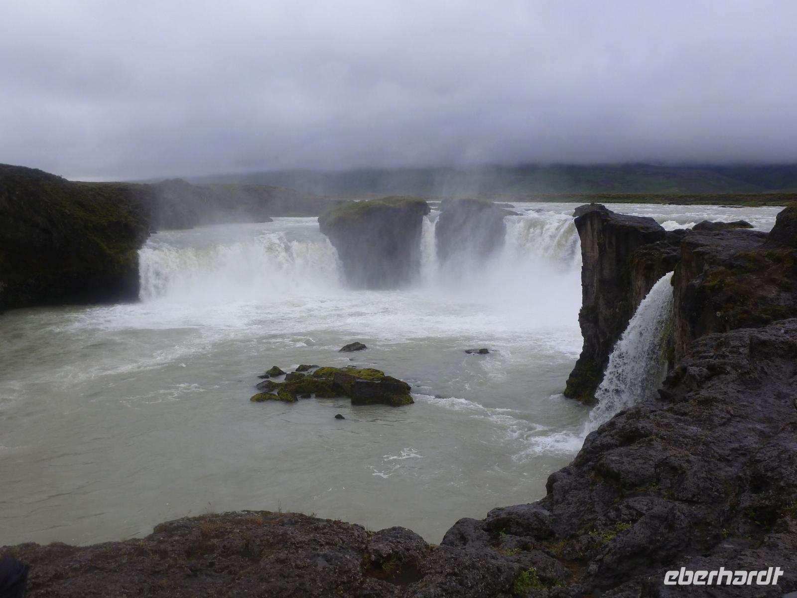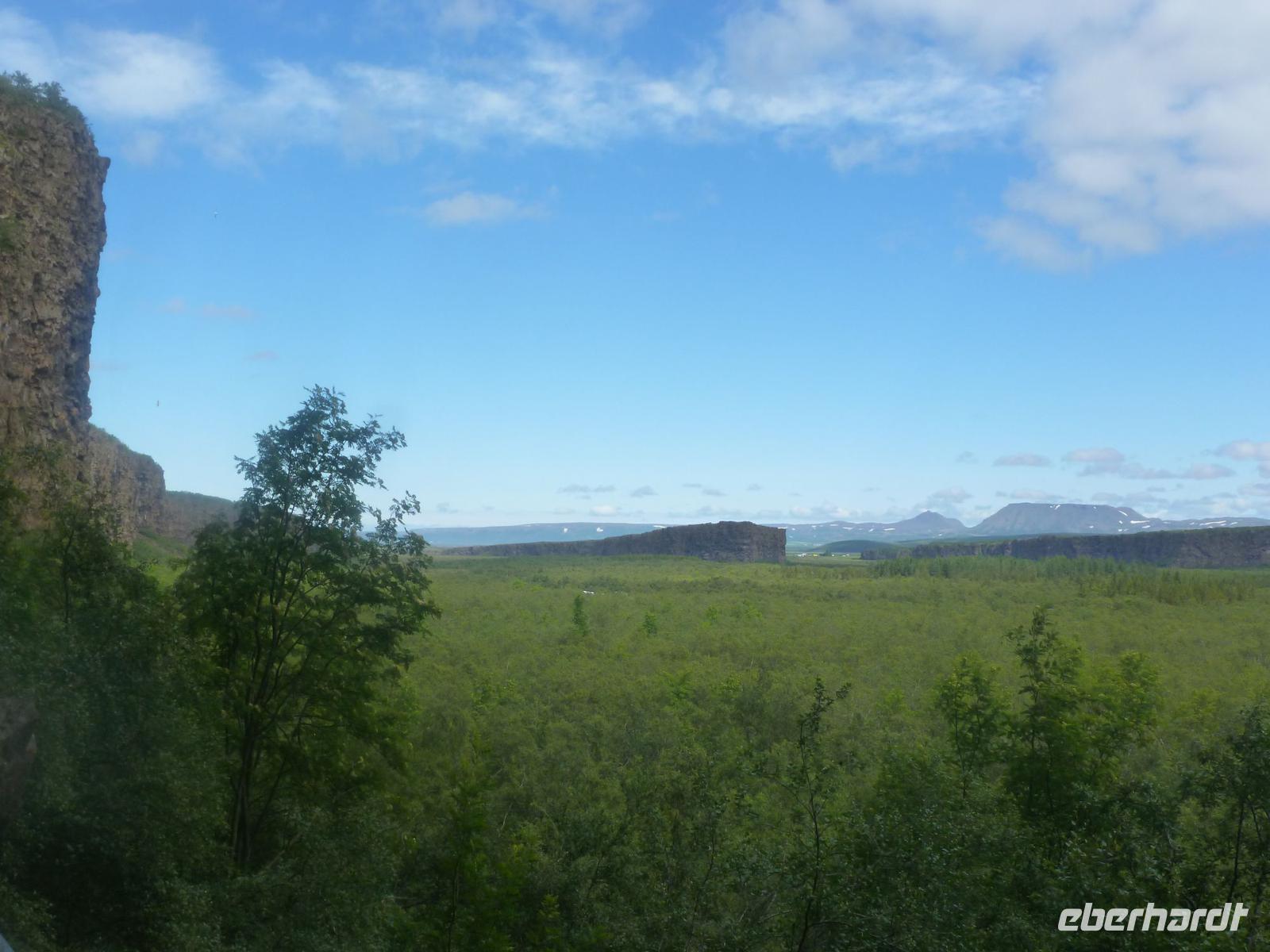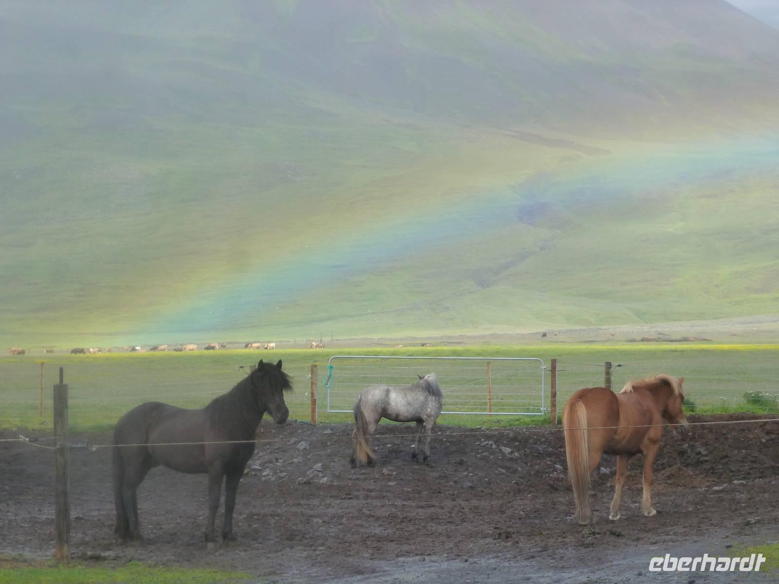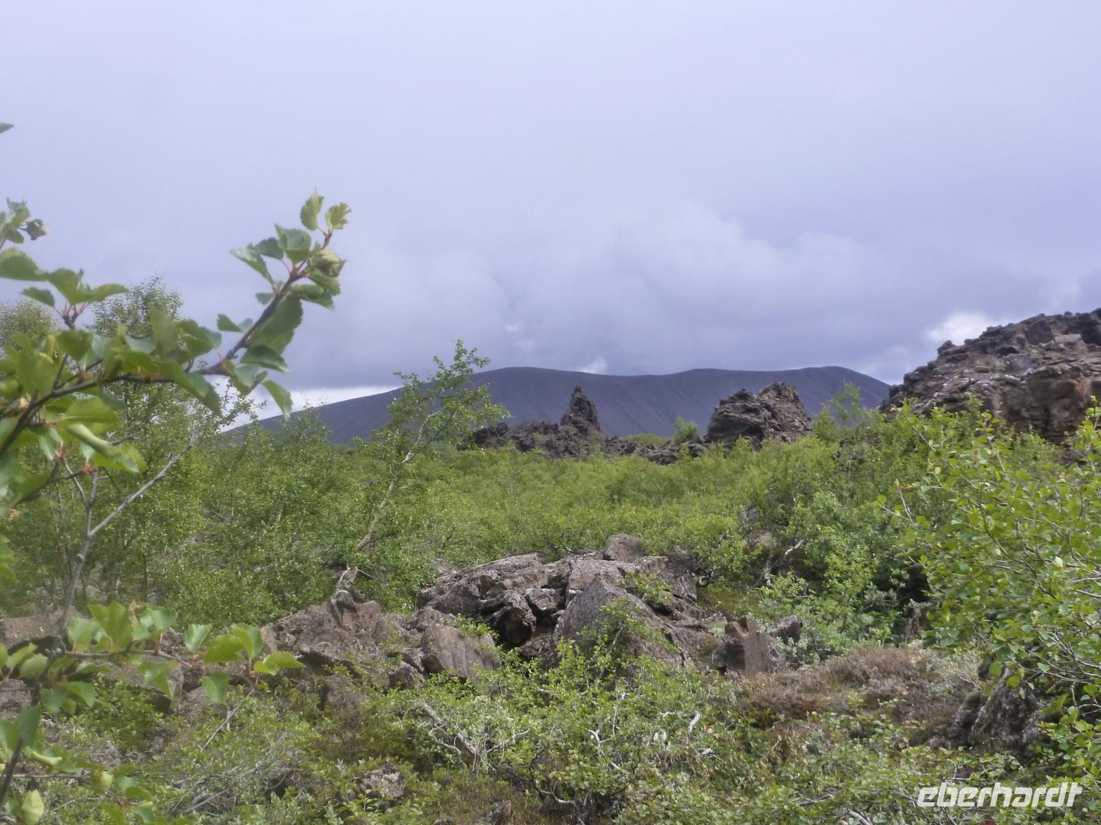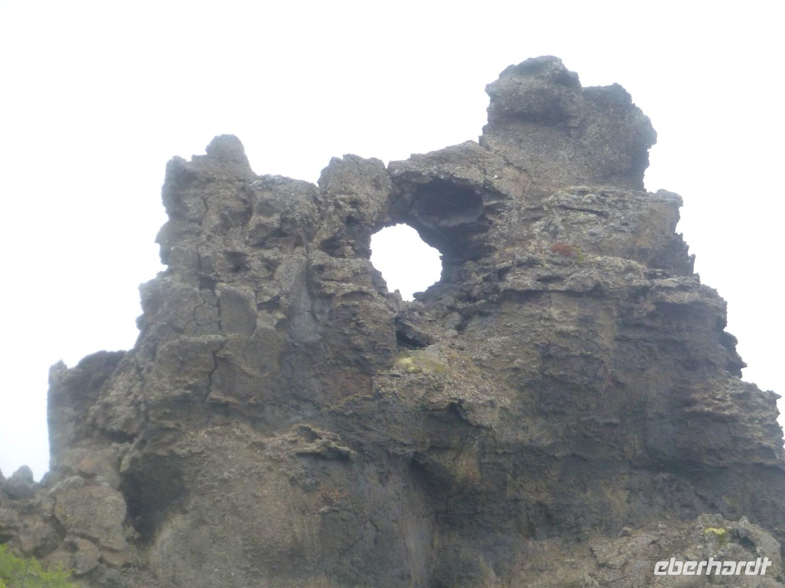 Im hohen Norden fanden wir ein ähnliches Phänomen wie den goldenen Kreis. Auf einer Ringstrecke rund um den Myvatn-See gab es mehrere ungewöhnliche Naturschauspiele zu sehen. Myvatn-See heißt übersetzte Mückensee, aber Mücken belästigten uns an diesem Tag glücklicherweise keine. Doch das Naturparadies Seenlandschaft überzeugte uns mit seiner malerischen Idylle. Im Lavalabyrinth Dimmubogir unternahmen wir eine kleine Wanderung, bei der uns die ungewöhnlichsten Formen begegneten. Mit etwas Phantasie konnte man Hexen, Trolle und verschiedene Tiere in den Lavaformationen erkennen. Zur Stärkung gab es im kleinen Cafe ein isländisches Forellenbrot zu genießen. Wer wollte, wagte anschließend den Aufstieg auf den angrenzenden Krater, um den herrlichen Ausblick auf das Seengebiet zu erlangen. Danach war etwas Entspannung notwendig, wofür wir einen Stopp in der Badelagune Jadbördin einlegten. Ähnlich wie in der berühmten Blauen Lagune gönnt man sich hier ein Bad im 38 Grad heißen, schwefelhaltigen Wasser, um Knochen und Kopf zu entspannen. Noch mit leichtem Schwefelgeruch in der Nase begaben wir uns in das Hochtemperaturgebiet Namaskard, wo uns blubbernde und nach faulen Eiern riechende Schlammtöpfe erwarteten. Am Abend unternahm ein Teil der Gruppe noch einen Reitausflug auf den Islandpferden. Eine Stunde lang ging es hoch zu Ross durch die herrliche Natur des Eyjafjödur.