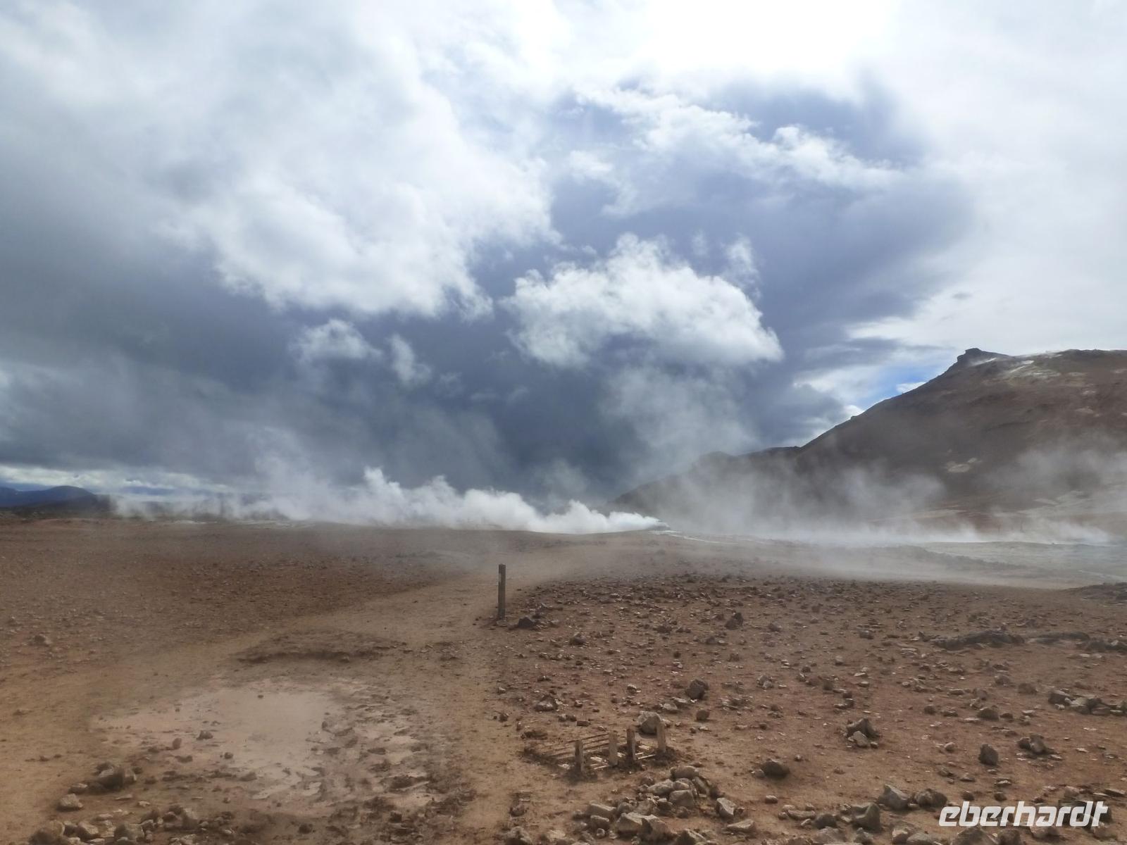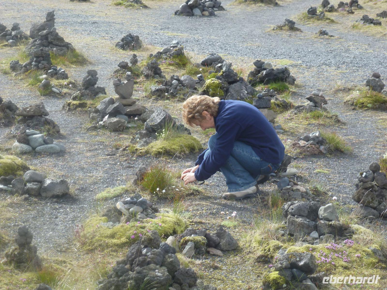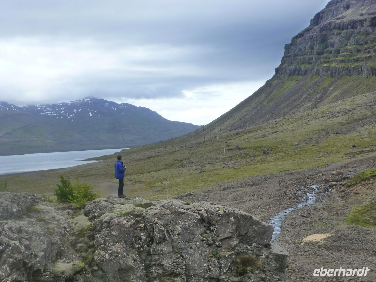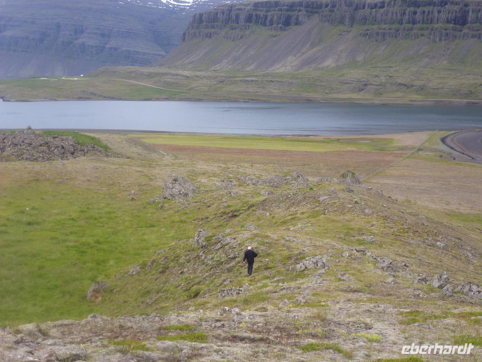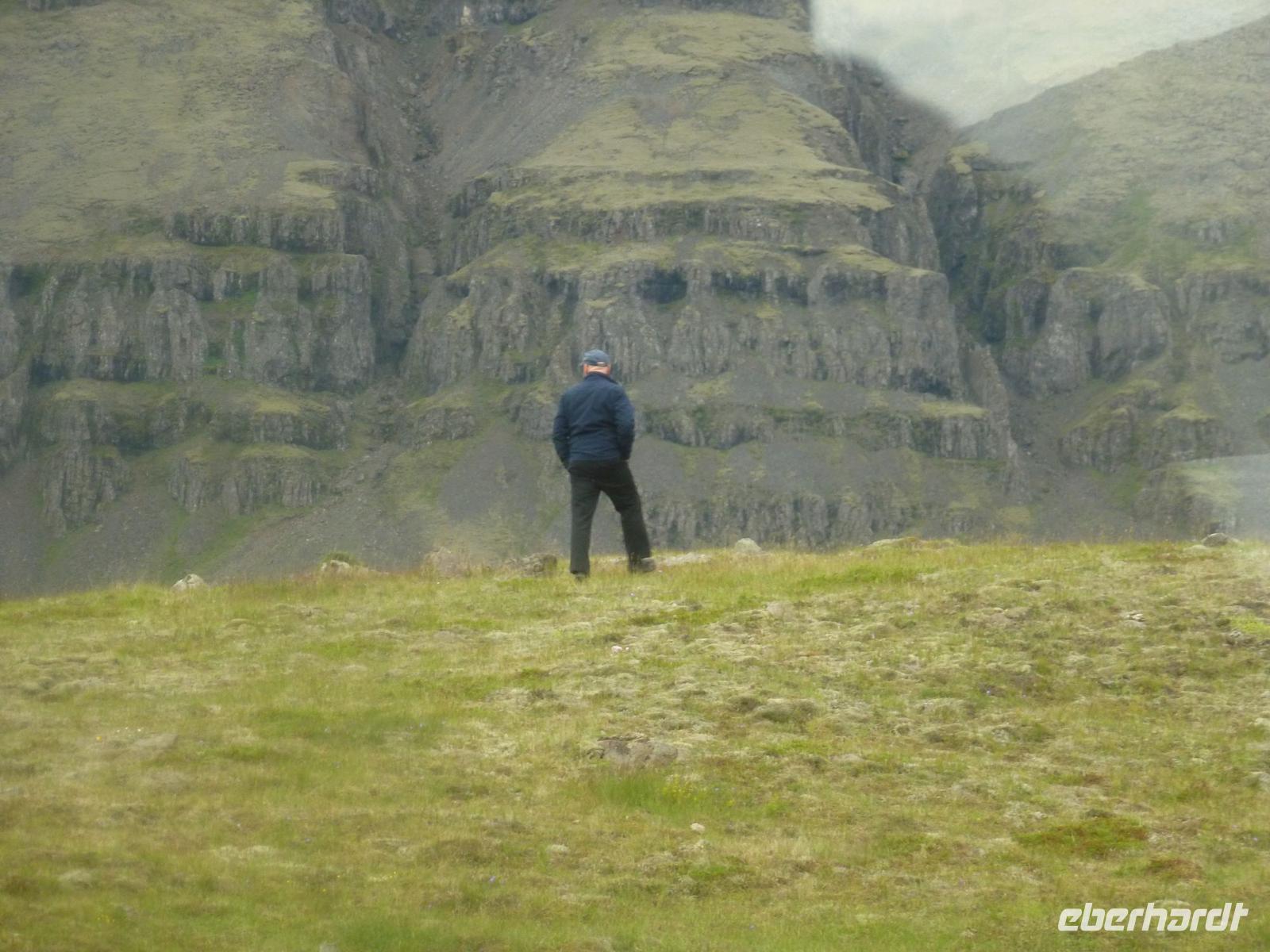 Im hohen Norden fanden wir ein ähnliches Phänomen wie den goldenen Kreis. Auf einer Ringstrecke rund um den Myvatn-See gab es mehrere ungewöhnliche Naturschauspiele zu sehen. Myvatn-See heißt übersetzte Mückensee, aber Mücken belästigten uns an diesem Tag glücklicherweise keine. Doch das Naturparadies Seenlandschaft überzeugte uns mit seiner malerischen Idylle. Im Lavalabyrinth Dimmubogir unternahmen wir eine kleine Wanderung, bei der uns die ungewöhnlichsten Formen begegneten. Mit etwas Phantasie konnte man Hexen, Trolle und verschiedene Tiere in den Lavaformationen erkennen. Zur Stärkung gab es im kleinen Cafe ein isländisches Forellenbrot zu genießen. Wer wollte, wagte anschließend den Aufstieg auf den angrenzenden Krater, um den herrlichen Ausblick auf das Seengebiet zu erlangen. Danach war etwas Entspannung notwendig, wofür wir einen Stopp in der Badelagune Jadbördin einlegten. Ähnlich wie in der berühmten Blauen Lagune gönnt man sich hier ein Bad im 38 Grad heißen, schwefelhaltigen Wasser, um Knochen und Kopf zu entspannen. Noch mit leichtem Schwefelgeruch in der Nase begaben wir uns in das Hochtemperaturgebiet Namaskard, wo uns blubbernde und nach faulen Eiern riechende Schlammtöpfe erwarteten. Am Abend unternahm ein Teil der Gruppe noch einen Reitausflug auf den Islandpferden. Eine Stunde lang ging es hoch zu Ross durch die herrliche Natur des Eyjafjödur.