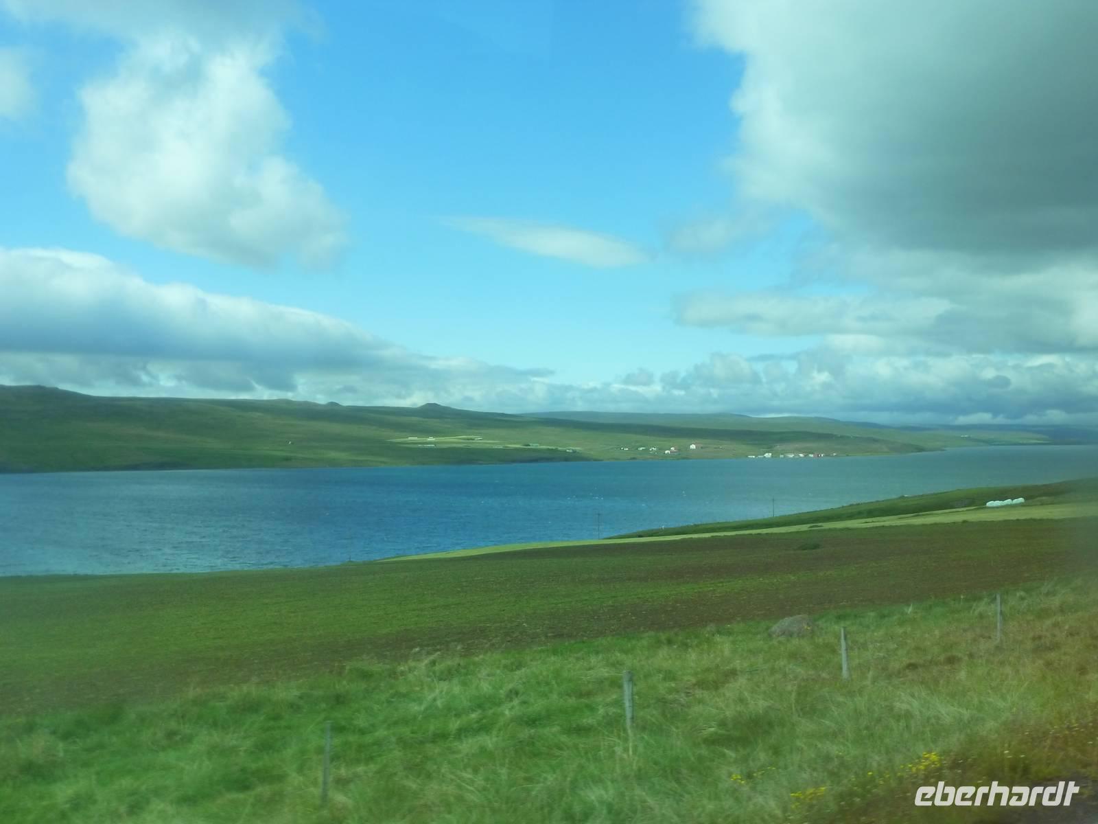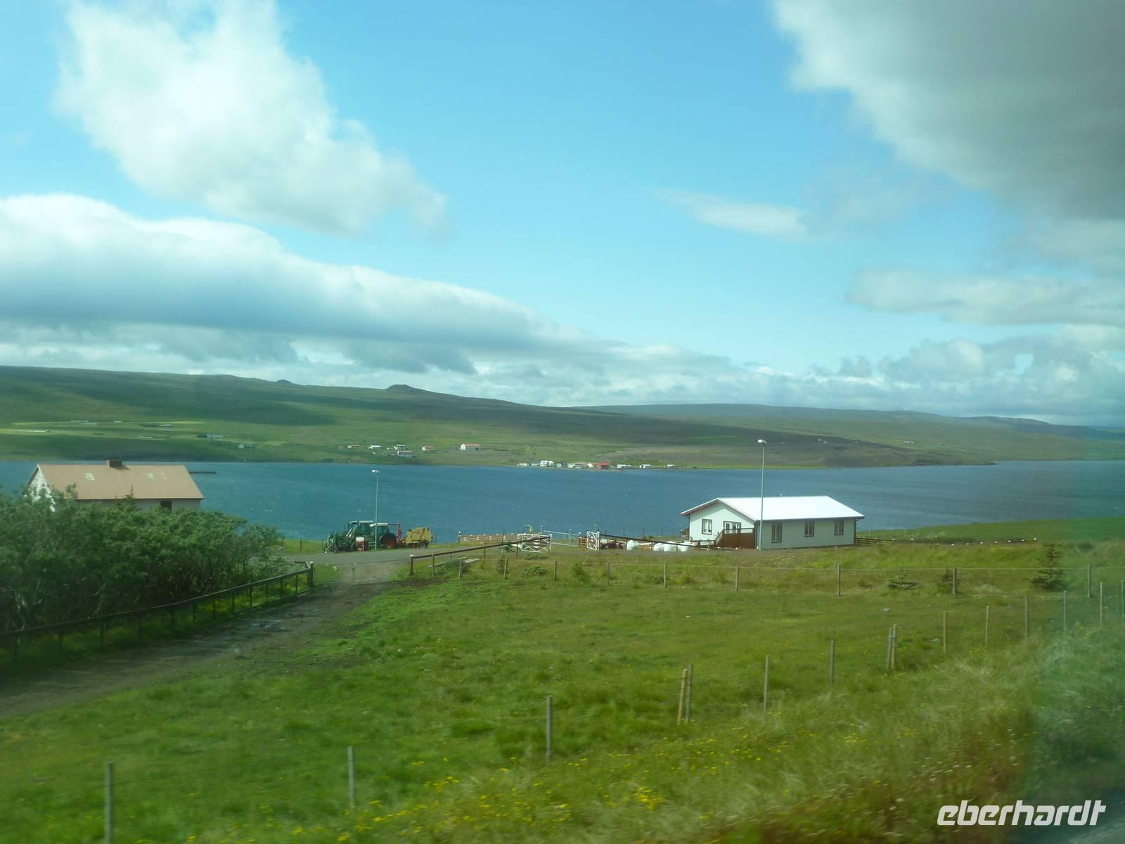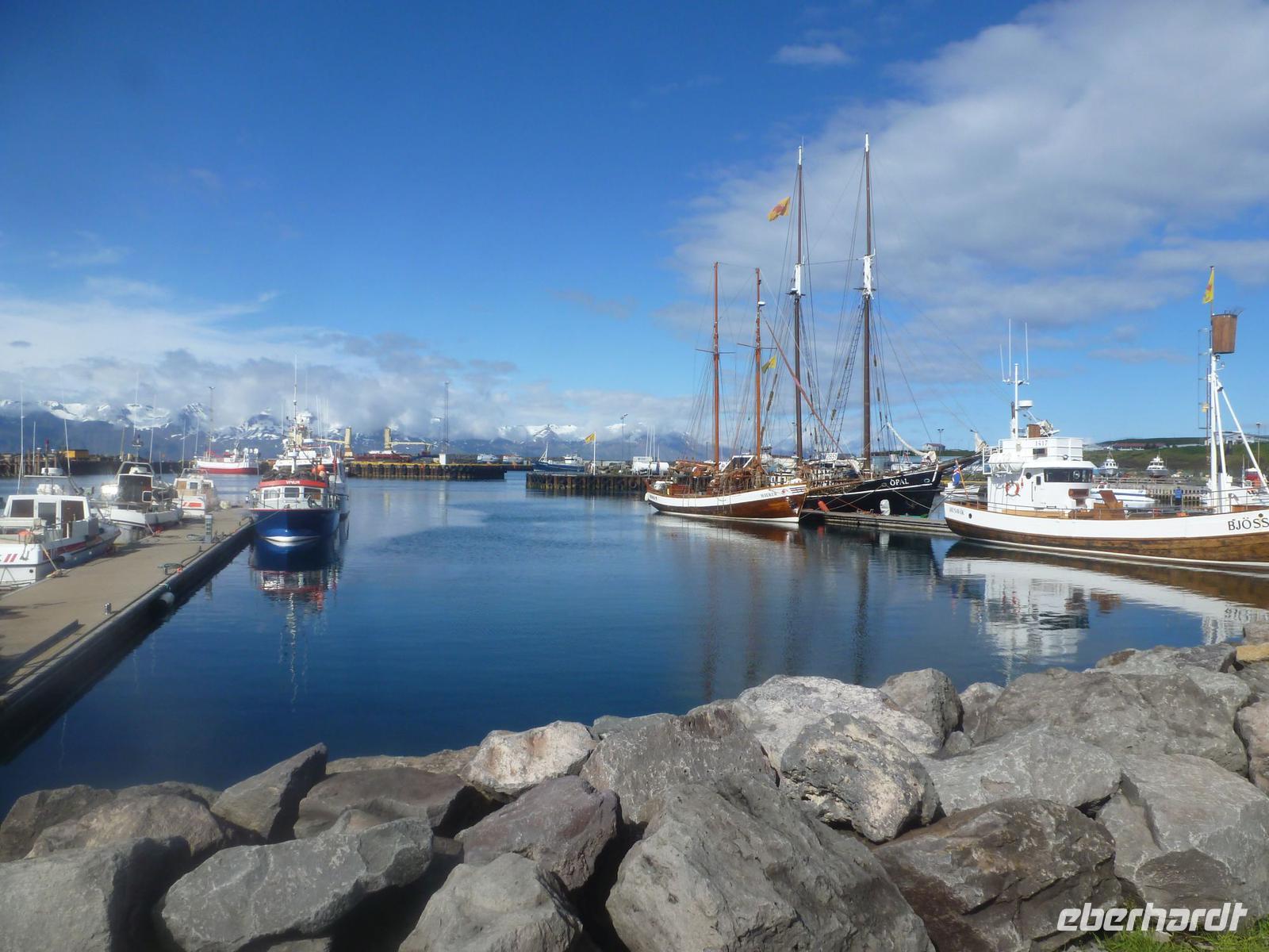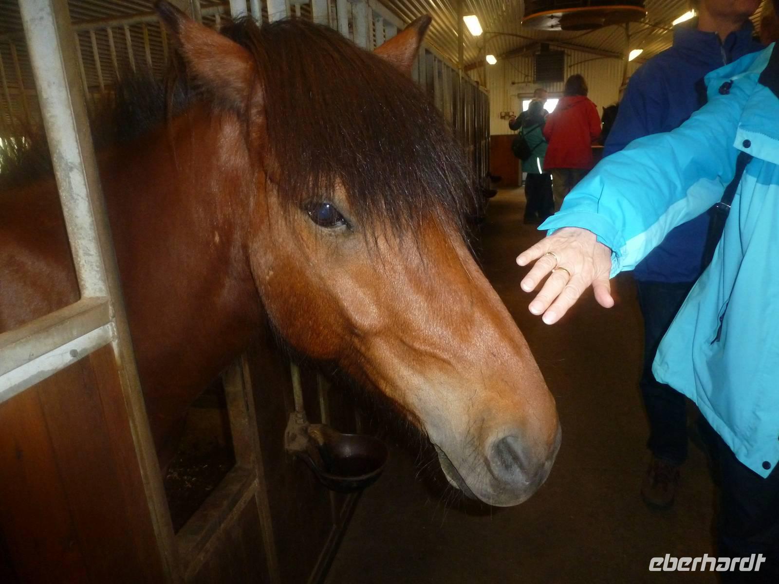 Die Reise führte uns heute weiter von Reykjavik in den Norden nach Akureyri. Doch vorher besichtigten wir noch das neue Konzerthaus der Hauptstadt, Harpa (Harfe) genannt. Wir blieben etwas länger als geplant, denn unser Bus musste noch einmal getauscht werden. Doch dann ging es los durch die herrliche Natur. Unser Reiseleiter Ulrik, ein eingefleischter Isländer, unterhielt uns schon heute mit sagenhaften Geschichten und Märchen. Mitten in einem jahrhunderte alten Lavafeld hielten wir und machten eine kleine Wanderung auf einen erloschenen Krater. Von hoch oben hatten wir einen herrlichen Ausblick auf die Lava und die umliegenden Berge. Am Nachmittag begrüßten uns die Besitzer des Pferdehofes Flugumyri auf Ihrem Anwesen, um über Ihr Leben und das bemerkenswerte Islandpferd zu erzählen. Wir durften die Stallungen anschauen, ein Kaffeetrinken genießen und bei einer Reitvorführung zuschauen. Dabei wurden uns alle 5 Gangarten - Schritt, Trab, Galopp und die für Islandpferde typischen Gangarten Pass und Tölt vorgeführt. Am Abend erreichten wir das lebhafte Städtchen Akureyri, welches malerisch im Eyjafjödur gelegen ist.