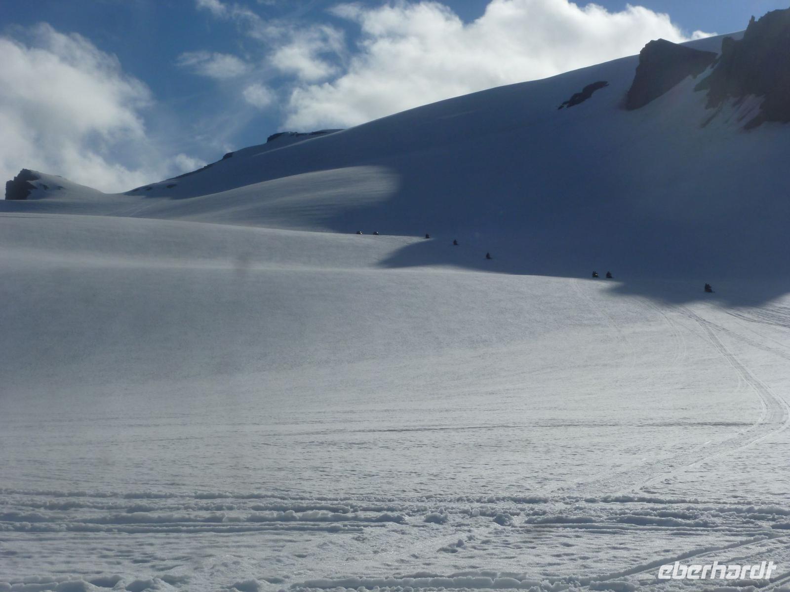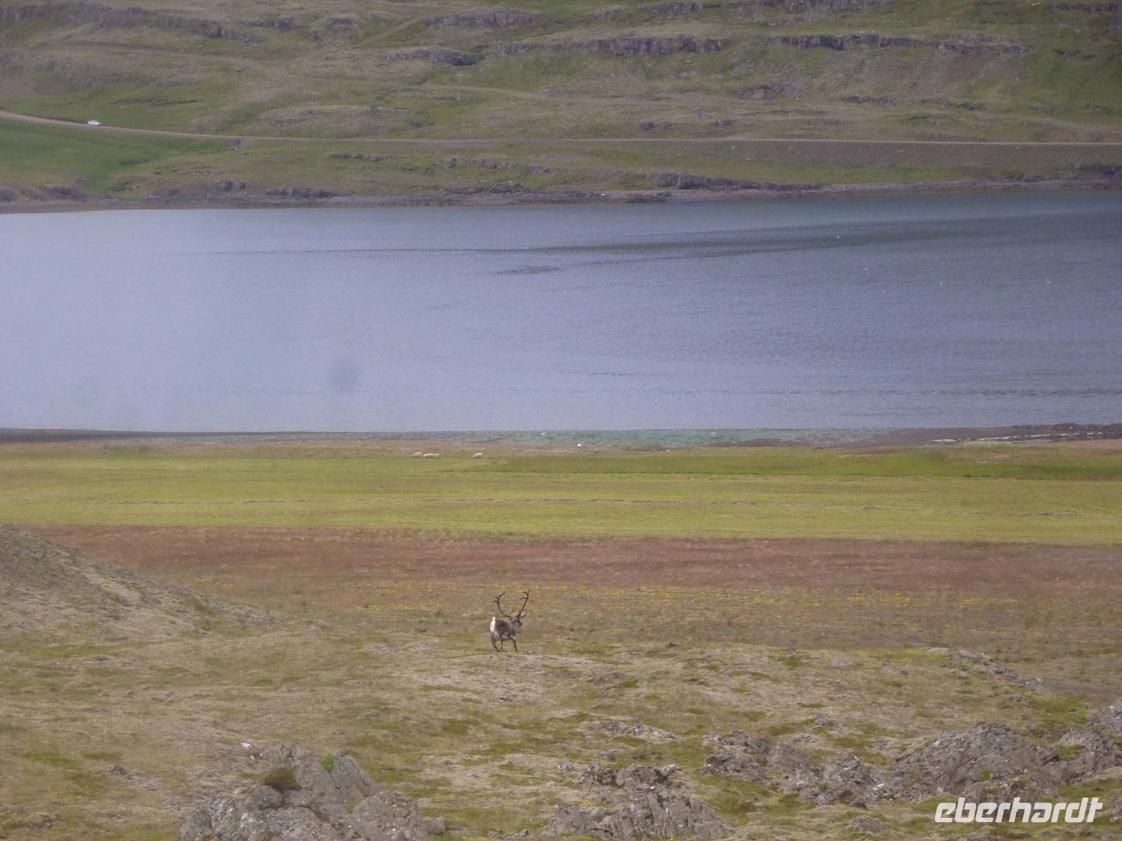 Die Fahrt entlang der Ostfjorde bot wieder ein ganz anderes Naturschauspiel, als das bereits Gesehene. Wir begannen den Tag mit dem Besuch in Petras Steinhaus. Die zwischenzeitlich verstorbene Dame hat ihr Leben dem Sammeln von Dingen, dabei überwiegend Steinen, gewidmet. Nun kann man sich diese umfangreicher Sammlung isländischer Steinformationen in Ihrem Wohnhaus ansehen. Während der Weiterfahrt unterhielt uns Reiseleiter Ulrik wieder mit mystischen Sagen und gruseligen Trollmärchen. Dabei schauten wir gedankenverloren aus dem Fenster und liesen unsere Blicke über die gewaltigen Fjorde streifen. Und plötzlich entdeckten wir auf einer Anhöhe ein prächtiges Rentier mit großem Geweih. Natürlich wurde sofort an geeigneter Stelle gestoppt, um das Tier zu bewundern. Am Nachmittag erreichten wir unser schönes Hotel in Höfn. Einige Gäste hatten sich heute noch für eine Schneemobilfahrt auf den größten Gletscher Europas entschieden. Mit dem Jeep fuhren wir 1 Stunde bis auf den Gletscher, um dann in strahlendem Sonnenschein mit den Motorschlitten über das Eis zu sausen. Ein unvergessliches Erlebnis.