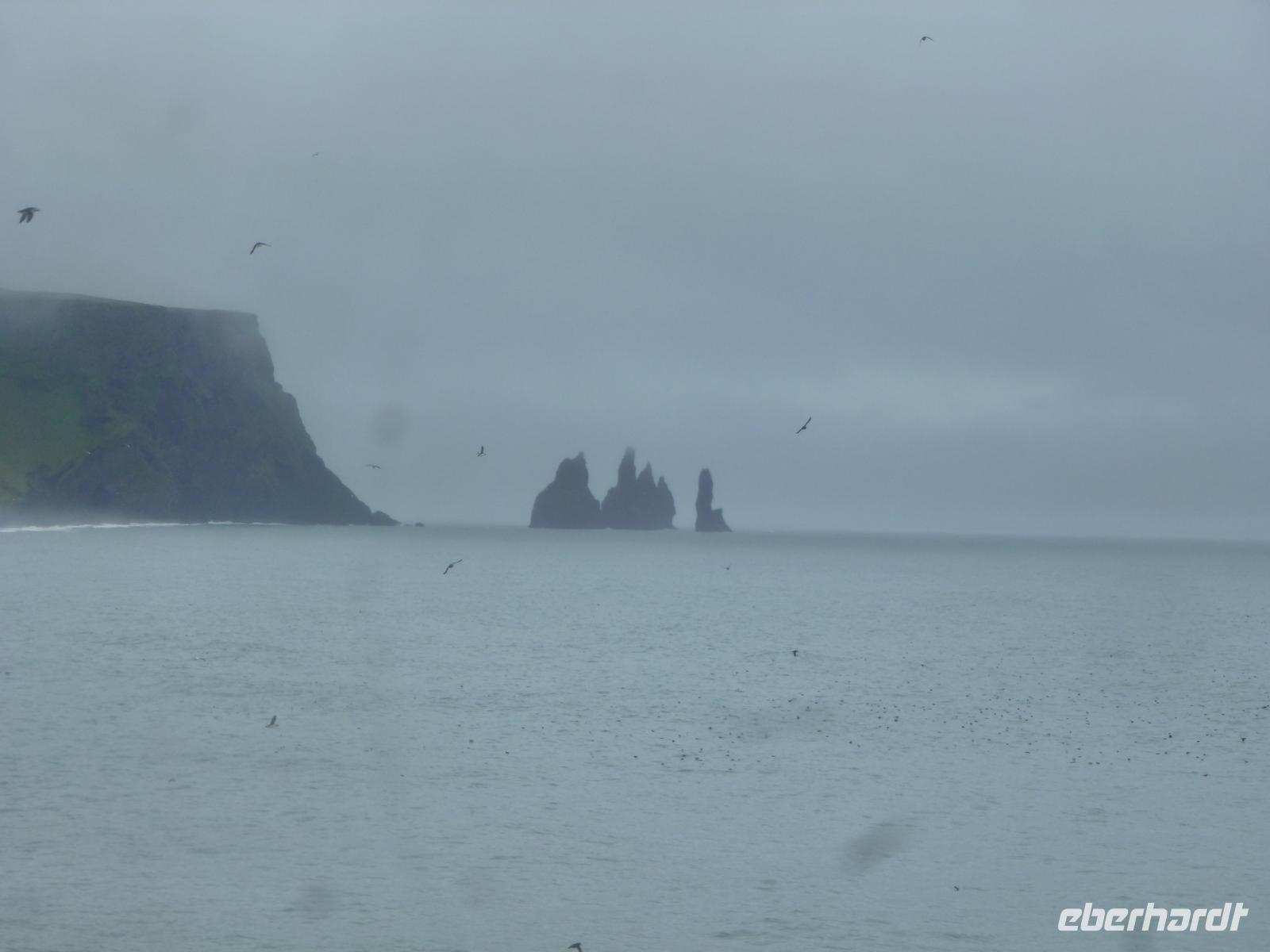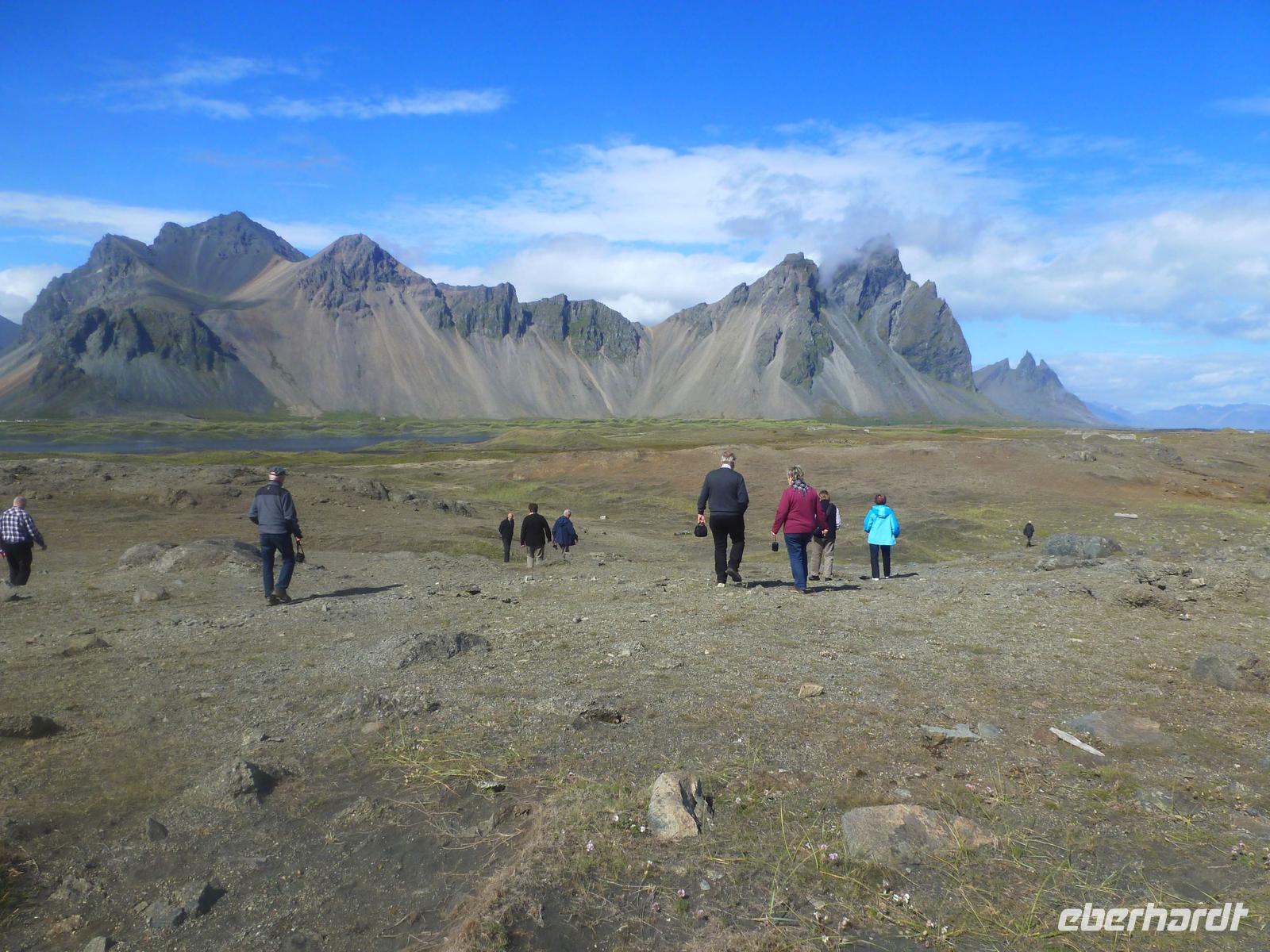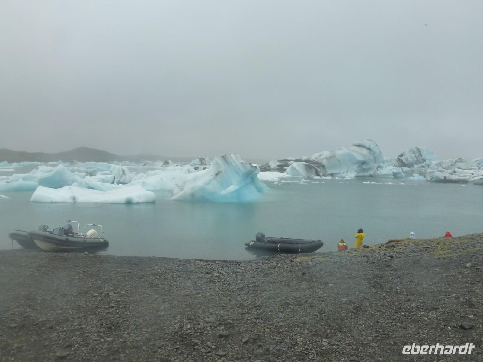 Auf Island muss man täglich mit schwankenden Wetterbedingungen rechnen. Und so hatten wir heute einen regnerischen und kalten Tag erwischt. Den ersten Stopp legten wir in der Gletscherlagune Jökulsárlón ein. Im diesigen Nebel erschienen die mächtigen Eisberge noch mystischer. Mit einem Amphibienfahrzeug ging es raus auf die Lagune. Inzwischen bereitete das Reiseleiterteam einen typischen Brenevin (Schnaps, auch schwarzer Tod genannt) mit uraltem Gletschereis vor. Dazu gab es Trockenfisch zu kosten. Weiter ging es entlang der Südküste. Dabei hatten wir immer den Blick auf gewaltige Gletscherzunge. Bei einer kleinen Wanderung kamen wir ganz nah ran an diese. Im Nationalpark Skaftafell besuchten wir ein Informationszentrum über die Gletscher. Auch eine individuelle Wanderung bis zum Gletscher bot sich hier an. Nach der Fahrt durch das weitläufige Lavafeld des Laki-Ausbruchs gelangten wir zum heutigen Übernachtungsort Vik.