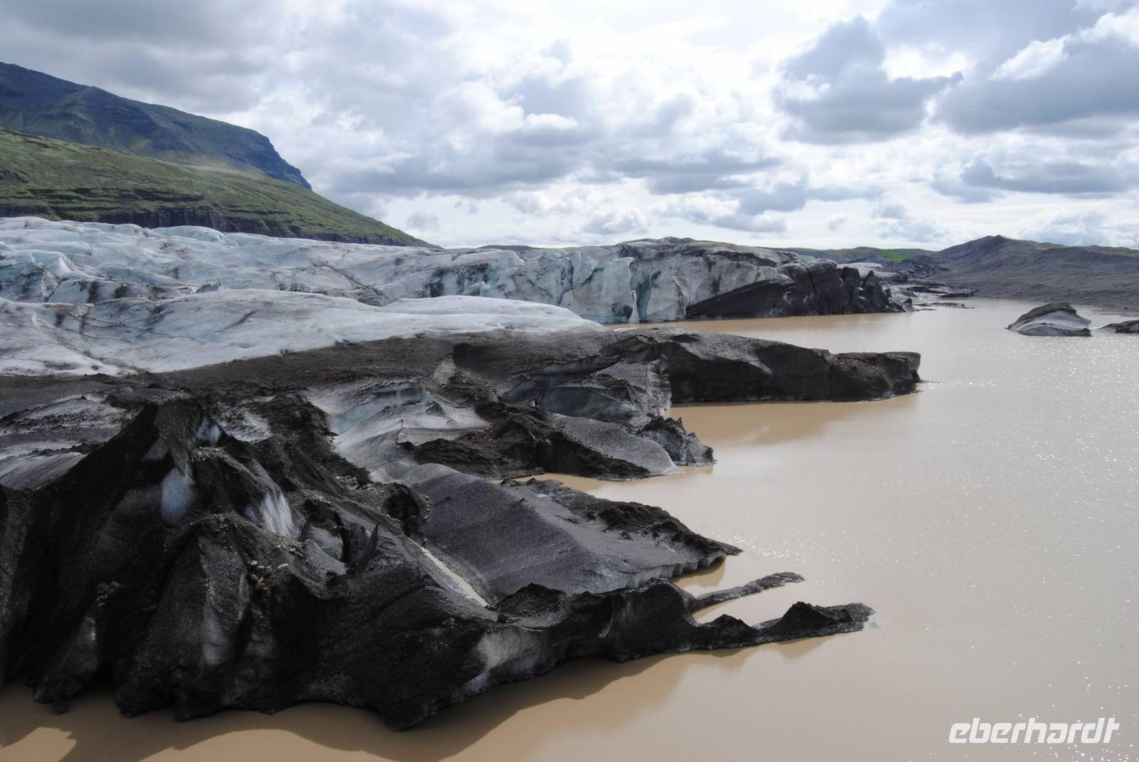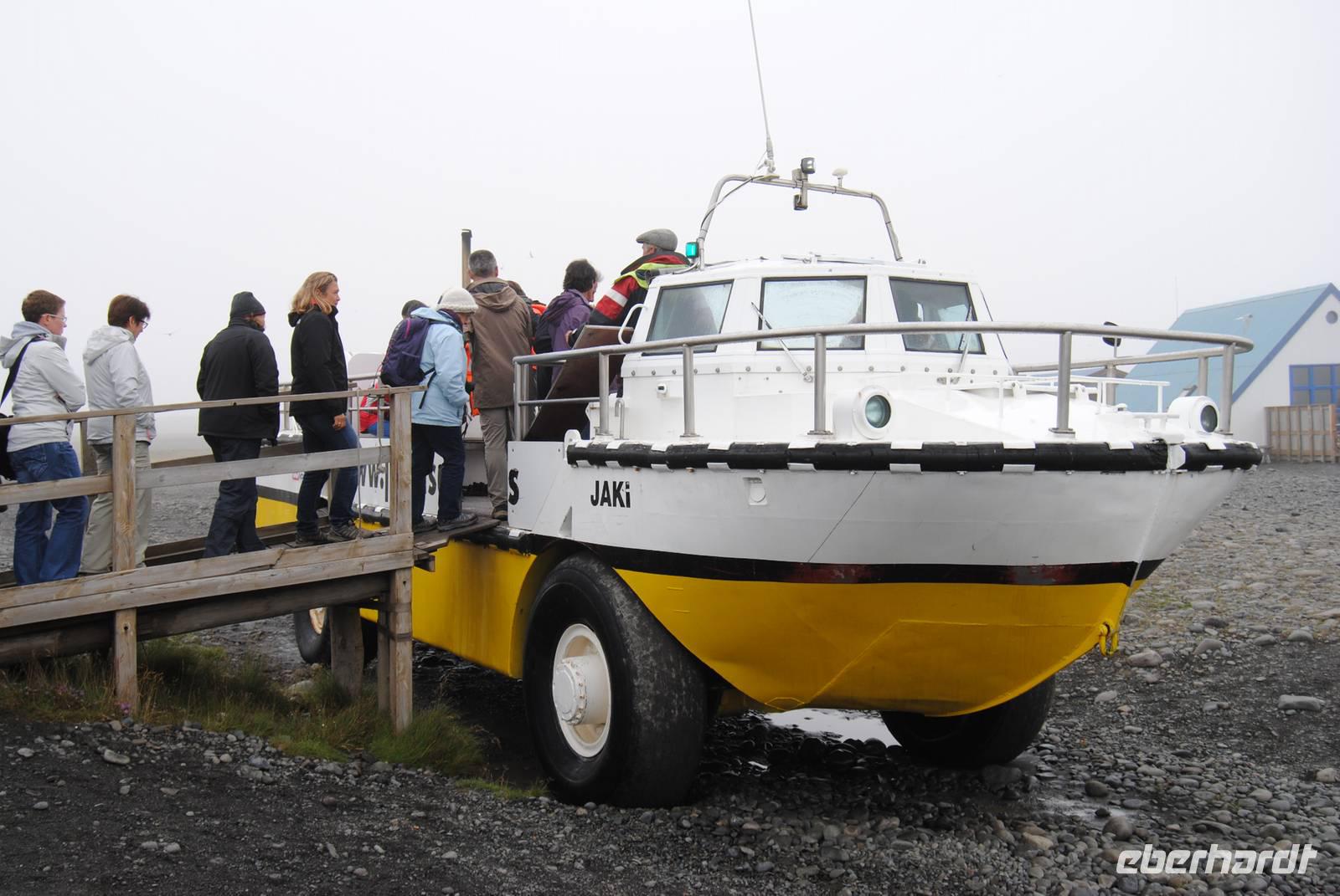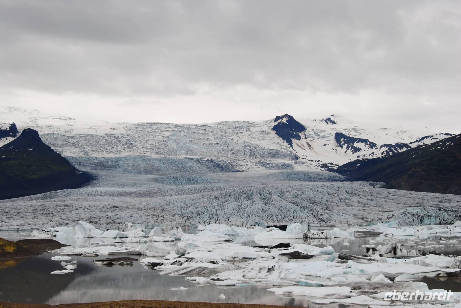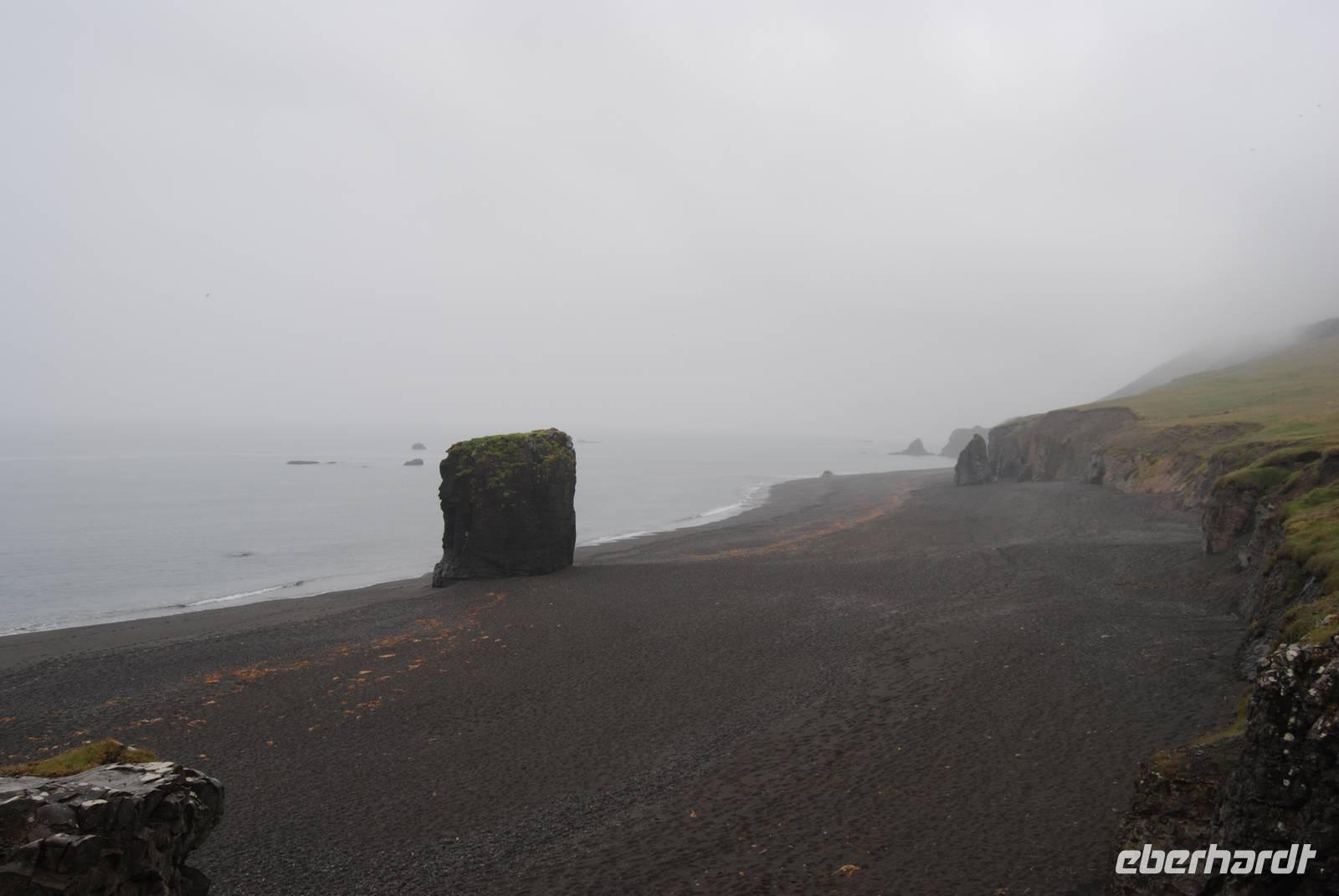 Hafen, wie Höfn übersetzt heißt, verließen wir am Morgen und setzten unsere Fahrt an der Südlküste in Richtung Westen fort. Entlang der Gletscherausläufer des Vatnajökull fuhren wir weiter auf der Inselringstraße 1 zunächst zum See Jökulsárlón (Gletscherflusslagune) Im dichten Nebel stiegen wir vom Bus auf ein Amphibienfahrzeug und fuhren, mit Schwimmwesten ausgerüstet, in die Lagune. Nach kurzer Zeit lockerte dann auch der Nebel auf und die Eisschollen kamen in ihrer blau-weißen Pracht zum Vorschein, ein beeindruckendes Erlebnis. An den Füßen der Gletscher setzten wir unsere Fahrt mit dem Bus fort und besuchten anschließend die Bergflussgletscherzunge Fjallsarlon und den Svínafellsjökull. An der Gletscherzunge des Svínafellsjökull legten wir am Mittag eine Pause ein und genossen die Weite des Gletschers. Ein interessantes Erlebnis, denn immer wieder hörte man Teile des Eises abbrechen und man merkte, wie hier die Natur hier arbeitet. Nach dem Mittag besuchten wir dann das Nationalparkzentrum Skaftafell und schauten uns die Ausstellung zu den Ausbrüchen und zur Geschichte des Vatnajökull an. Unsere Fahrt führte uns anschließend immer entlang der Südküste bis zu den Lavafeldern bei Skaftárhreppur. Das besondere der Lavafelder ist, dass diese komplett mit Zackenmützenmoos bedeckt- und somit weich wie ein Bett sind. Auch in dieser Gegend war es wieder faszinierend, wie sich die Landschaftsform von einem auf den anderen Kilometer ändern kann. Am frühen Abend erreichten wir dann das frisch eröffnete Edda-Hotel in Vik (Bucht) und am Abend unternahm ein Großteil der Gruppe einen Spaziergang entlang des schwarzen Strands von Vik.