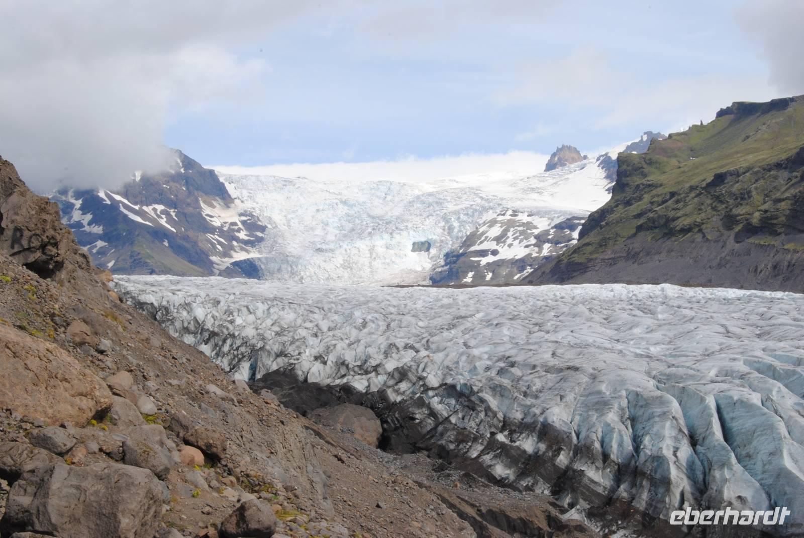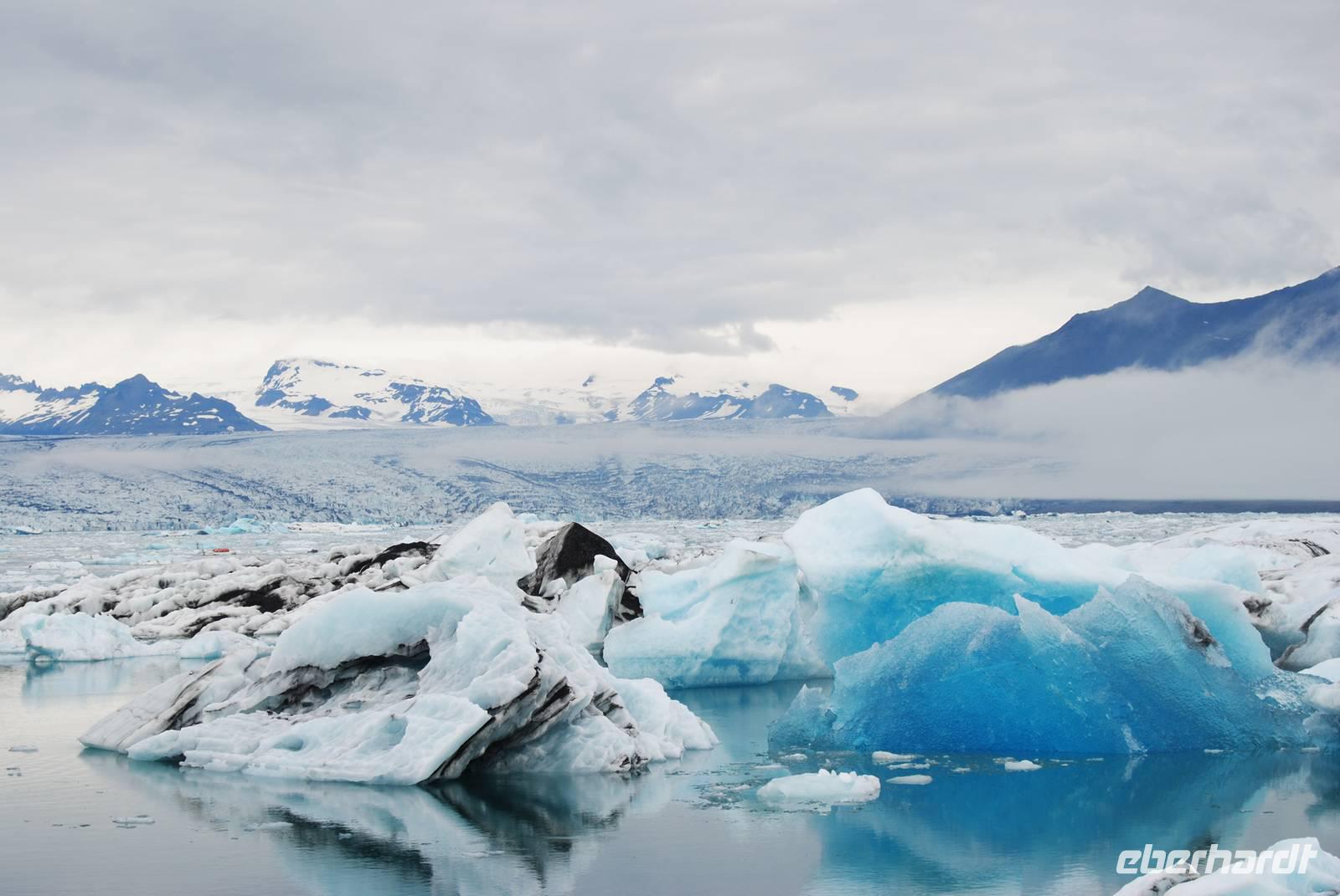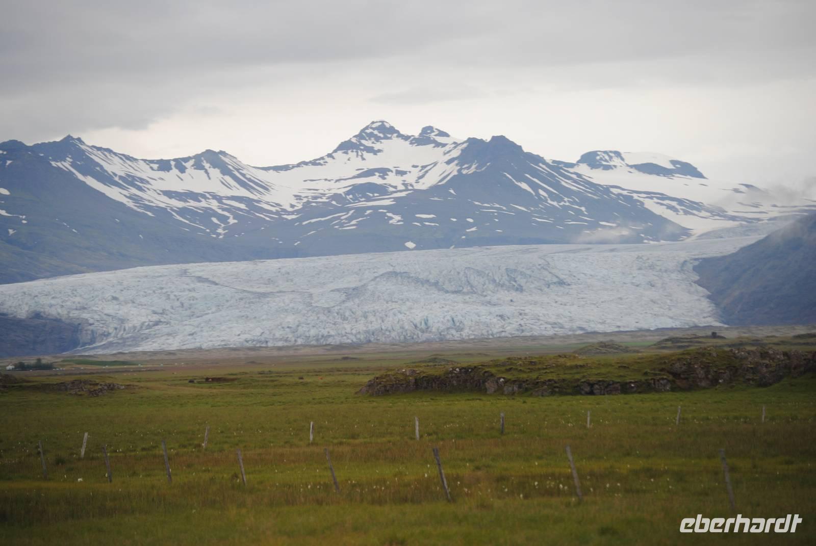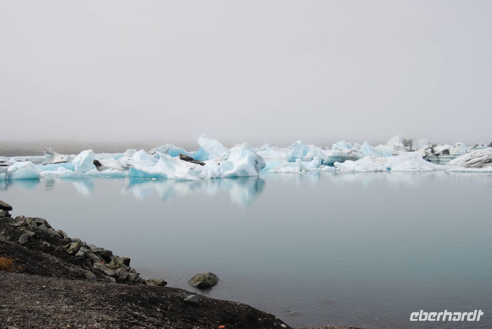 Hafen, wie Höfn übersetzt heißt, verließen wir am Morgen und setzten unsere Fahrt an der Südlküste in Richtung Westen fort. Entlang der Gletscherausläufer des Vatnajökull fuhren wir weiter auf der Inselringstraße 1 zunächst zum See Jökulsárlón (Gletscherflusslagune) Im dichten Nebel stiegen wir vom Bus auf ein Amphibienfahrzeug und fuhren, mit Schwimmwesten ausgerüstet, in die Lagune. Nach kurzer Zeit lockerte dann auch der Nebel auf und die Eisschollen kamen in ihrer blau-weißen Pracht zum Vorschein, ein beeindruckendes Erlebnis. An den Füßen der Gletscher setzten wir unsere Fahrt mit dem Bus fort und besuchten anschließend die Bergflussgletscherzunge Fjallsarlon und den Svínafellsjökull. An der Gletscherzunge des Svínafellsjökull legten wir am Mittag eine Pause ein und genossen die Weite des Gletschers. Ein interessantes Erlebnis, denn immer wieder hörte man Teile des Eises abbrechen und man merkte, wie hier die Natur hier arbeitet. Nach dem Mittag besuchten wir dann das Nationalparkzentrum Skaftafell und schauten uns die Ausstellung zu den Ausbrüchen und zur Geschichte des Vatnajökull an. Unsere Fahrt führte uns anschließend immer entlang der Südküste bis zu den Lavafeldern bei Skaftárhreppur. Das besondere der Lavafelder ist, dass diese komplett mit Zackenmützenmoos bedeckt- und somit weich wie ein Bett sind. Auch in dieser Gegend war es wieder faszinierend, wie sich die Landschaftsform von einem auf den anderen Kilometer ändern kann. Am frühen Abend erreichten wir dann das frisch eröffnete Edda-Hotel in Vik (Bucht) und am Abend unternahm ein Großteil der Gruppe einen Spaziergang entlang des schwarzen Strands von Vik.