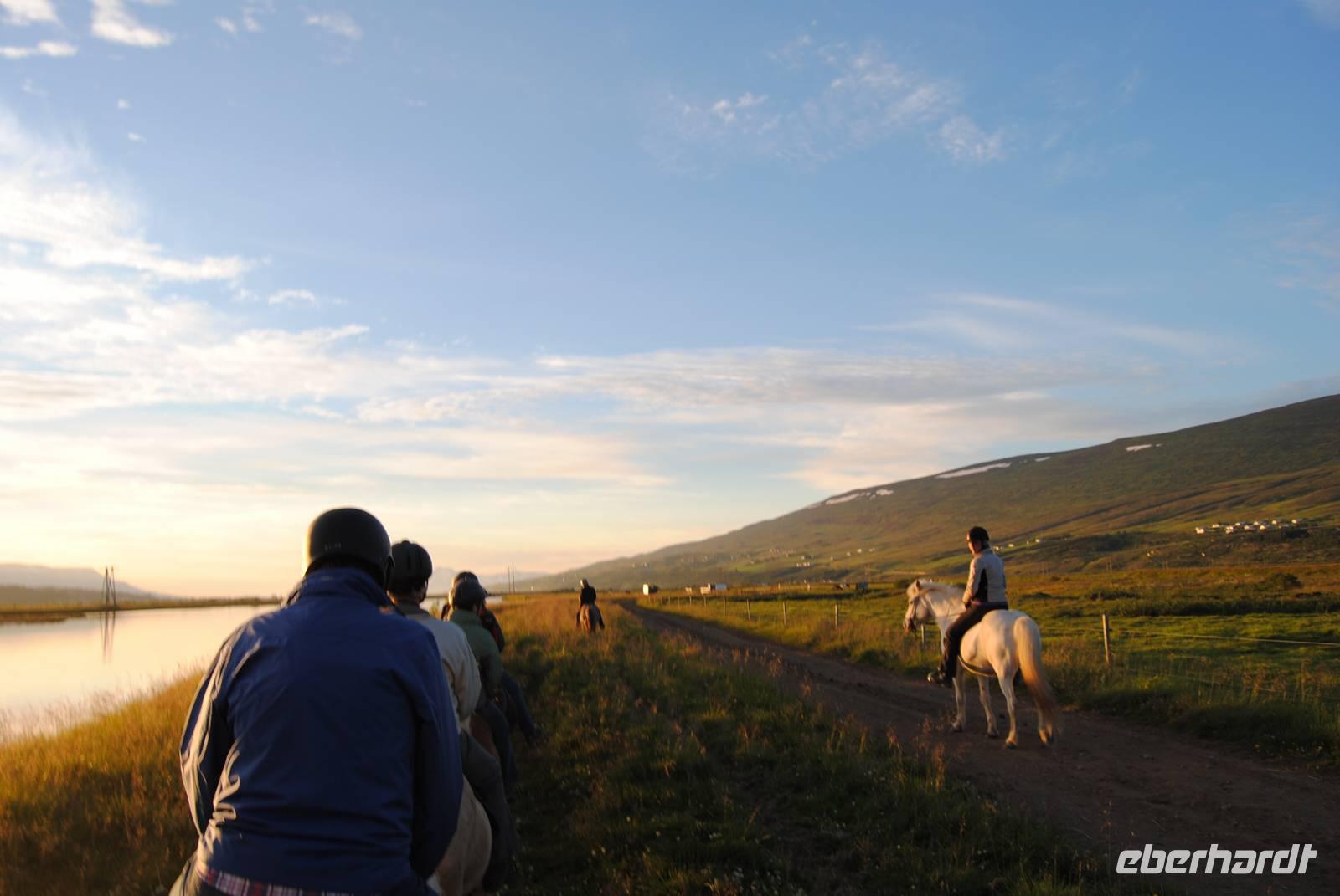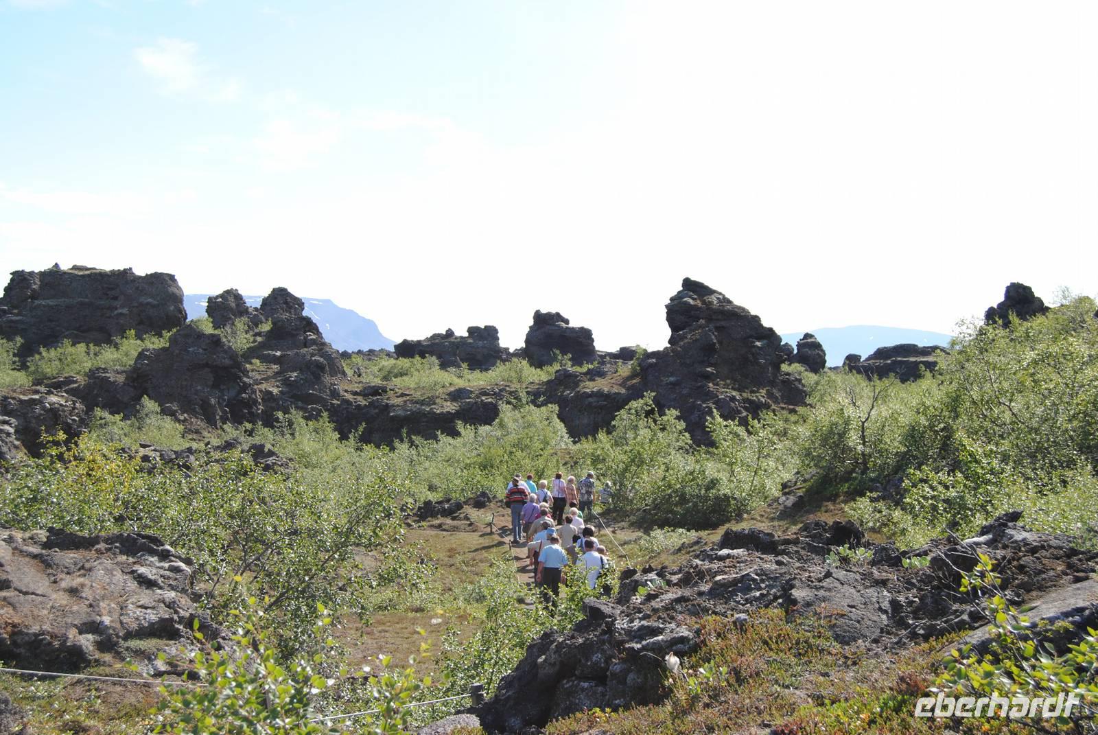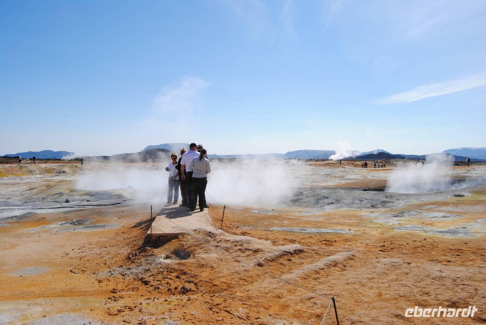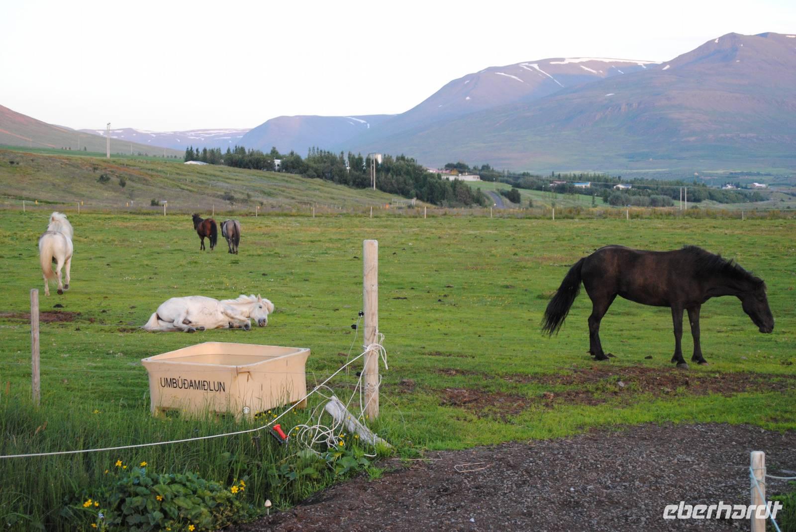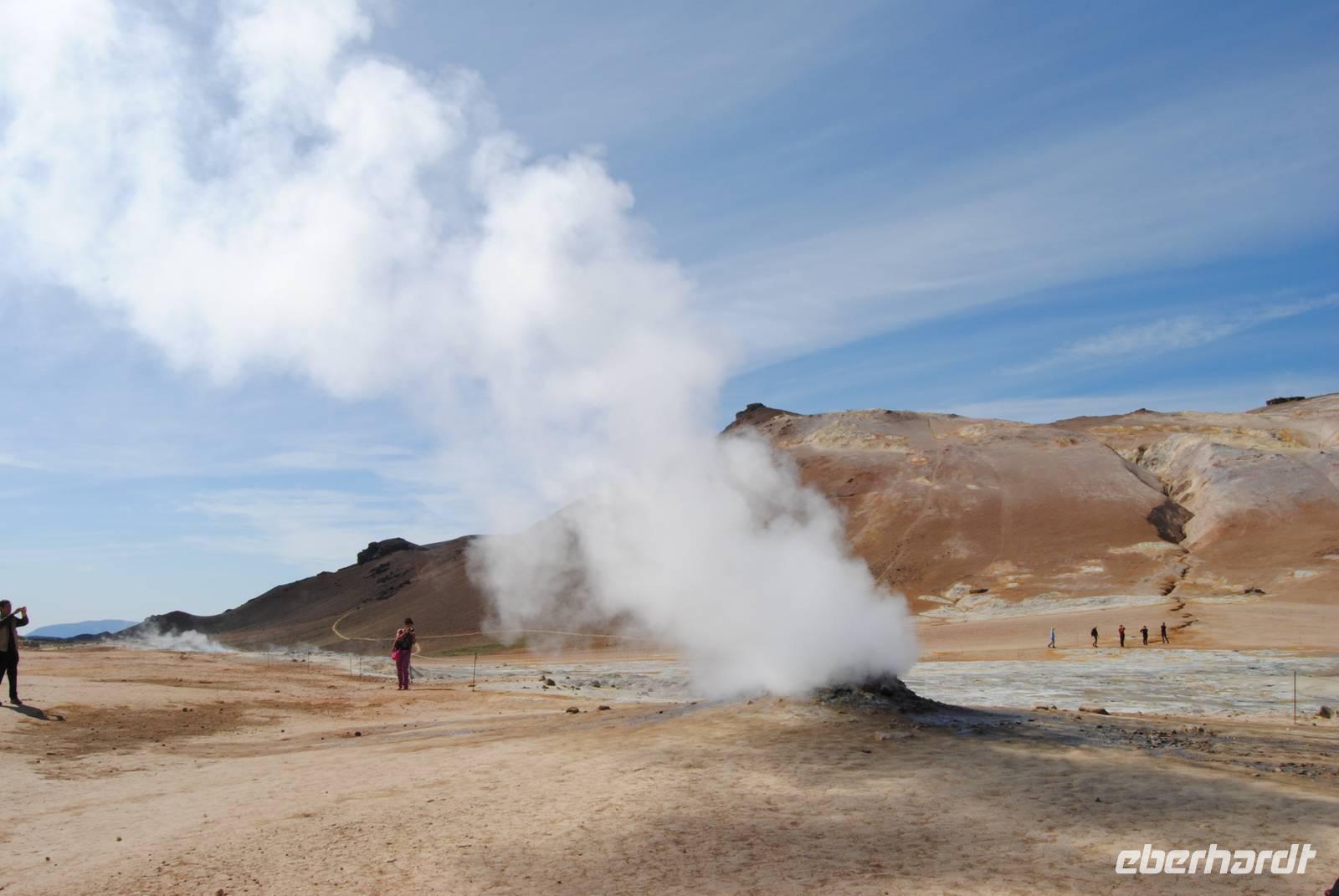 Akureyri war noch dicht in Nebel gehüllt, als wir die idyllische Stadt am Eyjafjördur (Inselfjord) am Morgen in Richtung Myvatn (Mückensee) verließen. Doch umso weiter wir höher in die Berge fuhren, umso mehr riss die Wolkendecke auf und uns boten herrliche Aussichten. Am Vormittag erreichten wir den Myvatn, den Mückensee und zugleich viertgrößten Binnensee Islands. Nach kurzem Fotostop setzten wir unsere Fahrt in das Vulkangebiet der Krafla fort. Und obwohl der Myvatn und das Vulkangebiet nur wenige Kilometer trennt, ist die Natur extrem unterschiedlich. Auf der einen Seite, das saftige Grün der Wiesen am Myvatn, auf der anderen Seite die endlose Weite des Vulkangesteins und der nimmermüden sprudelnden Quellen. Einfach beeindruckend. Am Mittag entspannten wir in der Badelagune Jardbödin zwischen Reykjahlio und Namaskaro und genossen die weite Sicht über den See Myvatn. Am frühen Nachmittag erreichten wir dann wieder den Myvatn und fuhren zum Lava-Labyrinth Dimmuborgir, einer bizarren Felslandschaft, in der wir eine kleine Wanderung unternahmen und neben den vielen versteinerten Trollen, auch eine Vielzahl an natürlichen, steinernen Pilzen entdeckten ;-) Auf der Rückfahrt nach Akureyri besuchten wir noch den Godafoss (Götterwasserfall), dessen Wasser wie das der meisten Wasserfälle auf Island durch Gletscherwasser gespeist wird. Am frühen Abend erreichten wir wieder unser Hotel in Akureyri, doch vorher legten wir gegenüber der Hafenstadt am Eyjafjördur noch einen Fotostop ein um die tolle Aussicht in den Fjord zu genießen. Nach dem Abendessen fuhr ich mit einigen Gästen hinunter an den Eyjafjördur um einen Reitausflug mit Islandpferden zu unternehmen. Nach kurzer Einweisung und der Helmausgabe führte uns anschließend die geführte Tour entlang des Eyjafjördur, ein tolles Erlebnis.