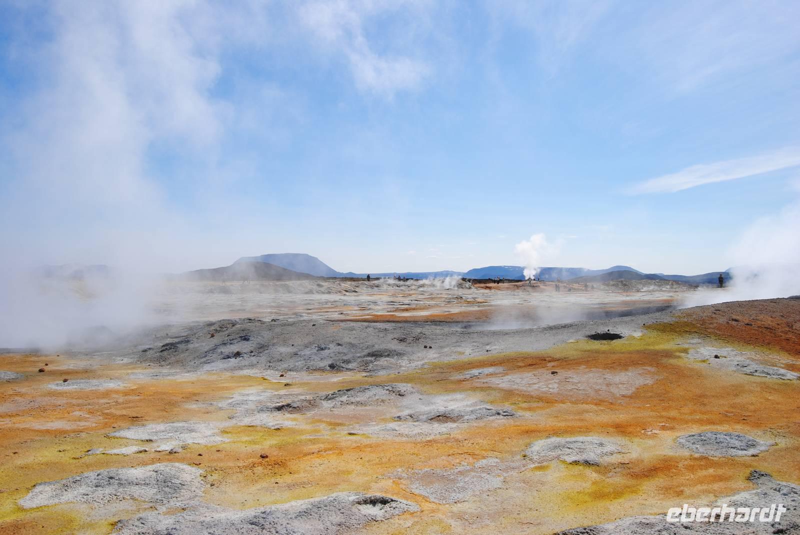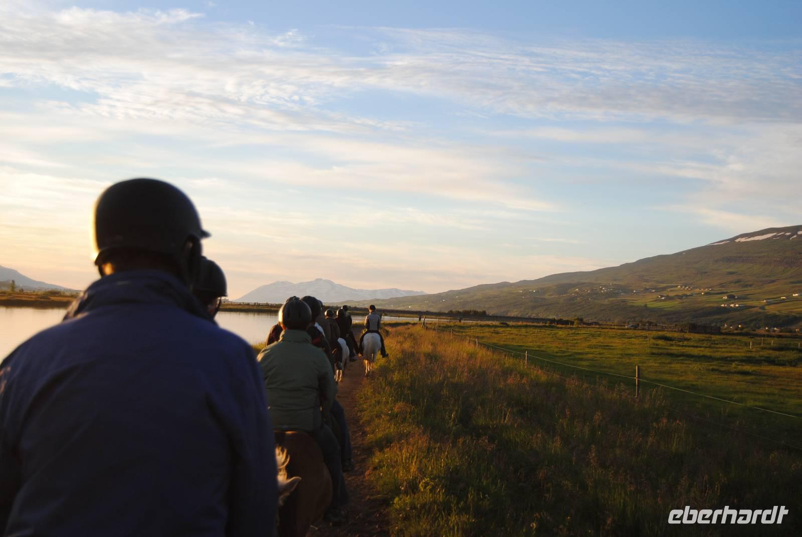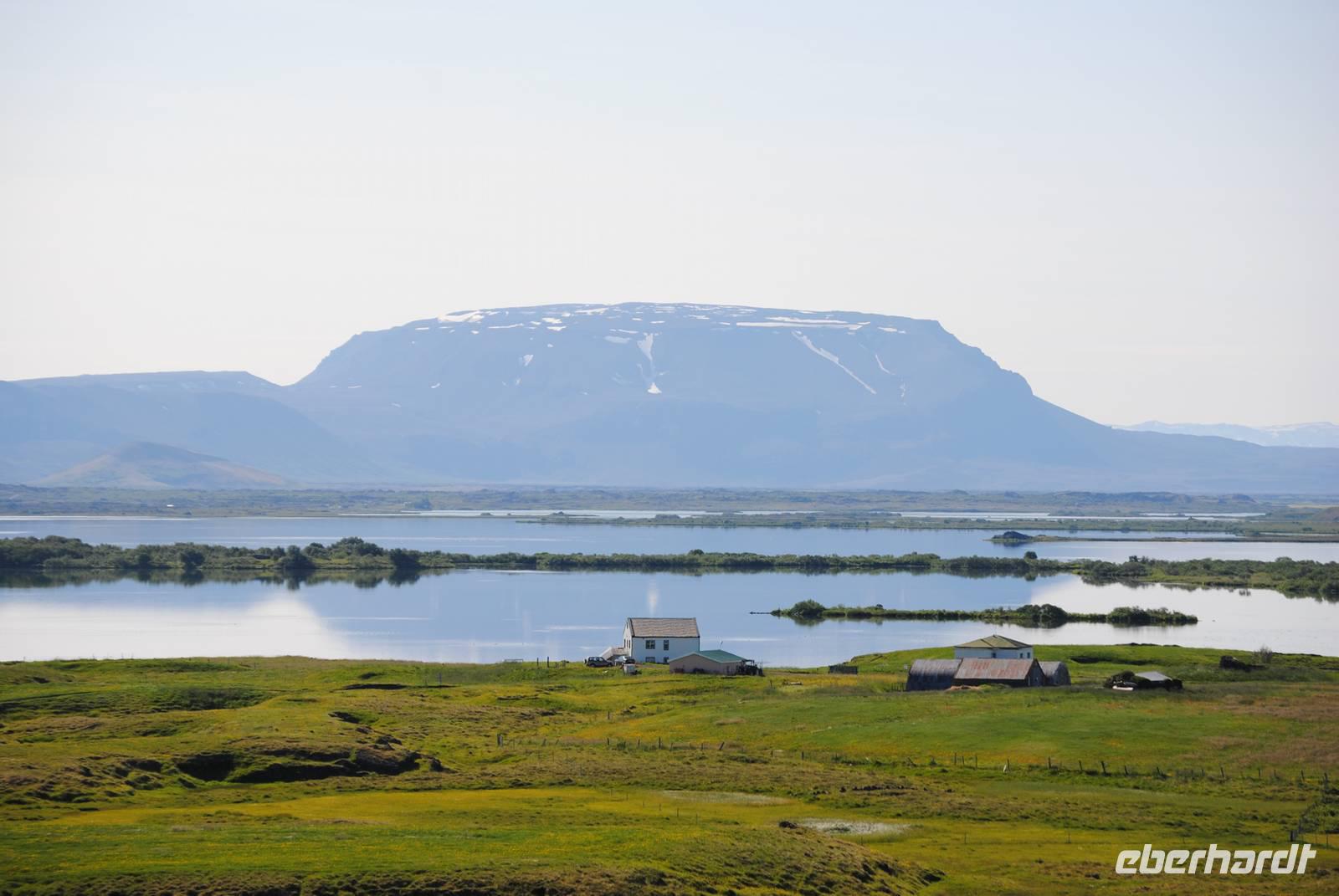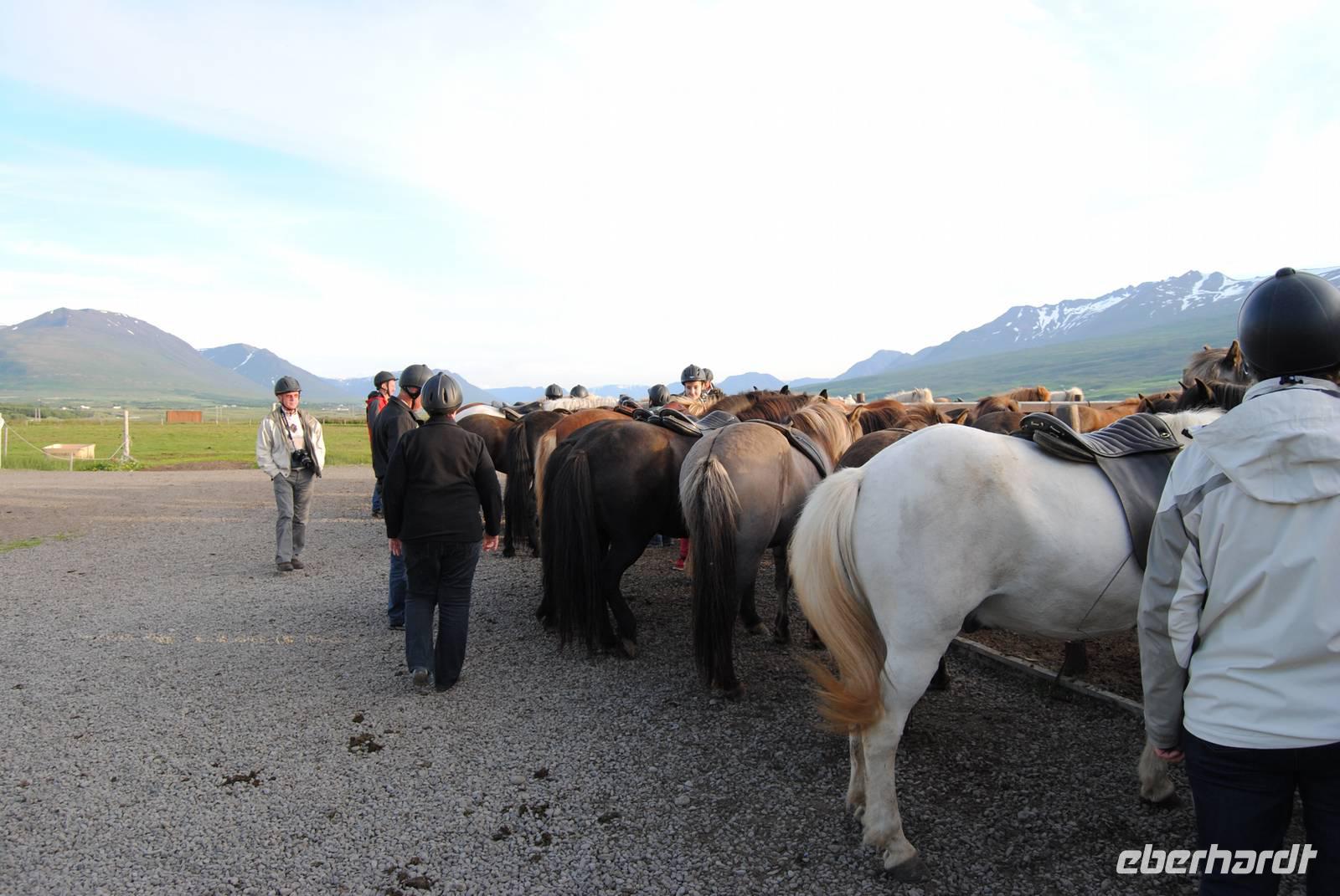 Akureyri war noch dicht in Nebel gehüllt, als wir die idyllische Stadt am Eyjafjördur (Inselfjord) am Morgen in Richtung Myvatn (Mückensee) verließen. Doch umso weiter wir höher in die Berge fuhren, umso mehr riss die Wolkendecke auf und uns boten herrliche Aussichten. Am Vormittag erreichten wir den Myvatn, den Mückensee und zugleich viertgrößten Binnensee Islands. Nach kurzem Fotostop setzten wir unsere Fahrt in das Vulkangebiet der Krafla fort. Und obwohl der Myvatn und das Vulkangebiet nur wenige Kilometer trennt, ist die Natur extrem unterschiedlich. Auf der einen Seite, das saftige Grün der Wiesen am Myvatn, auf der anderen Seite die endlose Weite des Vulkangesteins und der nimmermüden sprudelnden Quellen. Einfach beeindruckend. Am Mittag entspannten wir in der Badelagune Jardbödin zwischen Reykjahlio und Namaskaro und genossen die weite Sicht über den See Myvatn. Am frühen Nachmittag erreichten wir dann wieder den Myvatn und fuhren zum Lava-Labyrinth Dimmuborgir, einer bizarren Felslandschaft, in der wir eine kleine Wanderung unternahmen und neben den vielen versteinerten Trollen, auch eine Vielzahl an natürlichen, steinernen Pilzen entdeckten ;-) Auf der Rückfahrt nach Akureyri besuchten wir noch den Godafoss (Götterwasserfall), dessen Wasser wie das der meisten Wasserfälle auf Island durch Gletscherwasser gespeist wird. Am frühen Abend erreichten wir wieder unser Hotel in Akureyri, doch vorher legten wir gegenüber der Hafenstadt am Eyjafjördur noch einen Fotostop ein um die tolle Aussicht in den Fjord zu genießen. Nach dem Abendessen fuhr ich mit einigen Gästen hinunter an den Eyjafjördur um einen Reitausflug mit Islandpferden zu unternehmen. Nach kurzer Einweisung und der Helmausgabe führte uns anschließend die geführte Tour entlang des Eyjafjördur, ein tolles Erlebnis.