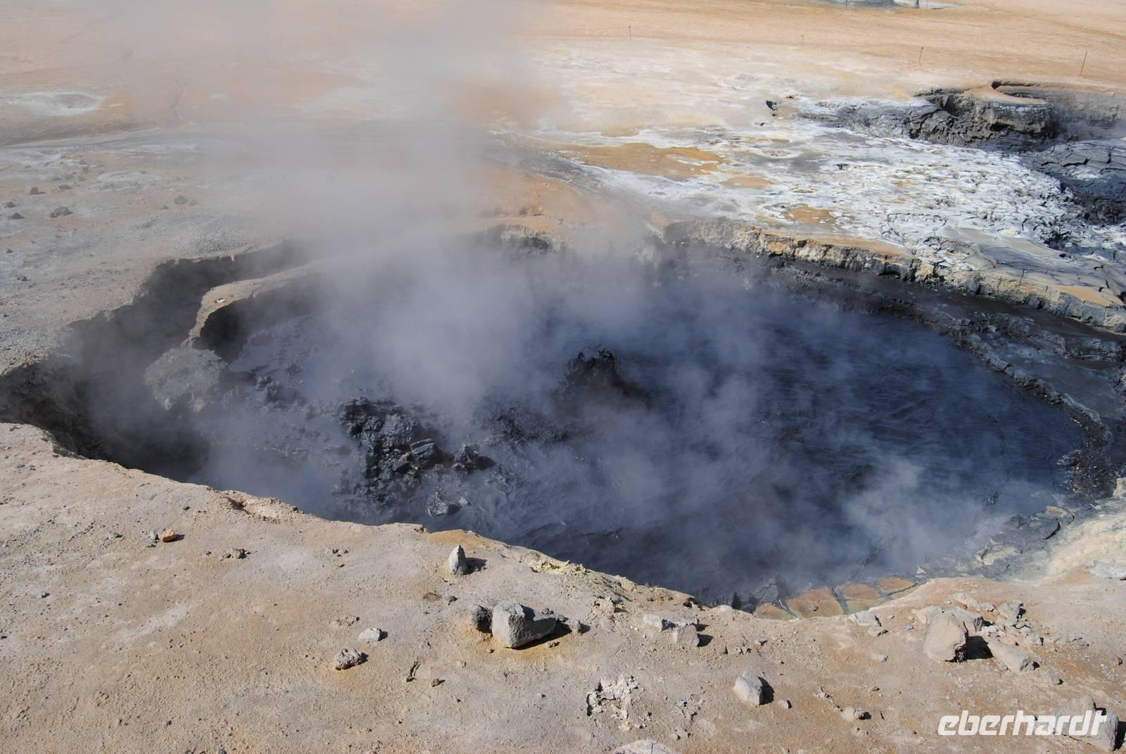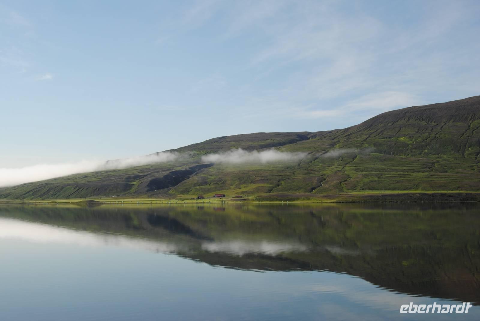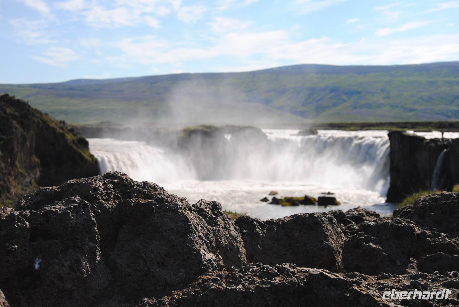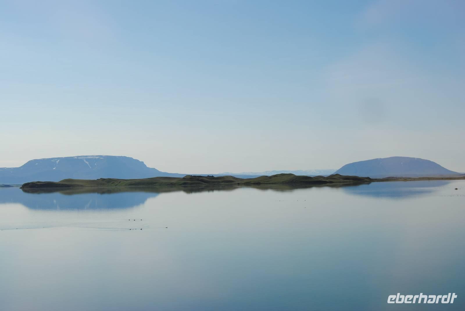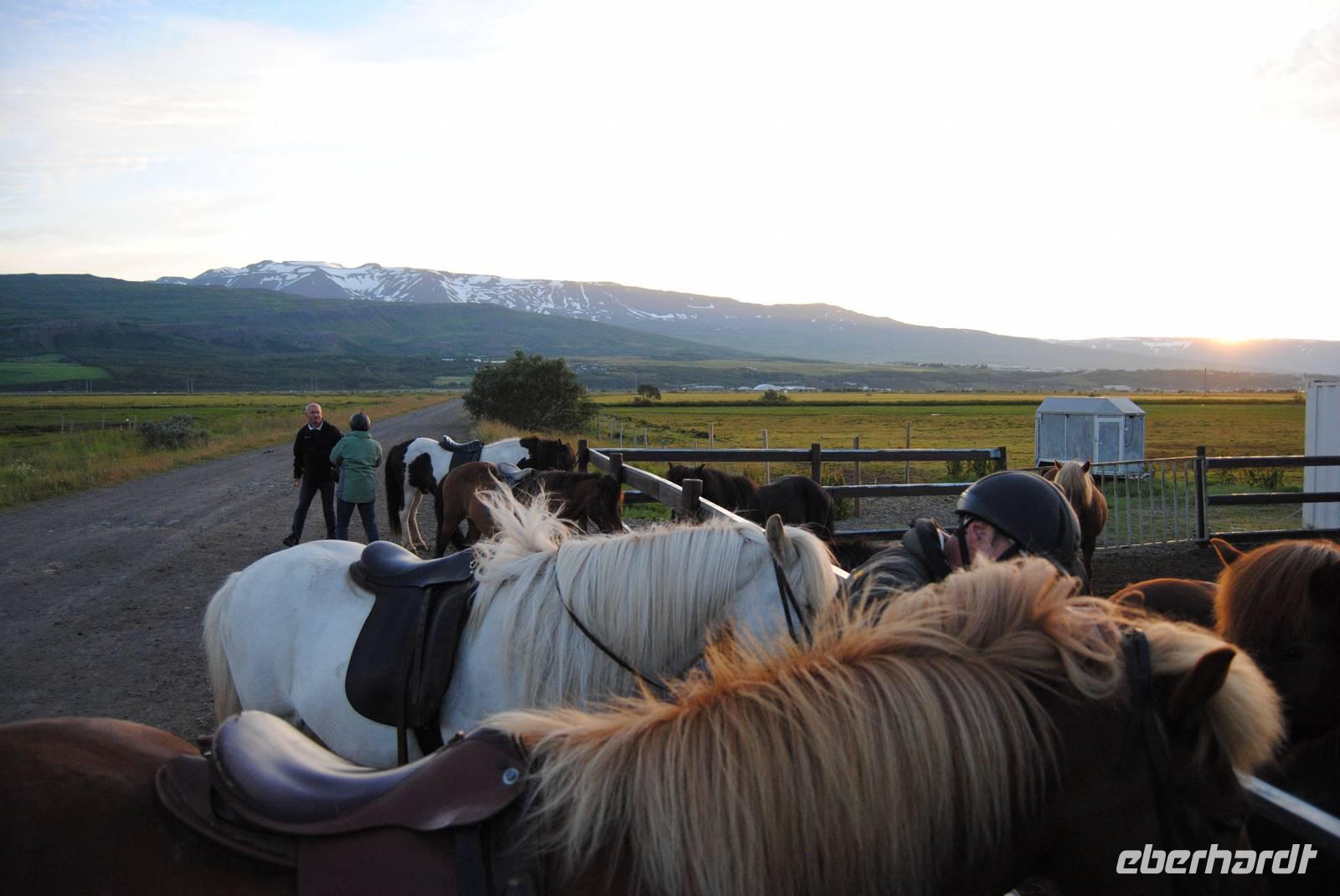 Akureyri war noch dicht in Nebel gehüllt, als wir die idyllische Stadt am Eyjafjördur (Inselfjord) am Morgen in Richtung Myvatn (Mückensee) verließen. Doch umso weiter wir höher in die Berge fuhren, umso mehr riss die Wolkendecke auf und uns boten herrliche Aussichten. Am Vormittag erreichten wir den Myvatn, den Mückensee und zugleich viertgrößten Binnensee Islands. Nach kurzem Fotostop setzten wir unsere Fahrt in das Vulkangebiet der Krafla fort. Und obwohl der Myvatn und das Vulkangebiet nur wenige Kilometer trennt, ist die Natur extrem unterschiedlich. Auf der einen Seite, das saftige Grün der Wiesen am Myvatn, auf der anderen Seite die endlose Weite des Vulkangesteins und der nimmermüden sprudelnden Quellen. Einfach beeindruckend. Am Mittag entspannten wir in der Badelagune Jardbödin zwischen Reykjahlio und Namaskaro und genossen die weite Sicht über den See Myvatn. Am frühen Nachmittag erreichten wir dann wieder den Myvatn und fuhren zum Lava-Labyrinth Dimmuborgir, einer bizarren Felslandschaft, in der wir eine kleine Wanderung unternahmen und neben den vielen versteinerten Trollen, auch eine Vielzahl an natürlichen, steinernen Pilzen entdeckten ;-) Auf der Rückfahrt nach Akureyri besuchten wir noch den Godafoss (Götterwasserfall), dessen Wasser wie das der meisten Wasserfälle auf Island durch Gletscherwasser gespeist wird. Am frühen Abend erreichten wir wieder unser Hotel in Akureyri, doch vorher legten wir gegenüber der Hafenstadt am Eyjafjördur noch einen Fotostop ein um die tolle Aussicht in den Fjord zu genießen. Nach dem Abendessen fuhr ich mit einigen Gästen hinunter an den Eyjafjördur um einen Reitausflug mit Islandpferden zu unternehmen. Nach kurzer Einweisung und der Helmausgabe führte uns anschließend die geführte Tour entlang des Eyjafjördur, ein tolles Erlebnis.