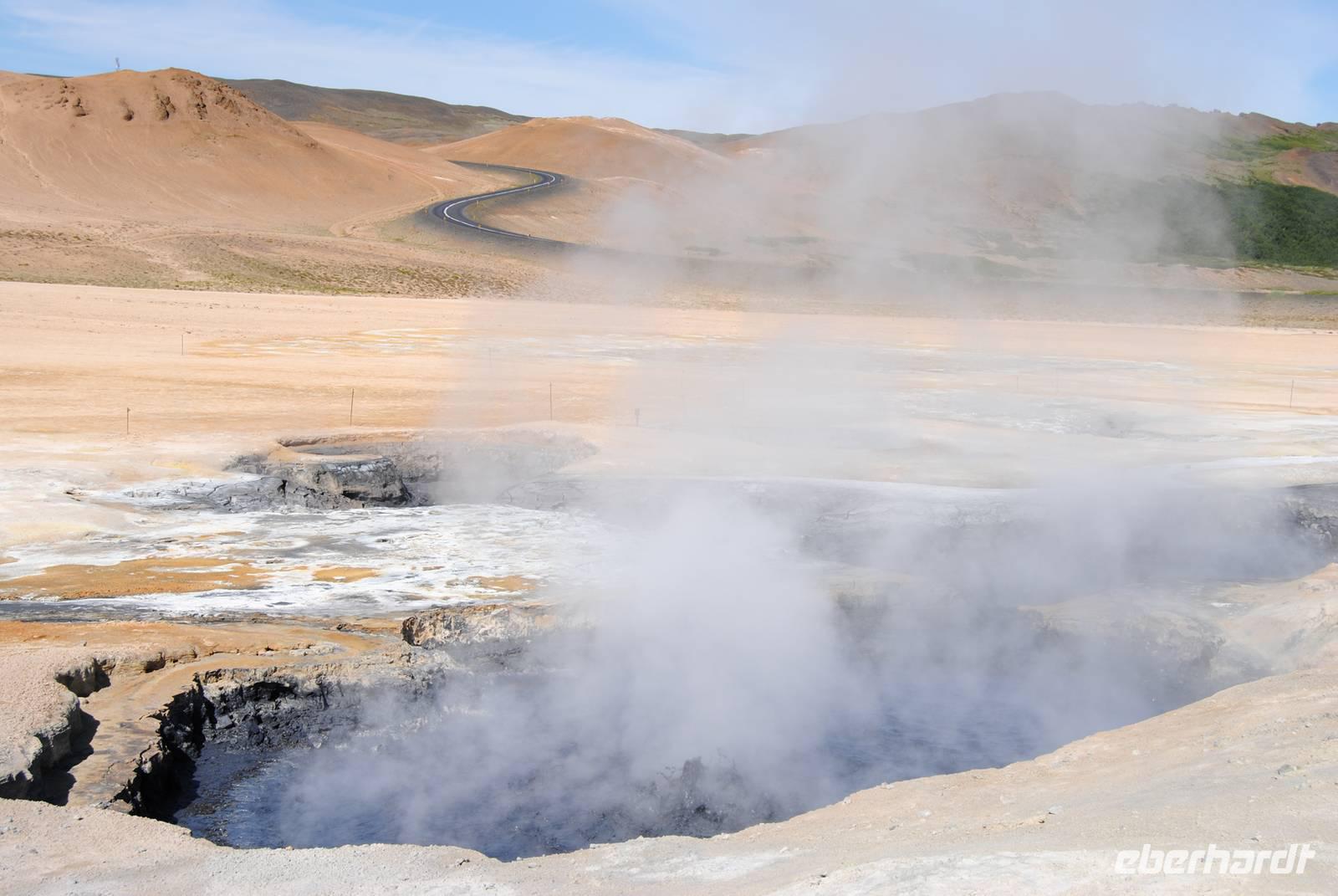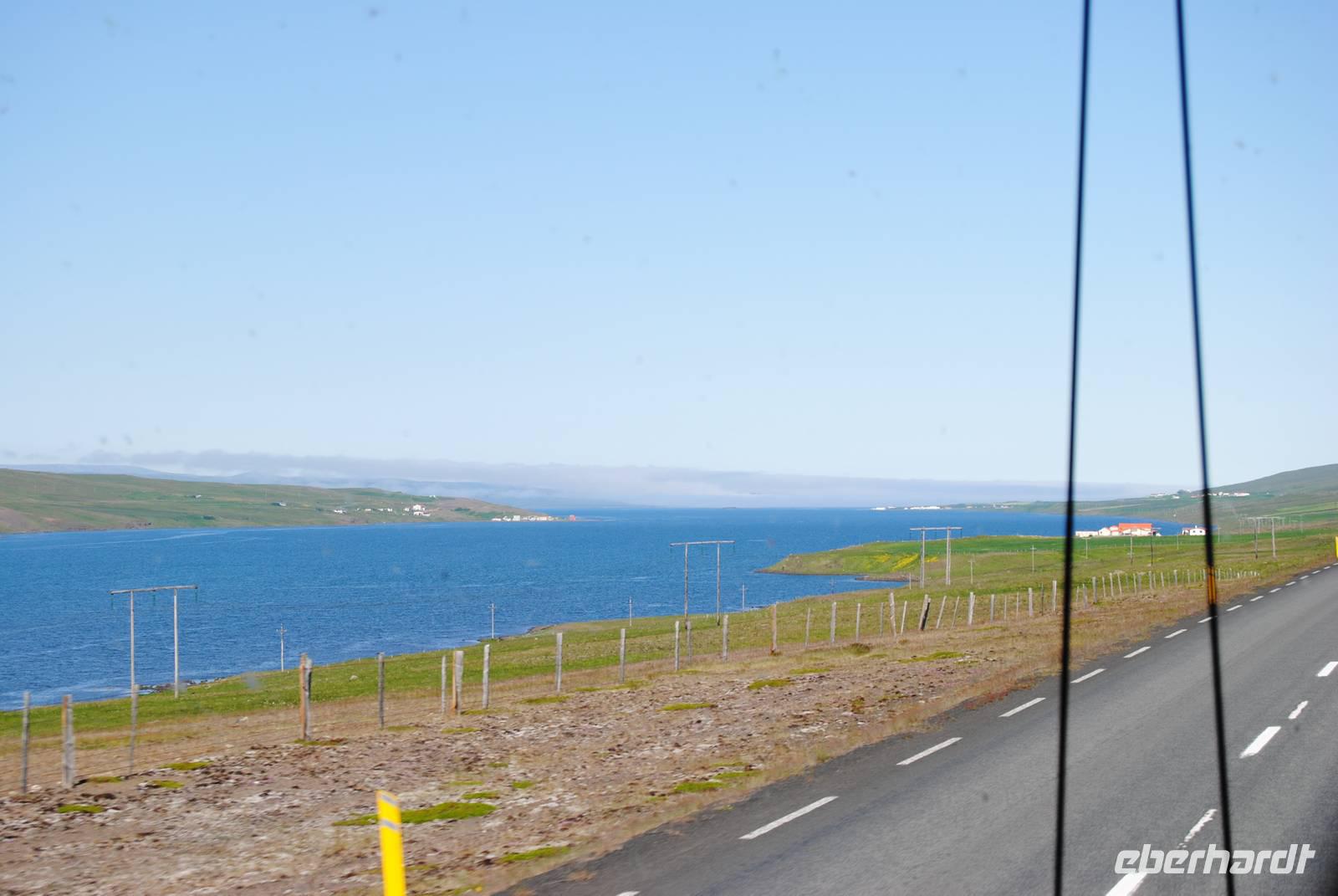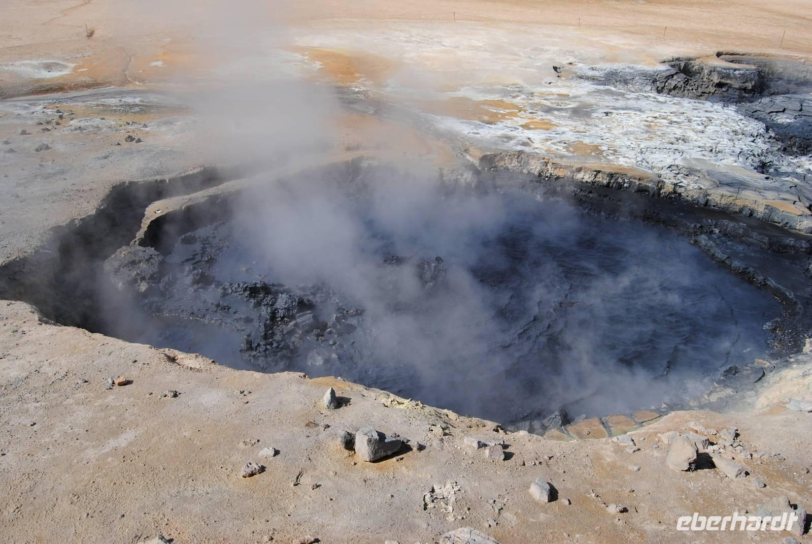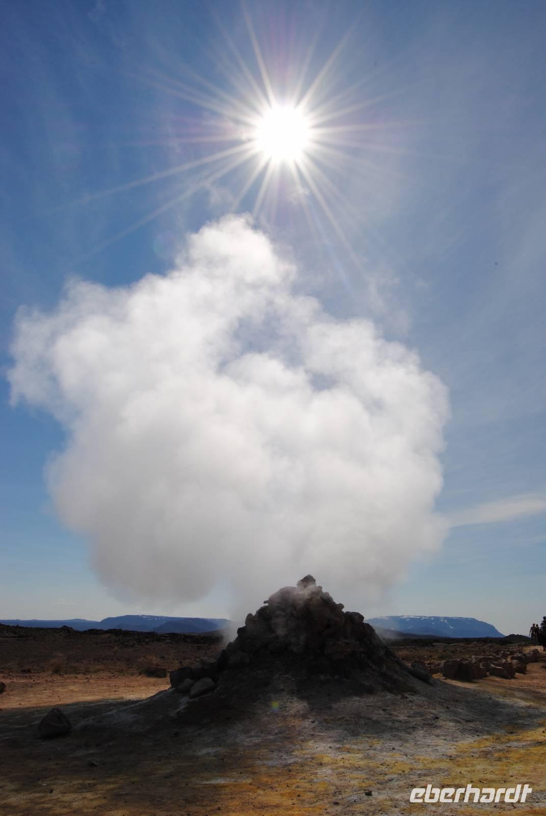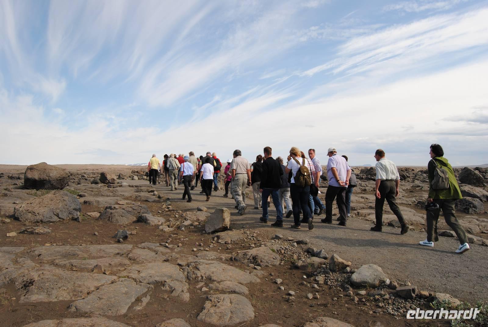 Akureyri war noch dicht in Nebel gehüllt, als wir die idyllische Stadt am Eyjafjördur (Inselfjord) am Morgen in Richtung Myvatn (Mückensee) verließen. Doch umso weiter wir höher in die Berge fuhren, umso mehr riss die Wolkendecke auf und uns boten herrliche Aussichten. Am Vormittag erreichten wir den Myvatn, den Mückensee und zugleich viertgrößten Binnensee Islands. Nach kurzem Fotostop setzten wir unsere Fahrt in das Vulkangebiet der Krafla fort. Und obwohl der Myvatn und das Vulkangebiet nur wenige Kilometer trennt, ist die Natur extrem unterschiedlich. Auf der einen Seite, das saftige Grün der Wiesen am Myvatn, auf der anderen Seite die endlose Weite des Vulkangesteins und der nimmermüden sprudelnden Quellen. Einfach beeindruckend. Am Mittag entspannten wir in der Badelagune Jardbödin zwischen Reykjahlio und Namaskaro und genossen die weite Sicht über den See Myvatn. Am frühen Nachmittag erreichten wir dann wieder den Myvatn und fuhren zum Lava-Labyrinth Dimmuborgir, einer bizarren Felslandschaft, in der wir eine kleine Wanderung unternahmen und neben den vielen versteinerten Trollen, auch eine Vielzahl an natürlichen, steinernen Pilzen entdeckten ;-) Auf der Rückfahrt nach Akureyri besuchten wir noch den Godafoss (Götterwasserfall), dessen Wasser wie das der meisten Wasserfälle auf Island durch Gletscherwasser gespeist wird. Am frühen Abend erreichten wir wieder unser Hotel in Akureyri, doch vorher legten wir gegenüber der Hafenstadt am Eyjafjördur noch einen Fotostop ein um die tolle Aussicht in den Fjord zu genießen. Nach dem Abendessen fuhr ich mit einigen Gästen hinunter an den Eyjafjördur um einen Reitausflug mit Islandpferden zu unternehmen. Nach kurzer Einweisung und der Helmausgabe führte uns anschließend die geführte Tour entlang des Eyjafjördur, ein tolles Erlebnis.