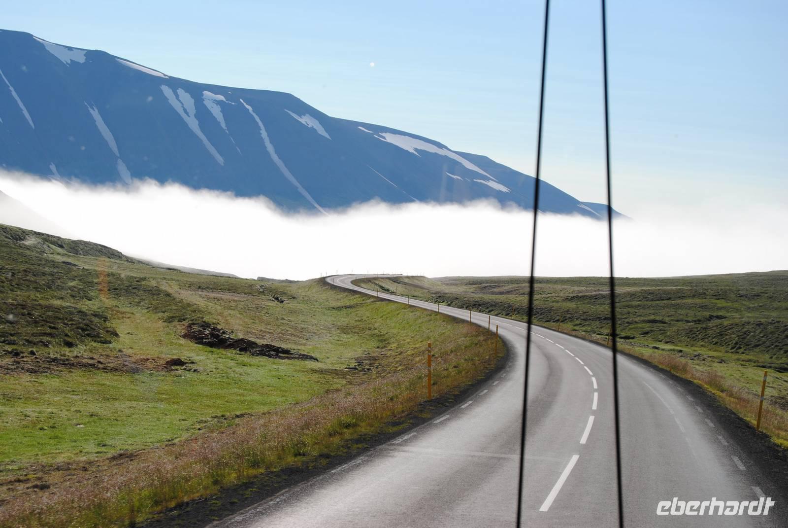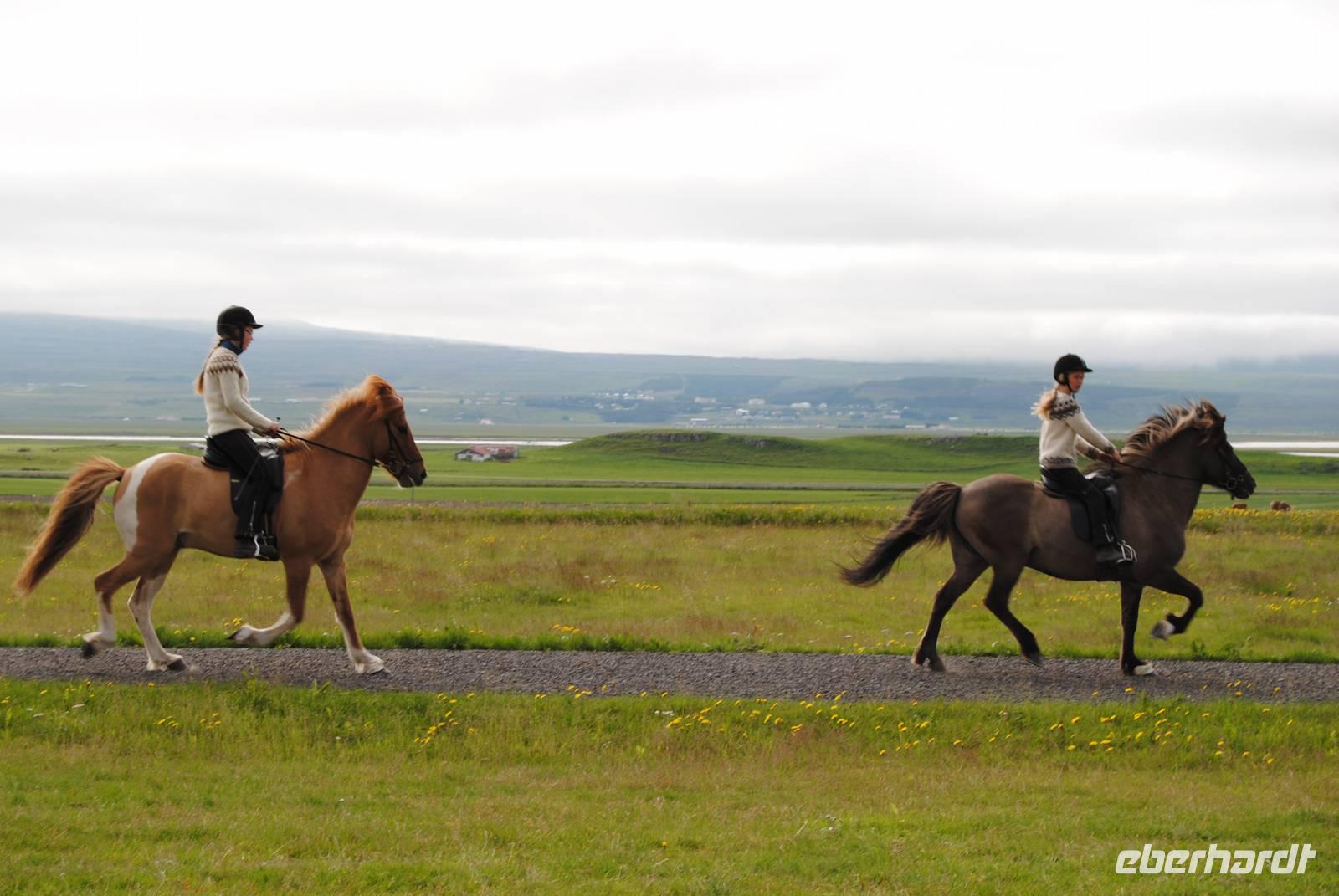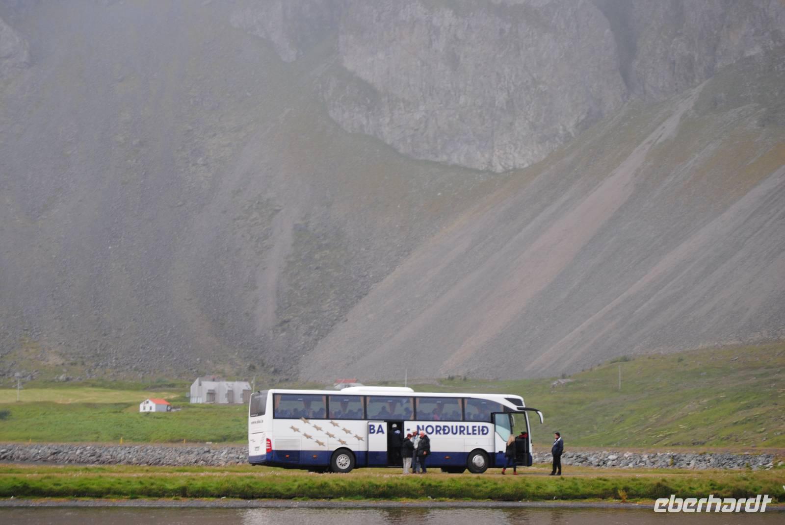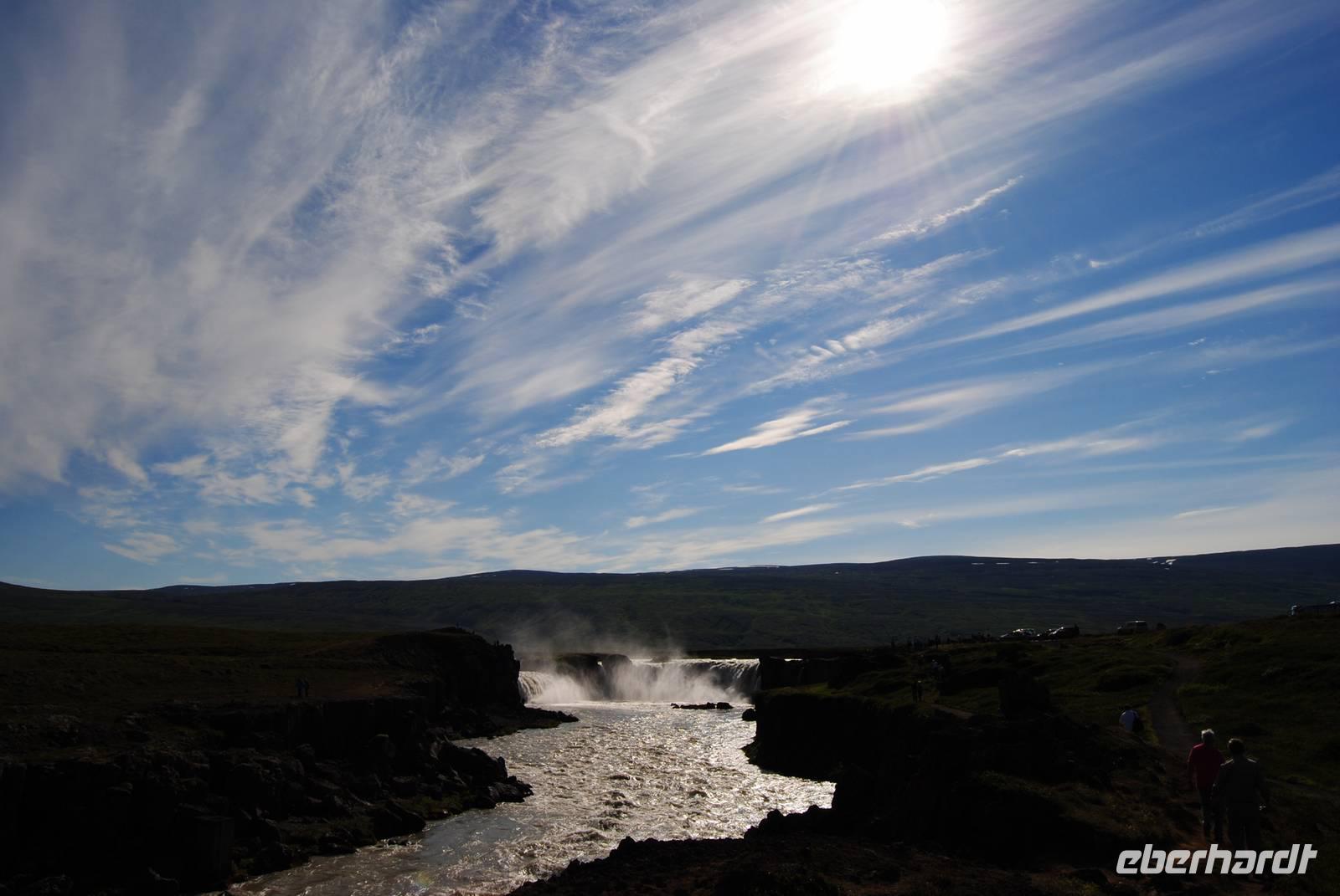 Akureyri war noch dicht in Nebel gehüllt, als wir die idyllische Stadt am Eyjafjördur (Inselfjord) am Morgen in Richtung Myvatn (Mückensee) verließen. Doch umso weiter wir höher in die Berge fuhren, umso mehr riss die Wolkendecke auf und uns boten herrliche Aussichten. Am Vormittag erreichten wir den Myvatn, den Mückensee und zugleich viertgrößten Binnensee Islands. Nach kurzem Fotostop setzten wir unsere Fahrt in das Vulkangebiet der Krafla fort. Und obwohl der Myvatn und das Vulkangebiet nur wenige Kilometer trennt, ist die Natur extrem unterschiedlich. Auf der einen Seite, das saftige Grün der Wiesen am Myvatn, auf der anderen Seite die endlose Weite des Vulkangesteins und der nimmermüden sprudelnden Quellen. Einfach beeindruckend. Am Mittag entspannten wir in der Badelagune Jardbödin zwischen Reykjahlio und Namaskaro und genossen die weite Sicht über den See Myvatn. Am frühen Nachmittag erreichten wir dann wieder den Myvatn und fuhren zum Lava-Labyrinth Dimmuborgir, einer bizarren Felslandschaft, in der wir eine kleine Wanderung unternahmen und neben den vielen versteinerten Trollen, auch eine Vielzahl an natürlichen, steinernen Pilzen entdeckten ;-) Auf der Rückfahrt nach Akureyri besuchten wir noch den Godafoss (Götterwasserfall), dessen Wasser wie das der meisten Wasserfälle auf Island durch Gletscherwasser gespeist wird. Am frühen Abend erreichten wir wieder unser Hotel in Akureyri, doch vorher legten wir gegenüber der Hafenstadt am Eyjafjördur noch einen Fotostop ein um die tolle Aussicht in den Fjord zu genießen. Nach dem Abendessen fuhr ich mit einigen Gästen hinunter an den Eyjafjördur um einen Reitausflug mit Islandpferden zu unternehmen. Nach kurzer Einweisung und der Helmausgabe führte uns anschließend die geführte Tour entlang des Eyjafjördur, ein tolles Erlebnis.