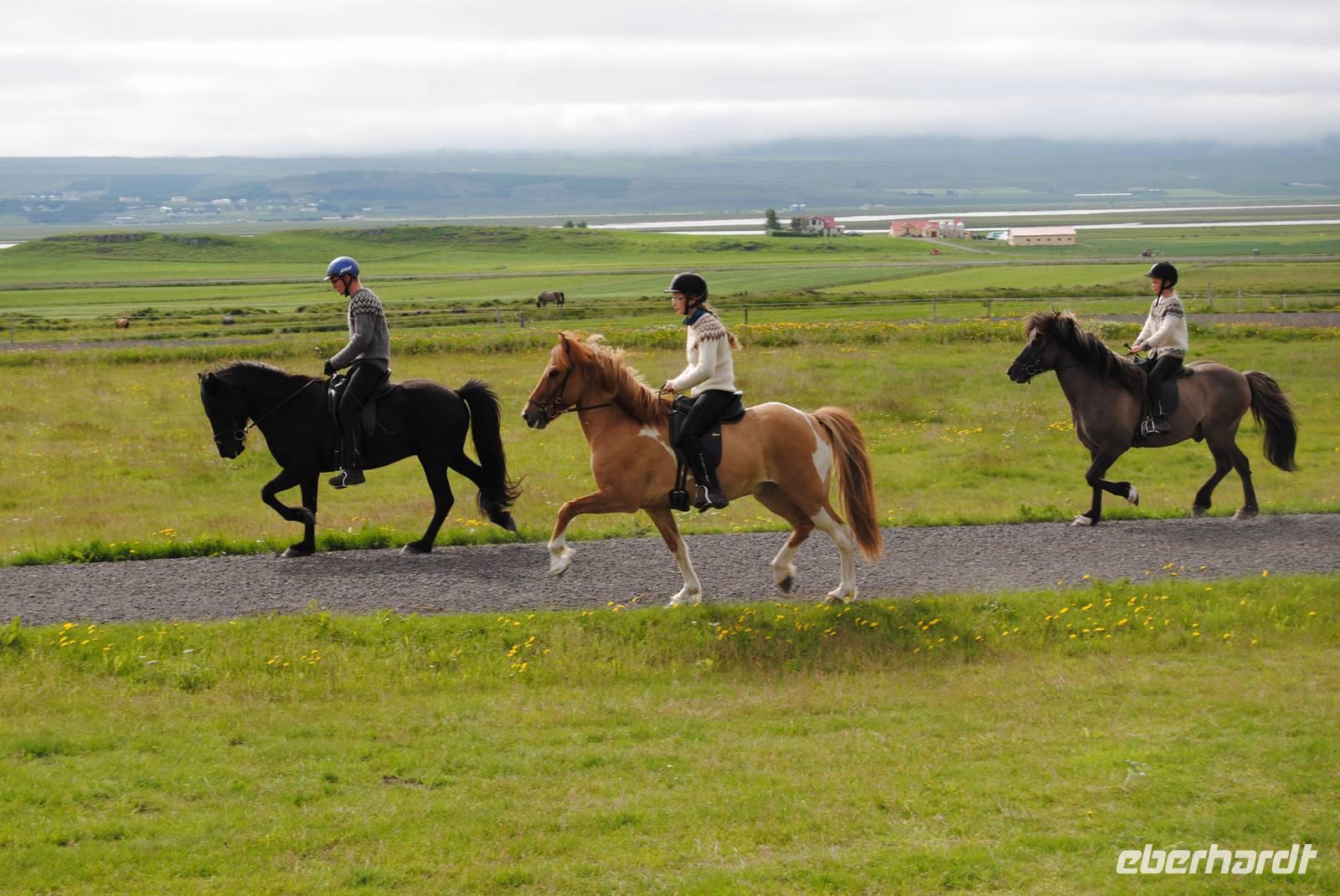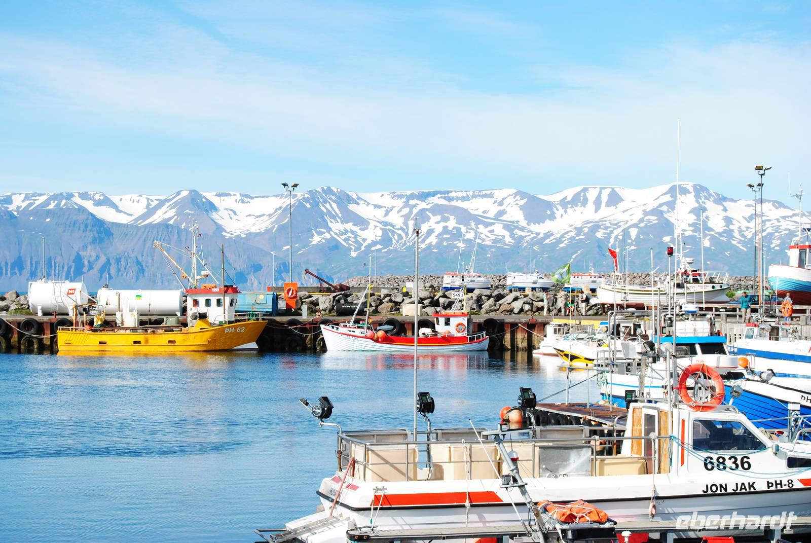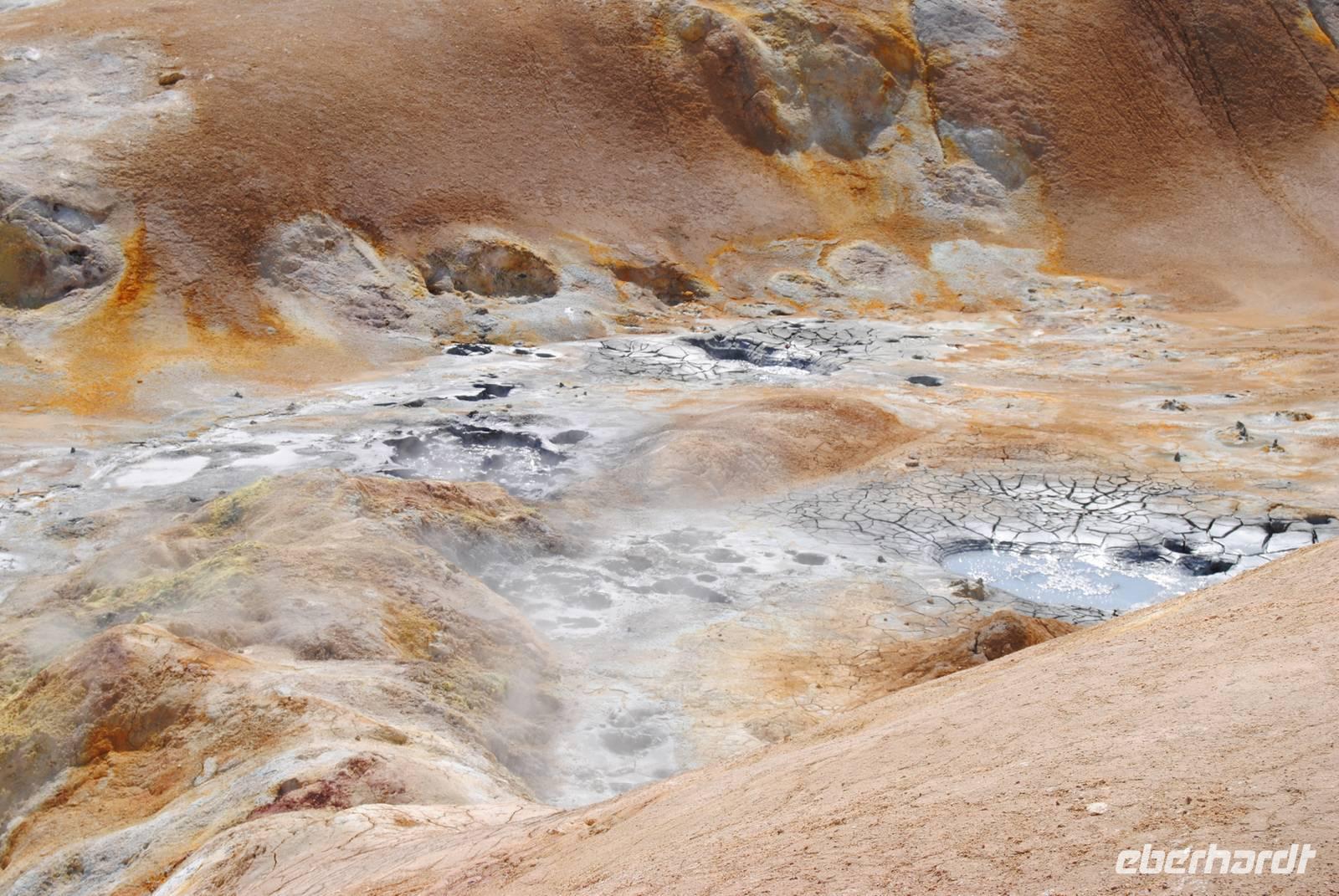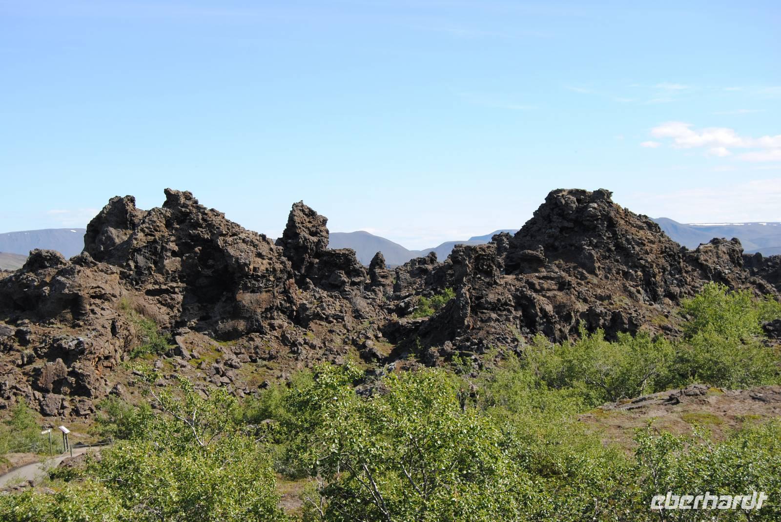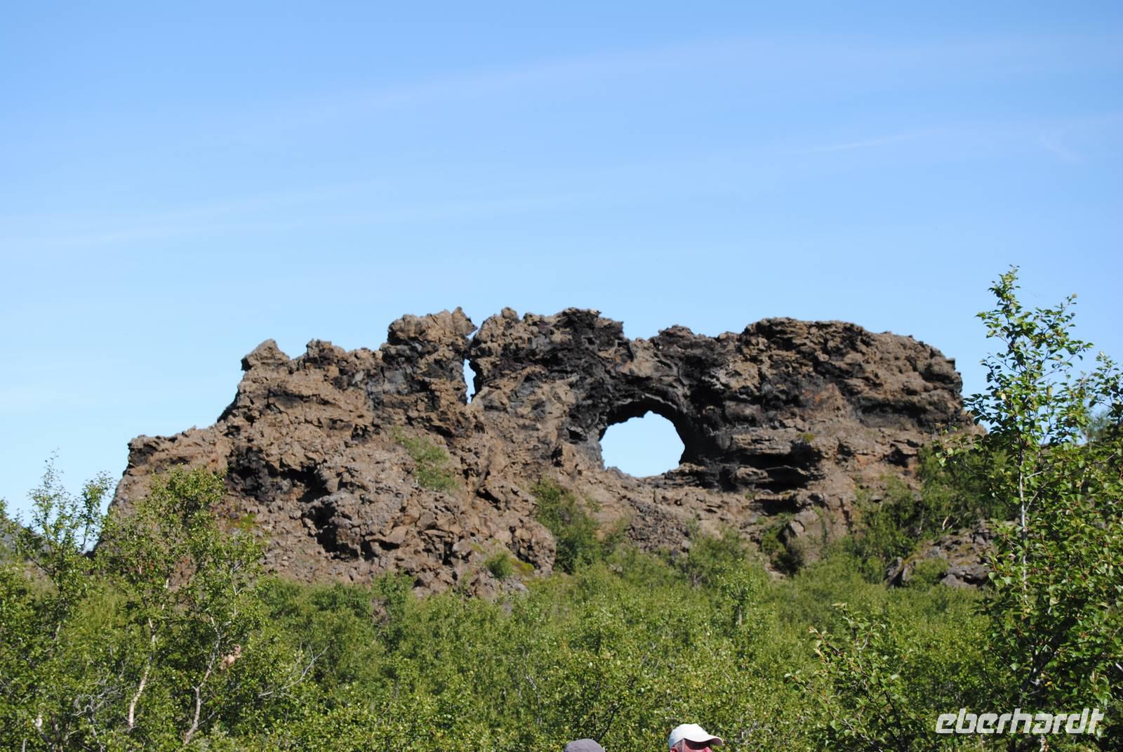 Akureyri war noch dicht in Nebel gehüllt, als wir die idyllische Stadt am Eyjafjördur (Inselfjord) am Morgen in Richtung Myvatn (Mückensee) verließen. Doch umso weiter wir höher in die Berge fuhren, umso mehr riss die Wolkendecke auf und uns boten herrliche Aussichten. Am Vormittag erreichten wir den Myvatn, den Mückensee und zugleich viertgrößten Binnensee Islands. Nach kurzem Fotostop setzten wir unsere Fahrt in das Vulkangebiet der Krafla fort. Und obwohl der Myvatn und das Vulkangebiet nur wenige Kilometer trennt, ist die Natur extrem unterschiedlich. Auf der einen Seite, das saftige Grün der Wiesen am Myvatn, auf der anderen Seite die endlose Weite des Vulkangesteins und der nimmermüden sprudelnden Quellen. Einfach beeindruckend. Am Mittag entspannten wir in der Badelagune Jardbödin zwischen Reykjahlio und Namaskaro und genossen die weite Sicht über den See Myvatn. Am frühen Nachmittag erreichten wir dann wieder den Myvatn und fuhren zum Lava-Labyrinth Dimmuborgir, einer bizarren Felslandschaft, in der wir eine kleine Wanderung unternahmen und neben den vielen versteinerten Trollen, auch eine Vielzahl an natürlichen, steinernen Pilzen entdeckten ;-) Auf der Rückfahrt nach Akureyri besuchten wir noch den Godafoss (Götterwasserfall), dessen Wasser wie das der meisten Wasserfälle auf Island durch Gletscherwasser gespeist wird. Am frühen Abend erreichten wir wieder unser Hotel in Akureyri, doch vorher legten wir gegenüber der Hafenstadt am Eyjafjördur noch einen Fotostop ein um die tolle Aussicht in den Fjord zu genießen. Nach dem Abendessen fuhr ich mit einigen Gästen hinunter an den Eyjafjördur um einen Reitausflug mit Islandpferden zu unternehmen. Nach kurzer Einweisung und der Helmausgabe führte uns anschließend die geführte Tour entlang des Eyjafjördur, ein tolles Erlebnis.