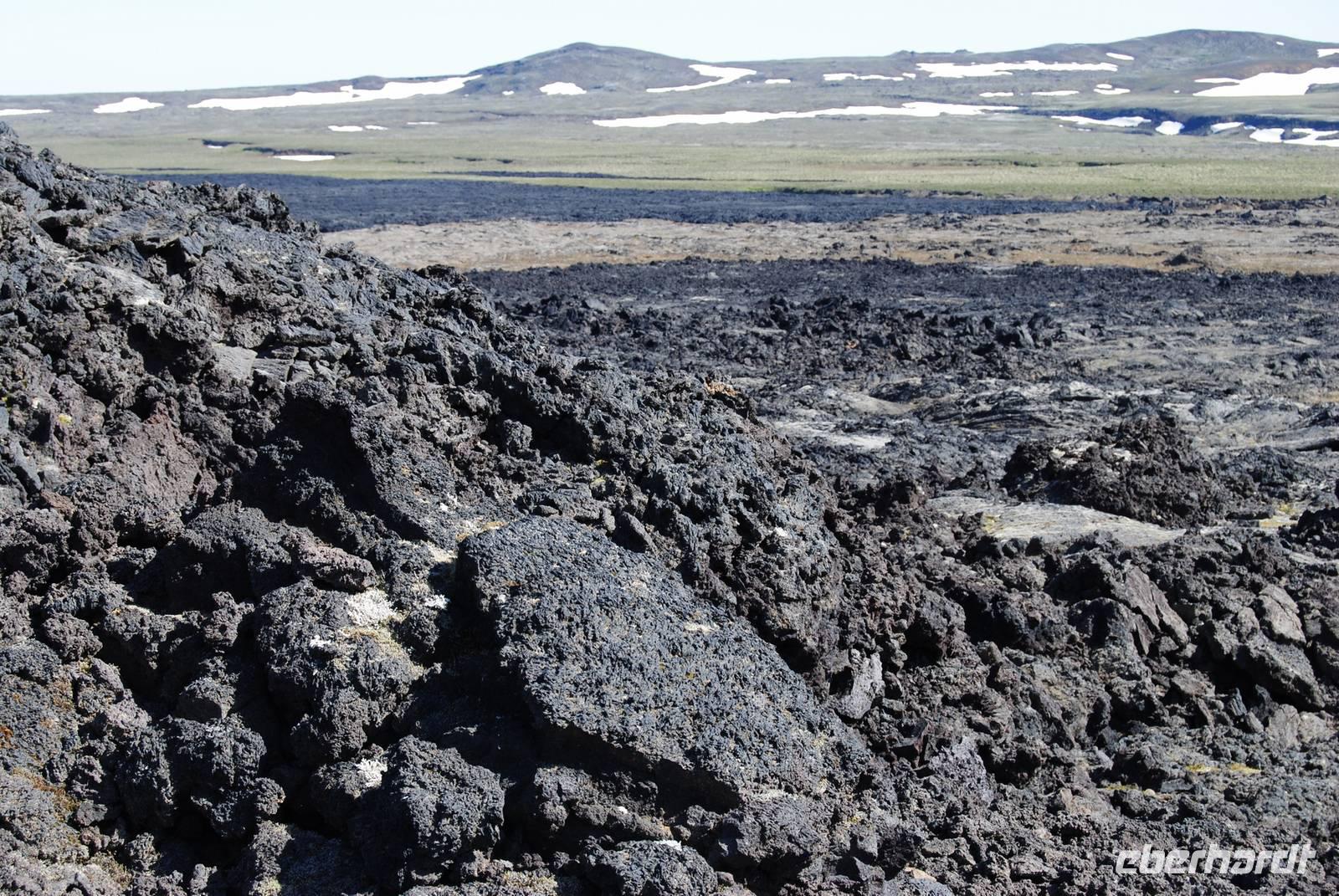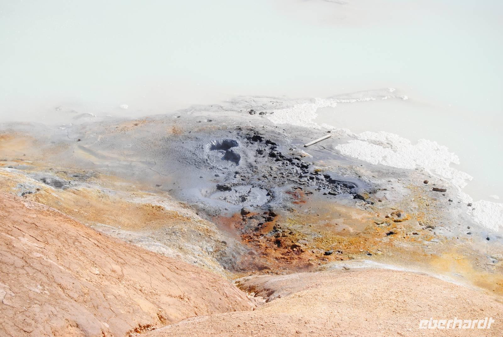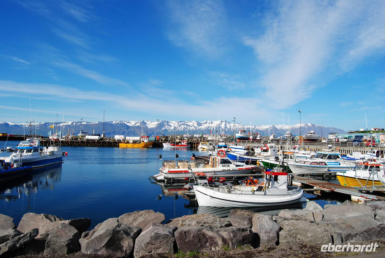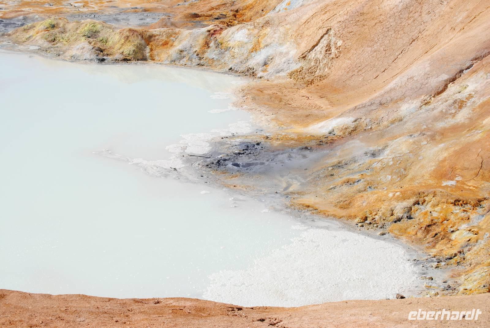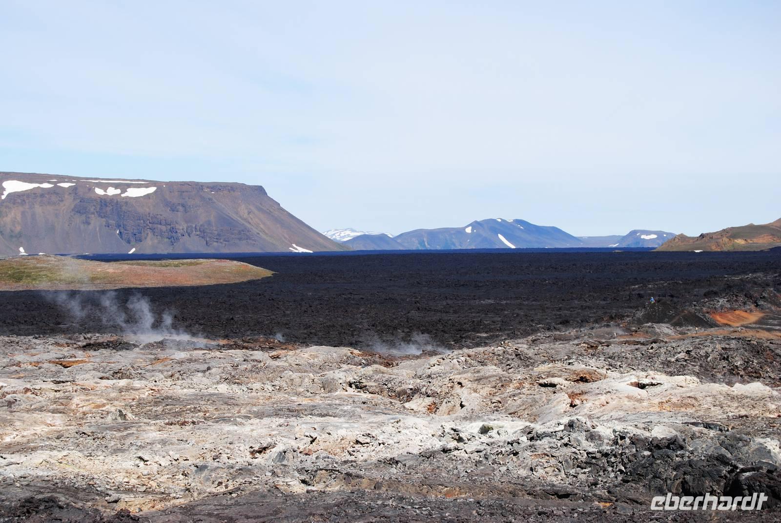 Akureyri war noch dicht in Nebel gehüllt, als wir die idyllische Stadt am Eyjafjördur (Inselfjord) am Morgen in Richtung Myvatn (Mückensee) verließen. Doch umso weiter wir höher in die Berge fuhren, umso mehr riss die Wolkendecke auf und uns boten herrliche Aussichten. Am Vormittag erreichten wir den Myvatn, den Mückensee und zugleich viertgrößten Binnensee Islands. Nach kurzem Fotostop setzten wir unsere Fahrt in das Vulkangebiet der Krafla fort. Und obwohl der Myvatn und das Vulkangebiet nur wenige Kilometer trennt, ist die Natur extrem unterschiedlich. Auf der einen Seite, das saftige Grün der Wiesen am Myvatn, auf der anderen Seite die endlose Weite des Vulkangesteins und der nimmermüden sprudelnden Quellen. Einfach beeindruckend. Am Mittag entspannten wir in der Badelagune Jardbödin zwischen Reykjahlio und Namaskaro und genossen die weite Sicht über den See Myvatn. Am frühen Nachmittag erreichten wir dann wieder den Myvatn und fuhren zum Lava-Labyrinth Dimmuborgir, einer bizarren Felslandschaft, in der wir eine kleine Wanderung unternahmen und neben den vielen versteinerten Trollen, auch eine Vielzahl an natürlichen, steinernen Pilzen entdeckten ;-) Auf der Rückfahrt nach Akureyri besuchten wir noch den Godafoss (Götterwasserfall), dessen Wasser wie das der meisten Wasserfälle auf Island durch Gletscherwasser gespeist wird. Am frühen Abend erreichten wir wieder unser Hotel in Akureyri, doch vorher legten wir gegenüber der Hafenstadt am Eyjafjördur noch einen Fotostop ein um die tolle Aussicht in den Fjord zu genießen. Nach dem Abendessen fuhr ich mit einigen Gästen hinunter an den Eyjafjördur um einen Reitausflug mit Islandpferden zu unternehmen. Nach kurzer Einweisung und der Helmausgabe führte uns anschließend die geführte Tour entlang des Eyjafjördur, ein tolles Erlebnis.