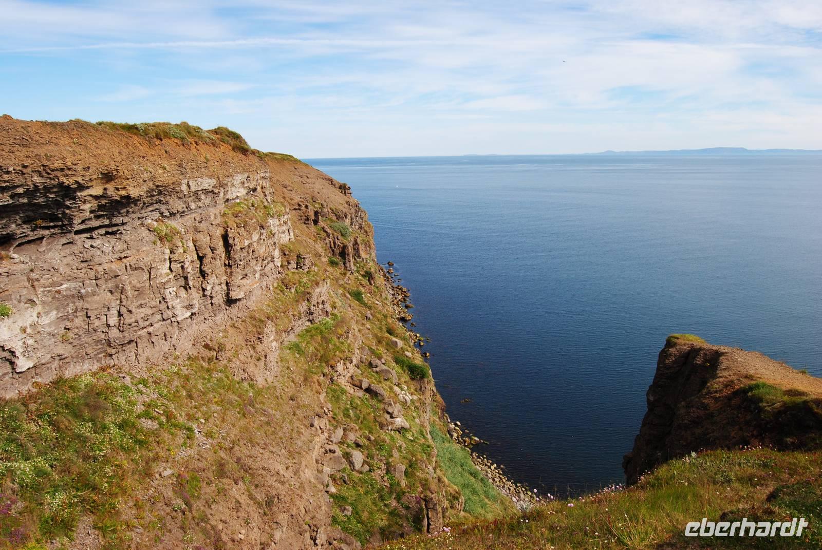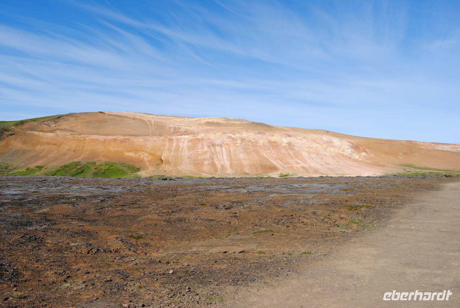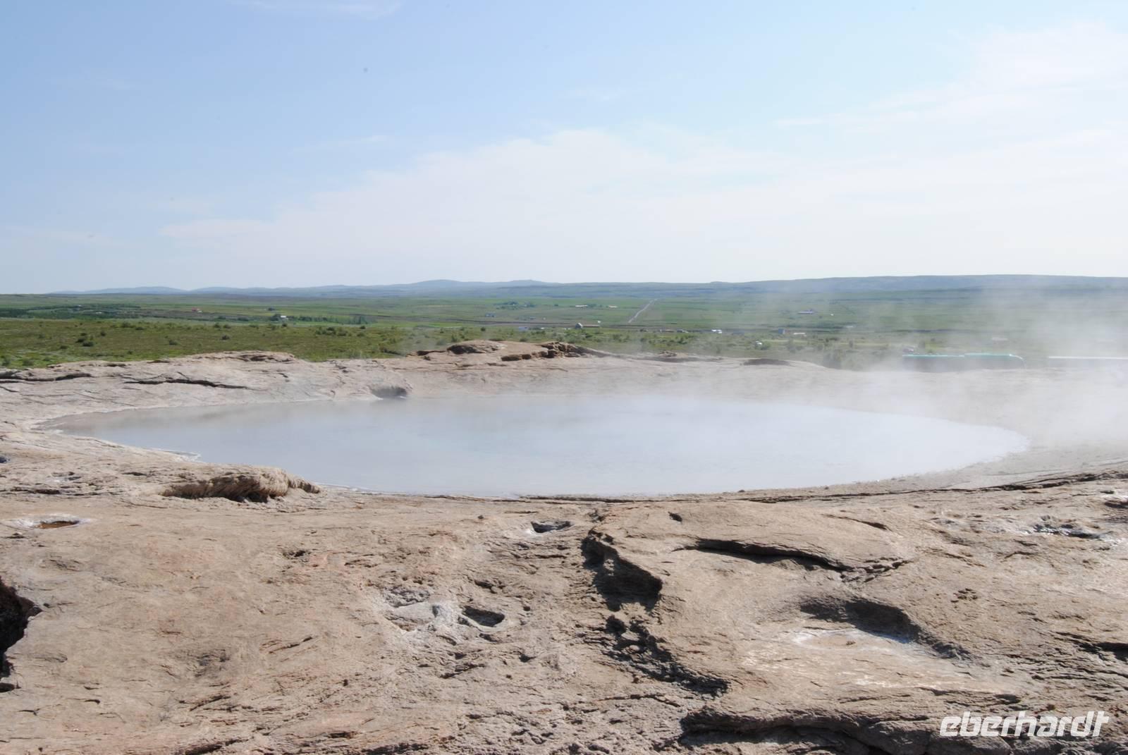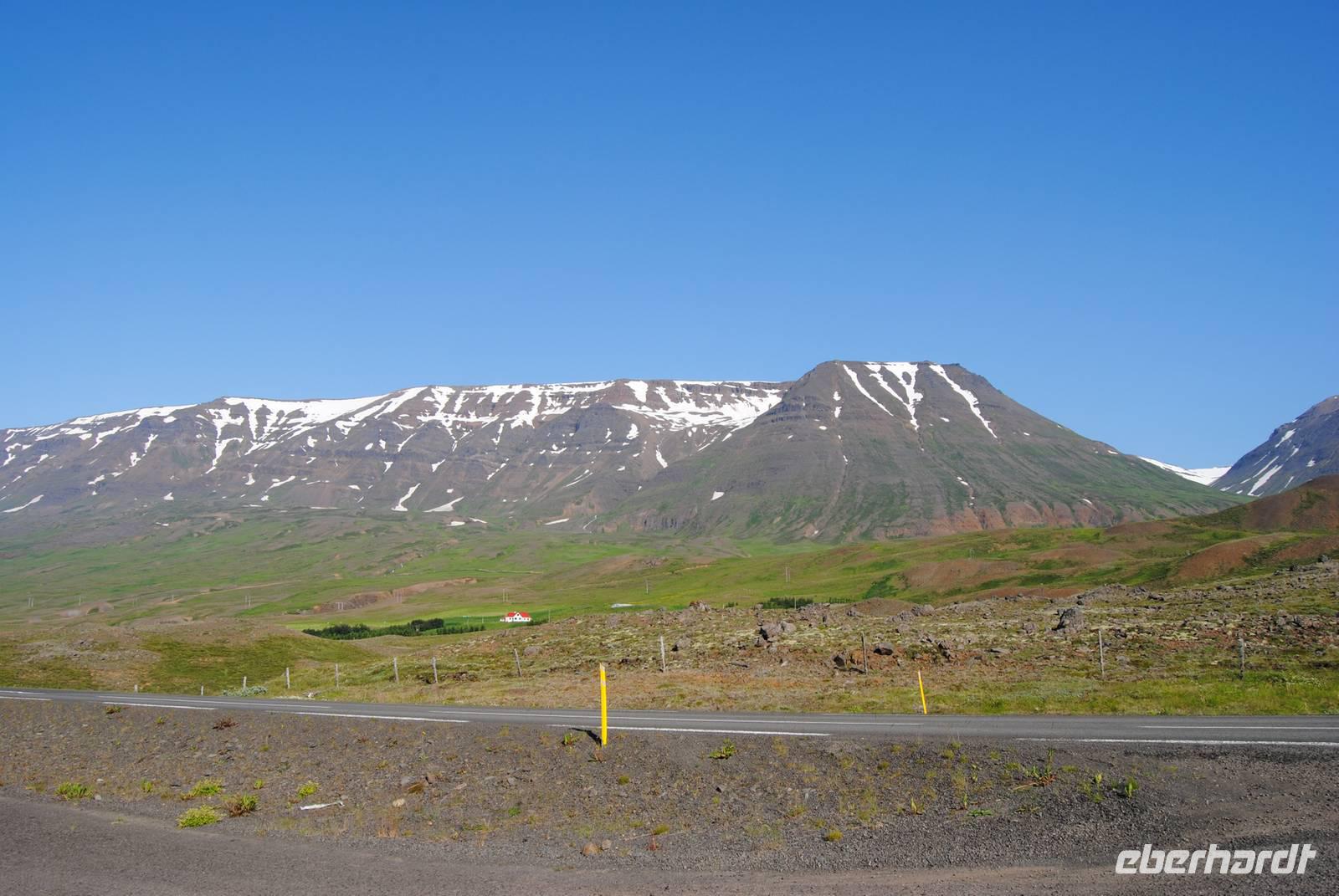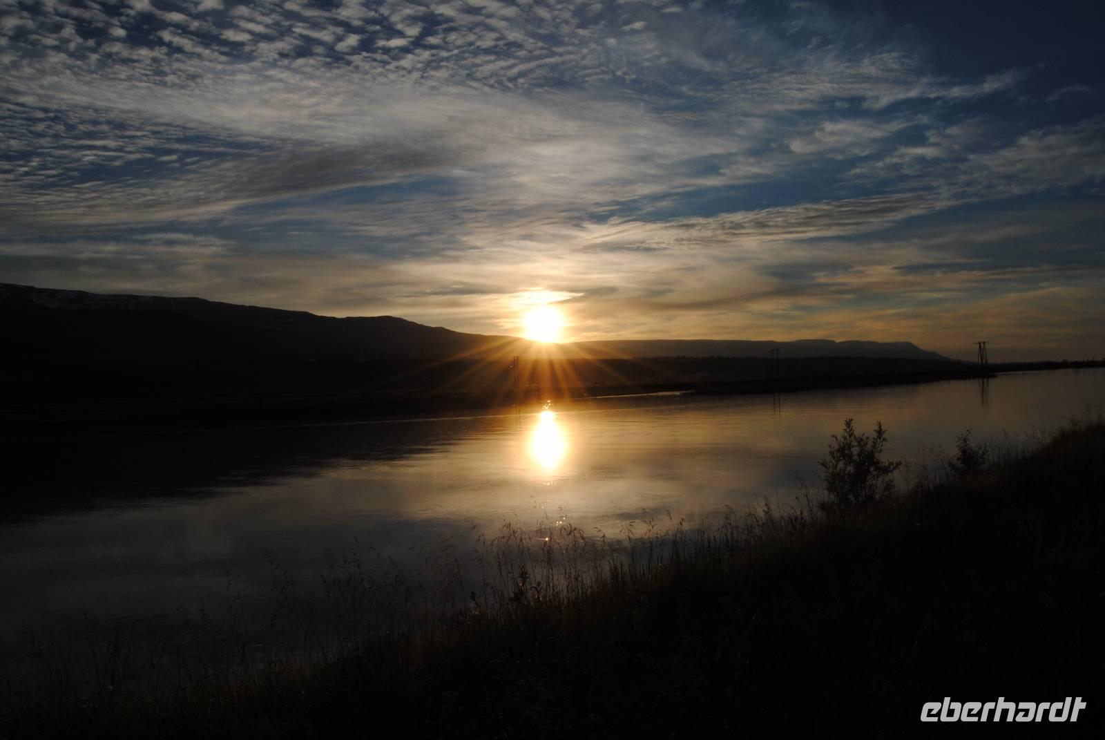 Akureyri war noch dicht in Nebel gehüllt, als wir die idyllische Stadt am Eyjafjördur (Inselfjord) am Morgen in Richtung Myvatn (Mückensee) verließen. Doch umso weiter wir höher in die Berge fuhren, umso mehr riss die Wolkendecke auf und uns boten herrliche Aussichten. Am Vormittag erreichten wir den Myvatn, den Mückensee und zugleich viertgrößten Binnensee Islands. Nach kurzem Fotostop setzten wir unsere Fahrt in das Vulkangebiet der Krafla fort. Und obwohl der Myvatn und das Vulkangebiet nur wenige Kilometer trennt, ist die Natur extrem unterschiedlich. Auf der einen Seite, das saftige Grün der Wiesen am Myvatn, auf der anderen Seite die endlose Weite des Vulkangesteins und der nimmermüden sprudelnden Quellen. Einfach beeindruckend. Am Mittag entspannten wir in der Badelagune Jardbödin zwischen Reykjahlio und Namaskaro und genossen die weite Sicht über den See Myvatn. Am frühen Nachmittag erreichten wir dann wieder den Myvatn und fuhren zum Lava-Labyrinth Dimmuborgir, einer bizarren Felslandschaft, in der wir eine kleine Wanderung unternahmen und neben den vielen versteinerten Trollen, auch eine Vielzahl an natürlichen, steinernen Pilzen entdeckten ;-) Auf der Rückfahrt nach Akureyri besuchten wir noch den Godafoss (Götterwasserfall), dessen Wasser wie das der meisten Wasserfälle auf Island durch Gletscherwasser gespeist wird. Am frühen Abend erreichten wir wieder unser Hotel in Akureyri, doch vorher legten wir gegenüber der Hafenstadt am Eyjafjördur noch einen Fotostop ein um die tolle Aussicht in den Fjord zu genießen. Nach dem Abendessen fuhr ich mit einigen Gästen hinunter an den Eyjafjördur um einen Reitausflug mit Islandpferden zu unternehmen. Nach kurzer Einweisung und der Helmausgabe führte uns anschließend die geführte Tour entlang des Eyjafjördur, ein tolles Erlebnis.
