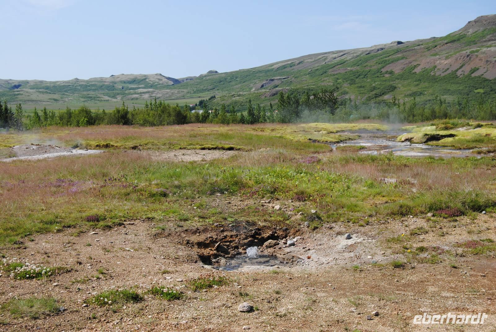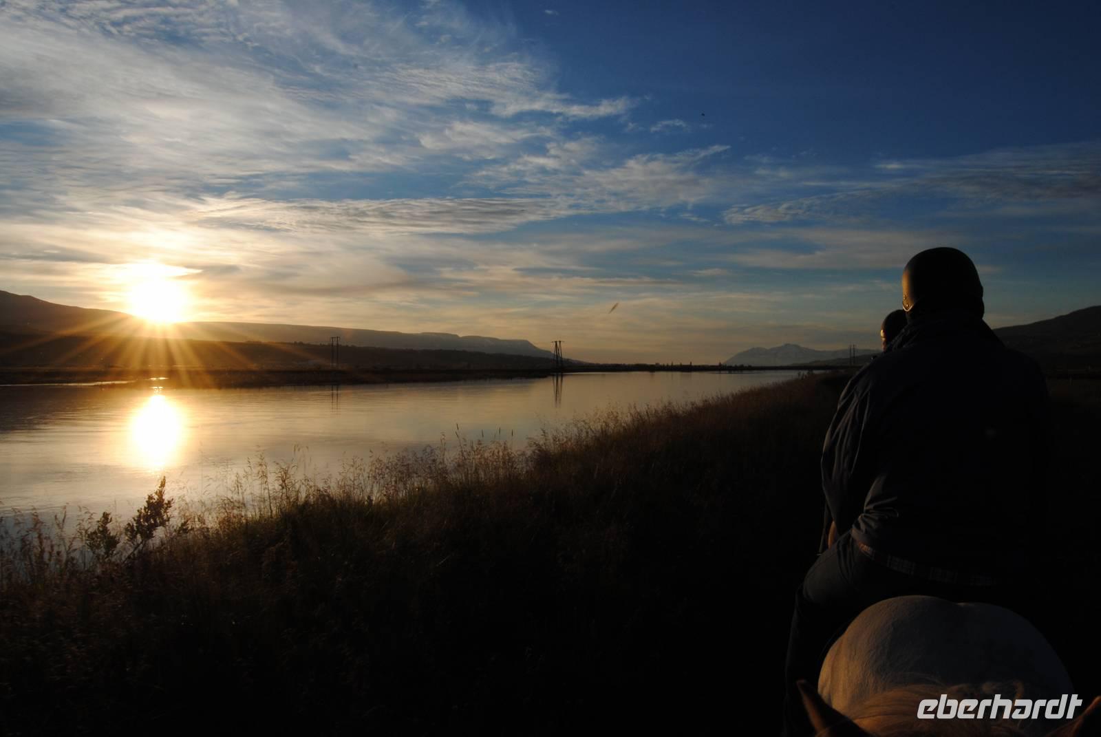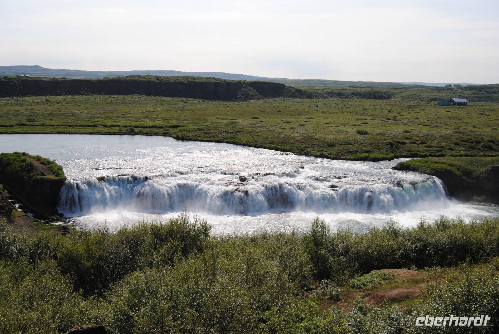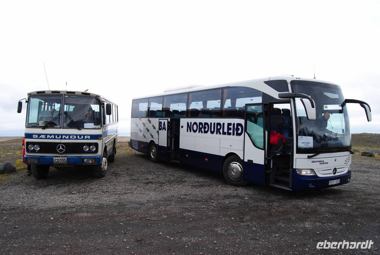 Akureyri war noch dicht in Nebel gehüllt, als wir die idyllische Stadt am Eyjafjördur (Inselfjord) am Morgen in Richtung Myvatn (Mückensee) verließen. Doch umso weiter wir höher in die Berge fuhren, umso mehr riss die Wolkendecke auf und uns boten herrliche Aussichten. Am Vormittag erreichten wir den Myvatn, den Mückensee und zugleich viertgrößten Binnensee Islands. Nach kurzem Fotostop setzten wir unsere Fahrt in das Vulkangebiet der Krafla fort. Und obwohl der Myvatn und das Vulkangebiet nur wenige Kilometer trennt, ist die Natur extrem unterschiedlich. Auf der einen Seite, das saftige Grün der Wiesen am Myvatn, auf der anderen Seite die endlose Weite des Vulkangesteins und der nimmermüden sprudelnden Quellen. Einfach beeindruckend. Am Mittag entspannten wir in der Badelagune Jardbödin zwischen Reykjahlio und Namaskaro und genossen die weite Sicht über den See Myvatn. Am frühen Nachmittag erreichten wir dann wieder den Myvatn und fuhren zum Lava-Labyrinth Dimmuborgir, einer bizarren Felslandschaft, in der wir eine kleine Wanderung unternahmen und neben den vielen versteinerten Trollen, auch eine Vielzahl an natürlichen, steinernen Pilzen entdeckten ;-) Auf der Rückfahrt nach Akureyri besuchten wir noch den Godafoss (Götterwasserfall), dessen Wasser wie das der meisten Wasserfälle auf Island durch Gletscherwasser gespeist wird. Am frühen Abend erreichten wir wieder unser Hotel in Akureyri, doch vorher legten wir gegenüber der Hafenstadt am Eyjafjördur noch einen Fotostop ein um die tolle Aussicht in den Fjord zu genießen. Nach dem Abendessen fuhr ich mit einigen Gästen hinunter an den Eyjafjördur um einen Reitausflug mit Islandpferden zu unternehmen. Nach kurzer Einweisung und der Helmausgabe führte uns anschließend die geführte Tour entlang des Eyjafjördur, ein tolles Erlebnis.