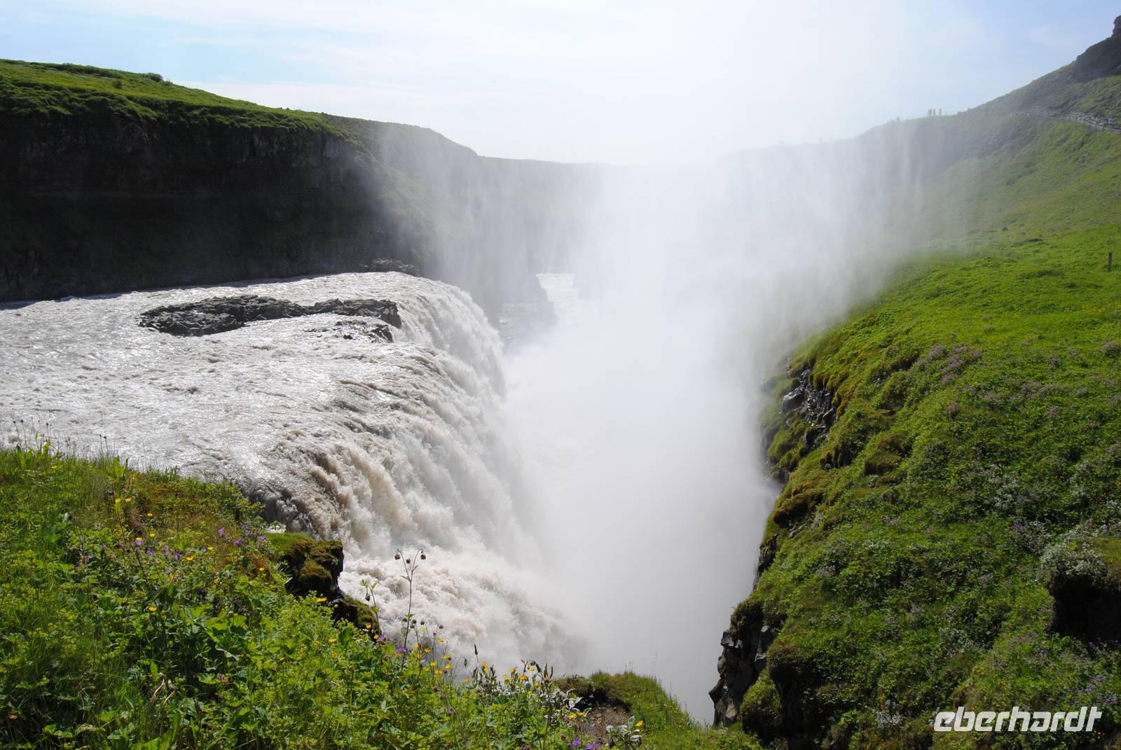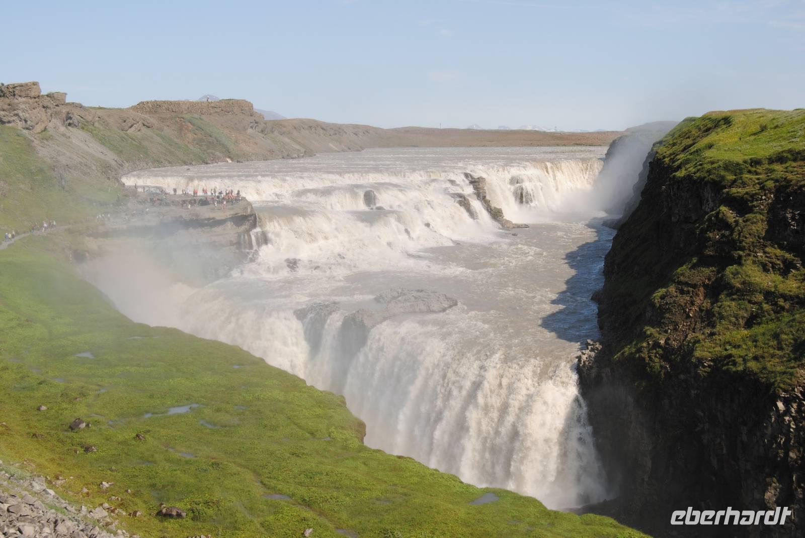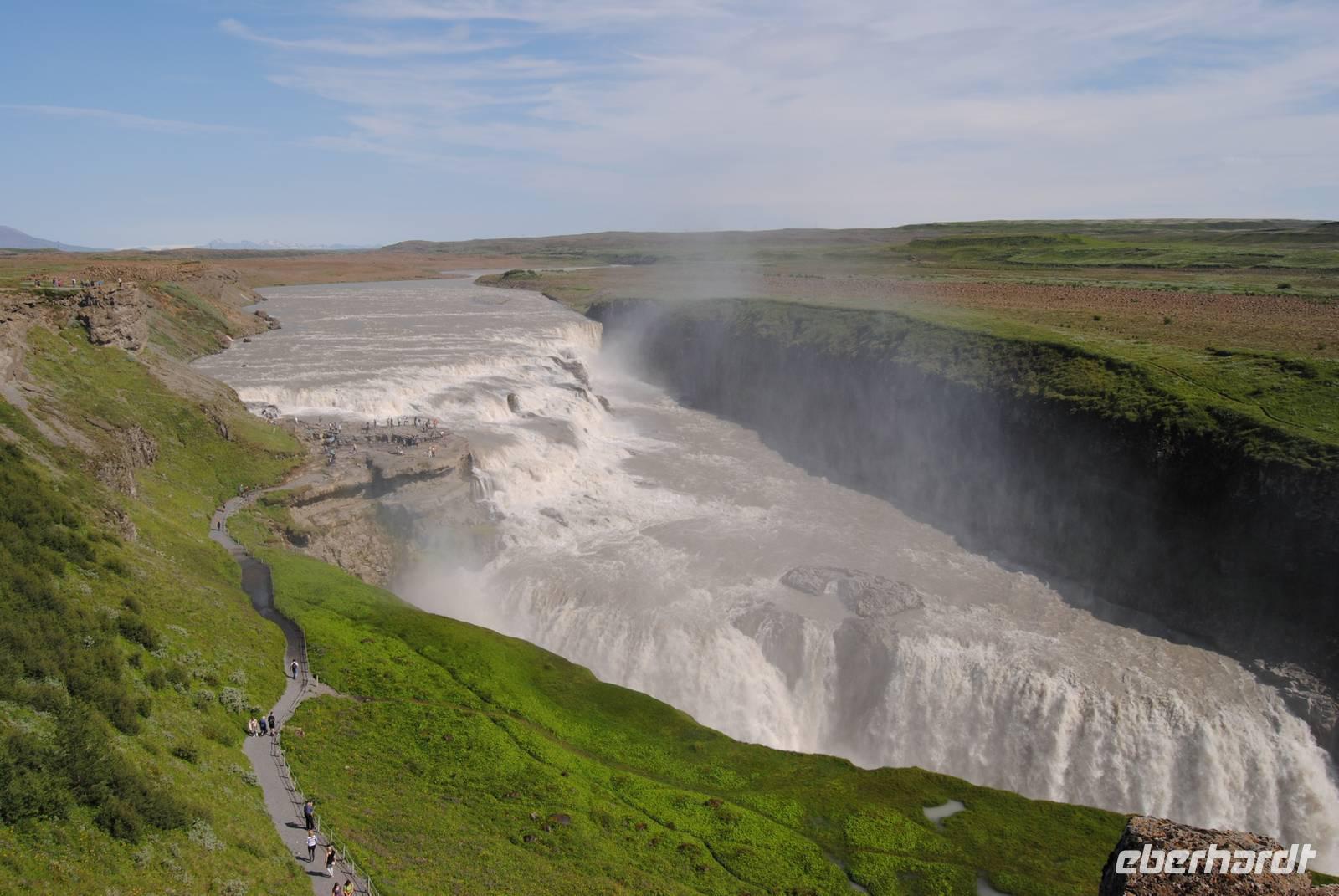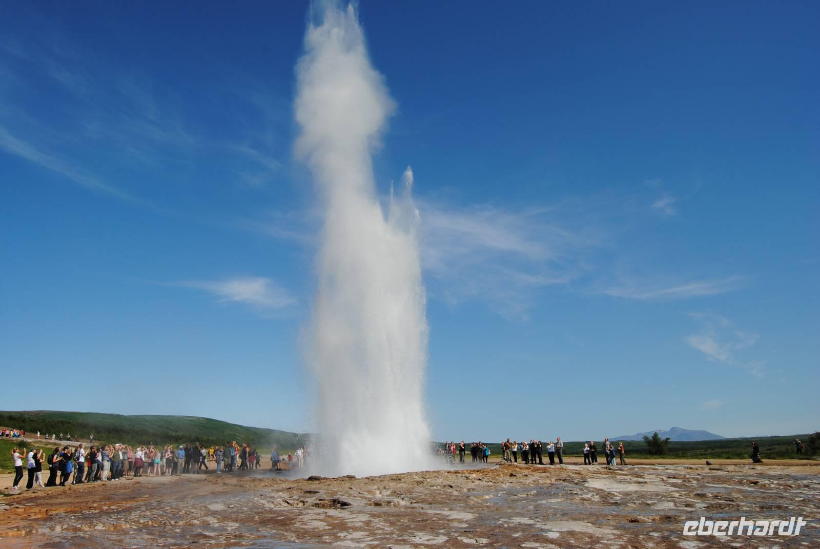 Am Morgen fuhren wir zunächst in die Gartenstadt Hveragerði und besuchten dort im Ortszentrum die kleine Ausstellung zu den hier häufig auftretenden Erdbeben. Die weitere Fahrt führte uns über den Wasserfall Faxi an den Geysir Strokkur, der aller 5-8 Minuten eine 40-50 Meter hohe Wasserfontäne in die Höhe schießen lässt, ein tolles Erlebnis. Nach dem Mittag fuhren wir weiter zum Gullfoss (goldener Wasserfall) und spazierten bis an die Kante des Wasserfalls. Am Nachmittag erreichten wir Thingvellir, die Ebene der Volksversammlung. Hier verließen wir den Bus und spazierten zwischen der euroasiatischen- und der amerikanischen Platte zum Platz der Volksversammlung. Am Abend unterahmen wir noch eine kleine Stadtrundfahrt und besuchten das höchste Gebäude Reykjaviks, die Hallgrimmskirche.