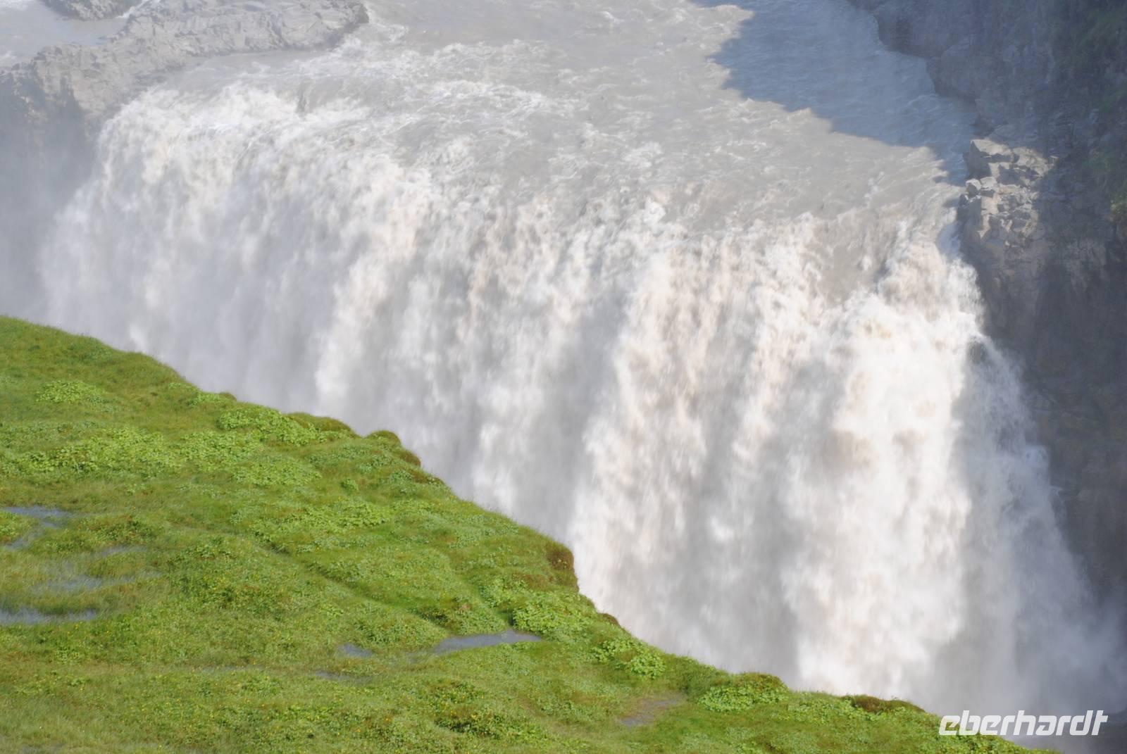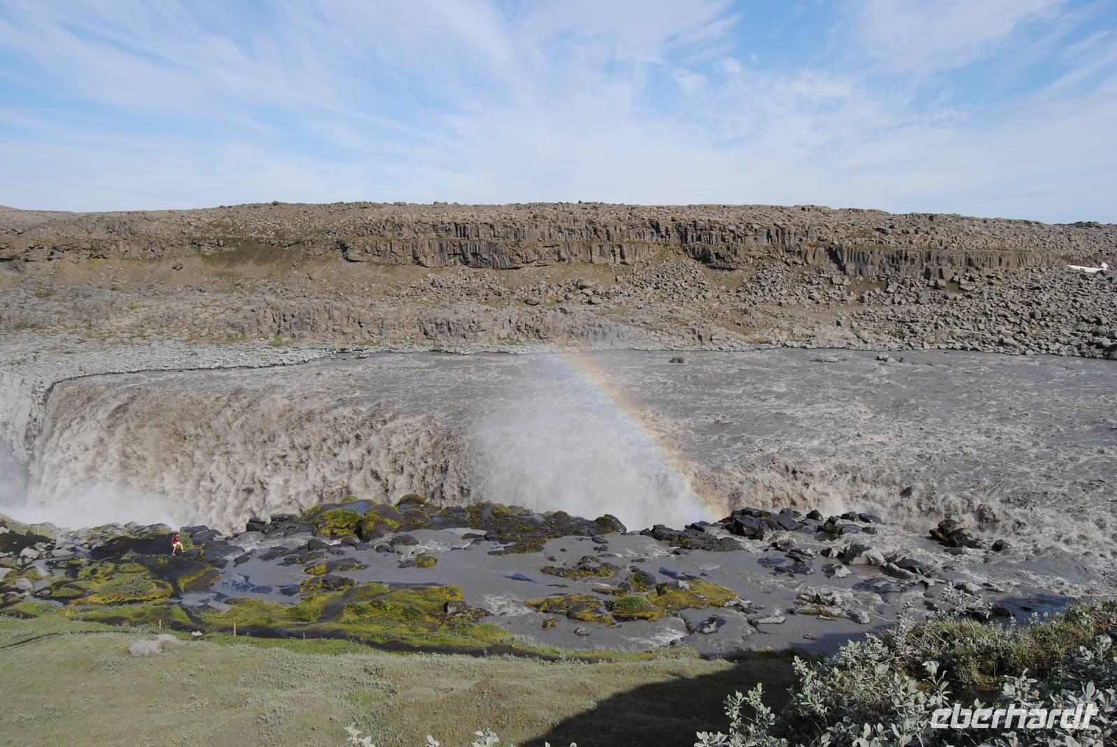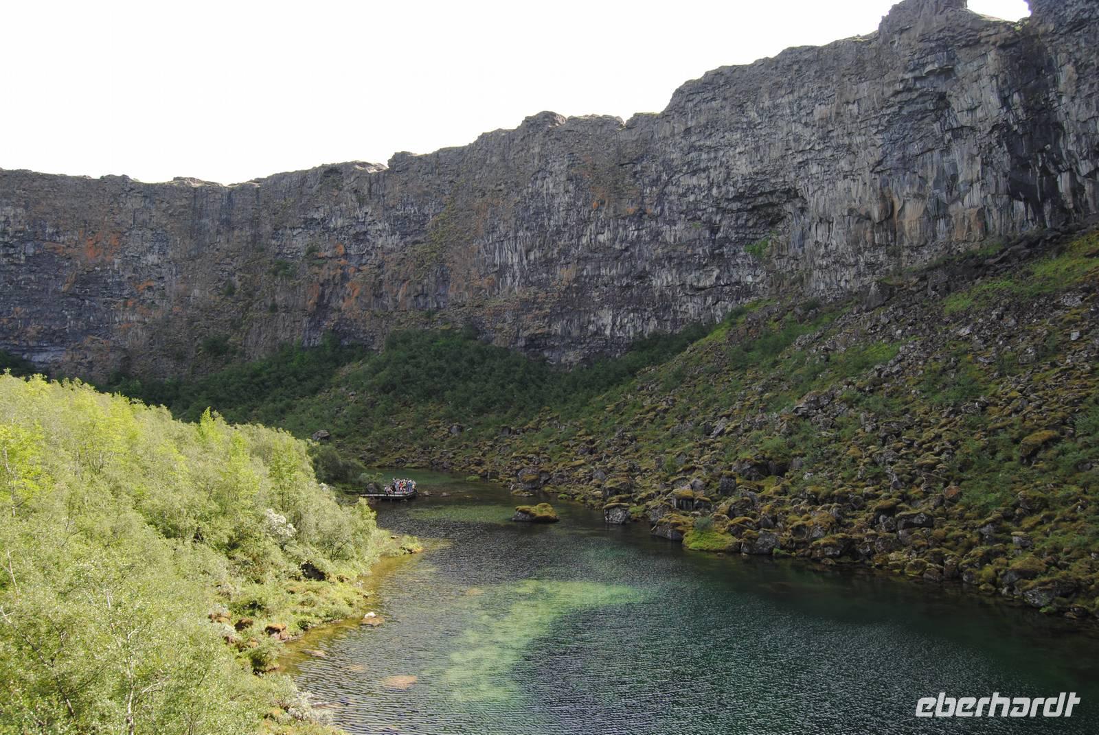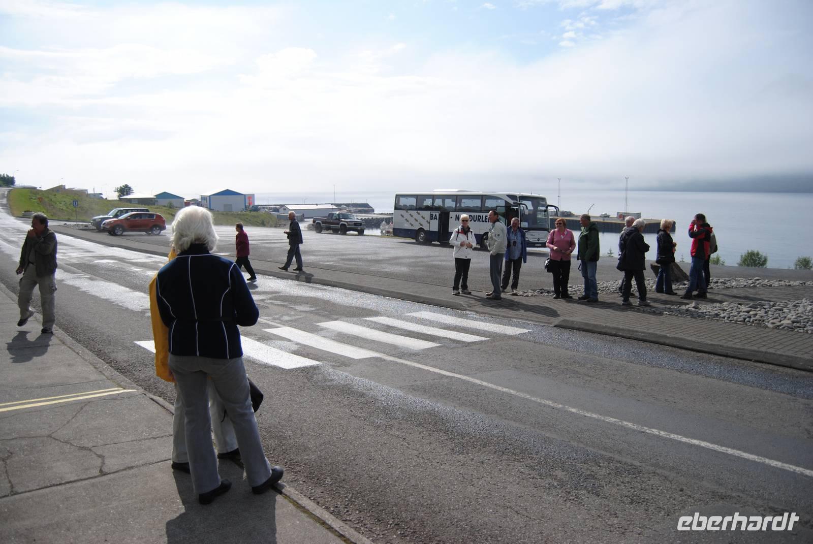 Da wir am heutigen Tag unterwegs ein Picknick machen wollten, führte uns am Morgen der Weg zunächst in den Einkaufmarkt nach Akureyri, denn es stand außerdem eine größere Fahrtstrecke vor uns. Mit frischem Proviant im Gepäck, fuhren wir zunächst nach Husavik, einer idyllischen Fischereistadt in der Skjalfandibucht. Der weitere Weg führte uns entlang der Küstenstraße zur Schlucht Asbyrgi (ausgesprochen: Ausbirgi). Die Schlucht ist ca. 3,5 km lang, einen Kilometer breit und hat eine Tiefe von ca. 100 m. Nach einem Spaziergang durch die beeindruckende Schlucht, machten wir anschließend Picknick auf der „grünen Wiese" inmitten der Schlucht und genossen die Mittagssonne. Nach einer längeren Fahrtstrecke erreichten wir anschließend am Nachmittag den Dettifoss (stürzender Wasserfall), der seinem Namen aller Ehre macht. Gewaltig wirkt es, wenn von der 100 m breiten Steinkante, das Wasser in die Tiefe stürzt. Am Abend erreichten wir dann unser Edda-Hotel in Egilsstadir, wo wir eine Nacht verweilten.