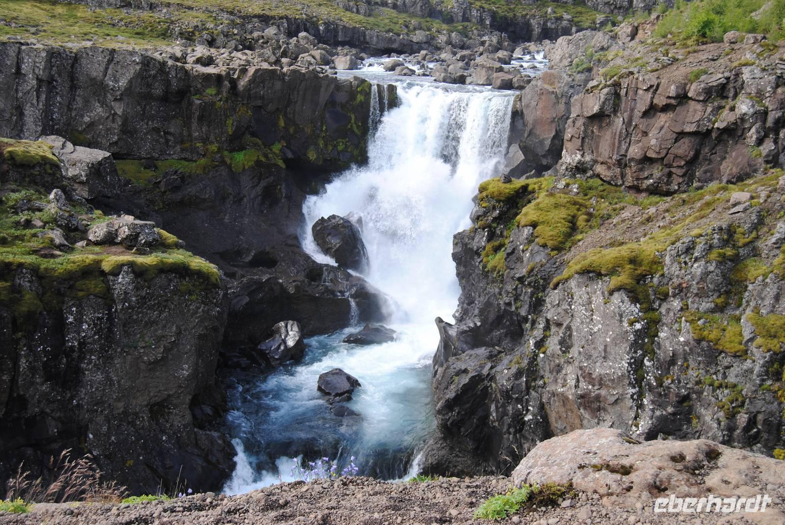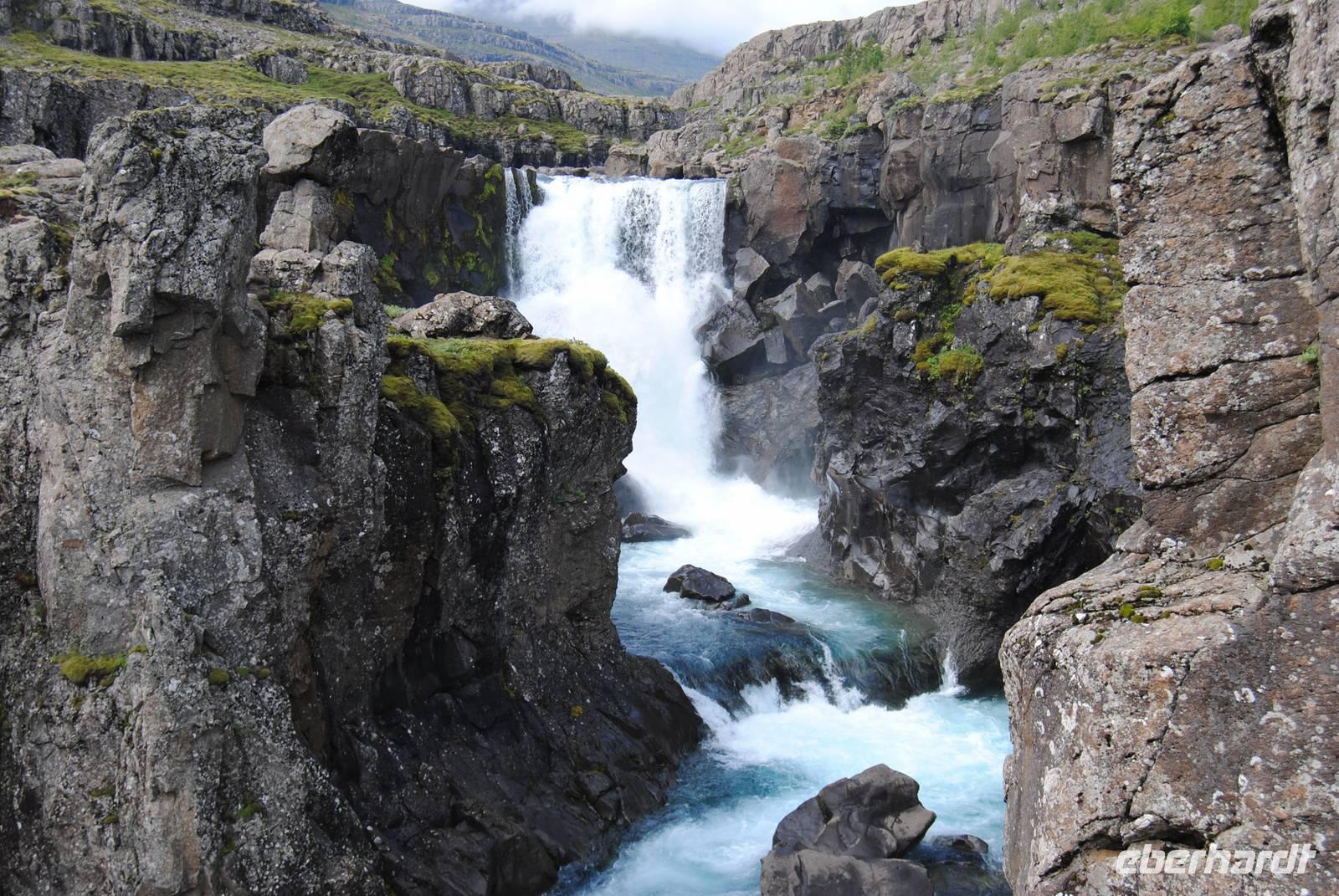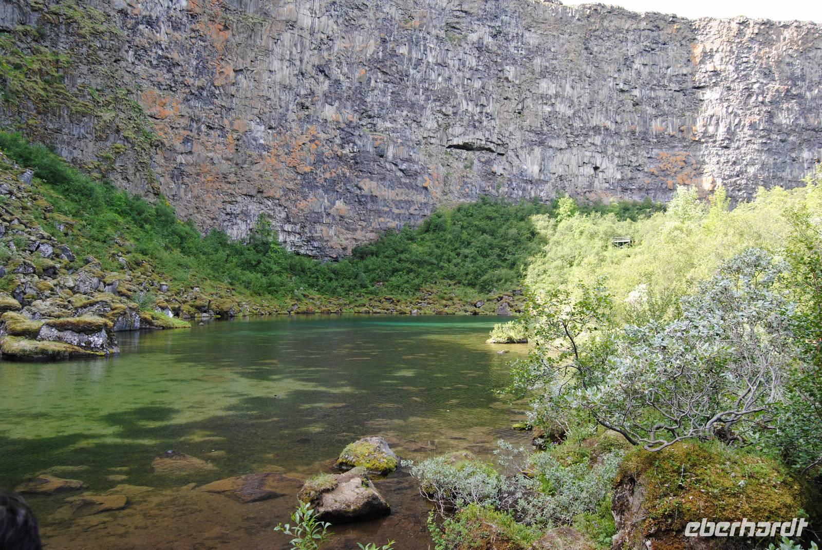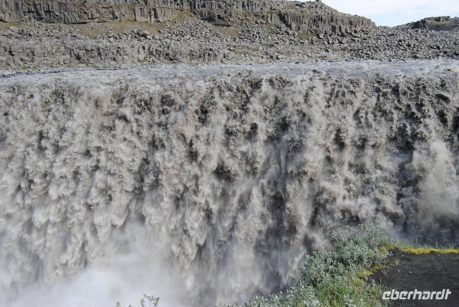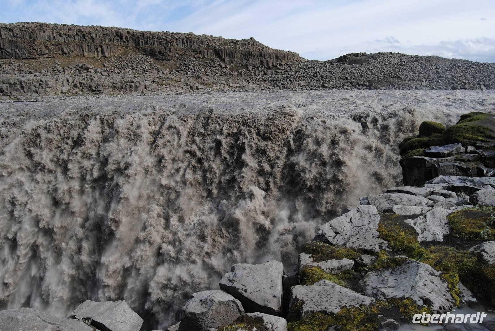 Da wir am heutigen Tag unterwegs ein Picknick machen wollten, führte uns am Morgen der Weg zunächst in den Einkaufmarkt nach Akureyri, denn es stand außerdem eine größere Fahrtstrecke vor uns. Mit frischem Proviant im Gepäck, fuhren wir zunächst nach Husavik, einer idyllischen Fischereistadt in der Skjalfandibucht. Der weitere Weg führte uns entlang der Küstenstraße zur Schlucht Asbyrgi (ausgesprochen: Ausbirgi). Die Schlucht ist ca. 3,5 km lang, einen Kilometer breit und hat eine Tiefe von ca. 100 m. Nach einem Spaziergang durch die beeindruckende Schlucht, machten wir anschließend Picknick auf der „grünen Wiese" inmitten der Schlucht und genossen die Mittagssonne. Nach einer längeren Fahrtstrecke erreichten wir anschließend am Nachmittag den Dettifoss (stürzender Wasserfall), der seinem Namen aller Ehre macht. Gewaltig wirkt es, wenn von der 100 m breiten Steinkante, das Wasser in die Tiefe stürzt. Am Abend erreichten wir dann unser Edda-Hotel in Egilsstadir, wo wir eine Nacht verweilten.