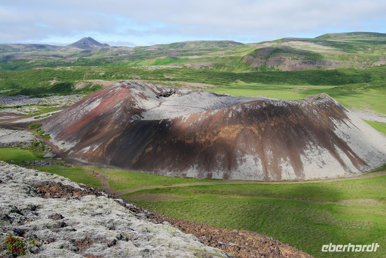 Im Morgengrauen verließen wir die nördlichste Hauptstadt Europas und machten uns auf den Weg in Richtung Akureyri, unserem heutigen Tagesziel. Unsere Fahrt führte uns zunächst durch den ca. 6 km langen Walfjordtunnel entlang der Westküste. Am Vormittag erreichten wir das Versorgungszentrum Borganes, wo wir noch einen kurzen Stop einlegten, bevor wir den Krater Grabok erreichten. Bei schönstem Wetter spazierten hinauf zum Krater Grabok, dessen Aufstieg durch eine tolle Sicht in die Umgebung belohnt wird. Unsere weitere Fahrt führte uns anschließend nach Stadarskali, wo wir zu Mittag aßen und weiter entlang des Hrutafjördur (Widderfjord) bis zum Skagafjördur. Hier erwartete uns in Fluguyri bereits Anna auf Ihrem Bauernhof. Anna und Ihre Familie züchten hier Islandpferde und bilden diese aus. Zunächst erläuterte Sie uns allgemeine Sachen zu den Pferden, bevor Im Anschluss Ihre Kinder mit den Islandpferden die besonderen Gangarten der Pferde demonstrierten. Am späten Nachmittag erreichten wir dann das Edda-Hotel in Akrureyri, unserem Hotel für die kommenden zwei Nächte.