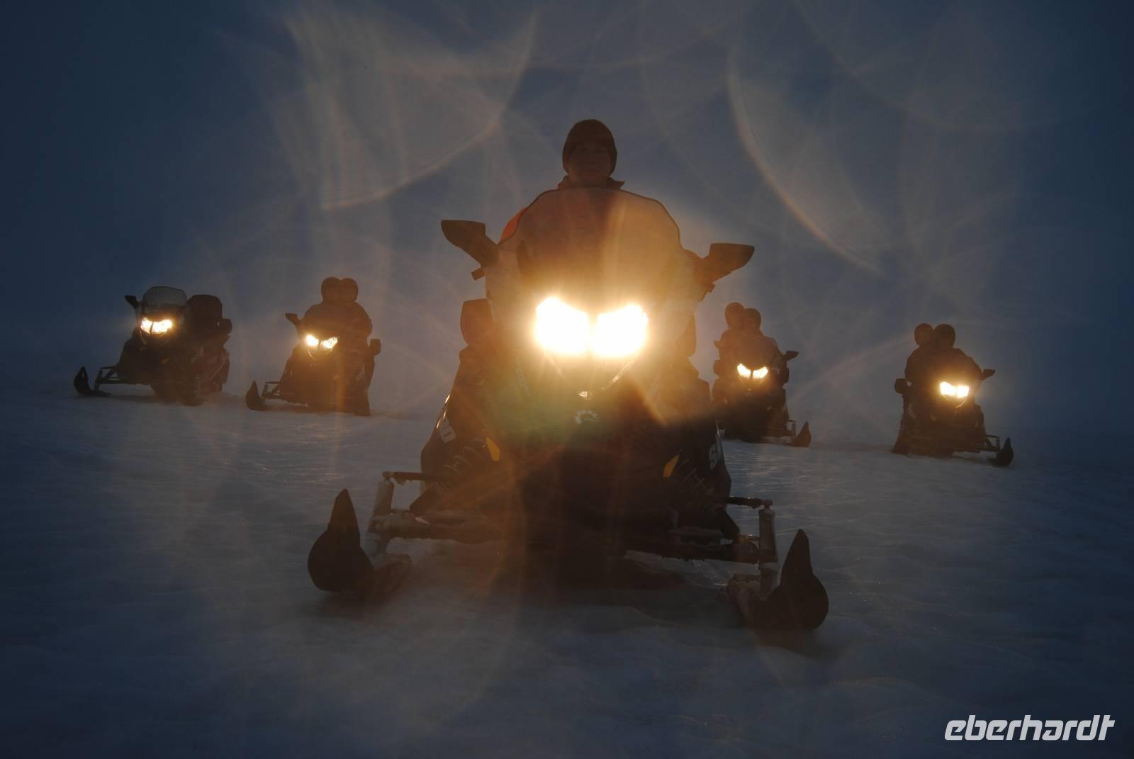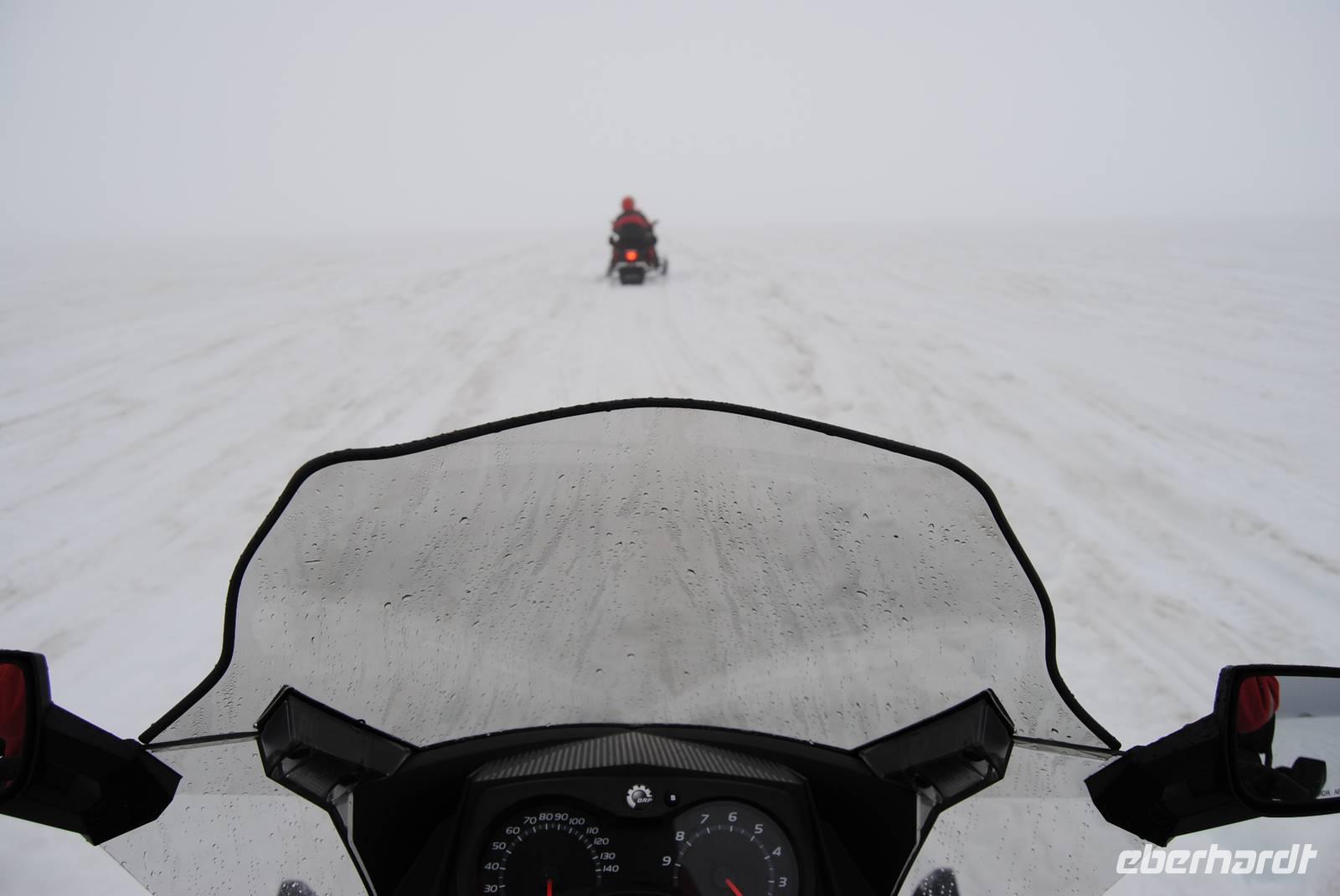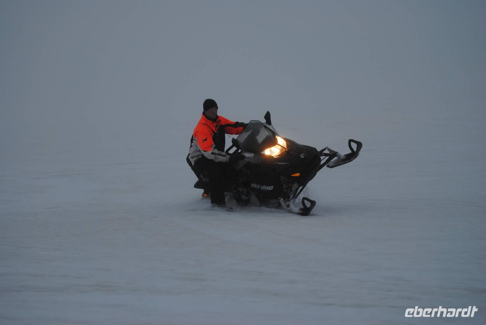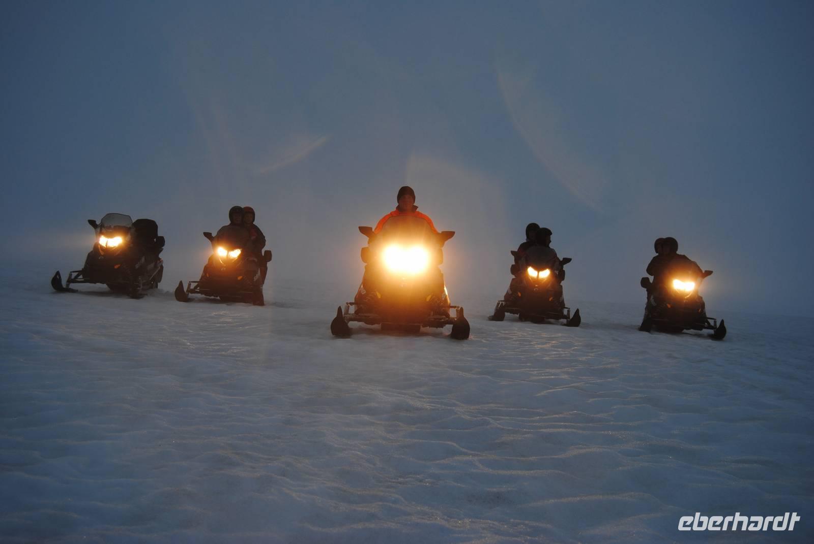 Am Abend bestand die Möglichkeit, den größten Gletscher Europas, den Vatnajökull mit dem Jeep bzw. Schneemobil zu entdecken. Zunächst fuhren wir mit zwei Jeeps ca. 40 Minuten bis an die Berghütte unterhalb des Vatnajökullgipfels und sahen während der Anfahrt bereits die mächtigen Eisfelder des Gletschers. Alleine die Auffahrt mit den Jeeps war schon ein Erlebnis wert, doch wir wollten ja noch auf die Schneemobile umsteigen. Mit Helm, Handschuhen, Stiefeln und Wärmeanzug ausgerüstet, starteten wir dann unsere Tour nach einer kurzen Einweisung an den Schneemobilen. Das Wetter war an diesem Abend sehr nebelig, doch die beeindruckende, unendliche Weite der Schneefelder und der Spaß beim Fahren mit den Schneemobilen entschädigten dafür.