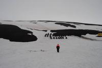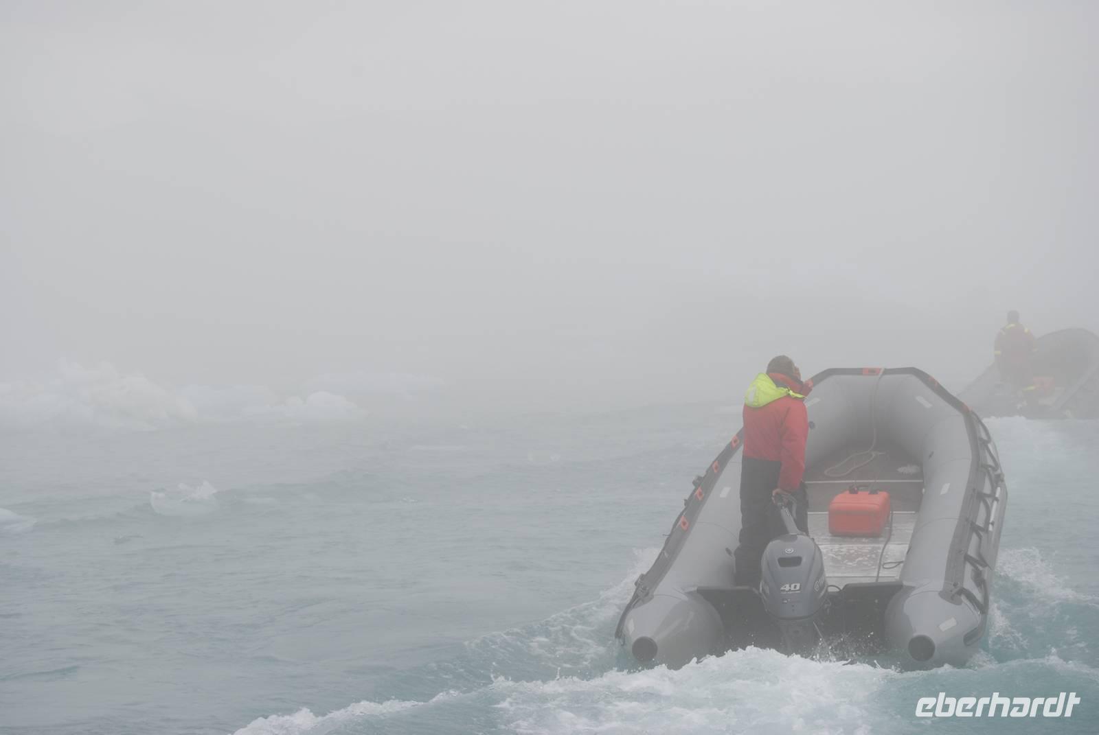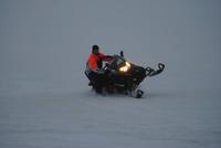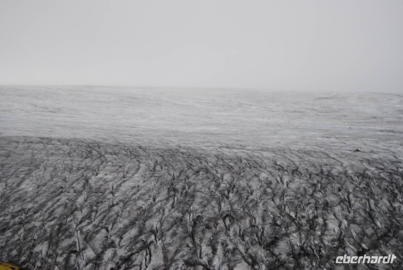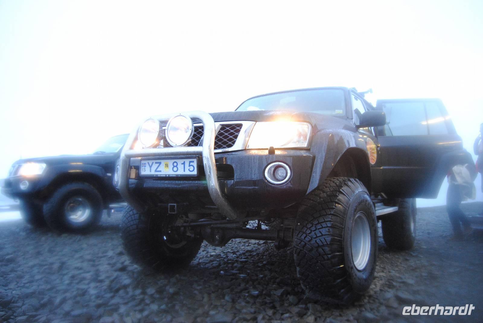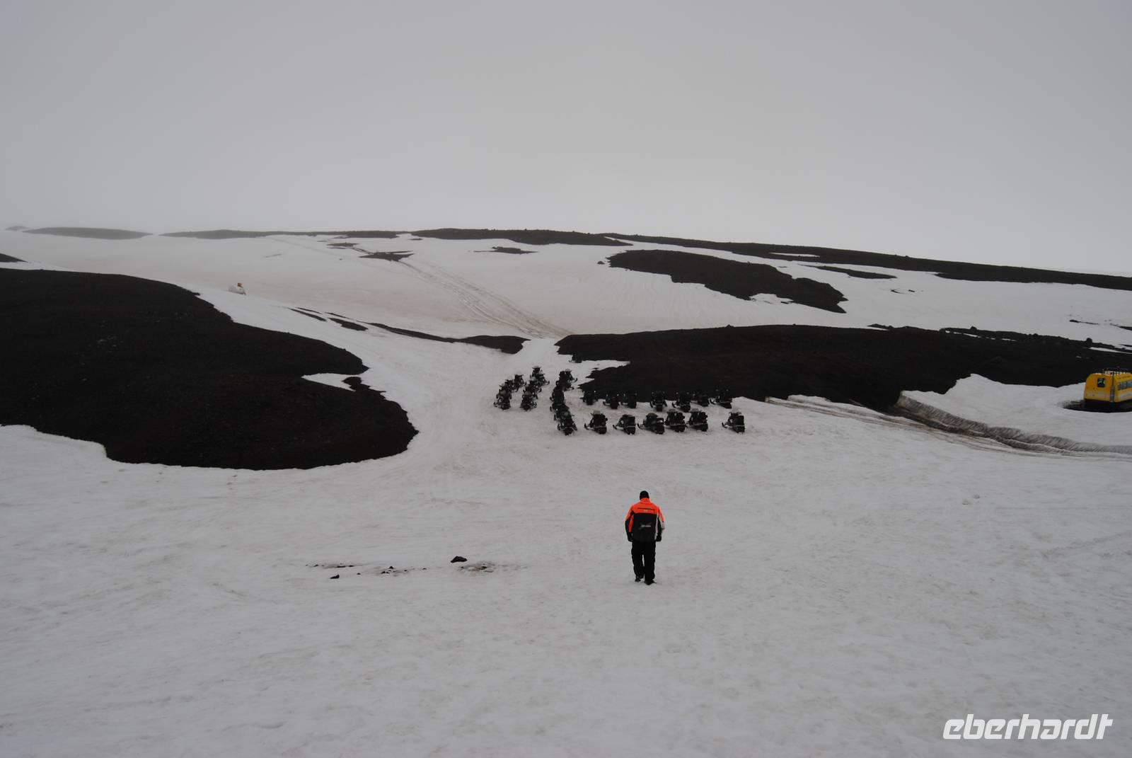 Am Abend bestand die Möglichkeit, den größten Gletscher Europas, den Vatnajökull mit dem Jeep bzw. Schneemobil zu entdecken. Zunächst fuhren wir mit zwei Jeeps ca. 40 Minuten bis an die Berghütte unterhalb des Vatnajökullgipfels und sahen während der Anfahrt bereits die mächtigen Eisfelder des Gletschers. Alleine die Auffahrt mit den Jeeps war schon ein Erlebnis wert, doch wir wollten ja noch auf die Schneemobile umsteigen. Mit Helm, Handschuhen, Stiefeln und Wärmeanzug ausgerüstet, starteten wir dann unsere Tour nach einer kurzen Einweisung an den Schneemobilen. Das Wetter war an diesem Abend sehr nebelig, doch die beeindruckende, unendliche Weite der Schneefelder und der Spaß beim Fahren mit den Schneemobilen entschädigten dafür.