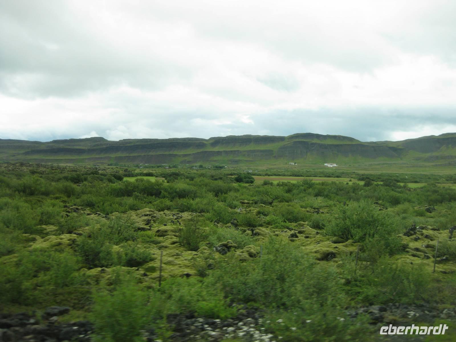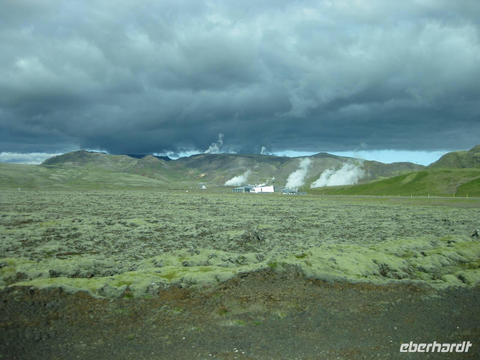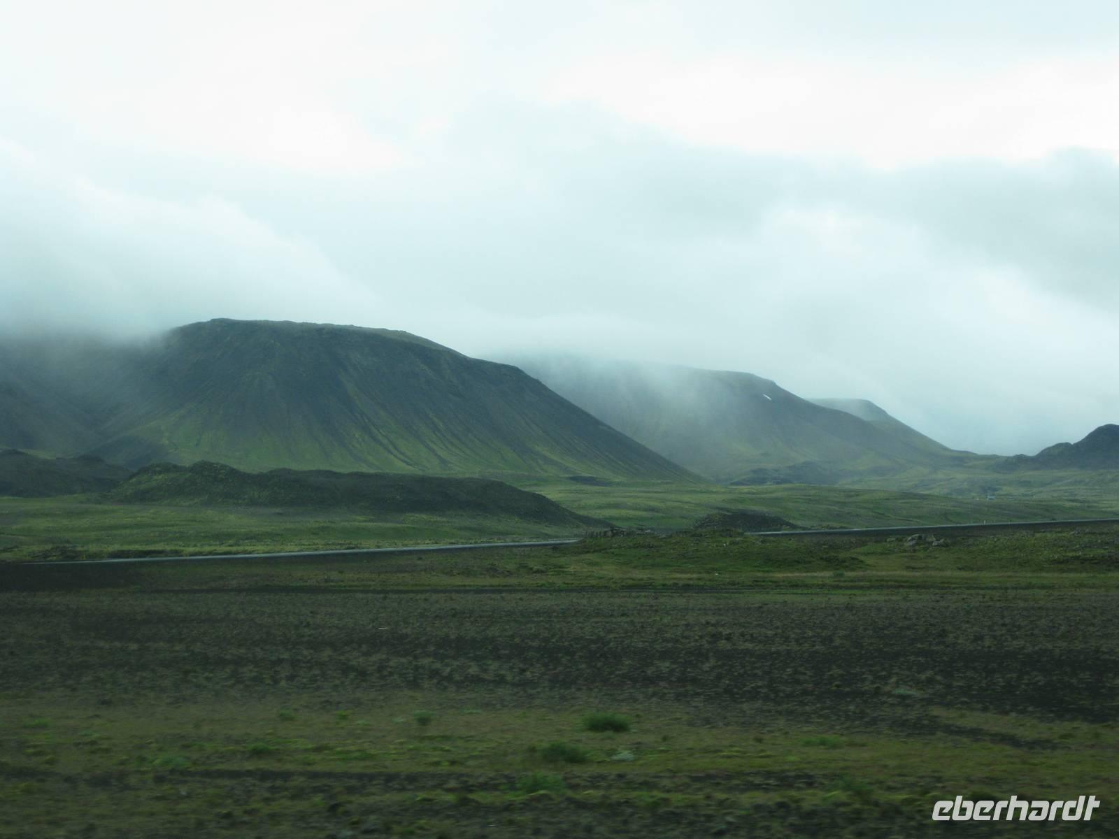 Am Morgen nach dem Frühstück tauschen wir unsere Euro in Isländische Kronen auf der Bank und dann starten wir zu unserer Fahrt auf dem „Goldenen Kreis". Wir verlassen Reykjavik in nördlicher Richtung, biegen dann aber bald in Richtung Süden ab. Sobald wir Reykjavik verlassen haben, erleben wir die für Island typische Landschaft. Überall sind die Spuren der vulkanischen Tätigkeit der Erde zu sehen.