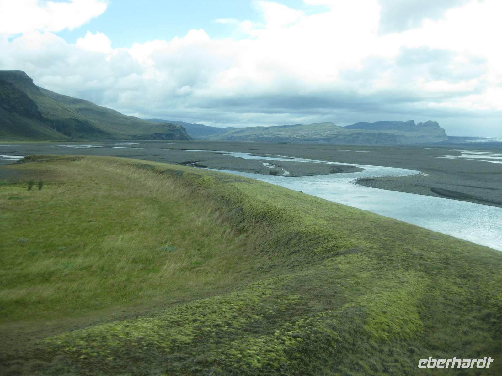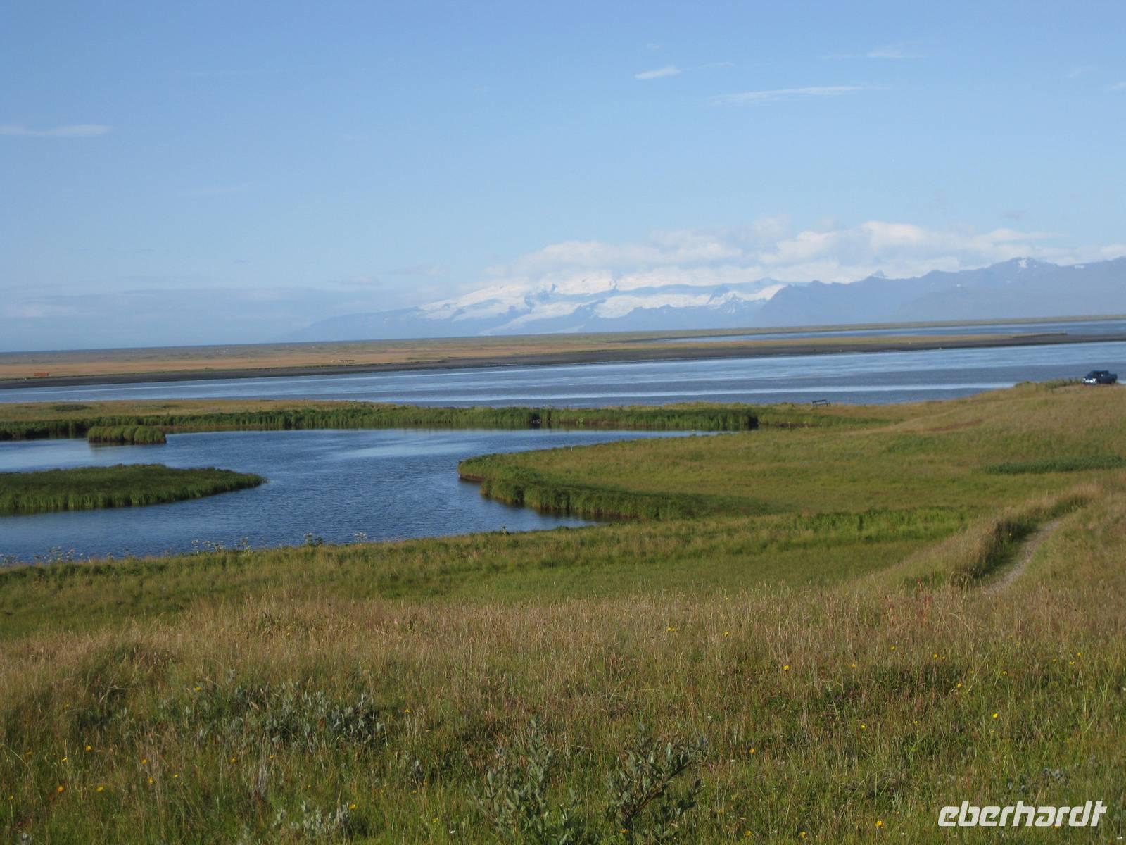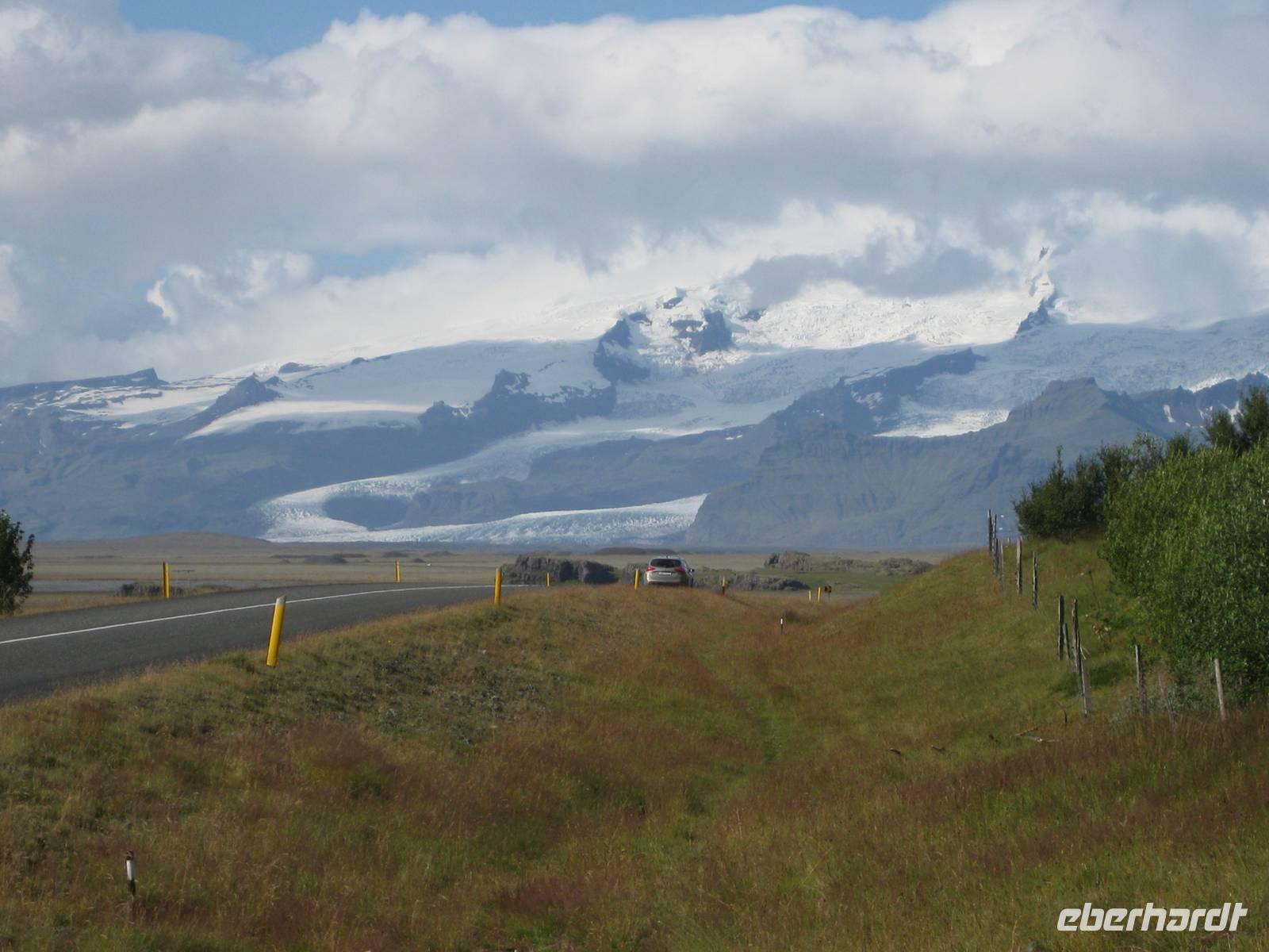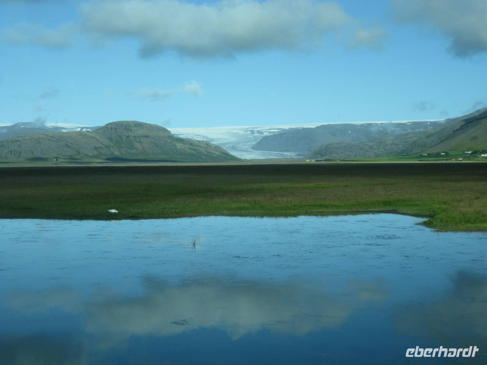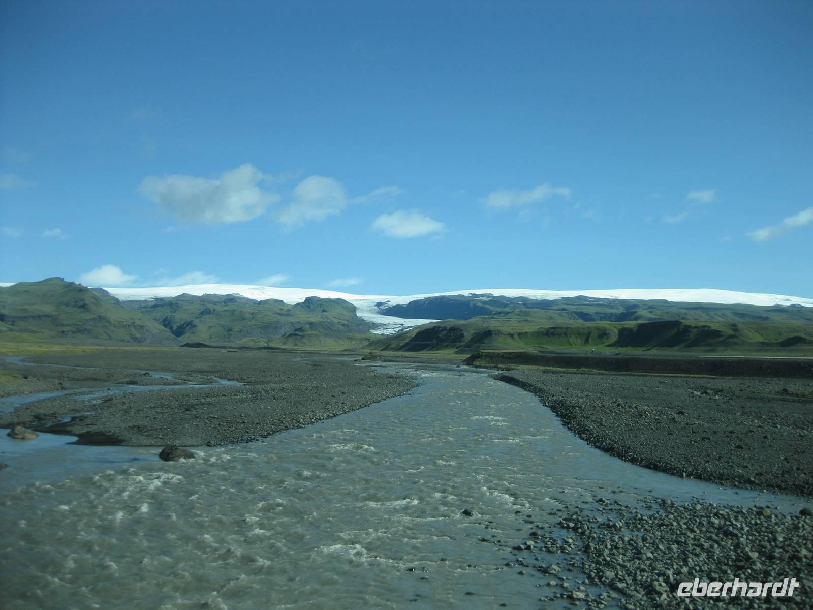 Dann führt uns die Fahrt am größten Talgletscher Europas, dem Skeidararjökull vorbei, über riesige Sanderflächen, an riesigen Lavafeldern, die bei der „Dampfkatastrophe" 1873 entstanden sind, vorbei bis zu unserem Hotel „Katla - Höfdabrekka" kurz vor Vik. Auf der Fahrt sehen wir in der Ferne den Gletscher Myrdalsjökull, der den Vulkan Katla beherbergt.